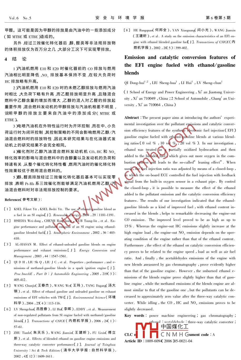 第6卷第5期安全與環(huán)境學(xué)報(bào)Vol 6 No 52006年10月JournalOct,2006文章編號(hào):1009-6094200605-0021-04放用氫火焰離子法(FID)分析,CO排放用不分光紅外線法電噴汽油機(jī)燃用乙醇/汽油混合(NDR)分析NO排放用化學(xué)發(fā)光法(CID)分析。用島津GC2010氣相色譜儀測(cè)量廢氣中的未燃乙醇、乙醛、甲醇和甲醛燃料排放及催化轉(zhuǎn)化特性研究*的濃度°考慮到乙醇容易吸收空氣中的水,引起乙醇與汽油的分祁東輝12,劉圣華1,李暉,呂勝春層試驗(yàn)時(shí)所用的含10%乙醇的汽油(以下簡(jiǎn)稱(chēng)E10)和含1西安交通大學(xué)能源與動(dòng)力工程學(xué)院西安71004920%乙醇的汽油以下簡(jiǎn)稱(chēng)E20)均為現(xiàn)場(chǎng)調(diào)配。純汽油記為2長(zhǎng)安大學(xué)汽車(chē)學(xué)院西安710064)EO。考慮到醇類(lèi)燃料的應(yīng)用推廣以及20%以下低比例摻燒醇類(lèi)對(duì)電噴汽油機(jī)部件腐蝕和溶脹作用比較小在試驗(yàn)中對(duì)摘要:研究多點(diǎn)電噴汽油機(jī)燃用不同摻混比的乙醇/汽油混合燃料原電噴汽油機(jī)未作任何改動(dòng)時(shí)的排放及催化器的轉(zhuǎn)化性能。結(jié)果表明在汽油機(jī)參數(shù)未做任何調(diào)2乙醇/汽油混合燃料汽油機(jī)的排放特性整的情況下與汽油機(jī)相比乙醇/汽油混合燃料汽油杋催化器之前的CO排放降低降幅接近15%;HC排放在大負(fù)荷時(shí)略有升高;NO,排圖1給出了乙醇/汽油混合燃料汽油機(jī)催化器前、后的放基本相同;乙醇對(duì)排放物催化轉(zhuǎn)換效率的影響與電噴汽油機(jī)的轉(zhuǎn)Co排放及其催化轉(zhuǎn)化效率。由圖可知:汽油機(jī)燃用E10和速、負(fù)荷和空燃比控制策略有關(guān)。用氣相色譜分析儀測(cè)錄的未燃乙醇E20時(shí)催化器前的CO排放在整個(gè)負(fù)荷范圍內(nèi)基本相同并排放在大負(fù)荷時(shí)略有升高甲靜排放量變化不大乙醛排放量隨乙靜且比燃用汽油時(shí)的CO排放低。其原因是:發(fā)動(dòng)機(jī)在中、小負(fù)含量增大而增大經(jīng)三效催化轉(zhuǎn)化器后可以被控制在接近零排放的荷工況下運(yùn)行時(shí)電噴汽油機(jī)的控制策略是閉環(huán)控制根據(jù)安水平。在息速工況隨乙靜含量增加,CO、HC和NO.的排放與汽油機(jī)裝在排氣管上的氧傳感器的反饋信號(hào)控制過(guò)量空氣系數(shù)基本相比略有降低保持在1.0~1.05以利于三效催化轉(zhuǎn)換器正常工作。催化器關(guān)鍵詞:動(dòng)力機(jī)械工程;氣相色諧法;乙醇;乙醛;三效催化轉(zhuǎn)化器前CO排放降低的主要原因是燃料自攜氧要比空氣中的氧更有助于充分燃燒或原子氧要比分子氧更容易參與氧化反應(yīng)。中圖分類(lèi)號(hào):TK411.5文獻(xiàn)標(biāo)識(shí)碼:A同時(shí)CO排放明顯下降的另一個(gè)原因主要是:乙醇化學(xué)結(jié)構(gòu)0引言中的羥基OH使其燃燒反應(yīng)特點(diǎn)與汽油中的各種烴類(lèi)的有所乙醇來(lái)源廣泛正常使用無(wú)毒副作用。乙醇摻混汽油作不同使著火溫度較低和不易熄火7從催化轉(zhuǎn)化效率來(lái)看在2500r/min、中小負(fù)荷時(shí)汽油汽車(chē)燃料不僅可以減少石油用量而且能夠提高燃料含氧量機(jī)燃用E10和E20燃料時(shí)的催化轉(zhuǎn)化效率與燃用汽油時(shí)基本和辛烷值改善燃燒效果。目前乙醇/汽油混合燃料在巴西、相同但在大負(fù)荷時(shí)燃用E10和E20燃料時(shí)的催化轉(zhuǎn)化效率美國(guó)和加拿大等國(guó)已經(jīng)得到較廣泛的應(yīng)用。圍繞摻混乙醇對(duì)低于燃用汽油時(shí)的;在3000r/min、整個(gè)負(fù)荷范圍內(nèi)汽油機(jī)汽車(chē)動(dòng)力和經(jīng)濟(jì)性能以及由此帶來(lái)的環(huán)境效應(yīng)等問(wèn)題,也有燃用E10和E20燃料時(shí)的催化轉(zhuǎn)化效率與燃用汽油時(shí)的基本了研究相同。由此可見(jiàn)CO在P-hh系催化劑中的轉(zhuǎn)化效率與燃料面對(duì)日益短缺的石油資源和逐步加嚴(yán)的排放法規(guī),國(guó)內(nèi)中的含醇量、發(fā)動(dòng)機(jī)的轉(zhuǎn)速和負(fù)荷有關(guān)對(duì)替代燃料包括乙醇汽油混合燃料也越來(lái)越重視45然圖2給出了乙醇/汽油混合燃料汽油機(jī)催化器前、后的而到目前為止乙醇摻混汽油作汽車(chē)燃料的研究只集中在如HC排放及其催化轉(zhuǎn)化效率。由圖可知:在小負(fù)荷時(shí),燃用何實(shí)現(xiàn)乙醇/汽油雙燃料供給、混合燃料的動(dòng)力和經(jīng)濟(jì)性能E0o和E0時(shí)催化器前的HC排放與燃用汽油時(shí)相差不大在等有關(guān)排放性能的研究相對(duì)較少。另外乙醇不完全燃燒會(huì)中、大負(fù)荷燃用E10和E0時(shí)的HC排放明顯高于燃用汽油形成乙醛而乙醛是一種有害氣體因此摻混乙醇對(duì)乙醛排放的乙醇含量對(duì)HC排放的影響較小。其原因是:閉環(huán)控制策的影響也值得特別注意。略使過(guò)量空氣系數(shù)保持在1.0~1.05,燃料基本可以完全燃本文基于發(fā)動(dòng)機(jī)臺(tái)架實(shí)驗(yàn)系統(tǒng)考察摻混體積分?jǐn)?shù)分別燒??梢哉J(rèn)為主要是由于乙醇的汽化潛熱比汽油大得多因?yàn)?0%和20%乙醇對(duì)汽油機(jī)排放和鉑銥(P助h)三效崔化而使進(jìn)氣溫度降低同時(shí)由于燃燒室的余隙而出現(xiàn)較強(qiáng)烈的劑性能的影響。淬熄效應(yīng)使HC排放升高試驗(yàn)裝置和試驗(yàn)方法從催化轉(zhuǎn)化