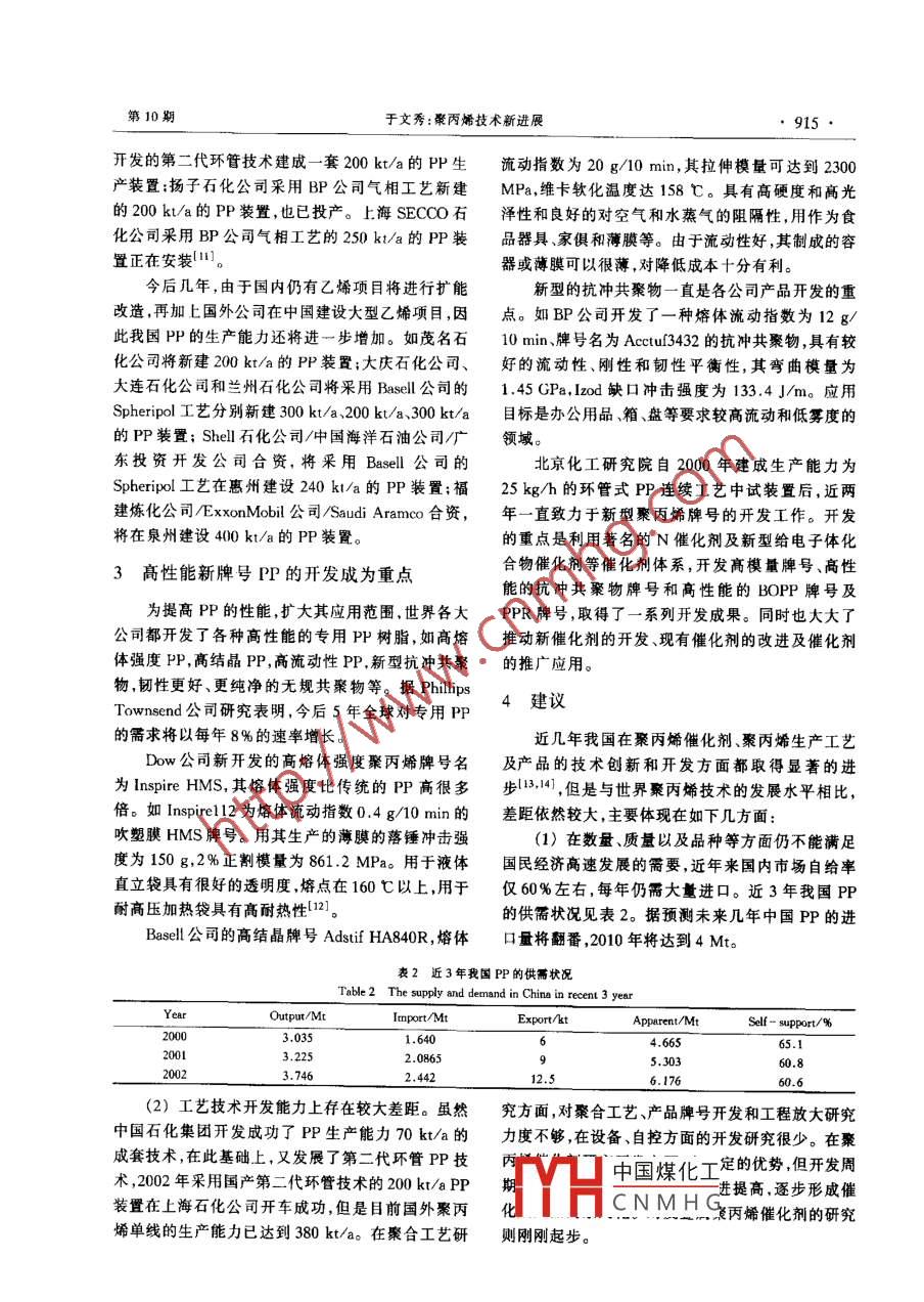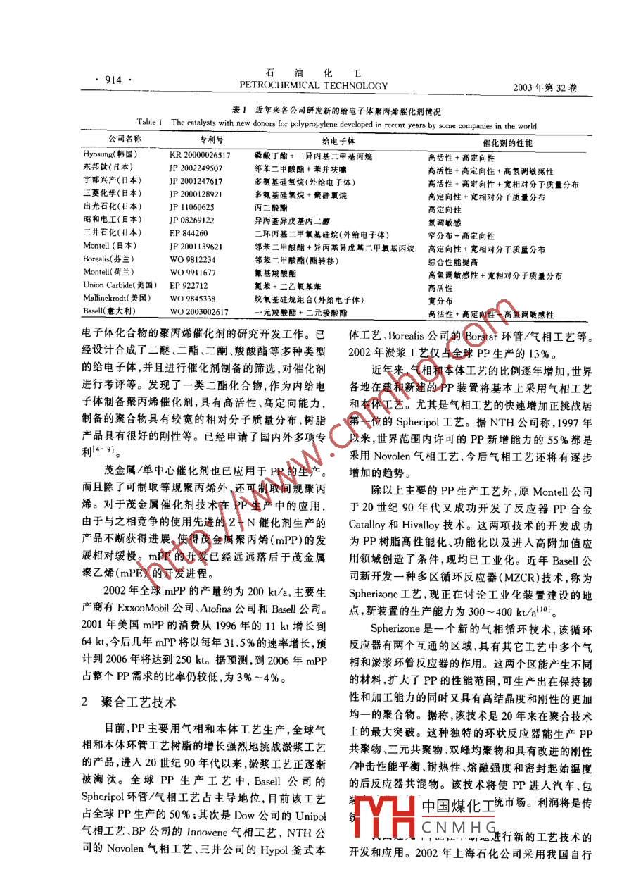 2003年第32卷第10期PETROCHEMICAL TECHNOLOGY913進(jìn)展與述評(píng)聚丙烯技術(shù)新進(jìn)展于文秀北京化工研究院,北京100013)摘要]綜述了最近3年國(guó)內(nèi)外聚丙烯催化削聚丙烯生產(chǎn)工藝及聚丙烯新產(chǎn)品開發(fā)的新進(jìn)展,分析了我國(guó)在聚丙烯技術(shù)方面存在的差距提出了發(fā)展我國(guó)聚丙烯技術(shù)的建議關(guān)詞〕聚丙烯;催化劑;工藝;產(chǎn)品;進(jìn)展;建議文章編號(hào)]1000-8144(2003)10-0913-05中圖分類號(hào)]TQ32514[文獻(xiàn)標(biāo)識(shí)碼]A聚丙烯(PP)約占世界合成樹脂總產(chǎn)量的造粒工藝,形成了反應(yīng)器粒料技術(shù)。隨后該公司在18%,占世界聚烯烴總產(chǎn)量的38%;約占我國(guó)合成采用鄰苯二甲酸酯作為給電子體的第四代催化劑基樹脂總產(chǎn)量的30%,占我國(guó)聚烯烴的份額超過礎(chǔ)上,又開發(fā)了以二醚作為給電子體的第五代新型50%。與世界其它各國(guó)相比,PP在我國(guó)合成樹脂Z-N催化劑,催化活性高達(dá)90kg/g(以1g催化劑工業(yè)中具有更重要的地位,我國(guó)PP國(guó)產(chǎn)化技術(shù)的生產(chǎn)的PP的質(zhì)量計(jì)),在較高溫度和較高壓力下開發(fā)也領(lǐng)先于其它合成樹脂,不僅開發(fā)了N系列、用新催化劑可使PP抗沖共聚物中的PP段有較高Q系列、CS系列等國(guó)產(chǎn)催化劑,也開發(fā)了釜式本的等規(guī)度,提高了結(jié)晶度,即使熔體流動(dòng)指數(shù)很高體法、環(huán)管本體法和環(huán)管液-氣組合法的國(guó)產(chǎn)化技時(shí),PP的剛性也很好。術(shù),單條生產(chǎn)線的聚丙烯生產(chǎn)能力為200kt/a,達(dá)2001年 Basell公司開發(fā)成功了用琥珀酸酯作到了世界級(jí)水平。為給電子體的新型Z-N負(fù)載催化劑,該催化劑通PP是世界上使用最廣泛的通用塑料,自1980過使相對(duì)分子質(zhì)量分布變寬而極大地?cái)U(kuò)展了PP均年以來,世界PP的消耗以每年9.5%的速率增聚物和共聚物的性能,在生產(chǎn)寬相對(duì)分子質(zhì)量分布長(zhǎng),使得PP也成為增長(zhǎng)速度最快的熱塑性樹脂。產(chǎn)品方面是個(gè)突破2。這種催化劑已經(jīng)在工業(yè)裝2002年,全球PP生產(chǎn)能力達(dá)到38.2Mt/a,我置上進(jìn)行了試驗(yàn),用于P樹脂的生產(chǎn)后,能改善國(guó)PP生產(chǎn)能力約為3.95Mt/a。1997年至2001 BOPP薄膜、管材和注塑件的剛度和加工性能(3。年我國(guó)PP的產(chǎn)量以每年15.4%的速率快速增加,現(xiàn)在已經(jīng)開始在全球銷售。2002年產(chǎn)量達(dá)3.746Mt。因?yàn)榇呋瘎┲幸氲慕o電子體實(shí)際上是對(duì)催化PP無(wú)論是在世界范圍內(nèi)還是在我國(guó)在合成樹劑性能的改善起了關(guān)鍵的作用,因而,尋找更好性能脂工業(yè)中都占有十分重要的地位,是最重要的石油給電子體的研究是催化劑開發(fā)的重點(diǎn)。近幾年,又化工產(chǎn)品,因而其工業(yè)技術(shù)的發(fā)展也最引人關(guān)注。公開了多項(xiàng)專利技術(shù)及多個(gè)化合物品種。在這些技本文綜述了國(guó)內(nèi)外聚丙烯技術(shù)的最新進(jìn)展。術(shù)和新的化合物品種中,有給電子體復(fù)合使用的,也有單獨(dú)使用的,有在預(yù)聚合中使用的??傊?是給予催化劑技術(shù)了催化劑相應(yīng)的新的綜合性能或特性,對(duì)開發(fā)高性高活性高立體規(guī)整性載體催化劑是現(xiàn)代PP能聚丙烯牌號(hào)起到了關(guān)鍵作用。生產(chǎn)工藝的基礎(chǔ),也是PP生產(chǎn)工藝的核心。PP催表1列出了近幾年來世界主要相關(guān)公司研究化劑經(jīng)過50多年的發(fā)展,已從需要脫灰脫無(wú)規(guī)物開發(fā)新的給電子體及相應(yīng)的催化劑方面發(fā)表的專利的第一代催化劑發(fā)展到高活性、高立構(gòu)規(guī)整性的高內(nèi)容。效第四代、第五代催化劑。自20世紀(jì)80年代以來工研腔近幾年也在進(jìn)行采用新型內(nèi)給美國(guó)、西歐和日本的主要PP生產(chǎn)商將大部分研究中國(guó)煤化工工作集中于催化劑體系的改進(jìn)。Base公司20世CNMHG200-09-06紀(jì)80年代開發(fā)成功第四代球形PP催化劑,省略了94-)男阿北省景縣人,大學(xué)高級(jí)工程師電話010-64216131-2370。914石油化工PETROCHEMICAL TECHNOLOGY2003年第32卷表1近年來各公司研發(fā)新的給電了體聚丙烯催化劑情況Talle I The catalysts with new donors for polypropylene developed in recent years by some companies in公司名稱給電子體催化劑的性能KR2000026517磷酸丁酯+二異內(nèi)基二甲基丙烷病活性+高定向性東邦鈦(H本)P2002249507鄰苯二甲酸酯+苯并呋嘲高活性+高定向性+高氫調(diào)敏感性宇部興產(chǎn)(日本)JP2001247617多氨基硅氧烷(外給電子體)高活性+高定向性+寬相對(duì)分了質(zhì)量分布菱化學(xué)(日本)JP2000128921多氨基硅氧烷+癜砷氧烷高定向性+寬相對(duì)分子質(zhì)量分布出光石化(日本)丙二酸酯高定向性昭和電工(日本JP08269異內(nèi)基異戊基丙二醇?xì)湔{(diào)敏感井石化(日本二環(huán)丙基二甲氧基硅烷(外給電子體)窄分布+高定向性Montel(日本)JP2001139621鄰苯二甲般酯+異丙基異戊基甲氧基丙烷高定向性寬相對(duì)分子質(zhì)量分布Borealis(芬蘭Wo9812234鄰苯二甲酸酌(酯轉(zhuǎn)移)荷蘭氰基駿酸配高氫調(diào)敏感性+寬相對(duì)分子質(zhì)量分布Union Carbide(美國(guó))EP92271苯+二乙氧基苯高活性Mallinckrodt(美國(guó))w()9845338烷氧基硅烷組