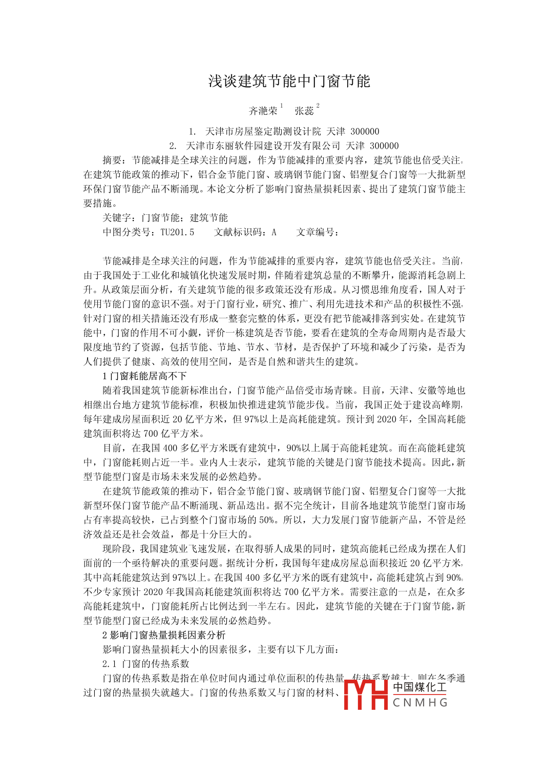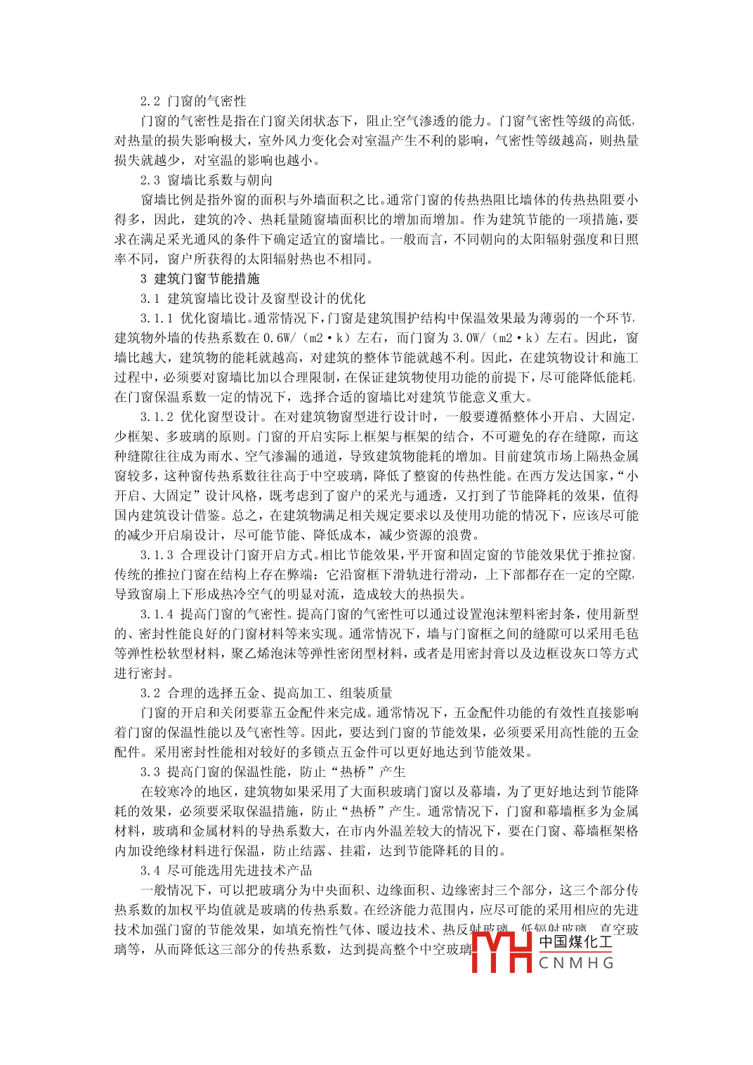 淺談建筑節(jié)能中門窗節(jié)能齊滟榮張蕊1.天津市房屋鑒定勘測設(shè)計院天津300002.天津市東麗軟件園建設(shè)開發(fā)有限公司天津300000摘要:節(jié)能減排是全球關(guān)注的問題,作為節(jié)能減排的重要內(nèi)容,建筑節(jié)能也倍受關(guān)注。在建筑節(jié)能政策的推動下,鋁合金節(jié)能門窗、玻璃鋼節(jié)能門窗、鋁塑復(fù)合門窗等一大批新型環(huán)保門窗節(jié)能產(chǎn)品不斷涌現(xiàn)。本論文分析了影響門窗熱量損耗因素、提出了建筑門窗節(jié)能主要措施關(guān)鍵字:門窗節(jié)能;建筑節(jié)能中圖分類號:TU201.5文獻(xiàn)標(biāo)識碼:A文章編號:節(jié)能減排是全球關(guān)注的問題,作為節(jié)能減排的重要內(nèi)容,建筑節(jié)能也倍受關(guān)注。當(dāng)前,由于我國處于工業(yè)化和城鎮(zhèn)化快速發(fā)展時期,伴隨著建筑總量的不斷攀升,能源消耗急劇上升。從政策層面分析,有關(guān)建筑節(jié)能的很多政策還沒有形成。從習(xí)慣思維角度看,國人對于使用節(jié)能門窗的意識不強。對于門窗行業(yè),研究、推廣、利用先進(jìn)技術(shù)和產(chǎn)品的積極性不強,針對門窗的相關(guān)措施還沒有形成一整套完整的體系,更沒有把節(jié)能減排落到實處。在建筑節(jié)能中,門窗的作用不可小覷,評價一棟建筑是否節(jié)能,要看在建筑的全壽命周期內(nèi)是否最大限度地節(jié)約了資源,包括節(jié)能、節(jié)地、節(jié)水、節(jié)材,是否保護了環(huán)境和減少了污染,是否為人們提供了健康、高效的使用空間,是否是自然和諧共生的建筑。1門窗耗能居高不下隨著我國建筑節(jié)能新標(biāo)準(zhǔn)岀臺,門窗節(jié)能產(chǎn)品倍受市場青睞。目前,天津、安徽等地也相繼岀臺地方建筑節(jié)能標(biāo)準(zhǔn),積極加快推進(jìn)建筑節(jié)能步伐。當(dāng)前,我國正處于建設(shè)高峰期,每年建成房屋面積近20億平方米,但97%以上是高耗能建筑。預(yù)計到2020年,全國高耗能建筑面積將達(dá)700億平方米目前,在我國400多億平方米既有建筑中,90%以上屬于高能耗建筑。而在高能耗建筑中,門窗能耗則占近一半。業(yè)內(nèi)人士表示,建筑節(jié)能的關(guān)鍵是門窗節(jié)能技術(shù)提高。因此,新型節(jié)能型門窗是市場未來發(fā)展的必然趨勢。在建筑節(jié)能政策的推動下,鋁合金節(jié)能門窗、玻璃鋼節(jié)能門窗、鋁塑復(fù)合門窗等一大批新型環(huán)保門窗節(jié)能產(chǎn)品不斷涌現(xiàn)、新品迭岀。據(jù)不完全統(tǒng)計,目前各地建筑節(jié)能型門窗市場占有率提高較快,已占到整個門窗市場的50%。所以,大力發(fā)展門窗節(jié)能新產(chǎn)品,不管是經(jīng)濟效益還是社會效益,都是十分巨大的?,F(xiàn)階段,我國建筑業(yè)飛速發(fā)展,在取得驕人成果的同時,建筑高能耗已經(jīng)成為擺在人們面前的一個亟待解決的重要問題。據(jù)統(tǒng)計分析,我國每年建成房屋總面積接近20億平方米其中高耗能建筑達(dá)到97%以上。在我國400多億平方米的既有建筑中,高能耗建筑占到90%不少專家預(yù)計2020年我國高耗能建筑面積將達(dá)700億平方米。需要注意的一點是,在眾多高能耗建筑中,門窗能耗所占比例達(dá)到一半左右。因此,建筑節(jié)能的關(guān)鍵在于門窗節(jié)能,新型節(jié)能型門窗已經(jīng)成為未來發(fā)展的必然趨勢2影響門窗熱量損耗因素分析影響門窗熱量損耗大小的因素很多,主要有以下幾方面:2.1門窗的傳熱系數(shù)門窗的傳熱系數(shù)是指在單位時間內(nèi)通過單位面積的傳熱量戰(zhàn)大在冬季通過門窗的熱量損失就越大。門窗的傳熱系數(shù)又與門窗的材料中國煤化工CNMHG2.2門窗的氣密性門窗的氣密性是指在門窗關(guān)閉狀態(tài)下,阻止空氣滲透的能力。門窗氣密性等級的高低對熱量的損失影響極大,室外風(fēng)力變化會對室溫產(chǎn)生不利的影響,氣密性等級越高,則熱量損失就越少,對室溫的影響也越小。2.3窗墻比系數(shù)與朝向窗墻比例是指外窗的面積與外墻面積之比。通常門窗的傳熱熱阻比墻體的傳熱熱阻要小得多,因此,建筑的冷、熱耗量隨窗墻面積比的增加而增加。作為建筑節(jié)能的一項措施,要求在滿足采光通風(fēng)的條件下確定適宜的窗墻比。一般而言,不同朝向的太陽輻射強度和日照率不同,窗戶所獲得的太陽輻射熱也不相同。3建筑門窗節(jié)能措施3.1建筑窗墻比設(shè)計及窗型設(shè)計的優(yōu)化3.1.1優(yōu)化窗墻比。通常情況下,門窗是建筑圍護結(jié)構(gòu)中保溫效果最為薄弱的一個環(huán)節(jié),建筑物外墻的傳熱系數(shù)在0.6W/(n2·k)左右,而門窗為3.0W/(m2·k)左右。因此,窗墻比越大,建筑物的能耗就越高,對建筑的整體節(jié)能就越不利。因此,在建筑物設(shè)計和施工過程中,必須要對窗墻比加以合理限制,在保證建筑物使用功能的前提下,盡可能降低能耗。在門窗保溫系數(shù)一定的情況下,選擇合適的窗墻比對建筑節(jié)能意義重大。3.1.2優(yōu)化窗型設(shè)計。在對建筑物窗型進(jìn)行設(shè)計時,一般要遵循整體小開啟、大固定少框架、多玻璃的原則。門窗的開啟實際上框架與框架的結(jié)合,不可避免的存在縫隙,而這種縫隙往往成為雨水、空氣滲漏的通道,導(dǎo)致建筑物能耗的増加。目前建筑市玚上隔熱金屬窗