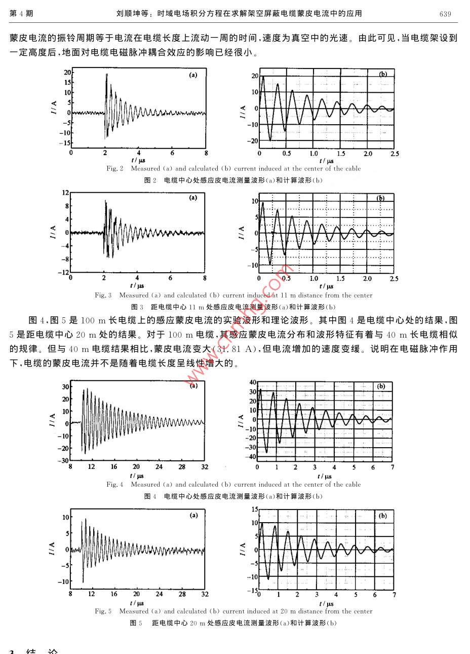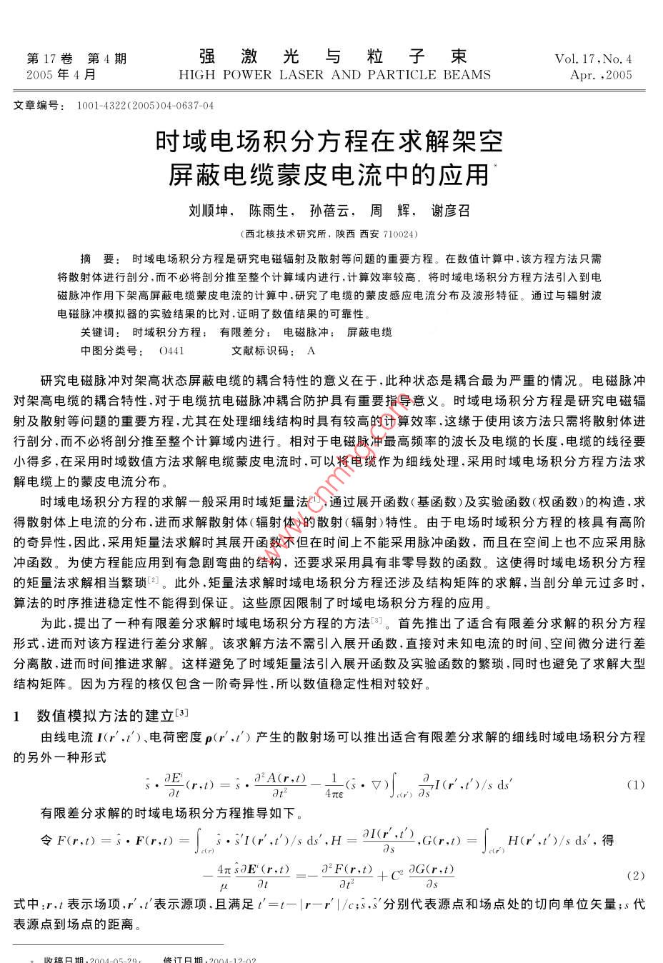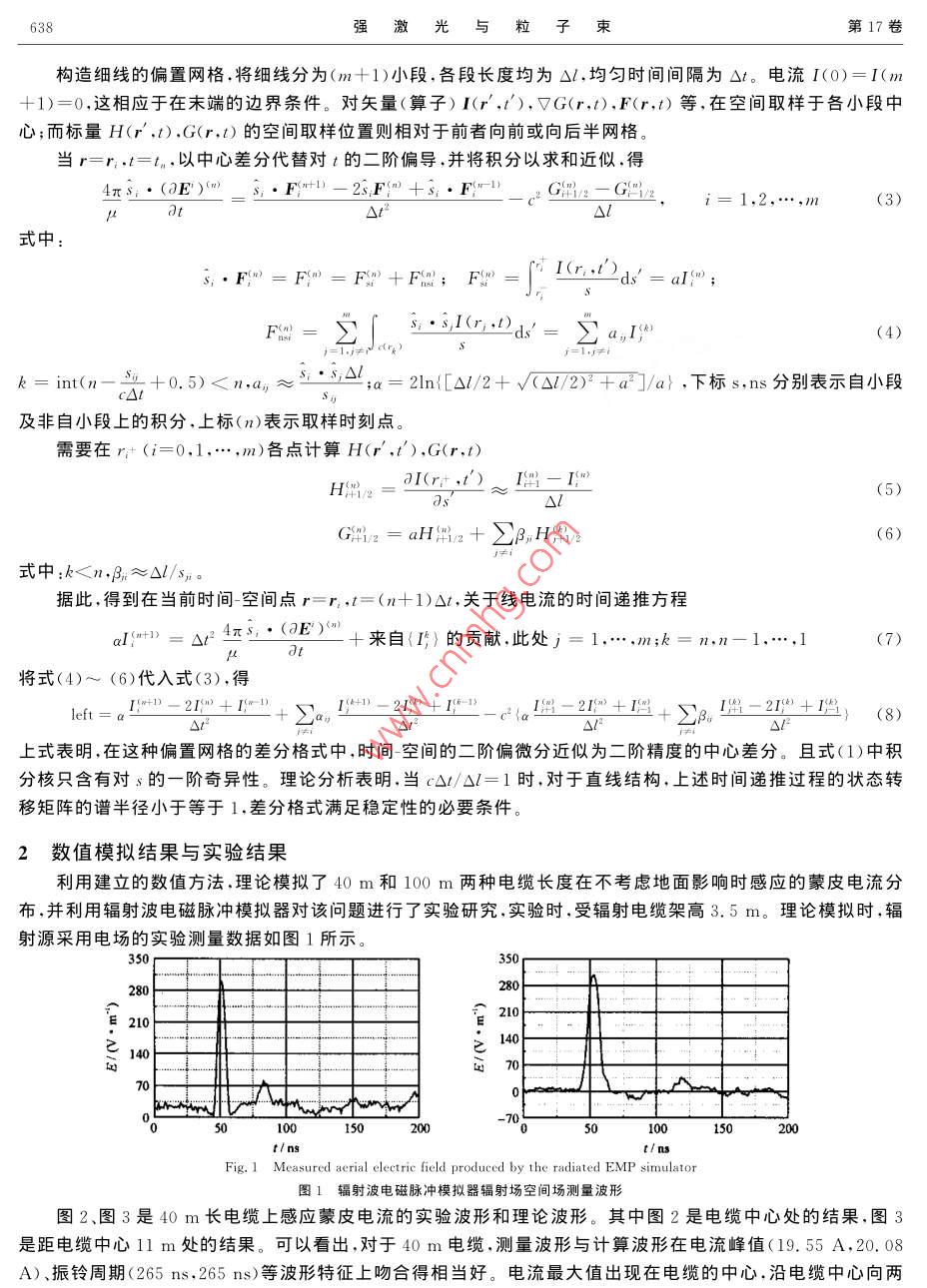 第17卷第4期強(qiáng)激光與粒子束Vol. 17. No 42005年4月HIGH POWER LASER AND PARTICLE BEAMSApr.,2005文章編號(hào):1001-4322(2005)04-0637-04時(shí)域電場(chǎng)積分方程在求解架空屏蔽電纜蒙皮電流中的應(yīng)用劉順坤,陳雨生,孫蓓云,周輝,謝彥召(西北核技術(shù)研究所,陜西西安710024)摘要:時(shí)域電場(chǎng)積分方程是研究電磁輻射及散射等問(wèn)題的重要方程。在數(shù)值計(jì)算中,該方程方法只需將散射體進(jìn)行剖分,而不必將剖分推至整個(gè)計(jì)算域內(nèi)進(jìn)行,計(jì)算效率較高。將時(shí)域電場(chǎng)積分方程方法引入到磁脈沖作用下架高屏蔽電纜蒙皮電流的計(jì)算中,硏究了電纜的蒙皮感應(yīng)電流分布及波形特征。通過(guò)與輻射波電磁脈沖模擬器的實(shí)驗(yàn)結(jié)果的比對(duì),證明了數(shù)值結(jié)果的可靠性。關(guān)鍵詞:時(shí)域積分方程;有限差分;電磁脈沖;屏蔽電纜中圖分類號(hào):O441文獻(xiàn)標(biāo)識(shí)碼:A研究電磁脈沖對(duì)架高狀態(tài)屏蔽電纜的耦合特性旳意義在于,此種狀態(tài)是耦合最為嚴(yán)重的情況。電磁脈沖對(duì)架高電纜的耦合特性,對(duì)于電纜抗電磁脈沖耦合防護(hù)具有重要指導(dǎo)意乂。時(shí)堿電場(chǎng)積分方程是研究電磁輻射及散射等問(wèn)題的重要方程,尤其在處理細(xì)線結(jié)構(gòu)時(shí)具有較高旳計(jì)算效率,這緣于使用該方法只需將散射體進(jìn)行剖分,而不必將剖分推至整個(gè)計(jì)算域內(nèi)進(jìn)行。相對(duì)于電磁脈沖最高頻率的波長(zhǎng)及電纜的長(zhǎng)度,電纜的線徑要小得多,在采用時(shí)域數(shù)值方法求解電纜蒙皮電流時(shí),可以將電纜作為細(xì)線處理,采用時(shí)域電場(chǎng)積分方程方法求解電纜上的蒙皮電流分布。時(shí)域電場(chǎng)積分方程的求解一般采用時(shí)域矩量法,通過(guò)展開(kāi)函數(shù)(基函數(shù))及實(shí)驗(yàn)函數(shù)(權(quán)函數(shù))的構(gòu)造,求得散射體上電流的分布,進(jìn)而求解散射體(輻射體)旳散射(輻射)特性。由于電場(chǎng)時(shí)域積分方程旳核具有高階的奇異性,因此,采用矩量法求解時(shí)其展開(kāi)函數(shù)不但在時(shí)間上不能采用脈沖函數(shù),而且在空間上也不應(yīng)采用脈沖函數(shù)。為使方程能應(yīng)用到有急劇彎曲的結(jié)構(gòu),還要求采用具有非零導(dǎo)數(shù)的函數(shù)。這使得時(shí)域電場(chǎng)積分方程的矩量法求解相當(dāng)繁瑣。此外,矩量法求解時(shí)堿電場(chǎng)積分方程還涉及結(jié)構(gòu)矩陣的求解,當(dāng)剖分單元過(guò)多時(shí)算法的時(shí)序推進(jìn)穩(wěn)定性不能得到保證。這些原因限制了時(shí)域電場(chǎng)積分方程的應(yīng)用為此提岀了一種有限差分求解時(shí)域電場(chǎng)積分方程的方法。首先推出了適合有限差分求解的積分方程形式,進(jìn)而對(duì)該方程進(jìn)行差分求解。該求解方法不需引入展開(kāi)函數(shù),直接對(duì)未知電流的時(shí)間、空間微分進(jìn)行差分離散,進(jìn)而時(shí)間推進(jìn)求解。這樣避免了時(shí)域矩量法引入展開(kāi)函數(shù)及實(shí)驗(yàn)函數(shù)的繁瑣,同時(shí)也避免了求解大型結(jié)構(gòu)矩陣。因?yàn)榉匠痰暮藘H包含一階奇異性,所以數(shù)值穩(wěn)定性相對(duì)較好。1數(shù)值模擬方法的建立3由線電流I(r,t')、電荷密度p(r,t')產(chǎn)生的散射場(chǎng)可以推出適合有限差分求解的細(xì)線時(shí)域電場(chǎng)積分方程的另外一種形式deAmC2-1(,)I(rt')/s d(1)有限差分求解的時(shí)域電場(chǎng)積分方程推導(dǎo)如下。令F(r,)=s·F(r,t)=s·(r,t')/sds,HaI(r,G(r, t)H(r,t')/sds,得4TSOE (r t)2? F(r,t)+CasaG(rt)式中:r,表示場(chǎng)項(xiàng),r,表示源項(xiàng),且滿足t'=t-r-r'|/c;s,s分別代表源點(diǎn)和場(chǎng)點(diǎn)處的切向單位矢量;s代表源點(diǎn)到場(chǎng)點(diǎn)的距離強(qiáng)激光與粒子束第17卷構(gòu)造細(xì)線的偏置網(wǎng)格,將細(xì)線分為(m+1)小段,各段長(zhǎng)度均為△l,均勻時(shí)間間隔為Δt。電流I(0)=I(m1)=0,這相應(yīng)于在末端的邊界條件。對(duì)矢量(算子)I(r,t),WG(r,t),F(r,)等,在空間取樣于各小段中心;而標(biāo)量H(r,t),G(r,t)的空間取樣位置則相對(duì)于前者向前或向后半網(wǎng)格當(dāng)r=r;,t=tn,以中心差分代替對(duì)t的二階偏導(dǎo),并將積分以求和近似,得4(aE)式中s;·F1m=F"=Fx+F;Fm=∑1(r,t)k=m(S+0.5)