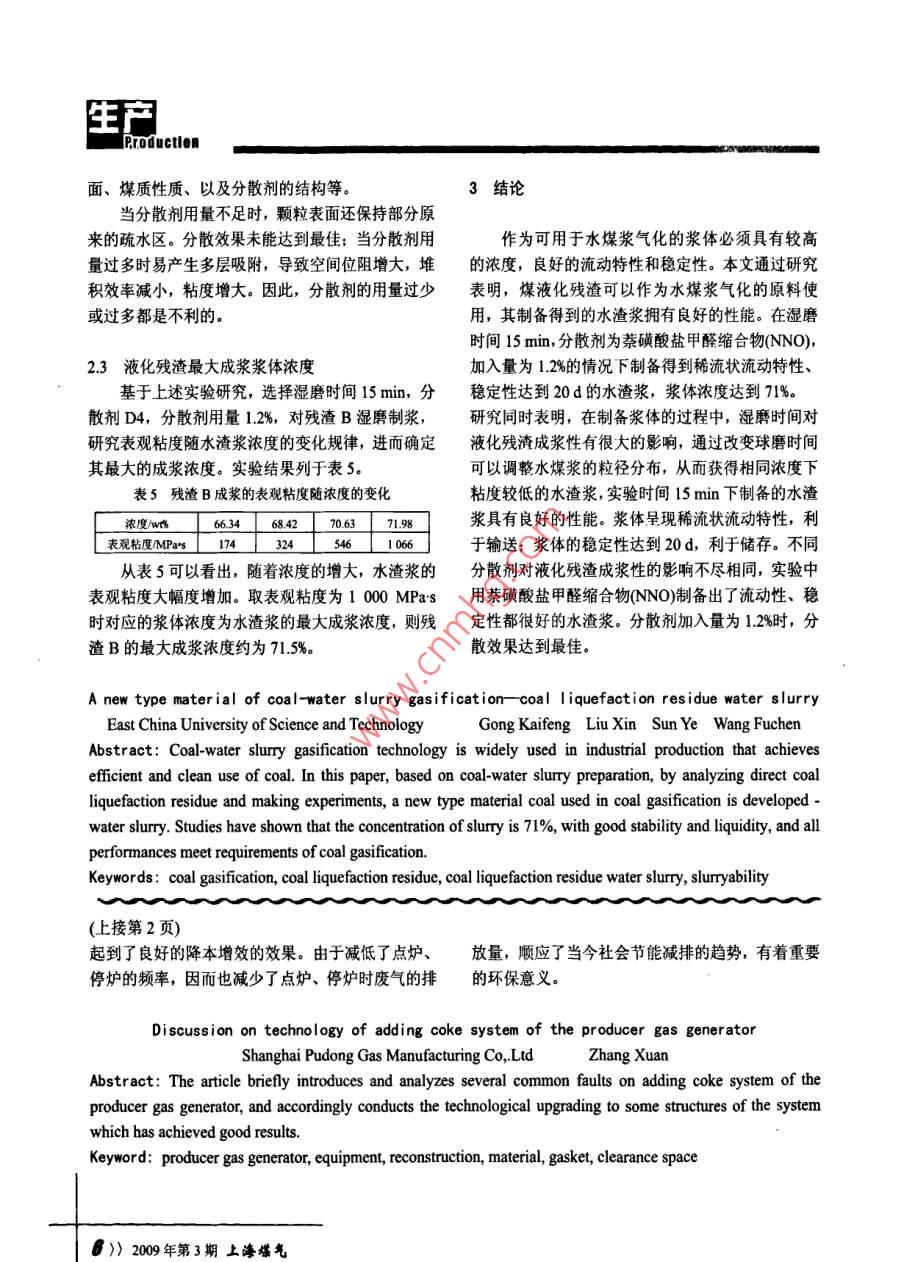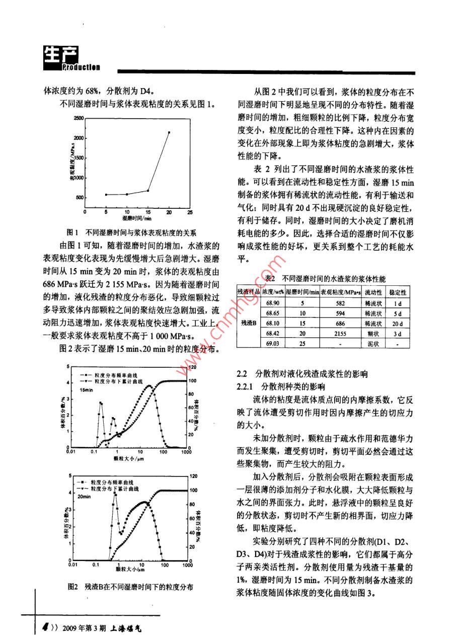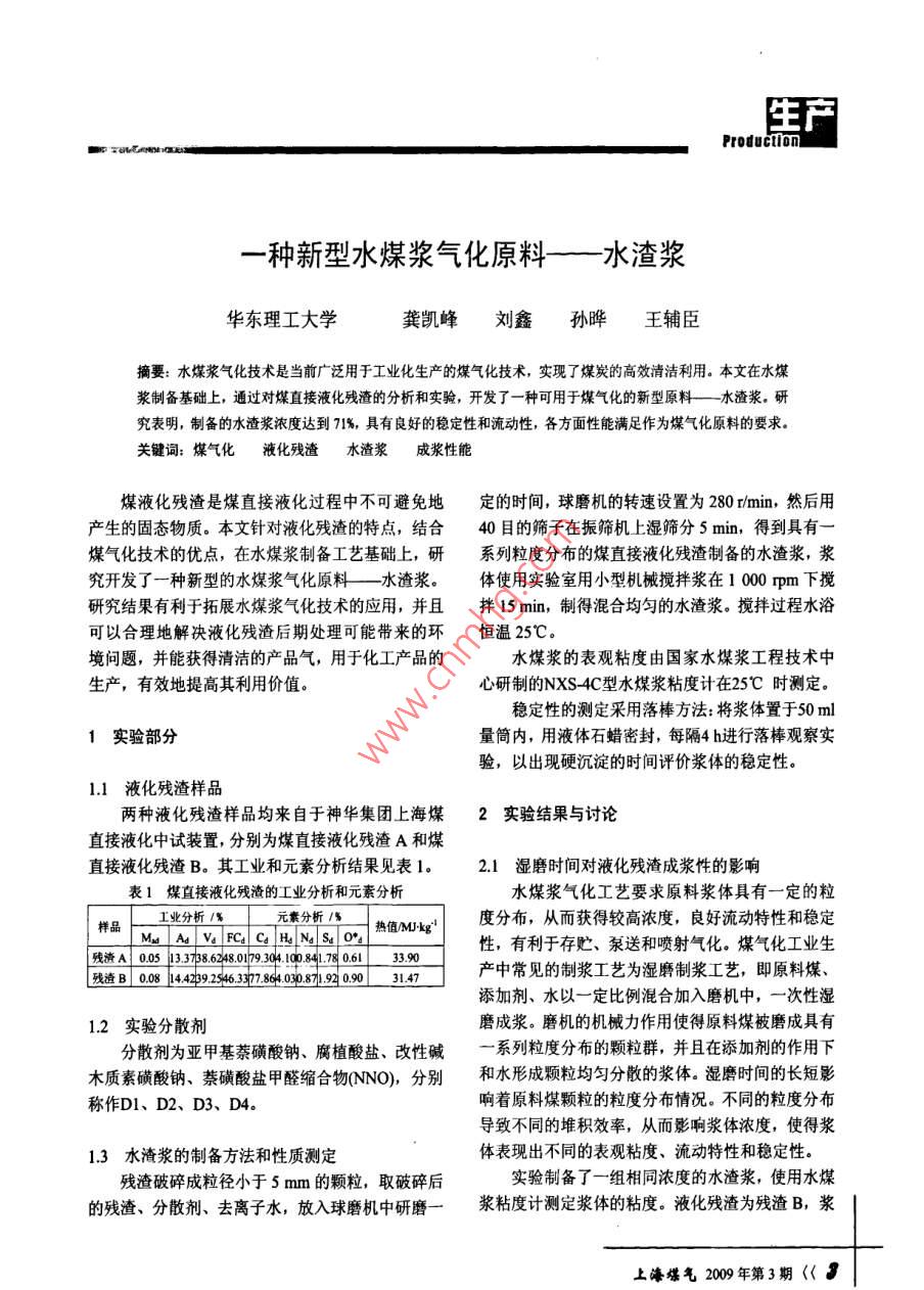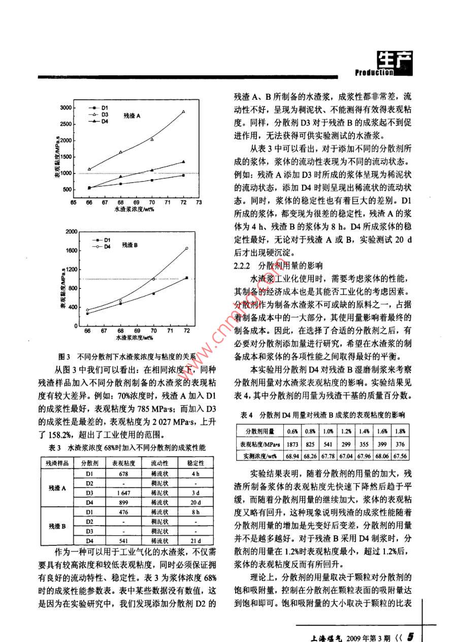 Production一種新型水煤漿氣化原料——水渣漿華東理工大學(xué)龔凱峰劉鑫孫曄王輔臣摘要:水煤漿氣化技術(shù)是當(dāng)前廣泛用于工業(yè)化生產(chǎn)的煤氣化技術(shù),實(shí)現(xiàn)了煤炭的高效清潔利用。本文在水煤漿制備基礎(chǔ)上,通過對煤直接液化殘渣的分析和實(shí)驗(yàn),開發(fā)了一種可用于煤氣化的新型原料—水渣漿。研究表明,制備的水渣漿濃度達(dá)到71%,具有良好的穩(wěn)定性和流動性,各方面性能滿足作為煤氣化原料的要求關(guān)鍵詞:煤氣化液化殘渣水渣漿成漿性能。煤液化殘渣是煤直接液化過程中不可避免地定的時間,球磨機(jī)的轉(zhuǎn)速設(shè)置為280rmin,然后用的固態(tài)物質(zhì)。本文針對液化殘渣的特點(diǎn),結(jié)合40目的篩子在振篩機(jī)上濕篩分5min,得到具有煤氣化技術(shù)的優(yōu)點(diǎn),在水煤漿制備工藝基礎(chǔ)上,研系列粒度分布的煤直接液化殘渣制備的水渣漿,漿究開發(fā)了一種新型的水煤漿氣化原料——水渣漿。體使用實(shí)驗(yàn)室用小型機(jī)械攪拌漿在1000pm下攪研究結(jié)果有利于拓展水煤漿氣化技術(shù)的應(yīng)用,并且拌15min,制得混合均勻的水渣漿。攪拌過程水浴可以合理地解決液化殘渣后期處理可能帶來的環(huán)恒溫25℃境問題,并能獲得清潔的產(chǎn)品氣,用于化工產(chǎn)品的水煤漿的表觀粘度由國家水煤漿工程技術(shù)中生產(chǎn),有效地提高其利用價值。心研制的NXS4C型水煤漿粘度計在25℃時測定穩(wěn)定性的測定采用落棒方法:將漿體置于50ml1實(shí)驗(yàn)部分量筒內(nèi),用液體石蠟密封,每隔4h進(jìn)行落棒觀察實(shí)驗(yàn),以出現(xiàn)硬沉淀的時間評價漿體的穩(wěn)定性。11液化殘渣樣品兩種液化殘渣樣品均來自于神華集團(tuán)上海煤2實(shí)驗(yàn)結(jié)果與討論直接液化中試裝置,分別為煤直接液化殘渣A和煤直接液化殘渣B。其工業(yè)和元素分析結(jié)果見表1。2.1濕磨時間對液化殘渣成漿性的影響表1煤直接液化殘渣的工業(yè)分析和元素分析水煤漿氣化工藝要求原料漿體具有一定的粒樣品工業(yè)分析/元素分析/%熱值/Mkg度分布,從而獲得較高濃度,良好流動特性和穩(wěn)定性,有利于存貯、泵送和噴射氣化。煤氣化工業(yè)生線濟(jì)A00537890[B0844880單9014產(chǎn)中常見的制漿工藝為濕磨制漿工藝,即原料煤、添加劑、水以一定比例混合加入磨機(jī)中,一次性濕12實(shí)驗(yàn)分散劑磨成漿。磨機(jī)的機(jī)械力作用使得原料煤被磨成具有分散劑為亞甲基萘磺酸鈉、腐植酸鹽、改性堿一系列粒度分布的顆粒群,并且在添加劑的作用下木質(zhì)素磺酸鈉、萘磺酸鹽甲醛縮合物(NO,分別和水形成顆粒均勻分散的漿體。濕磨時間的長短影稱作D1、D2、D3、D4。響著原料煤顆粒的粒度分布情況。不同的粒度分布導(dǎo)致不同的堆積效率,從而影響漿體濃度,使得漿13水渣漿的制備方法和性質(zhì)測定體表現(xiàn)出不同的表觀粘度、流動特性和穩(wěn)定性。殘渣破碎成粒徑小于5mm的顆粒,取破碎后實(shí)驗(yàn)制備了一組相同濃度的水渣漿,使用水煤的殘渣、分散劑、去離子水,放入球磨機(jī)中研磨一漿粘度計測定漿體的粘度。液化殘渣為殘渣B,漿上峰嫘氣200年第3期(Production體濃度約為68%,分散劑為D4。從圖2中我們可以看到,漿體的粒度分布在不不同濕磨時間與漿體表觀粘度的關(guān)系見圖1。同濕磨時間下明顯地呈現(xiàn)不同的分布特性。隨著濕磨時間的增加,粗細(xì)顆粒的比例下降,粒度分布寬度變小,粒度配比的合理性下降。這種內(nèi)在因素的變化在外部現(xiàn)象上即為漿體粘度的急劇增大,漿體性能的下降。表2列出了不同濕磨時間的水渣漿的漿體性能。可以看到在流動性和穩(wěn)定性方面,濕磨15min制備的漿體擁有稀流狀的流動性能,有利于輸送和氣化:同時具有20d不出現(xiàn)硬沉淀的良好穩(wěn)定性,有利于儲存。同時,濕磨時間的大小決定了磨機(jī)消圖1不同濕磨時間與漿體表觀粘度的關(guān)系耗電能的多少。因此,選擇合適的濕磨時間不僅影由圖1可知,隨著濕磨時間的增加,水渣漿的響成漿性能的好壞,更關(guān)系到整個工藝的耗能水表觀粘度變化表現(xiàn)為先緩慢增大后急劇增大。濕磨平時間從15min變?yōu)?0min時,漿體的表觀粘度由686MPas躍遷為2155MPas。因?yàn)殡S著濕磨時間表2不同濕磨時間的水渣漿的漿體性能的增加,液化殘渣的粒度分布惡化,導(dǎo)致細(xì)顆粒過線渣樣品濃度M濕磨時間表觀粘度Ma流動性穩(wěn)定性稀流狀多導(dǎo)致漿體內(nèi)部顆粒之間的聚結(jié)效應(yīng)急劇加強(qiáng),流10動阻力迅速增加,漿體表觀粘度快速增大。工業(yè)上,殘渣BL681015稀流狀20d般要求漿體表觀粘度不高于1000MPas68422圖2表示了濕磨15min、20min時的粒度分布69.032522分散劑對液化殘渣成漿性的影響粒度分布下累計曲線2.21分散劑種類的影響流體的粘度是流體質(zhì)點(diǎn)間的內(nèi)摩擦系數(shù),它反映了流體遭受剪切作用時因內(nèi)摩擦產(chǎn)生的切應(yīng)力的大小。未加分散劑時,顆粒由于疏水作用和范德華力而發(fā)生聚集,遺受剪切時,剪切平面必然會通過這顆粒大小/ym些聚集物,而產(chǎn)生較大的阻力。粒度分布頻率曲線加入分散劑后,分散劑會吸附在顆粒表面形成—粒度分布下累計曲線層很薄的添加劑分子和水化膜,大大降低顆粒