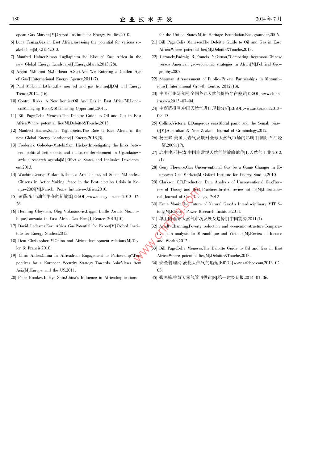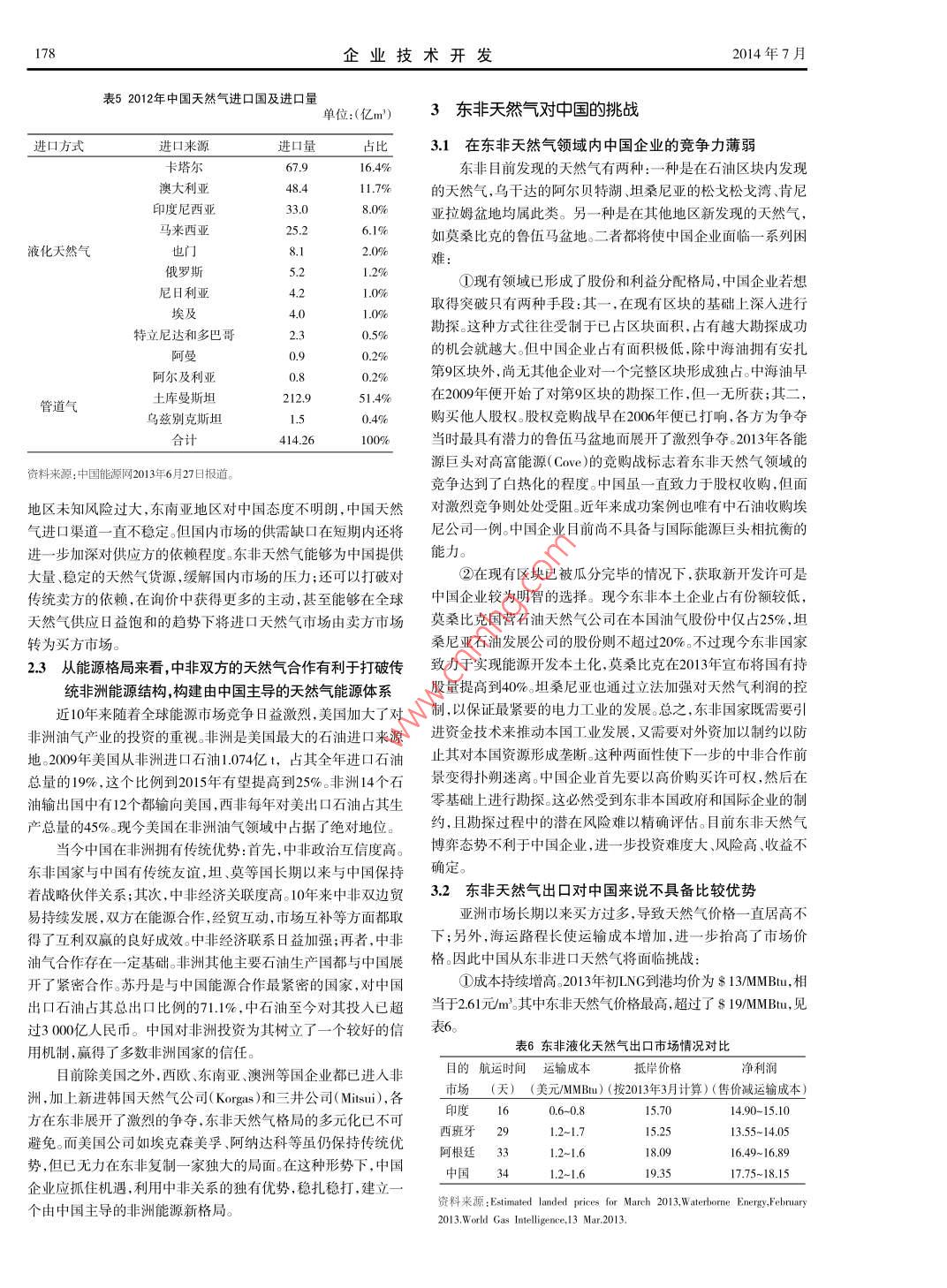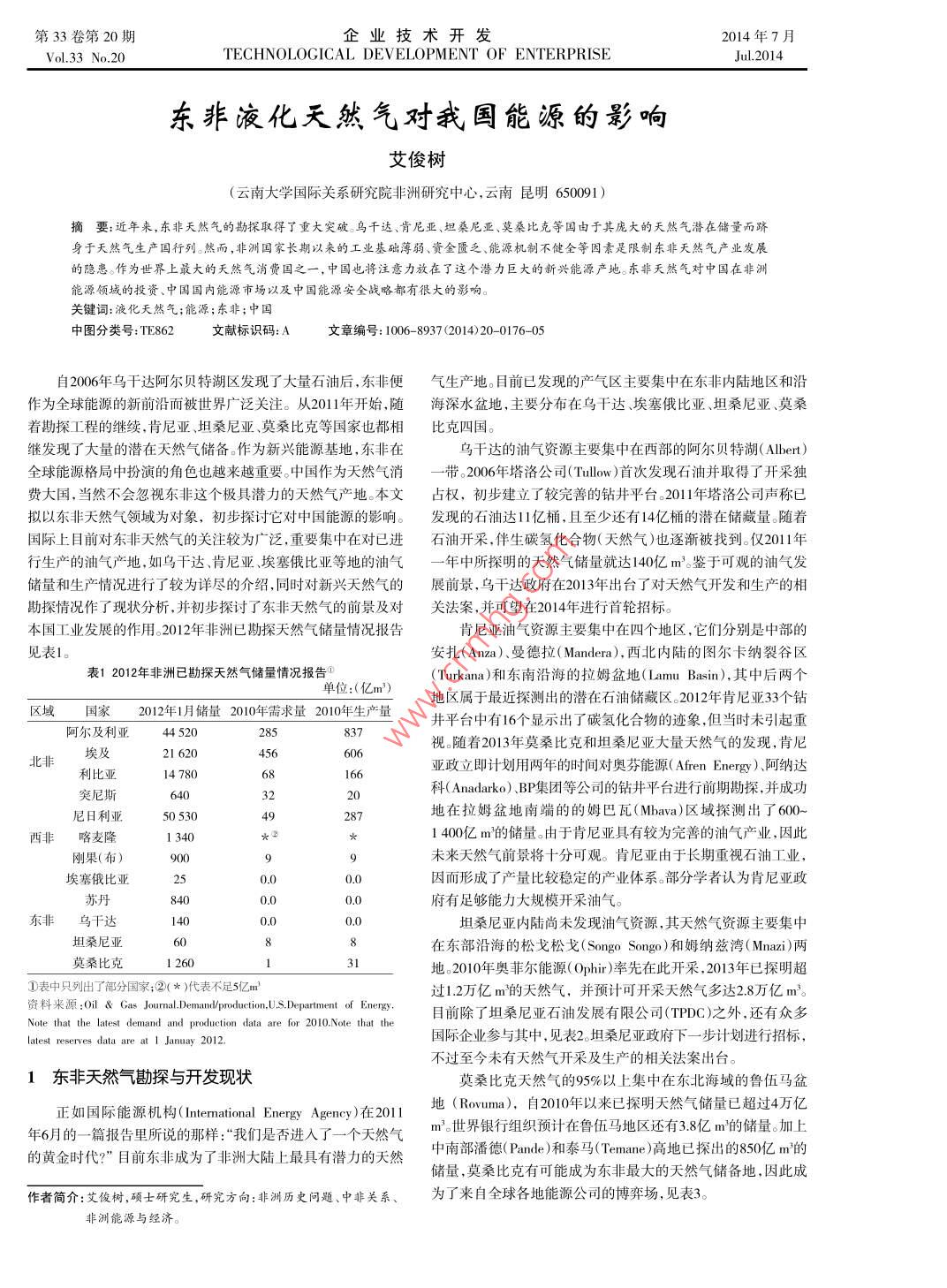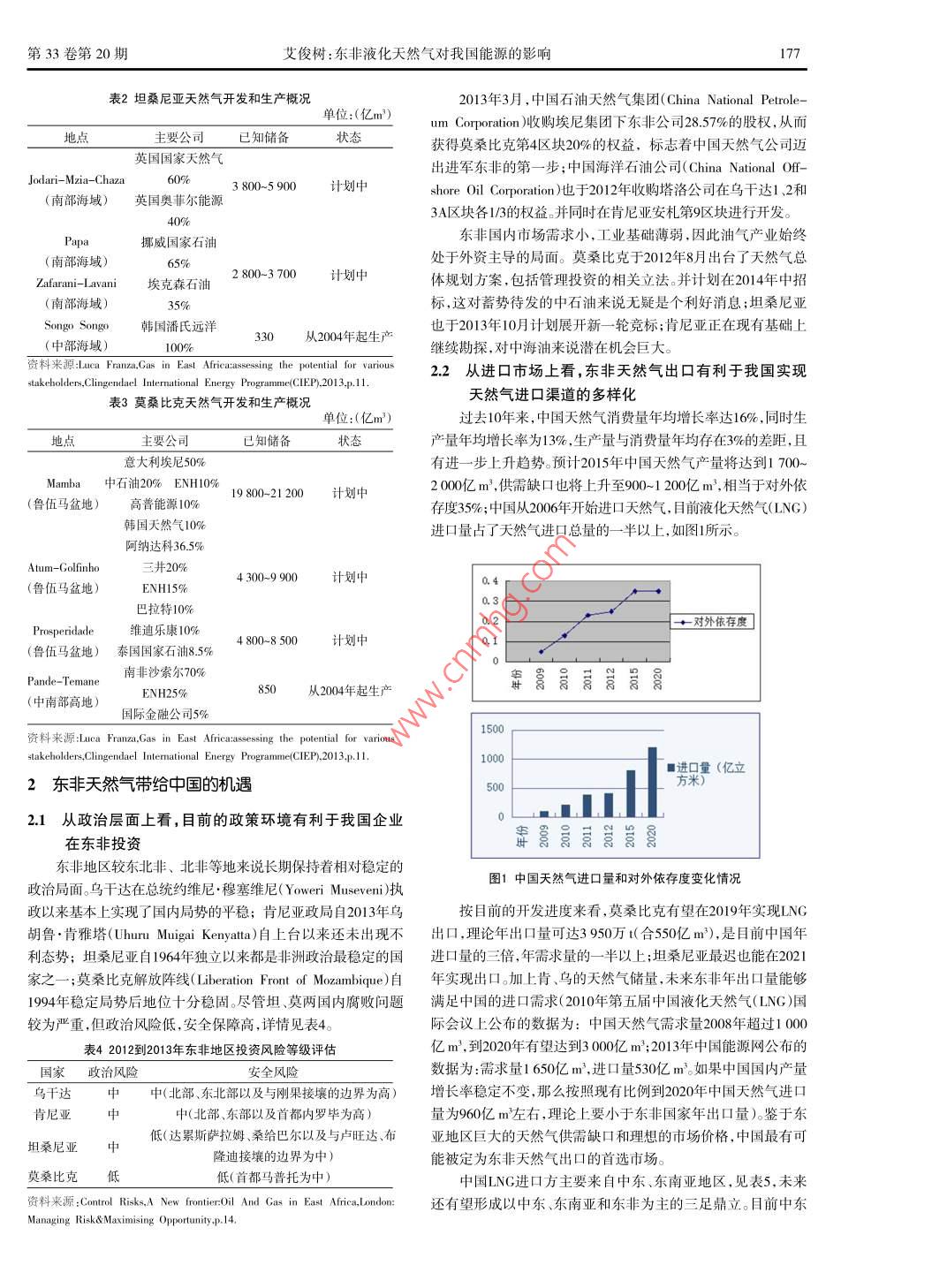 第33卷第20期企業(yè)技術(shù)開發(fā)2014年7月Vol 3 3 No 20TECHNOLOGICAL DEVELOPMENT OF ENTERPRISEJu.2014東非液化天然氣對(duì)我國能源的影響艾俊樹(云南大學(xué)國際關(guān)系研究院非洲研究中心,云南昆明650091)摘要:近年來,東非天然氣的勘探取得了重大突破。烏干達(dá)、肯尼亞、坦桑尼亞、莫桑比克等囯由于其龐大的天然氣潛在儲(chǔ)量而躋身于天然氣生產(chǎn)囯行列。然而,非洲囯家長期以來的工業(yè)基礎(chǔ)薄弱、資金匱乏、能源機(jī)制不健全等因素是限制東非天然氣產(chǎn)業(yè)發(fā)展的隱患。作為世界上最大的夭然氣消費(fèi)囯之一,中國也將注意力放在了這個(gè)潛力巨大的新興能源產(chǎn)地。東非夭然氣對(duì)中國在非洲能源領(lǐng)域的投資、中國國內(nèi)能源市場(chǎng)以及中國能源安全戰(zhàn)略都有很大的影響。關(guān)鍵詞:液化天然氣;能源;東非;中國中圖分類號(hào):TE862文獻(xiàn)標(biāo)識(shí)碼:A文章編號(hào):1006-8937(2014)20-0176-05自2006年烏干達(dá)阿爾貝特湖區(qū)發(fā)現(xiàn)了大量石油后,東非便氣生產(chǎn)地。目前已發(fā)現(xiàn)的產(chǎn)氣區(qū)主要集中在東非內(nèi)陸地區(qū)和沿作為全球能源的新前沿而被世界廣泛關(guān)注。從201年開始,隨海深水盆地,主要分布在烏干達(dá)、埃塞俄比亞、坦桑尼亞、莫桑著勘探工程的繼續(xù),肯尼亞、坦桑尼亞、莫桑比克等國家也都相比克四國。繼發(fā)現(xiàn)了大量的潛在天然氣儲(chǔ)備。作為新興能源基地,東非在烏干達(dá)的油氣資源主要集中在西部的阿爾貝特湖( Albert)全球能源格局中扮演的角色也越來越重要。中國作為天然氣消一帶。2006年塔洛公司(Tulw)首次發(fā)現(xiàn)石油并取得了開采獨(dú)費(fèi)大國,當(dāng)然不會(huì)忽視東非這個(gè)極具潛力的天然氣產(chǎn)地。本文占權(quán),初步建立了較完善的鉆井平臺(tái)。2011年塔洛公司聲稱已擬以東非天然氣領(lǐng)域?yàn)閷?duì)象,初步探討它對(duì)中國能源的影響。發(fā)現(xiàn)的石油達(dá)1億桶,且至少還有14億桶的潛在儲(chǔ)藏量。隨著國際上目前對(duì)東非天然氣的關(guān)注較為廣泛,重要集中在對(duì)已進(jìn)石油開采,伴生碳?xì)浠衔?天然氣)也逐漸被找到。僅2011年行生產(chǎn)的油氣產(chǎn)地,如烏干達(dá)、肯尼亞、埃塞俄比亞等地的油氣一年中所探明的天然氣儲(chǔ)量就達(dá)140億m3。鑒于可觀的油氣發(fā)儲(chǔ)量和生產(chǎn)情況進(jìn)行了較為詳盡的介紹,同時(shí)對(duì)新興天然氣的展前景,烏干達(dá)政府在2013年出臺(tái)了對(duì)天然氣開發(fā)和生產(chǎn)的相勘探情況作了現(xiàn)狀分析,并初步探討了東非天然氣的前景及對(duì)關(guān)法案,并可望在2014年進(jìn)行首輪招標(biāo)。本國工業(yè)發(fā)展的作用。2012年非洲已勘探天然氣儲(chǔ)量情況報(bào)告肯尼亞油氣資源主要集中在四個(gè)地區(qū),它們分別是中部的見表1安扎(Anza)、曼德拉( Mandera),西北內(nèi)陸的圖爾卡納裂谷區(qū)表12012年非洲已勘探天然氣儲(chǔ)量情況報(bào)告( Turkana)和東南沿海的拉姆盆地( Lamu basin),其中后兩個(gè)地區(qū)屬于最近探測(cè)出的潛在石油儲(chǔ)藏區(qū)。2012年肯尼亞3個(gè)鉆區(qū)域國家2012年1月儲(chǔ)量2010年需求量2010年生產(chǎn)量井平臺(tái)中有16個(gè)顯示出了碳?xì)浠衔锏嫩E象,但當(dāng)時(shí)未引起重阿爾及利亞44520視。隨著2013年莫桑比克和坦桑尼亞大量天然氣的發(fā)現(xiàn),肯尼亞游非21620利比亞l4780亞政立即計(jì)劃用兩年的時(shí)間對(duì)奧芬能源( Afren Energy)、阿納達(dá)突尼斯科( Anadarko)、BP集團(tuán)等公司的鉆井平臺(tái)進(jìn)行前期勘探,并成功尼日利亞0530地在拉姆盆地南端的的姆巴瓦( Bava)區(qū)域探測(cè)出了60)~西非喀麥隆1400億m的儲(chǔ)量。由于肯尼亞具有較為完善的油氣產(chǎn)業(yè),因此剛果(布未來天然氣前景將十分可觀。肯尼亞由于長期重視石油工業(yè),埃塞俄比亞0.0因而形成了產(chǎn)量比較穩(wěn)定的產(chǎn)業(yè)體系。部分學(xué)者認(rèn)為肯尼亞政蘇丹府有足夠能力大規(guī)模開采油氣東非烏干達(dá)坦桑尼亞內(nèi)陸尚未發(fā)現(xiàn)油氣資源,其天然氣資源主要集中坦桑尼亞在東部沿海的松戈松戈( Songo songo)和姆納茲灣(Mnai)兩莫桑比克地。2010年奧菲爾能源( Ophir)率先在此開采,2013年已探明超①表中只列出了部分國家;②(*)代表不足5億m3過1.2萬億m的天然氣,并預(yù)計(jì)可開采天然氣多達(dá)28萬億m3資料來源:O1& Gas Journal. Demand/production, U. S Department of Energy.目前除了坦桑尼亞石油發(fā)展有限公司(TPDC)之外,還有眾多Note that the latestiction data are for 2010. Note that theatest re2012國際企業(yè)參與其中,見表2。坦桑尼亞政府下一步計(jì)劃進(jìn)行招標(biāo),不過至今未有天然氣開采及生產(chǎn)的相關(guān)法案出臺(tái)1東非天然氣勘探與開發(fā)現(xiàn)狀莫桑比克天然氣的95%以上集中在東北海域的魯伍馬盆正如國際能源機(jī)構(gòu)( International Energy Agency)在2011地(Rom).自2010年以米已探明天然氣儲(chǔ)量已超過4萬億年6月的一篇報(bào)告里所說的那樣:“我們是否進(jìn)入了一個(gè)天然氣m世界銀行組織預(yù)計(jì)在魯伍馬地區(qū)還有38億m的儲(chǔ)量。加上的黃金時(shí)代?”目前東非成為了非洲大陸上最具有潛力的