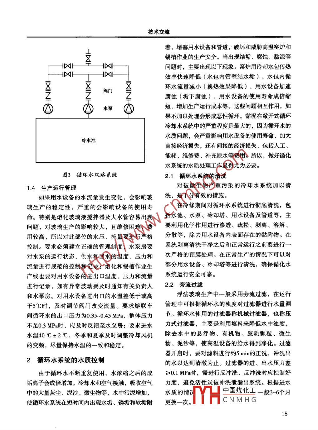 技術(shù)交流浮法玻璃生產(chǎn)線循環(huán)水系統(tǒng)的水質(zhì)控制溫計格(晶牛微晶集團股份有限公司邢臺市054000)摘要介紹了循環(huán)水系統(tǒng)對玻璃生產(chǎn)的重要作用,結(jié)合某浮法玻璃生產(chǎn)線循環(huán)水系統(tǒng)情況,重點分析了循環(huán)水系統(tǒng)的水質(zhì)處理的必要性和水質(zhì)控制的要求,提出了循環(huán)水的控制指標(biāo)和完善水質(zhì)檢測及效果檢查的方法。關(guān)鍵詞浮法玻璃生產(chǎn)線循環(huán)水水質(zhì)控制中團分類號: TQ171文獻標(biāo)識碼: A文章編號: 1003- 1987 (2015) 02 -0013-06Discussion on Water Quality Control of Circulating System for Float Glass ProductionWen Jige(Jingniu Micro crystalline group Co., Ltd., Xingtai , 054000 )Abstract: The importance of circulating water for glass production was stressed . Present status 0circulating water system in float glass industry were discussed . The necessity and targets of quality controlof circulating-water were analyzed in details. Test procedures for monitoring water quality were alsorecommended .Key Words: float glass line , circulating water , water quality , control水系統(tǒng)給玻璃生產(chǎn)帶來的問題也越來越多,如果0引言不注意水質(zhì)處理,用水設(shè)備出現(xiàn)結(jié)垢、腐蝕、黏浮法玻璃生產(chǎn)線的循環(huán)水主要是對高溫窯爐泥的情況就會很嚴(yán)重。和錫槽內(nèi)- -些用水設(shè)備進行冷卻,主要用水設(shè)備有本文以某公司浮法玻璃生產(chǎn)線為例,介紹了其玻璃液攪拌器、卡脖水包、前臉?biāo)?、L型吊墻水循環(huán)水系統(tǒng)的運行和水質(zhì)處理思路,旨在同行業(yè)進包、鼓泡器、各種儀器儀表、成形拉邊機、錫槽水行水處理方案時能起到一定的參考作用。文中出現(xiàn)包等,通過循環(huán)水冷卻、降溫,調(diào)節(jié)工藝溫度,保的水的硬度和堿度單位均按mg/L (以CaCO,計)。證各項設(shè)備的連續(xù)正常運行。水流量、水壓和水質(zhì)必須滿足生產(chǎn)工藝要求,特別是水質(zhì)要求最為重1浮 法玻璃生產(chǎn)線循環(huán)水系統(tǒng)要,只有符合指標(biāo)要求的系統(tǒng)循環(huán)水,才能防止或1.1循環(huán)水 系統(tǒng)工藝流程減輕用水設(shè)備和管道的結(jié)垢和腐蝕,使循環(huán)水在系浮法玻璃生產(chǎn)線循環(huán)水的組成分為兩部分:統(tǒng)內(nèi)暢通無阻。如果循環(huán)水系統(tǒng)不能確保生產(chǎn)工藝-部分 為原水,要經(jīng)過過濾和軟化的軟化水;另要求的水流量,或因結(jié)垢和腐蝕而影響水流量,可- .部分為投人循環(huán)運行的系統(tǒng)循環(huán)水。循環(huán)水系能會造成高溫設(shè)備腐蝕穿孔,使循環(huán)水流人到高溫統(tǒng)中的冷卻水流經(jīng)高溫用水設(shè)備時,冷卻水溫度窯爐內(nèi),輕者影響玻璃生產(chǎn)的正常進行,重者造成升高,成為熱水,經(jīng)過冷卻后仍返回系統(tǒng)重復(fù)使比較大的生產(chǎn)事故。因此,玻璃循環(huán)水系統(tǒng)對生產(chǎn)用。在窯爐循環(huán)給水管道上設(shè)置有過濾器,去掉的作用非同小可,必須引起足夠的重視。水中雜質(zhì)后的凈水進人冷水池。設(shè)有高32m、容隨著浮法技術(shù)的發(fā)展,大型、特大型生產(chǎn)線積500 m’的中國煤化工水塔為應(yīng)急水逐漸增多,循環(huán)水用量也逐漸增大,因循環(huán)冷卻源,用于停YHCNM. H G所示。3全國性建材科技期刊--《玻璃》 2015年 第2期總第281期殺菌滅藁| 緩蝕阻垢(回水)-[ 熱水池-[熱水循環(huán)泵}一[冷卻塔]用水設(shè)備L「過諸器軟化處理一- 原水補充水給水)-DX→冷水循環(huán)泵冷水池| 冷水水塔旁濾泵-過濾器圖1循環(huán)冷卻水系統(tǒng)流程圖1.2 敞開式循環(huán)冷 卻水系統(tǒng)開排氣閥使液體充滿泵腔,然后關(guān)閉排氣閥,泵循環(huán)冷卻水系統(tǒng)又可分為敞開式和密閉式,不得干運轉(zhuǎn)。起動電機,待轉(zhuǎn)速正常后在逐漸打目前浮法玻璃生產(chǎn)線循環(huán)水系統(tǒng)大多采用敞開開出水閥,調(diào)制所需工況。在停止運轉(zhuǎn)時,要先式。在敞開式循環(huán)冷卻水系統(tǒng)中,部分水被蒸關(guān)閉出水閥,如果環(huán)境溫度較低,應(yīng)將泵體下方發(fā),含鹽量就不斷增加,這是造成用水設(shè)備結(jié)垢四方旋塞打開,放掉剩水,以免凍裂。和腐蝕的根源。為了減少結(jié)垢和腐蝕,確保用水大多泵房的循環(huán)泵系統(tǒng)設(shè)計如圖2所示,水設(shè)備的使用安全,必須根據(jù)水質(zhì)情況加人新鮮的泵的設(shè)置為2用1備或2用2備。在一個窯期內(nèi),要生產(chǎn)補充水,排放掉- - 部分水質(zhì)較差的循環(huán)水,求閥門的質(zhì)量非??煽浚媚軌蛟诓煌V瓜到y(tǒng)以保持含鹽量穩(wěn)定在規(guī)定的濃度范圍內(nèi)。循環(huán)水運行的前提下進行保養(yǎng)、檢修或更換。為了進-的含鹽量與生產(chǎn)補充水的含鹽量相比,其比值稱步確保系統(tǒng)的連續(xù)運行,循環(huán)水管路系統(tǒng)應(yīng)設(shè)計為濃縮倍數(shù),在敞開式循環(huán)冷卻水系統(tǒng)中,濃縮為雙路系統(tǒng),循環(huán)水雙路系統(tǒng)如圖3所示。倍數(shù)是一項重要的參數(shù)。循環(huán)水中控制好- -定的濃縮倍數(shù),對穩(wěn)定水質(zhì)、減少水對設(shè)備的腐蝕起著重要作用。采用循環(huán)冷卻水處理技術(shù)后,當(dāng)濃縮倍數(shù)達到2.0時,與直流水相比,可節(ji