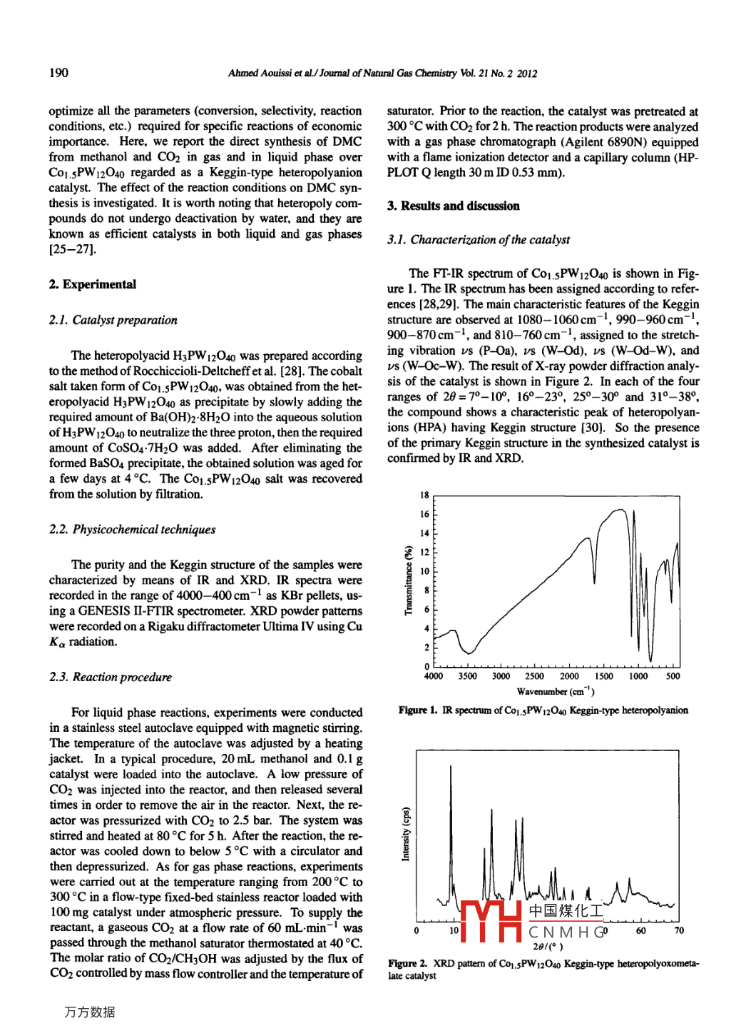 Available online at www.sciencedirect.comJOUPRNLOFScienceDirectNATURAL GAS; CHEMISTRYELSEVIERJoumal of Natural Gas Chemistry 21(2012)189- -193www.elsev1er.com locatejngcComparative study between gas phase and liquid phase forthe production of DMC from methanol and CO2Ahmed Aouissi*, Salem S. Al-DeyabDepartment of Chemistry, King Saud University, P. O. Box 2455, Riyadh 11451, Saudi ArabiaI Manuscript received August 15, 2011; revised October 9, 2011]AbstractDirect synthesis of dimethyl carbonate (DMC) from methanol and carbon dioxide over Co1 sPW 12040 in liquid and in gas phase is investigated.The synthesized catalyst has been characterized by means of FTIR and XRD. Liquid phase experiment results showed that high pressures arefavorable for the synthesis of DMC. However, DMC formation is limited by the reaction with co-produced water. DMC selectivity is morestrongly dependent on the temperature than on the pressure of CO2. As for the reactions in gas phase, it has been found that both CH3OHconversion and DMC selectivity decreased with increasing temperature, owing to the decomposition of DMC at high temperatures. Hightemperatures and more amount of Co1.sPW 12040 catalyst favor the fornation of dimethoxymethane (DMM) and methyl formate (MF).Key wordsheteropolyanion; Keggin structure; methanol; dimethyl carbonate; carbon dioxide1. Introductionbility of an explosion. Recently, the conversion of methanolin the presence of carbon dioxide has drawn much attention,due to the abundance, the cheapness, the non-toxicity andTwo routes can be used to perform the natural gas up~the non-flammability of carbon dioxide, compared with cur-grading: direct conversion of methane and indirect conver-rently used phosgene and carbon monoxide [18,20]. There-sion via methanol. In fact, methanol is manufactured fromfore, the development of efficient heterogeneous catalytic sys-syngas, which is typically produced from the steam reform-tems has attracted more attention. Bian et al. [21] studieding of methane. Thus, the conversion of methanol into valu-the reaction over Cu-Nigraphite nanocomposite catalyst inable chemicals is within the framework of upgrading naturalgaseous phase. They obtained 10.13% CH3OH conversiongas. Among the products obtained from methanol, dimethyland 89.04% DMC selectivity at 105 °C. Wu et al. [22] studiedcarbonate is considered as an important product in chemi-the synthesis of DMC from gaseous methanol and CO2 overcal syntheses as well as in industry [1- 3], which is an en-H3PO4 modified V2Os catalyst with various molar ratios ofvironmentally benign chemical product with a wide rangeH3PO4N2Os (P/N). The best conversion (1.95%) and selec-of applications. It has been used as a good solvent [4], antivity of DMC (92.12%) was obtained at 130 °C over the cata-alkylation agent [5] and a substitute for highly toxic phos-lyst H3PO4/V2Os (P/V = 0.20). The relatively low DMC yieldgene and dimethyl sulfate in many chemical processes [6-9].obtained from the direct synthesis from methanol and CO2 isIt is also used as an intermediate in the synthesis of poly-due to the fact that CO2 is thermodynamically stable and ki-carbonates and isocyanates [10,11]. In addition, it is ex-netically inert and also the deactivation of catalysts inducedpected to replace the gasoline oxygenate methyl tert-butylby water formation during reaction process [23,24]. The inert-ether (MTBE), because of its high oxygen content, low toxi-ness of carbon dioxide and the reaction of water produced bycity and rapid biodegradability [3,4,12- 14]. Currently, DMCthe reaction bring serious drawbacks for further applications.is produced mainly by oxidative carbonylation of methanolThe main problem is to find an efficient catalyst, as well as(non-phosgene route) [15]. The synthesis can be carried outoptimal operating conditions. Therefore, the direct synthesisin both liquid- and gas-phases [16- 19]. However, both routesof DMC from methanol and carbon dioxide in liquid and gasuse poisonous gas of carbon monoxide and there is the possi-phase is still中國煤化工igations in order to●Coresponding author. Tel: 00 966 1 4675958; Fax: 00 966 1 4675992; E-mail: aouissed@yahMYHCNMHGCopyrightO2012, Dalian Institute of Chemnical Physics, Chinese Academy of Sciences. All rights reserved.doi:10.1016/S1003- 959311)60353-8.190Ahmed Aouissi et aL/ Journal of Natural Gas Chemistry Vol. 21 No. 22012optimize all the parameters (conversion, selectivity, reactionsaturator. Prior to the reaction, the catalyst was pretreated atconditions, etc.) required for specific reactions of economic300 °C with CO2 for 2 h. The reaction products were analyzedimportance. Here, we report the direct synthesis of DMCwith a gas phase chromatograph (Agilent 6890N) equippedfrom methanol and COr in gas and in liquid phase overwith a flame ionization detector and a capillary column (HP-Co1.sPW:2O40 regarded as a Keggin-type heteropolyanionPLOT Q length 30 m D 0.53 mm).catalyst. The effect of the reaction conditions on DMC syn-thesis is investigated. It is worth noting that heteropoly com-3. Results and discussionpounds do not undergo deactivation by water, and they areknown as efficient catalysts in both liquid and gas phases3.1. Characterization of the catalyst[25- -27]. .The FT-IR spectrum of Co1 sPW12O40 is shown in Fig-2. Experimentalure 1. The IR spectrum has been assigned according to refer-ences [28,29]. The main characteristic features of the Keggin2.1. Catalyst preparationstructure are observed at 1080- 1060cm-1, 990- 960 cm~900-870cm 1 , and 810- - 760 cm~ I , assigned to the stretch-The heteropolyacid H3PW 12O40 was prepared accordinging vibration vs (P- _Oa), vs (W -0d), vs (W- _Od- W), andto the method of Rocchiccioli-Deltcheff et al. [28]. The cobaltvs (W- Oc -W). The result of X-ray powder diffraction analy-salt taken form of Co1 sPW 12O40, was obtained from the het-sis of the catalyst is shown in Figure 2. In each of the foureropolyacid H3PW12O40 as precipitate 