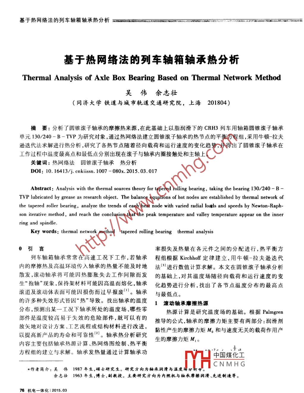 基于熱網(wǎng)絡(luò)法的列車軸箱軸承熱分析基于熱網(wǎng)絡(luò)法的列車軸箱軸承熱分析Thermal Analysis of Axle Box Bearing Based on Thermal Network Method吳偉余志壯同濟(jì)大學(xué)鐵道與城市軌道交通研究院,上海201804)摘要:分析了圓錐滾子軸承的摩擦熱來源,在此基礎(chǔ)上以脂潤滑下的cRH3列車用軸箱圓錐滾子軸承單元130/240-B-TVP為研究對象,通過熱網(wǎng)絡(luò)法建立圓錐滾子軸承的熱節(jié)點(diǎn)的平衡方程組,采用牛頓-拉夫遜迭代法求解進(jìn)行熱分析,研究了各熱節(jié)點(diǎn)隨著徑向載荷和運(yùn)行速度的變化趨勢,并得出了圓錐滾子軸承在工作過程中溫度最高點(diǎn)和最低點(diǎn)分別出現(xiàn)在滾子與軸承內(nèi)圈接觸處和主軸上關(guān)鍵詞:熱網(wǎng)絡(luò)法圓錐滾子軸承熱分析DOI:10.1641l3/ j. cnkiissn.1007-080x.2015.03.017Abstract: Analysis with the thermal sources theory for tapered rolling bearing, taking the bearing 130/240-BTVP lubricated by grease as research object. The balance equations of hot nodes are established by thermal network ofthe tapered roller bearing, analyze the trends of each heat node with varied radial loads and speeds by Newton- Raphson iterative method, and reach the conclusion that the peak temperature and valley temperature appear on the innerKey words: thermal network method tapered rolling bearing thermal analysis0引言率損失及熱量在各元件之間的分配進(jìn)行,熱平衡方列車軸箱軸承常常在高速工況下工作,若軸承程組根據(jù) Kirchhoff定律建立,用牛頓-拉夫遜迭代內(nèi)的摩擦熱及高溫環(huán)境傳入軸承的熱量不能及時(shí)地法③進(jìn)行數(shù)值計(jì)算求解。本文在圓錐滾子軸承分析散發(fā),滾動(dòng)軸承將可能因熱膨脹失去工作間隙而發(fā)的基礎(chǔ)上,對其溫度場隨徑向載荷和運(yùn)行速度的變生“抱軸”現(xiàn)象,保持架材料可能因高溫而熔化,軸承化趨勢進(jìn)行分析,找出了各節(jié)點(diǎn)溫度分布的最高點(diǎn)滾道及滾動(dòng)體表面可能因損傷而過早報(bào)廢。軸承與最低點(diǎn)。的許多種失效形式皆因“熱”導(dǎo)致。找出軸承的溫度1滾動(dòng)軸承摩擦熱源分布,預(yù)測出某一工況下軸承所處的溫度場、哪些零熱源計(jì)算是研究溫度場的基礎(chǔ)。根據(jù) Palmgren部件是溫度較高易于失效的危險(xiǎn)部件,就可以有的推導(dǎo)的公式,軸承的摩擦力矩主要有兩部分:潤滑劑放矢地對設(shè)計(jì)方案、工藝流程或結(jié)構(gòu)材料進(jìn)行改進(jìn),以提高新產(chǎn)品的壽命和可靠性2]。軸承熱分析研究黏性產(chǎn)生的摩擦力矩M。和與速度無關(guān)的載荷作用產(chǎn)生的摩擦力矩M1。內(nèi)容主要包括軸承熱源計(jì)算、熱網(wǎng)絡(luò)圖繪制、熱平衡方程組的建立與求解。軸承發(fā)熱量通過計(jì)算軸承功、中國煤化工CNMHG*作者簡介:吳偉1987年生,碩士研究生。研究方向?yàn)檩S承潤滑與溫度場分礦于。余志壯1963年生,博士,副教授。主要研究方向?yàn)閮?nèi)燃機(jī)與軸承摩擦潤滑、先進(jìn)制造等。76機(jī)電一體化12015.03Application· Communication應(yīng)用交流M,=f1P1dn。dh式中,f6為與軸承類型和潤滑方式有關(guān)的系數(shù);v為工pcvx,=q,(i=1,2,…,n)。作溫度下潤滑劑的運(yùn)動(dòng)黏度,mn/;n為主軸轉(zhuǎn)速,式中,為密度;e為比熱容;為體積業(yè)為溫度對時(shí)r/min;d為軸承節(jié)圓,mmf為與軸承類型和所受載荷有關(guān)的系數(shù);P為確定軸承摩擦力矩的計(jì)算載荷,間的導(dǎo)數(shù)。N;Ma、M1為摩擦力矩,N·mm求解這一微分方程組可獲得系統(tǒng)的瞬態(tài)溫度場。滾動(dòng)軸承接觸區(qū)熱生產(chǎn)還與滾動(dòng)體和套圈的自熱網(wǎng)絡(luò)法的節(jié)點(diǎn)位置的布局、網(wǎng)絡(luò)的疏密程度完全由旋有關(guān)。根據(jù)高速下軸承套圈溝道理論,滾動(dòng)體和研究者根據(jù)實(shí)際需要來靈活掌握因而用起來很方便。內(nèi)套圈存在自旋自旋摩擦力矩為M=3Q8。3圓錐滾子軸承溫度場模型建立及分析式中,μ為滾動(dòng)體與溝道的摩擦系數(shù);Q為滾動(dòng)體與本文以脂潤滑下的CRH3列車用軸箱圓錐滾子溝道的法向接觸載荷,N;a為赫茲接觸橢圓長半軸,軸承單元130240-B-TVP為研究對象B表示帶潤m;e為第二類橢圓積分。因此,軸承的摩擦熱可計(jì)滑脂和密封,TvP表示塑鋼保持架,見圖1。外形尺寸算得為dDB=130mm×240mm×160mm。軸承發(fā)熱量主要2嚇n(M。+M1)+M,on由軸承元件相互運(yùn)動(dòng)產(chǎn)生,首先需分析其內(nèi)部的運(yùn)動(dòng)及受力關(guān)系。所建立的承載模型見圖2式中,n為主軸轉(zhuǎn)速,r/min;a,為滾動(dòng)體內(nèi)圈自旋運(yùn)動(dòng)的角速度,rad/s。2熱網(wǎng)絡(luò)法的理論基礎(chǔ)目前,軸承熱分析主要包括有限元法、熱網(wǎng)絡(luò)法和實(shí)驗(yàn)法。熱網(wǎng)絡(luò)法是緊跟現(xiàn)代電子學(xué)發(fā)展的,它的分析方法基本上效法電系統(tǒng),其網(wǎng)絡(luò)理論可認(rèn)為是電子學(xué)和電系統(tǒng)的網(wǎng)絡(luò)。這是因?yàn)樵谝磺泻形锪髋c能流的動(dòng)態(tài)系統(tǒng)中,不論該系統(tǒng)中是否有電的存在都可找到電系統(tǒng)中的電阻、電容和電感等概念的對應(yīng)物,電阻對應(yīng)各種阻力和對能量的消耗與節(jié)流,電容對應(yīng)各種形式的儲(chǔ)存能量,電感對應(yīng)各種慣性儲(chǔ)存能圖1 TAROL雙列圓錐滾子軸