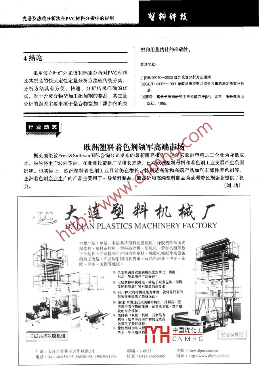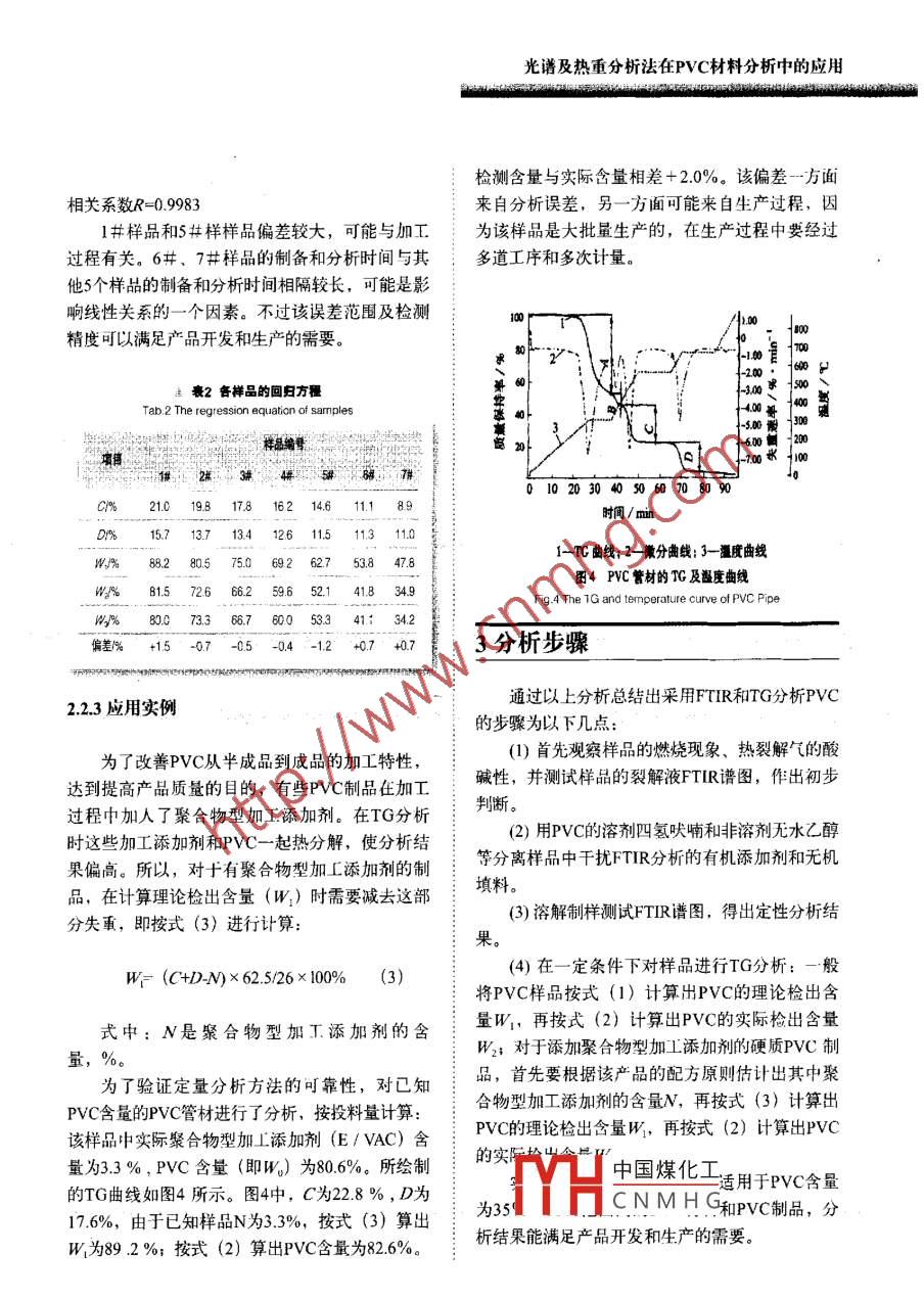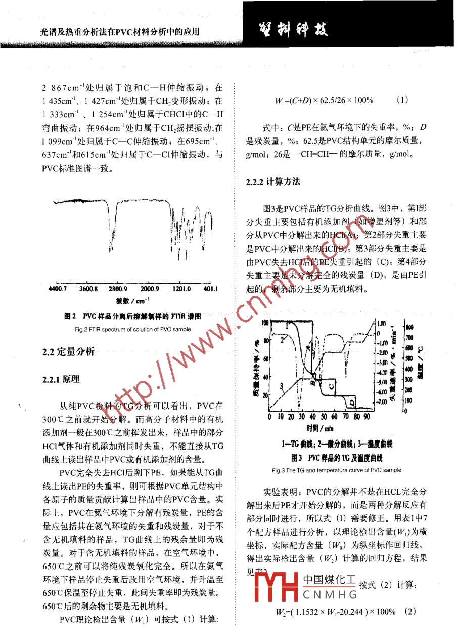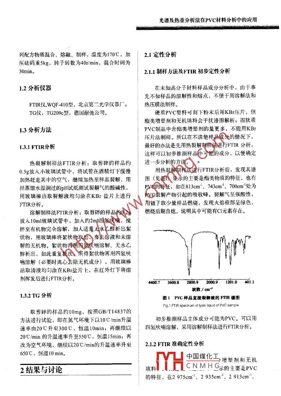 擁鏵技文章編號:1005-3360(2007)09009005光譜及熱重分析法在PVC材料分析中的應(yīng)用The Utilization of spectrum and tg analyses in thePVC Material Stud齊齊哈爾齊盟塑料制吊有限公司黑龍江齊齊啥爾161000Qiqihar Qisu Plastic Products Co, Ltd, Qiqihar 161000, China摘要:詳細(xì)介紹對于未知PVc樣品先用裂解法制樣進(jìn)行紅外光譜分析初步定性,再用溶解法制樣進(jìn)行紅外光譜分析驗證;PVC材料熱分解過程較復(fù)雜,不能童接從熱量檢測結(jié)果(TG曲線)讀出各組分含量,需將檢測結(jié)果通過線性回歸方程計算得出PVc的含量,PVC含量在30%80%范國內(nèi)具有較好的線性關(guān)系(R=0.9983)。與傳統(tǒng)的分離,分析方法相比,此方法具有方便、快速、分析結(jié)果準(zhǔn)確的優(yōu)點Abstract: For unknown Pvc product, to make a sample by splitting method is to determine its primaryquality through FTIR spectrometric analysis, then to make another sample by solution methodis to validated by FtiR analysis. It is difficult to get the readout of the content of each ingredientdirectly from the TG curve due to the complication of Pvc material, it needs to calculate andtranslate the measured results into pvc content through the linear regression equation. Thereis good linear relationship in the rangs 30%-80% content of PVc(R=0. 9983). The method is moreonvenient, and reliable than traditional mu關(guān)鍵詞:光譜分析;熱分析;PVc含量;定性定量分析中圖分類號:TQ320.77文獻(xiàn)標(biāo)識碼:BKey words: Spectral analysis; TG analysis; PVC content; Qualitative and quantitative analysisPVC制品中往往加入了無機填料和對紅外光11樣品配方及加工方法:具有較強吸收的醋類增塑劑,由于增塑劑和無機填料的干擾,按上述方法直接用FTIR分析較困樣品配方見表1難;其次,PVC為非結(jié)晶物質(zhì),用DSC分析觀用德國產(chǎn) Brabendar加工性能試驗儀將表1所察不到熔融、結(jié)晶峰,玻璃化轉(zhuǎn)變也不明顯,不能測出其熔點或用7來驗證FTR分析結(jié)果A衰1禪品配方Tab. 1 The sample fomula再次,PⅤC熱分解過程較復(fù)雜,在增塑劑等有機助劑揮發(fā)出來的同時,還會有PVC分解的氯樣品編號原化氫(HCl)氣體揮發(fā)出來,這給定量分析帶來21314陣-#了困難。針對PVC制品的這些特殊性,筆者經(jīng)反復(fù)試驗和分析,總結(jié)出…套PVC定性定量分析方碳酸鈣33法,并且已經(jīng)成功地應(yīng)用于檢測工作。中國煤化工CNMHG.. 251實驗部分H歌片順權(quán)據(jù)70207光譜及熱重分析法在PVC材料分析中的應(yīng)用列配方物質(zhì)混合、熔融、制樣,溫度為170℃,加2.1定性分析壓砝碼重kg,轉(zhuǎn)子轉(zhuǎn)數(shù)為40r/min,混合時間為211制樣方法及FTIR初步定性分析12分析儀器在未知高分子材料樣品成分分析中,由于事先不知樣品的溶解性和熔點,不便于用溶解法和FTR儀WQF-410型,北京第二光學(xué)儀器廠;熱壓膜法制樣TG儀,TG209c型,德國耐弛公司。硬質(zhì)PⅤC塑料叮刮下粉末后用KBr壓片,但酯類增塑劑和無機填料會干擾譜圖解析;而軟質(zhì)3分析方法PVC制品中含酯類增塑劑的量更多,不能用KBr壓片法制樣。所以在不清楚樣品成分的情況下,13.1FTIR分析最好的辦法是先用熱裂解制樣法進(jìn)行FTR分析,這樣可以初步推測樣品中可能的成分,以便確定熱裂解制樣法FTIR分析:取剪碎的樣品約氵進(jìn)一步分析的方法0.5g放入小玻璃試管中,將試管在酒精燈下緩慢用熱裂解制樣法進(jìn)行FTIR分析后,發(fā)現(xiàn)其譜加熱趕走其中的空氣,繼續(xù)加熱至樣品裂解,用圖(見圖1)顯示的主要是酯類物質(zhì)的特征,也有經(jīng)蒸餾水濕潤過的pH試紙測試裂解氣的酸堿性,PVC的特征,如在813cm1、743cm、700m處為用玻璃棒沾取裂解液均勻涂在KBr鹽片上進(jìn)行PVC裂解產(chǎn)物引起的吸收峰。裂解氣呈強酸性FTIR分析。用鑷子取少量樣品燃燒,發(fā)現(xiàn)火焰根部呈綠色,溶解制樣法FT分析:取剪碎的樣品約0.2g氵燃燒后期自熄,說明其中可能有C元素存在。放入10ml玻璃試管中,加入約2m四氫吠喃,攪拌至有機物完全溶解,加人適量無水乙醇析出絮狀物,用玻璃棒將絮狀物取出,棄去溶液和未溶解的無機物。絮狀物再用四氫吠喃溶解、無水乙醇析出,如此重復(fù)數(shù)次,所得絮狀物再用四氫吠喃溶解(必要時離心去除無機成分),用玻璃棒沾取清液均勻涂在KBr鹽片上,在紅外燈下將溶劑揮發(fā)后進(jìn)行FTR分析。460730292m9tm0-i波數(shù)/cm1.32TG分析圖PVC樣品直接裂解液的PTR譜圖Fig 1 FTIR spectrum of lysis liquid of PVC sample取剪碎的樣品約0mg,按照GBT14837的方法進(jìn)行試驗,即在氮氣環(huán)境下以10℃min升溫初步推測樣品主體成分可能為PVC??梢杂盟俾视?0℃升至300℃,恒溫10min;再繼續(xù)以:四氫吠喃溶解,采用溶解制樣法進(jìn)行FTR分析。20℃/min的升溫速率升至550℃,恒溫15min;再改為空氣環(huán)境,繼續(xù)以20℃/min的升溫速率升至2.1.2FTIR準(zhǔn)確定性分析650℃,恒溫10min。中國煤化工增塑劑和無機2結(jié)果與討論填料CNMH示的主要是PⅤC的特征,在2975cm、2935cm1、2913cm、光譜及熱重分析法在PVC材料分析中的應(yīng)用擁鏵蘞2867cm處歸屬于飽和C-H伸縮振動;在1435cm、1427cm處歸屬于CH變形振動;在W=(C+D)×625/26×100%1333cm、1254cm處歸屬于CHC|中的CH彎曲振動;在964cm處歸屬于CH2搖擺振動在中:C是PE在氯氣環(huán)境下的失重率,%;Dl099cm處歸屬于C-C伸縮振動;在695cm是殘?zhí)苛?%;62.5是PVC結(jié)構(gòu)單元的摩爾質(zhì)量637cm1和615cm處歸屬于C-Cl伸縮振動,與gmol