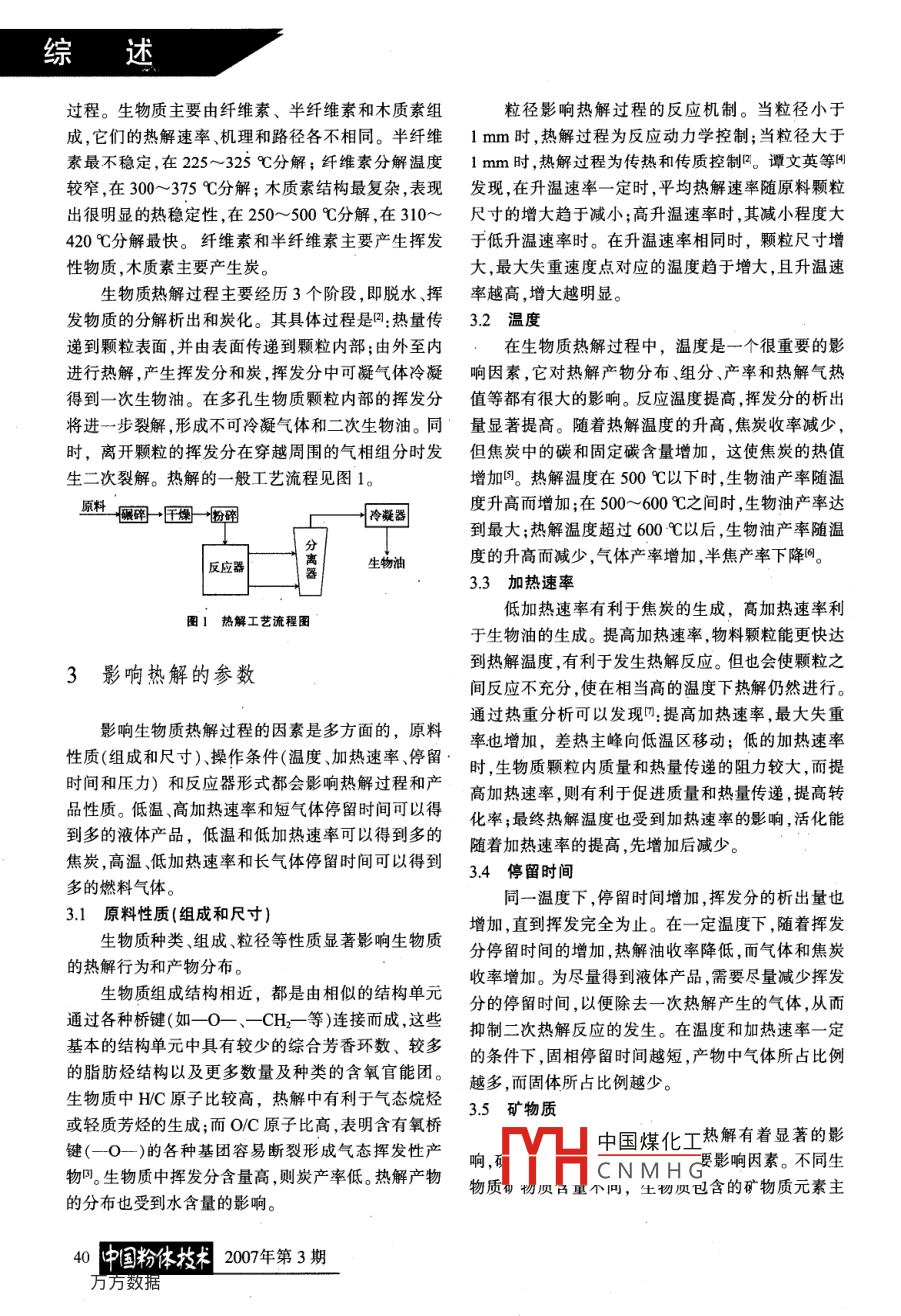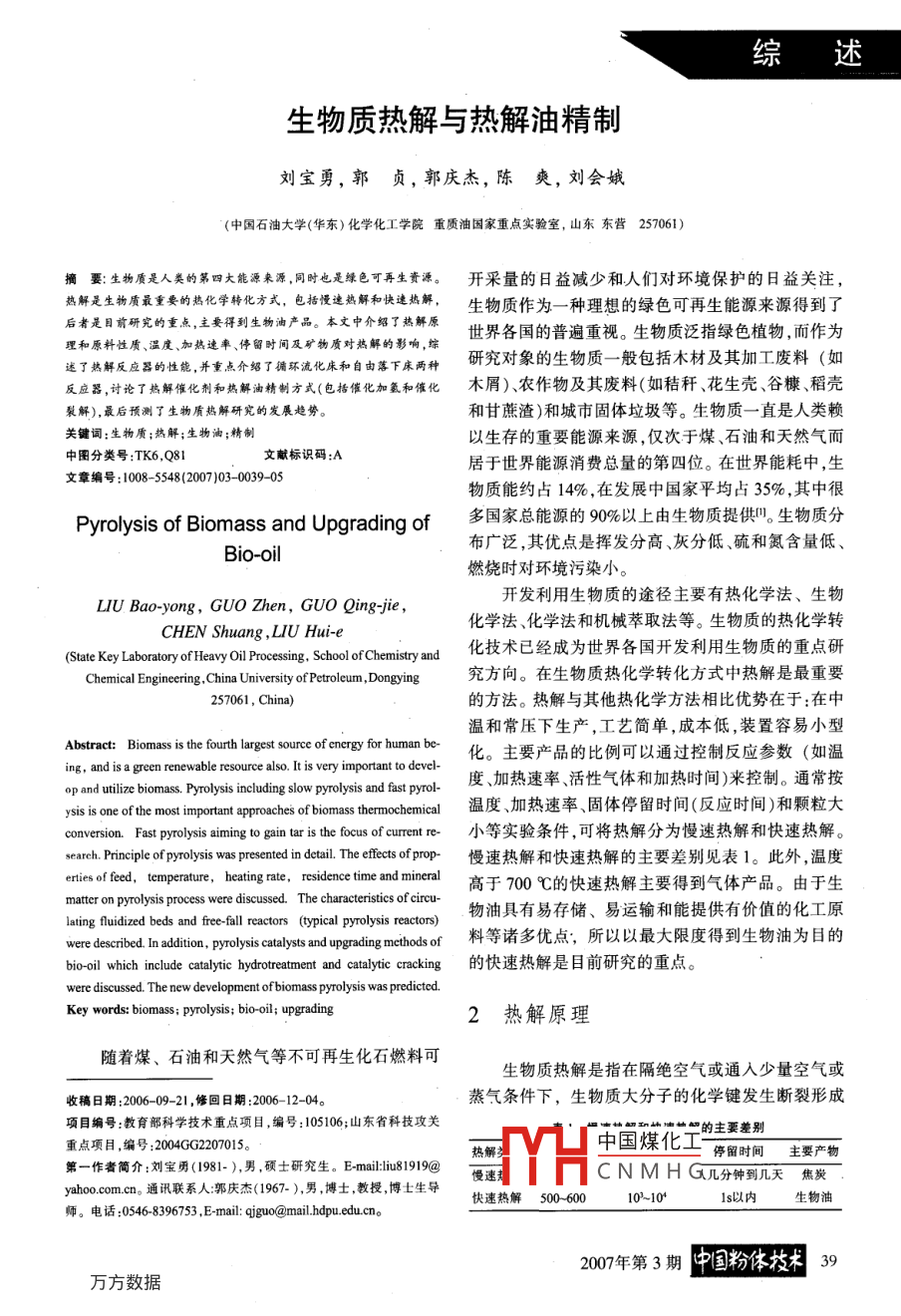 綜述生物質(zhì)熱解與熱解油精制劉寶勇,郭貞,郭慶杰,陳爽,劉會娥(中國石油大學(xué)(華東)化學(xué)化工學(xué)院重質(zhì)油國家重點實驗室,山東東營257061)摘要:生物質(zhì)是人類的第四大能源來源,同時也是綠色可再生責(zé)源。開采量的日益減少和人們對環(huán)境保護的日益關(guān)注,熱解是生物質(zhì)最重要的熱化學(xué)精化方式,包括便速熱解和快速熱解,生物質(zhì)作為一種理想的綠色可再生能源來源得到了后者是目前研究的重點,主要得到生物油產(chǎn)品。本文中介紹了熱解原世界各國的普遍重視。生物質(zhì)泛指綠色植物,而作為理和原料性質(zhì)、溫度、加熱速率、停留時間及礦物質(zhì)對熱解的影響,綜迷了熱解反應(yīng)器的性能,并重點介紹了循環(huán)流化床和自由落下床兩種研究對象的生物質(zhì)一般包括木材及其加工廢料(如反應(yīng)器,討論了熱解催化劑和熱解油精制方式(包括催化加氨和催化木屑)、農(nóng)作物及其廢料(如秸稈、花生殼、谷糠、稻殼褽解),最后預(yù)測了生物質(zhì)熱解研究的發(fā)展趨勢和甘蔗渣)和城市固體垃圾等。生物質(zhì)一直是人類賴關(guān)鍵詞:生物質(zhì);熱解;生物油;精制以生存的重要能源來源,僅次于煤、石油和天然氣而中圖分類號:TK6,Q81文獻標(biāo)識碼:A居于世界能源消費總量的第四位。在世界能耗中,生文章編號:1008-5548(2007)03-003905物質(zhì)能約占14%,在發(fā)展中國家平均占35%,其中很Pyrolysis of Biomass and Upgrading of多國家總能源的9%以上由生物質(zhì)提供生物質(zhì)分布廣泛,其優(yōu)點是揮發(fā)分高、灰分低、硫和氮含量低Bio-oil燃燒時對環(huán)境污染小。IU Bao-yong, GUo Zhen, Guo Qing-jie開發(fā)利用生物質(zhì)的途徑主要有熱化學(xué)法、生物CHEN Shuang, LIU Hui-e化學(xué)法、化學(xué)法和機械萃取法等。生物質(zhì)的熱化學(xué)轉(zhuǎn)State Key Laboratory of Heavy Oil Processing, School of Chemistry and化技術(shù)已經(jīng)成為世界各國開發(fā)利用生物質(zhì)的重點研Chemical Engineering, China University of Petroleum, Dongying究方向。在生物質(zhì)熱化學(xué)轉(zhuǎn)化方式中熱解是最重要257061, China的方法。熱解與其他熱化學(xué)方法相比優(yōu)勢在于:在中溫和常壓下生產(chǎn),工藝簡單,成本低,裝置容易小型Abstract: Biomass is the fourth largest source of energy for human化。主要產(chǎn)品的比例可以通過控制反應(yīng)參數(shù)(如溫ing, and is a green renewable resource also. It is very important to devel-p and utilize biomass. Pyrolysis including slow pyrolysis and fast py度、加熱速率、活性氣體和加熱時間)來控制。通常按sis is one of the most important approaches of biomass thermochemi溫度、加熱速率、固體停留時間(反應(yīng)時間)和顆粒大conversion. Fast pyrolysis aiming to gain tar is the focus of current re-小等實驗條件,可將熱解分為慢速熱解和快速熱解search Principle of pyrolysis was presented in detail. The effects of prop-慢速熱解和快速熱解的主要差別見表1。此外,溫度erties of fe. temperature, heating rate, residence time and minera高于700℃的快速熱解主要得到氣體產(chǎn)品。由于生matter on pyrolysis process were discussed. The characteristics of circu物油具有易存儲、易運輸和能提供有價值的化工原were described. In addition, pyrolysis catalysts and upgrading methods料等諸多優(yōu)點,所以以最大限度得到生物油為目的bio0 which include catalytic hydrotreatment and catalytic cracking的快速熱解是目前研究的重點。were discussed. The new development of biomass pyrolysis was predicted.Key words: biomass; pyrolysis; bio-oil; upgrading2熱解原理隨著煤、石油和天然氣等不可再生化石燃料可生物質(zhì)熱解是指在隔絕空氣或通入少量空氣或收稿日期:2006-09-21,修回日期:2006-12-04。蒸氣條件下,生物質(zhì)大分子的化學(xué)鍵發(fā)生斷裂形成項目編號:教育部科學(xué)技術(shù)重點項目,編號:105106;山東省科技攻關(guān)重點項目,編號:2004GG2207015。中國煤化工停留時間主要產(chǎn)物第一作者簡介:劉寶勇(198-),男,碩士研究生。Emi8199g慢速CNMHG幾分鐘到幾天焦炭yahoo.com.cn。通訊聯(lián)系人郭慶杰(1967-),男,博士教授博土生導(dǎo)快速熱解500600103-104ls以內(nèi)生物油師。電話:05468396753,E-mail:anguo@mail.dpu.edu.cn200第3期P國粉體術(shù)39綜述過程。生物質(zhì)主要由纖維素、半纖維素和木質(zhì)素組粒徑影響熱解過程的反應(yīng)機制。當(dāng)粒徑小于成,它們的熱解速率、機理和路徑各不相同。半纖維1mm時,熱解過程為反應(yīng)動力學(xué)控制;當(dāng)粒徑大于素最不穩(wěn)定,在225~325℃分解;纖維素分解溫度1mm時,熱解過程為傳熱和傳質(zhì)控制。譚文英等閩較窄,在300~375℃分解;木質(zhì)素結(jié)構(gòu)最復(fù)雜,表現(xiàn)發(fā)現(xiàn),在升溫速率一定時,平均熱解速率隨原料顆粒出很明顯的熱穩(wěn)定性,在250~500℃分解,在310~尺寸的增大趨于減小;高升溫速率時,其減小程度大420℃分解最快。纖維素和半纖維素主要產(chǎn)生揮發(fā)于低升溫速率時。在升溫速率相同時,顆粒尺寸增性物質(zhì),木質(zhì)素主要產(chǎn)生炭大,最大失重速度點對應(yīng)的溫度趨于增大,且升溫速生物質(zhì)熱解過程主要經(jīng)歷3個階段,即脫水、揮率越高,增大越明顯。發(fā)物質(zhì)的分解析出和炭化。其具體過程是四:熱量傳3.,溫度遞到顆粒表面,并由表面?zhèn)