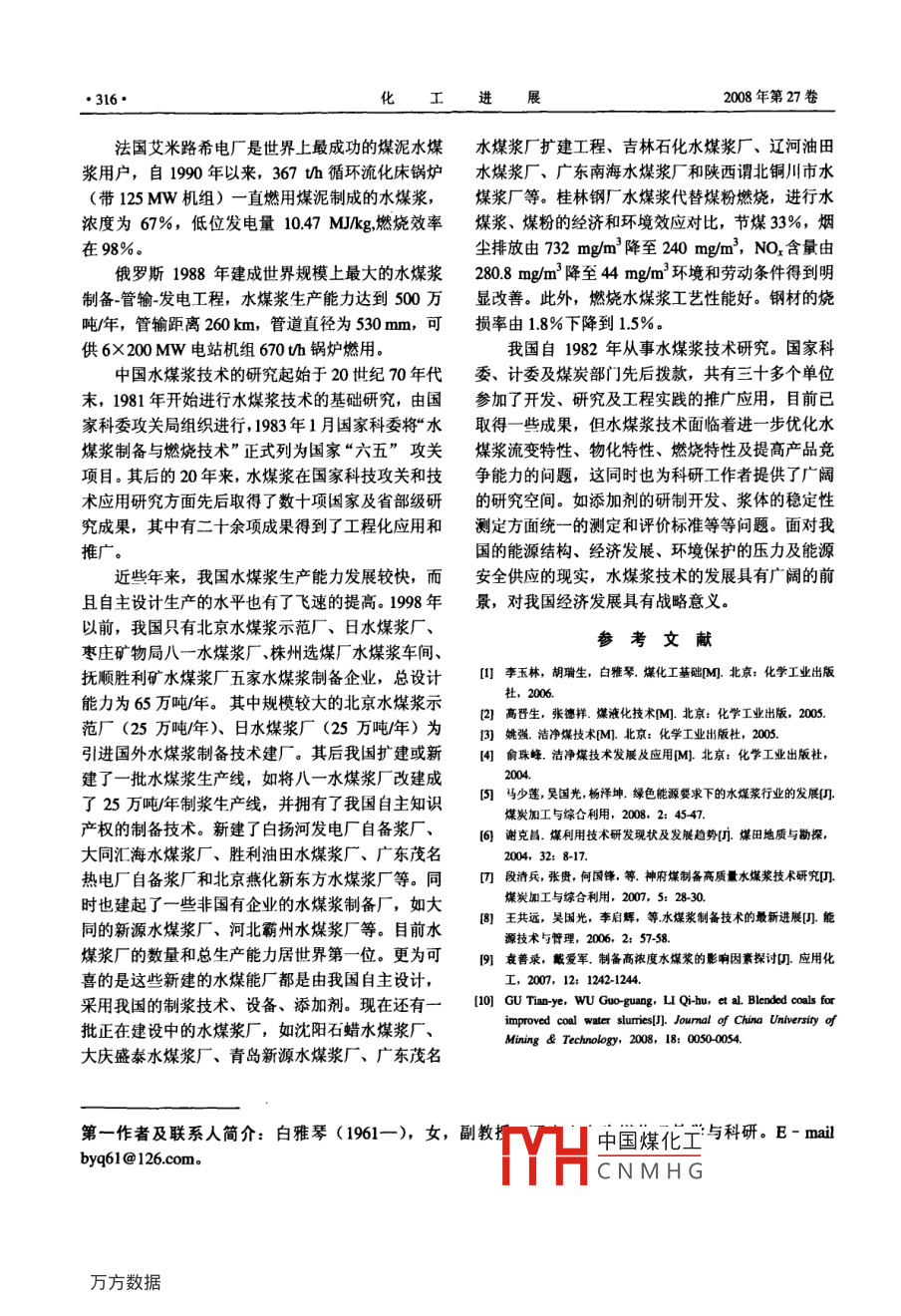 化工進(jìn)展·314·CHEMICAL INDUSTRY AND ENGINEERING PROGRESS2008年第27卷增刊水煤漿制備技術(shù)與燃燒特性白雅琴,徐海平2,李森2,蘇海全(呼和浩特職業(yè)學(xué)院,內(nèi)蒙古呼和浩特0100:2內(nèi)蒙古大學(xué)化學(xué)化工學(xué)院,內(nèi)蒙古呼和浩特010021)摘要:水煤漿是一種應(yīng)用廣泛的煤基液體燃料,用于代替煤炭燃用,具有燃燒效率高、負(fù)荷調(diào)整便利、減少環(huán)境污染、改善勞動(dòng)條件等特點(diǎn)。對(duì)于合理利用能源資源,解決煤炭運(yùn)輸?shù)葐?wèn)題具有重要的意義。介紹了國(guó)內(nèi)、外水煤漿技術(shù)發(fā)展,重點(diǎn)闡逑了水煤漿制備技術(shù)及燃燒特性關(guān)鍵詞:水煤漿;制備技術(shù);燃燒特性;煤炭水煤漿是一種煤基的液體燃料,一般是指由較高的成本。對(duì)于煤的成漿性,其影響因素很多60%~70%不同粒度分布的低硫煤、30%~40%的但一般認(rèn)為:煤階越高,內(nèi)在水分越少,煤種中氧水和少量化學(xué)添加劑制成的混合物,是20世紀(jì)70和碳的比值越小,親水官能團(tuán)越少,孔隙越不發(fā)達(dá),年代世界石油危機(jī)中發(fā)展起來(lái)的石油替代技術(shù)。水可磨指數(shù)越高煤中所含可溶性高價(jià)金屬離子越少,煤漿既保持了煤炭原有的物理化學(xué)性質(zhì),又具有和制漿越容易。石油類(lèi)似的流動(dòng)性和穩(wěn)定性。使煤炭從傳統(tǒng)的固體1.1.2顆粒級(jí)配技術(shù)燃料轉(zhuǎn)化為一種流體燃料。水煤漿中的煤炭不僅有粒度大小的限制,還要水煤漿的應(yīng)用十分廣泛,它可以像油一樣管運(yùn)、求有良好的粒度分布,即希望使不同粒徑的煤粒能儲(chǔ)存、泵送、霧化和穩(wěn)定燃燒,其熱值相當(dāng)于燃料夠相互填充,減少煤粒之間的空隙,達(dá)到較好的堆油的一半,因而可以育接替代燃煤、燃油作為工業(yè)積效果。堆積效果越高,由于空隙少就可以減少水鍋爐或電站鍋爐的直接燃料;水煤漿還是理想的氣的消耗量,容易配制高濃度的水煤漿。在制備過(guò)程化燃料,產(chǎn)生的煤氣可以用于煤化工或聯(lián)合循環(huán)發(fā)中,這項(xiàng)技術(shù)又稱(chēng)為顆粒級(jí)配技術(shù)。電;對(duì)于特制的精細(xì)水煤漿,還可以作為燃?xì)廨啓C(jī)1.13添加劑技術(shù)的燃料使用。對(duì)于合理利用能源資源,解決煤炭運(yùn)通常情況下,要使水煤漿能夠達(dá)到髙濃度高穩(wěn)輸問(wèn)題,降低污染物排放具有十分重要的意義。水定性燃燒以及良好的流變特性,必須添加一些化學(xué)煤漿技術(shù)包括水煤漿制備技術(shù)、燃燒等關(guān)鍵技術(shù)。藥劑。一般可以分為分散劑和穩(wěn)定劑兩類(lèi)。分散劑1水煤漿制備技術(shù)是用來(lái)促進(jìn)煤粒在水中均勻分散的化學(xué)藥劑,通常當(dāng)煤粉與水混合,煤顆粒之間存在著一種很強(qiáng)的引1.1水煤漿制備的關(guān)鍵技術(shù)力,使得煤顆粒成閉、凝結(jié)、黏度增髙,流動(dòng)性變水煤漿制備的關(guān)鍵技術(shù)包括煤炭的選擇及其成差。分散劑是一種表面活性機(jī)劑,可以顯著地降低漿性、顆粒級(jí)配技術(shù)、添加劑技術(shù)、磨礦技術(shù)和質(zhì)溶液的表面張力,提高煤粒表面的潤(rùn)濕性。而水煤量控制與檢測(cè)技術(shù)漿穩(wěn)定劑則是用來(lái)改善水煤漿穩(wěn)定性,以使其在存1.1.1煤炭的選擇及其成漿性?xún)?chǔ)和輸送期間保持特性均勻的狀態(tài)。能起到穩(wěn)定作成漿前必須根據(jù)需要選擇煤種,如其灰分、硫用的穩(wěn)定劑有無(wú)機(jī)鹽、高分子有機(jī)化合物。目前國(guó)分、熱值、揮發(fā)分及灰熔點(diǎn)等,這對(duì)水煤漿能否穩(wěn)內(nèi)外研制及篩選出的水煤漿添加劑主要分為以下幾定燃燒、燃燒效率及污染排放都有很大的影響。如種類(lèi)型:陰離子型的水煤漿分散劑和非離子型的水揮發(fā)分影響到水煤漿在爐膛中能否穩(wěn)定著火燃燒。煤漿分散劑。般用于鍋爐燃燒時(shí)要求制漿用煤的揮發(fā)分大于1.4磨礦技術(shù)25%,用于爐窯燃燒時(shí)要求制漿用煤的揮發(fā)分大于V凵中國(guó)煤化工產(chǎn)品能達(dá)到一定的15%。在煤種選取過(guò)程中,成漿性是用來(lái)表征其制細(xì)CNMHG項(xiàng)技術(shù)。目前通漿難易程度的參數(shù),一般不同煤種的成漿性有著很過(guò)規(guī)俚、躇介對(duì)灬同粒級(jí)煤的破碎作大的差異。有的煤炭在常規(guī)條件下很容易制成高濃用,磨礦過(guò)程中粒度減少過(guò)程的鏈鎖變化規(guī)律,提度的水煤漿,而有的則要求較為復(fù)雜的制漿工藝和出了磨介運(yùn)動(dòng)的散體理論、有用功耗分層計(jì)算法、增刊白雅琴等:水煤漿制備技術(shù)與燃燒特性315·配球理論及磨礦矩陣模型。的火焰溫度下,水煤漿的燃燒速度比煤粉高,其燃1.1.5質(zhì)量控制與檢測(cè)技術(shù)燒效率與煤粉燃燒相當(dāng),對(duì)于大型水煤漿鍋爐可以水煤漿的質(zhì)量指標(biāo)包含濃度、密度、粒度分布、穩(wěn)定達(dá)到99%以上熱值、穩(wěn)定性(黏度)等。這些指標(biāo)影響水煤漿在在影響水煤漿燃燒過(guò)程的各個(gè)因素中,影響最使用、存儲(chǔ)和運(yùn)輸過(guò)程中的特性,在路線(xiàn)檢測(cè)這些大也是與普通煤粉爐所不同的是其霧化特性和特殊指標(biāo)(或部分)是水煤漿制備的關(guān)鍵技術(shù)之一的配風(fēng