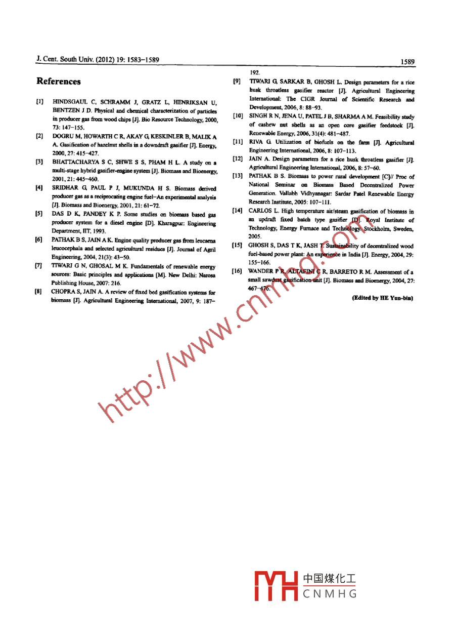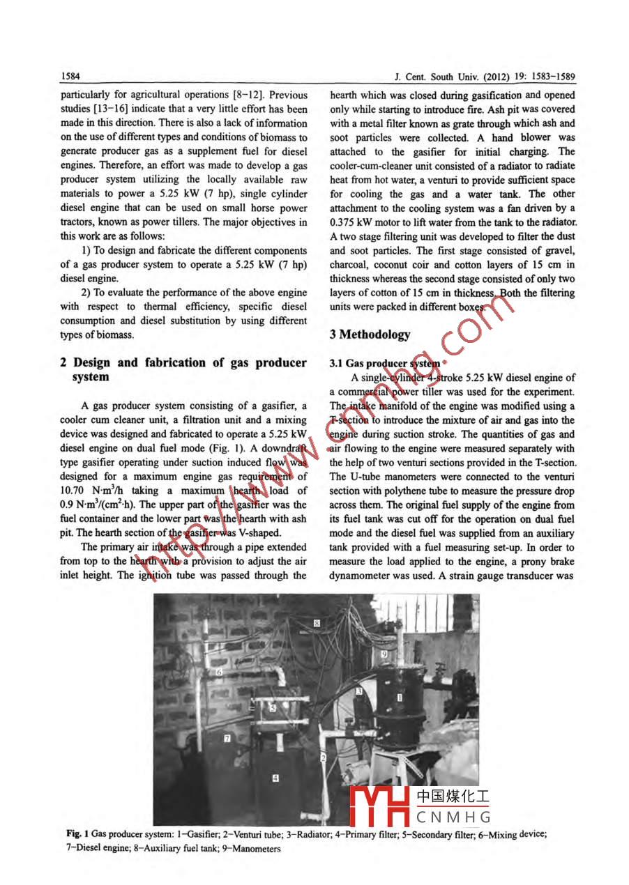 J Cent. South Univ(2012)19: 1583-1589DoI:10.1007/s1177-012-118052 sprPerformance evaluation of a diesel engine by using producer gas from someunder-utilized biomass on dual-fuel mode of diesel cum producer gasD K DasS P Dash.M K. Ghosal'1. Department of Farm Machinery and Power, College of Agricultural Engineering and Technology,Orissa University of Agriculture and Technology, Bhubnaneswar-751003, Orissa, India2. Department of Water Resources, Orissa Lift imigation Corporation, Government of Orissa, IndiaC Central South University Press and Springer-Verlag Berlin Heidelberg 2012Abstract: Producer gas through gasification of biomass can be used as an altemate fuel in rural areas due to high potential ofbiomass resources in India. Experiments were conducted to study the performance of a diesel engine(four stroke, single cylinder,5. 25 kW)with respect to its thermal efficiency, spccific fuel consumption and diesel substitution by use of diesel alone and producergas-cum-diesel( dual fuel mode). Three types of biomass, i.e. wood chips, Pigeon pea stalks and con cobs were used for generationof producer gas. a producer gas system consisting of a downdraft gasifier, a cooling cum cleaning unit, a filtering unit and a gas airmixing device was designed, fabricated and used to power a 5.25 kw diesel engine on dual fuel mode. Performance of the enginewas reported by keeping biomass moisture contents as 8%, 12%, 16%, and 21%, engine speed as 1 600 r/min and with varableengine loads. The average value of thermal efficiency on dual fuel mode was found slightly lower than that of diesel mode. Thespecific diesel consumption was found to be 60%64%less in dual fuel mode than that in diesel mode for the same amount of energyoutput. The average diesel substitution of 74% was observed with wood chips followed by com cobs (78%)and pigeon pea stalks82%) Based on the performance studied, the producer gas may be used as a substitute or as supplementary fuel for dieselnservation, particularly for stationary engines in agricultural operations in the farm.Key words: biomass gasification; producer gas; downdraft gasifier; diesel enginestock is thermally decomposed and the end products are1 Introductionprincipally in gaseous form, with the main combustiblecomponents being carbon monoxide and hydrogen. TheThe escalating oil prices and scarcity of fuel oils main advantages of gases as a fuel over liquid or solidcoupled with exploding population have resulted in fuels are that 1)gases burn with higher efficiency thanus energy crisis. There is thus a pressing needthe solid or liquid fuels; 2)they have a higher rate of heatdevelop technology for utilizing the renewable energy release: 3)the rate of energy output is easily controlledsources that can make significant contribution to the and adjustable; 4) gaseous fuels with good energyeconomy and the well being of the rural people.utilization can be used for power sources. a good qualityOf all the altemative sources of energy for rural producer gas has an energy content of aboutproducer gas from biomass appears to have the 5 200 kJ/(N-m). a gas producer requires 2.5-3 kg oft potential. As an agricultural country, India has wood to generate about the same energy as I L of dieselupply of biomass resources. It is estimated that [7Jabout 40%-60% of agricultural residues are either lost orDiesel engines are widely used in Indianput to inefficient use. This calls for better utilization of agricultural farms for a variety of stationary and mobilethese resources by thermo-chemically converting into operations. The usual approach of producer gasproducer gas in the current context of limitedness of utilization in diesel engines consists of operating existingpetroleum based fuels for use in intemal combustion compression ignition engines on producer gas cum dieselengines. Producer gas is generated from solid dual-fuel mode. The thermal efficiency of gasifiers imcarbonaceous fuels such as wood, charcoal, coal, which producer gas is produced has been found to beagricultural and forest residues and also animal wastes 70%-80% and that of the gasifier-engine system to be[1-6中國煤化工 ute and serious inirreversible thermo-chemical process by which feedH-un motor vehicleCNMHGReceived date: 2011-07-26; Accepted date: 2011-l1-14Corresponding author: M. K Ghosal; Associate Professor, PhD; Tel: +91-9556271208; B-mail: mkghosall@rediffmail com584J. Cent. South Univ.(2012)19: 1583-1589particularly for agricultural operations [8-12]. Previous hearth which was closed during gasification and openedstudies[13-16] indicate that a very little effort has been only while starting to introduce fire. Ash pit was coveredmade in this direction. There is also a lack of information with a metal filter known as grate through which ash andon the use of different types and conditions of biomass to soot particles were collected. A hand blower wasgenerate producer gas as a supplement fuel for diesel attached to the gasifier for initial charging. Theengines. Therefore, an effort was made to develop a gas cooler-cum-cleaner unit consisted of a radiator to radiateproducer system utilizing the locally available raw heat from hot water, a venturi to provide sufficient spacematerials to power a 5.25 kw(7 hp), single cylinder for cooling the gas and a water tank. The otherdiesel engine that can be used on small horse power attachment to the cooling system was a fan driven by atractors, known as power tillers. The major objectives in 0.375 kW motor to lift water from the tank to the radiatorthis work are as follows:a two stage filtering unit was developed to filter the dust1)To design and fabricate the different components and soot particles. The first stage consisted of gravel,of a gas producer system to operate a 5. 25 kW(7 hp) charcoal, coconut coir and cotton layers of 15 cm indiesel engine.thickness whereas the second stage consisted of only two2)To evaluate the performance of the above engine layers of cotton of 