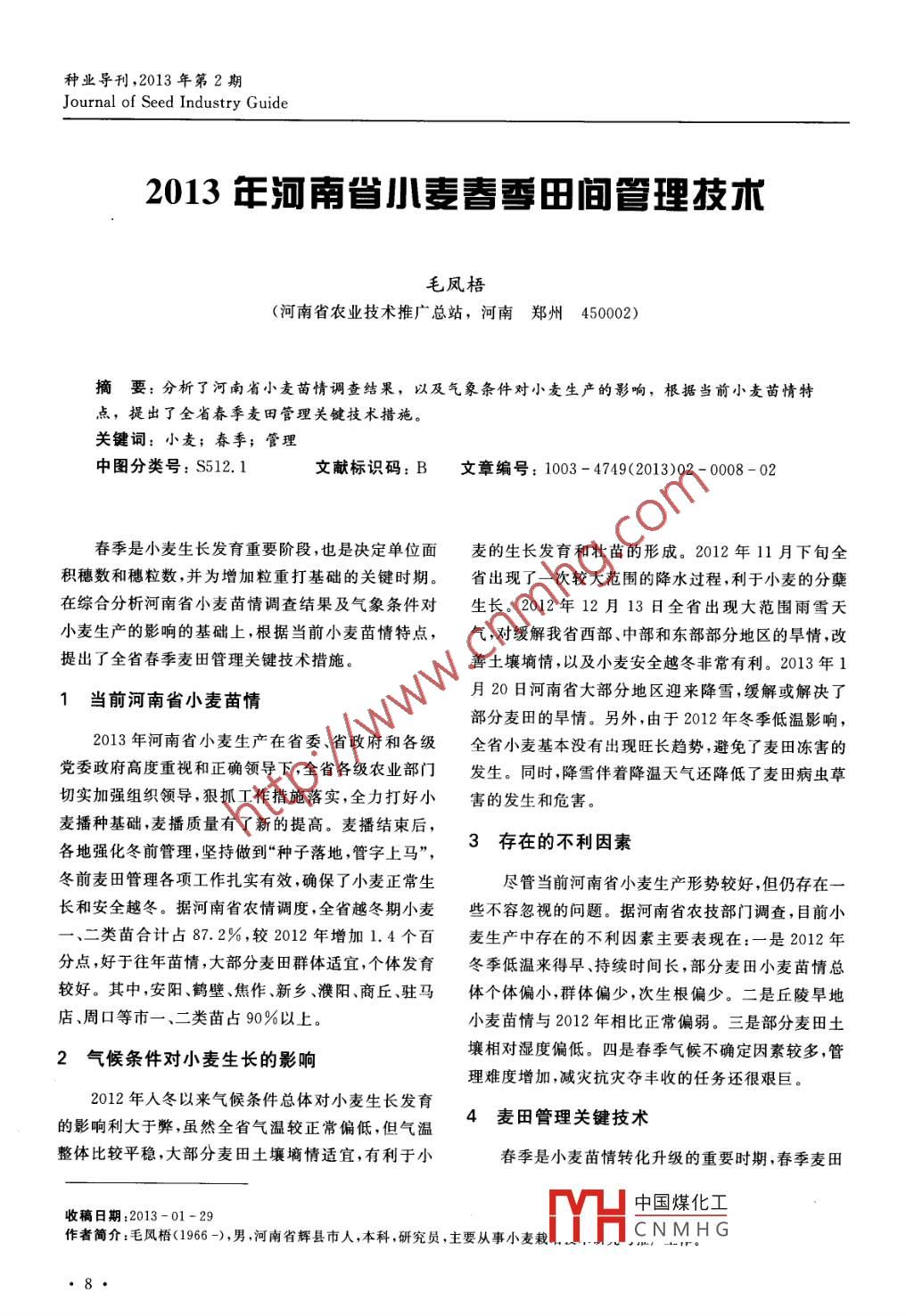 種業(yè)導(dǎo)刊,2013年第2期Journal of Seed Industry Guide2013年河南省小麥春季田間管理技術(shù).毛鳳梧(河南省農(nóng)業(yè)技術(shù)推廣總站,河南鄭州450002)商要:分析了河南省小麥苗情調(diào)查結(jié)果,以及氣象條件對小麥生產(chǎn)的影響,根據(jù)當(dāng)前小麥苗情特.點(diǎn),提出了全省春季麥田管理關(guān)鍵技術(shù)措施。關(guān)鍵詞:小麥;春季;管理中圖分類號: S512. 1文獻(xiàn)標(biāo)識碼: B文章編號: 1003 - 4749(2013)02 - 0008 - 02春季是小麥生長發(fā)育重要階段,也是決定單位面麥的生長發(fā)育和壯苗的形成。2012 年11月下旬全積穗數(shù)和穗粒數(shù),并為增加粒重打基礎(chǔ)的關(guān)鍵時(shí)期。省出現(xiàn)了一次較大范圍的降水過程,利于小麥的分蘗在綜合分析河南省小麥苗情調(diào)查結(jié)果及氣象條件對生長。2012年12月13日全省出現(xiàn)大范圍雨雪天.小麥生產(chǎn)的影響的基礎(chǔ)上,根據(jù)當(dāng)前小麥苗情特點(diǎn),氣,對緩解我省西部、中部和東部部分地區(qū)的旱情,改提出了全省春季麥田管理關(guān)鍵技術(shù)措施。善土壤墑情,以及小麥安全越冬非常有利。2013 年1月20日河南省大部分地區(qū)迎來降雪,緩解或解決了1當(dāng) 前河南省小麥苗情部分麥田的旱情。另外,由于2012年冬季低溫影響,2013年河南省小麥生產(chǎn)在省委、省政府和各級全省小麥基本沒有出現(xiàn)旺長趨勢,避免了麥田凍害的黨委政府高度重視和正確領(lǐng)導(dǎo)下,全省各級農(nóng)業(yè)部門發(fā)生。同時(shí),降雪伴著降溫天氣還降低了麥田病蟲草切實(shí)加強(qiáng)組織領(lǐng)導(dǎo),狠抓工作措施落實(shí),全力打好小害的發(fā)生和危害。麥播種基礎(chǔ),麥播質(zhì)量有了新的提高。麥播結(jié)束后,3存在的不利因素各地強(qiáng)化冬前管理,堅(jiān)持做到“種子落地,管字上馬”,冬前麥田管理各項(xiàng)工作扎實(shí)有效,確保了小麥正常生盡管當(dāng)前河南省小麥生產(chǎn)形勢較好,但仍存在-長和安全越冬。據(jù)河南省農(nóng)情調(diào)度,全省越冬期小麥些不容忽視的問題。據(jù)河南省農(nóng)技部門調(diào)查,目前小一、二類苗合計(jì)占87.2%,較2012年增加1.4個百麥生產(chǎn)中存在的不利因素主要表現(xiàn)在:一是2012年分點(diǎn),好于往年苗情,大部分麥田群體適宜,個體發(fā)育冬季低溫來得早、持續(xù)時(shí)間長,部分麥田小麥苗情總.較好。其中,安陽、鶴壁、焦作、新鄉(xiāng)、濮陽、商丘駐馬體個體偏小,群體偏少,次生根偏少。二是丘陵旱地店、周口等市一、二類苗占90%以上。小麥苗情與2012年相比正常偏弱。三是部分麥田土壤相對濕度偏低。四是春季氣候不確定因素較多,管2氣候條件對小麥生長的影響理難度增加,減災(zāi)抗災(zāi)奪豐收的任務(wù)還很艱巨。2012年人冬以來氣候條件總體對小麥生長發(fā)育的影響利大于弊,雖然全省氣溫較正常偏低,但氣溫4麥田管理關(guān)鍵技術(shù)整體比較平穩(wěn),大部分麥田土壤墑情適宜,有利于小.春季是小麥苗情轉(zhuǎn)化升級的重要時(shí)期,春季麥田中國煤化工收稿日期:2013-01 - 29作者簡介:毛鳳梧(1966 -),男,河南省輝縣市人,本科,研究員,主要從事小麥栽.DHCNMHG毛鳳梧2013 年河南省小麥春季田間管理技術(shù).管理要在前期管理的基礎(chǔ)上,根據(jù)小麥生育特點(diǎn)和長發(fā)現(xiàn)一點(diǎn),控制--片”的防治經(jīng)驗(yàn),重點(diǎn)抓好沙河以南相,協(xié)調(diào)群體與個體、營養(yǎng)器官與生殖器官的生長發(fā)條銹病常發(fā)區(qū),及時(shí)消滅發(fā)病中心,嚴(yán)防擴(kuò)散蔓延;對育,科學(xué)運(yùn)籌肥水,提高分蘗成穗率,達(dá)到穗足、穗大,小麥吸漿蟲要嚴(yán)把蛹期和成蟲期兩個關(guān)鍵環(huán)節(jié)進(jìn)行并為后期增加粒重奠定基礎(chǔ)。根據(jù)當(dāng)前河南省小麥防治。對小麥赤霉病,要根據(jù)病菌發(fā)育進(jìn)度和小麥抽苗情,2013年全省春季麥田管理重點(diǎn)抓好以下關(guān)鍵穗揚(yáng)花期天氣情況,及時(shí)預(yù)警并組織大面積噴藥預(yù)技術(shù)措施;防。4月下旬至5月中旬是開展小麥“一噴三防”工作的最佳時(shí)機(jī),要切實(shí)做好以重大病蟲防治為主的小.4.1 及早中耕,促苗生長開春以后,全省各類麥田要普遍進(jìn)行淺中耕,以麥“一噴三防”(防病蟲、防千熱風(fēng)、防早衰)工作,最大達(dá)到增溫保墑、破除板結(jié)、消滅雜草、促苗早發(fā)快長的限度臧少病蟲危害損失。目的,特別是春灌后的麥田和丘陵旱地麥田更應(yīng)及時(shí)4.4及時(shí)開 展化學(xué)除草進(jìn)行中耕劃鋤。開春后隨著氣溫回升,麥田雜草開始生長,要及時(shí)做好化學(xué)除草,選用對路除草劑,正確掌握噴施方4.2因地制宜 ,分類管理對受旱麥田要抓住春季氣溫回升的有利時(shí)機(jī),及法,嚴(yán)防藥害發(fā)生,消除麥田雜草危害,努力提高防治時(shí)澆水,促苗生長。對三類苗麥田和個體偏小、群體效果。偏少的二類苗麥田,要及早進(jìn)行肥水管理,鞏固冬前4.5提前做 好防凍預(yù)案,預(yù)防“倒春寒”和晚霜凍害分蘗,爭取春季分蘗多成穗,增加每667m2成穗數(shù),河南省春季氣溫多變,各地要積極做好預(yù)防“倒結(jié)合澆返青水每667m2追施尿素15kg 左右。對播春寒”和晚霜凍害的預(yù)案。小麥拔節(jié)后抗寒