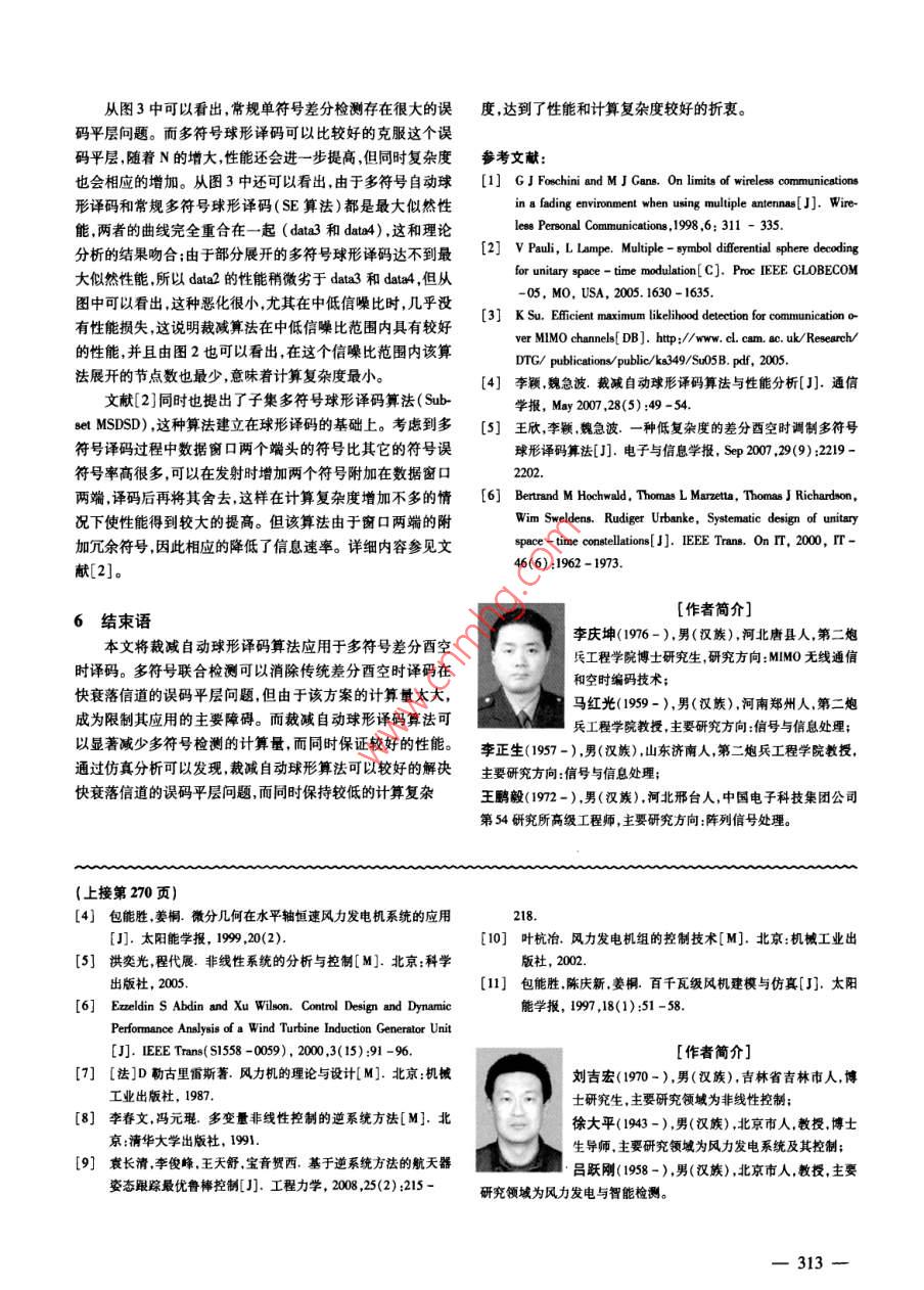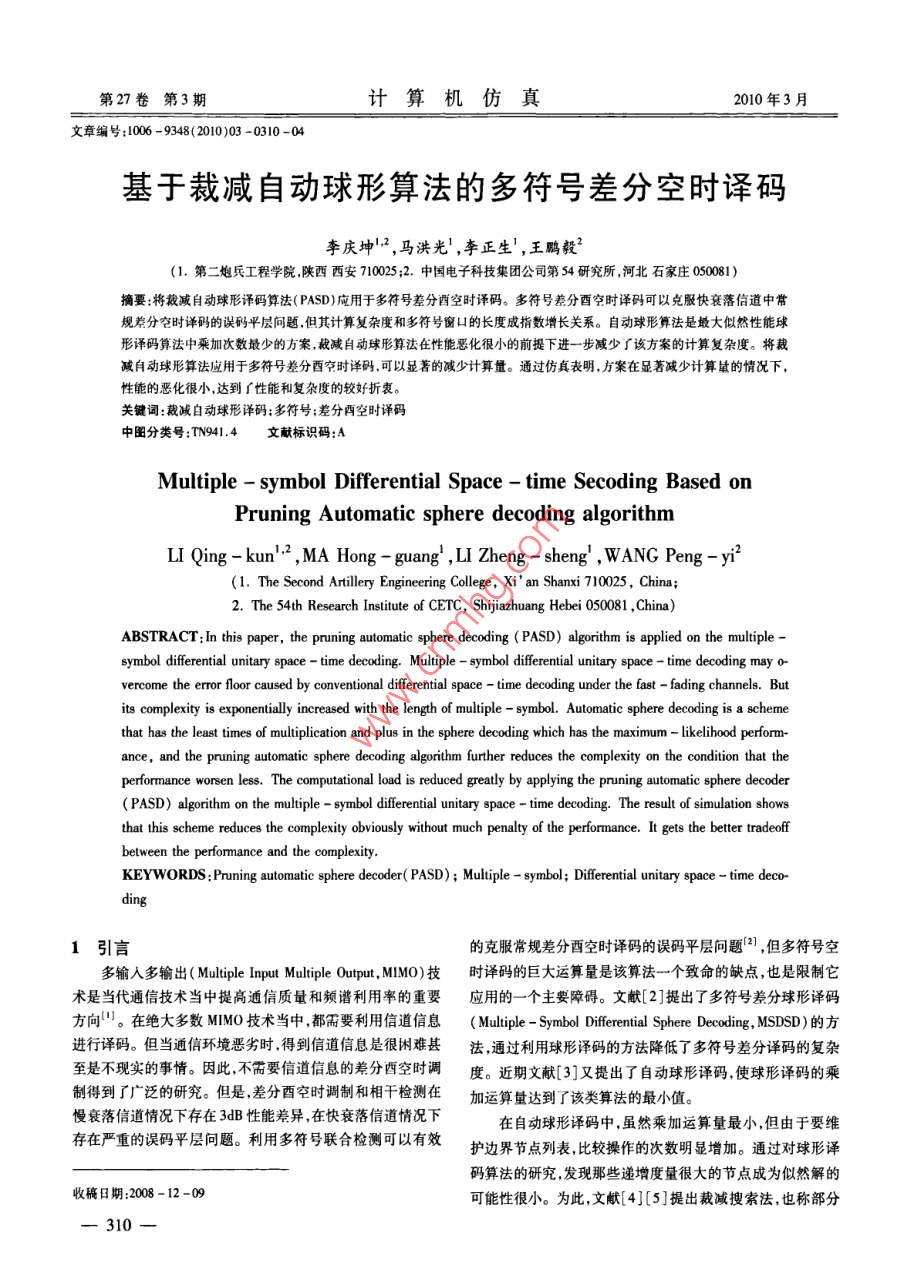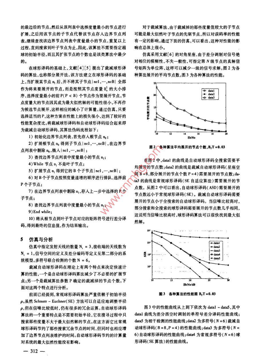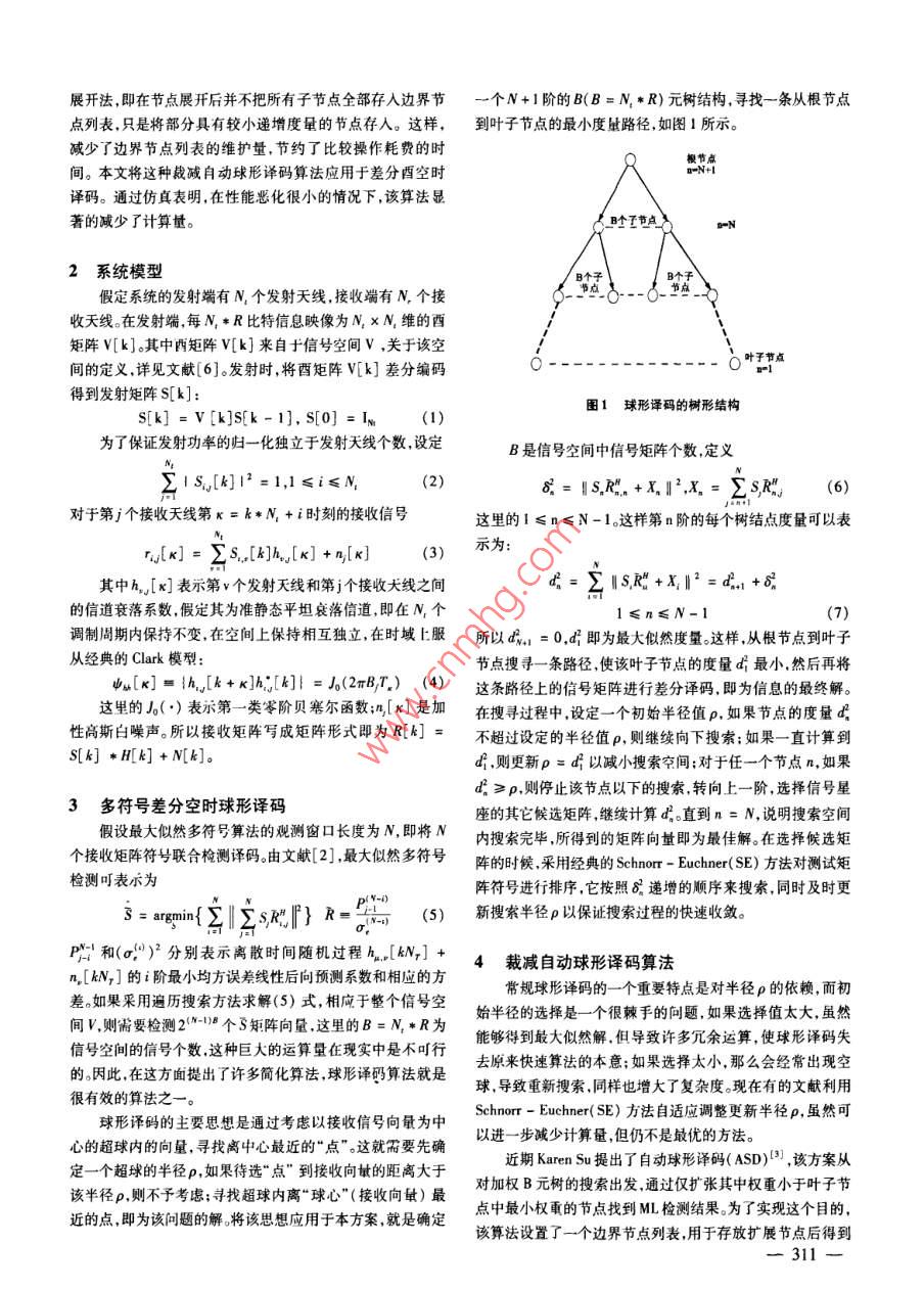 第27卷第3期計算機(jī)仿真2010年3月文章編號:1006-9348(2010)03-0310-04基于裁減自動球形算法的多符號差分空時譯碼李慶坤2,馬洪光,李正生,王鵬毅(1.第二炮兵工程學(xué)院陜西西安710025;2.中國電子科技集團(tuán)公司第54研究所,河北石家莊050081)摘要:將裁減自動球形譯碼算法(PASD)應(yīng)用于多符號差分酉空時譯碼。多符號差分酉空時譯碼可以克服快衰落信道中常規(guī)差分空時譯碼的誤碼平層問題但其計算復(fù)雜度和多符號窗口的長度成指數(shù)增長關(guān)系。自動球形算法是最大似然性能球形譯碼算法中乘加次數(shù)最少的方案裁減自動球形算法在性能惡化很小的前提下進(jìn)一步減少了該方案的計算復(fù)雜度。將裁減自動球形算法應(yīng)用于多符號差分酉空時譯碼,可以顯著的減少計算量。通過仿真表明,方案在顯著減少計算量的情況下性能的惡化很小,達(dá)到了性能和復(fù)雜度的較好折衷關(guān)鍵詞:裁減自動球形譯碼;多符號;差分酉空時譯碼中圖分類號:TN941.4文獻(xiàn)標(biāo)識碼:AMultiple symbol Differential Space-time Secoding Based onPruning Automatic sphere decoding algorithmLI Qing-kun., MA Hong-guang, LI Zheng-sheng, WANG Peng-yi(1. The Second Artillery Engineering College, Xi'an Shanxi 7100252. The 54th Research Institute of CETC, Shijiazhuang Hebei 050081, CABSTRACT: In this paper, the pruning automatic sphere decoding( PASD)algorithm is applied on the multiplesymbol differential unitary space-time decoding. Multiple-symbol differential unitary space-time decoding may o-vercome the error floor caused by conventional differential space-time decoding under the fast-fading channels. Butits complexity is exponentially increased with the length of multiple-symbol. Automatic sphere decoding is a schemethat has the least times of multiplication and plus in the sphere decoding which has the maximum-likelihood performance,and the pruning automatic sphere decoding algorithm furher reduces the complexity on the condition that theperformance worsen less. The computational load is reduced greatly by applying the pruning automatic sphere decoderPASD)algorithm on the multiple-symbol differential unitary space-time decoding. The result of simulation showsthat this scheme reduces the complexity obviously without much penalty of the performance. It gets thebetween the performance and the complexity.KEYWORDS Pruning automatic sphere decoder( PASD): Multiple-symbol; Differential unitary space-time deco-1引言的克服常規(guī)差分西空時譯碼的誤碼平層問題2,但多符號空多輸入多輸出( Multiple Input Multiple Output,MMO)技時譯碼的巨大運(yùn)算量是該算法一個致命的缺點(diǎn),也是限制它術(shù)是當(dāng)代通信技術(shù)當(dāng)中提高通信質(zhì)量和頻譜利用率的重要應(yīng)用的一個主要障礙。文獻(xiàn)[2]提出了多符號差分球形譯碼方向。在絕大多數(shù)MMO技術(shù)當(dāng)中都需要利用信道信息( Multiple- Symbol Differential Sphere Decoding, MSDSD)的方進(jìn)行譯碼。但當(dāng)通信環(huán)境惡劣時得到信道信息是很困難甚法通過利用球形譯碼的方法降低了多符號差分譯碼的復(fù)雜至是不現(xiàn)實(shí)的事情。因此,不需要信道信息的差分酉空時調(diào)度。近期文獻(xiàn)[3]又提出了自動球形譯碼,使球形譯碼的乘制得到了廣泛的研究。但是,差分酉空時調(diào)制和相干檢測在加運(yùn)算量達(dá)到了該類算法的最小值。慢衰落信道情況下存在3dB性能差異,在快衰落信道情況下在自動球形譯碼中,雖然乘加運(yùn)算量最小,但由于要維存在嚴(yán)重的誤碼平層問題。利用多符號聯(lián)合檢測可以有效護(hù)邊界節(jié)點(diǎn)列表,比較操作的次數(shù)明顯增加。通過對球形譯碼算法的研究,發(fā)現(xiàn)那些遞增度量很大的節(jié)點(diǎn)成為似然解的收稿日期:2008-12-09可能性很小。為此,文獻(xiàn)[4][5]提出裁減搜索法,也稱部分310展開法即在節(jié)點(diǎn)展開后并不把所有子節(jié)點(diǎn)全部存入邊界節(jié)一個N+1階的B(B=N*R)元樹結(jié)構(gòu),尋找一條從根節(jié)點(diǎn)點(diǎn)列表,只是將部分具有較小遞增度量的節(jié)點(diǎn)存人。這樣,到葉子節(jié)點(diǎn)的最小度量路徑,如圖1所示。減少了邊界節(jié)點(diǎn)列表的維護(hù)量,節(jié)約了比較操作耗費(fèi)的時根節(jié)點(diǎn)間。本文將這種裁減自動球形譯碼算法應(yīng)用于差分酉空時譯碼。通過仿真表明,在性能惡化很小的情況下,該算法顯著的減少了計算量。B個子節(jié)點(diǎn)2系統(tǒng)模型B個子假定系統(tǒng)的發(fā)射端有N個發(fā)射天線,接收端有N個接收天線。在發(fā)射端每N*R比特信息映像為NxN維的酉矩陣V[k]。其中酉矩陣Vk]來自于信號空間Ⅴ,關(guān)于該空葉子節(jié)點(diǎn)間的定義,詳見文獻(xiàn)6]。發(fā)射時,將酉矩陣Ⅴk]差分編碼得到發(fā)射矩陣S[k]:圖1球形譯碼的樹形結(jié)構(gòu)S[k]=V[k]S[k-1],S[0]=I(1)為了保證發(fā)射功率的歸一化獨(dú)立于發(fā)射天線個數(shù),設(shè)定B是信號空間中信號矩陣個數(shù)定義∑|Sk]12=1,1≤i≤N8=S.R",+X目2,X=∑SR(6)對于第j個接收天線第κ=k*N+i時刻的接收信號這里的1≤n≤N-10這樣第n階的每個樹結(jié)點(diǎn)度量可以表r【Kx]=∑S,[k]h,【k]+n[k示為其中b[x]表示第v個發(fā)射天線和第j個接收天線之間式=SE+x1=式n+8的信道衰落系數(shù)假定其為準(zhǔn)靜態(tài)平坦衰落信道,即在N個1≤n≤N調(diào)制周期內(nèi)保持不變在空間上保持相互獨(dú)立在時域