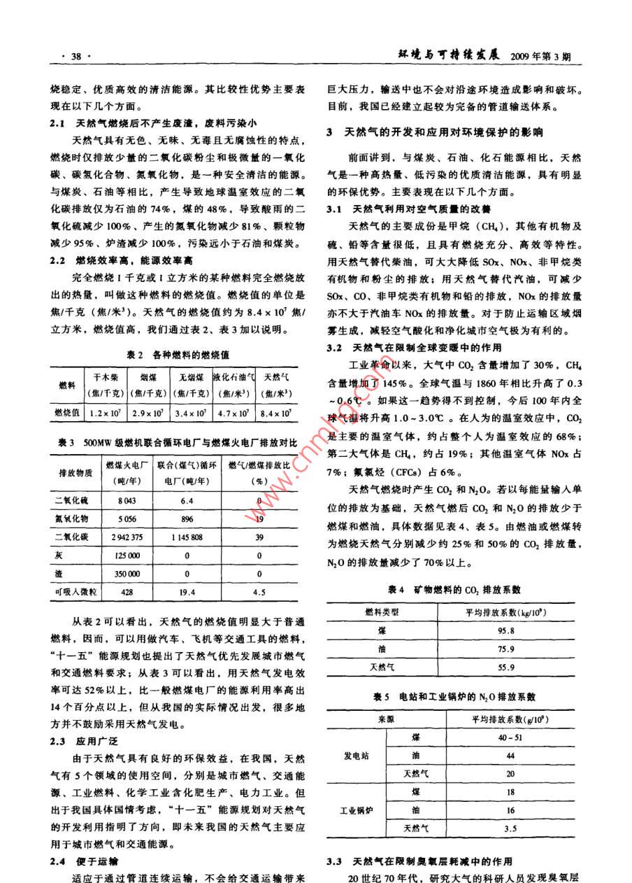 粼境與丁持續(xù)發(fā)展2009年第3期ENVIRONMENT AND SUSTAINABLE DEVELOPMENTNo.3,2009天然氣的開(kāi)發(fā)與應(yīng)用對(duì)環(huán)境的影響高寞劉強(qiáng)(中國(guó)石油西南油氣田分公司,四川成都,610215)【摘要】本文簡(jiǎn)要介紹了我國(guó)當(dāng)前天然氣的賁源開(kāi)發(fā)及利用狀況,重點(diǎn)分析了天然氣的優(yōu)點(diǎn)以及其開(kāi)發(fā)與應(yīng)用對(duì)環(huán)境保護(hù)的影響,認(rèn)為,加快開(kāi)發(fā)利用天然氣,提高天然氣在能源消費(fèi)中的比重,優(yōu)化合理能源鮚構(gòu),保護(hù)環(huán)境是堅(jiān)持可持續(xù)發(fā)展的重要舉措?!娟P(guān)鍵詞】天然氣;賚源;應(yīng)用;環(huán)保中圖分類(lèi)號(hào):X2文獻(xiàn)標(biāo)識(shí)碼;A文章編號(hào):1673-288X(200)03-007-03中國(guó)是世界上惟一的一個(gè)能源結(jié)構(gòu)以煤為主的大20世紀(jì)80年代以前,我國(guó)主要以發(fā)展人工煤氣為國(guó),國(guó)民經(jīng)濟(jì)各部門(mén)除交通運(yùn)輸之外,幾乎均以煤為主。約自20世紀(jì)90年代末期,天然氣的開(kāi)采和消費(fèi)有主要燃料。這種以煤炭為主的能源消費(fèi)結(jié)構(gòu)帶來(lái)了嚴(yán)了較快發(fā)展。“十五”期間,天然氣的產(chǎn)量與消費(fèi)量及重的環(huán)境和社會(huì)問(wèn)題,經(jīng)濟(jì)社會(huì)可持續(xù)發(fā)展受到嚴(yán)峻其在一次能源生產(chǎn)的總量中比例不斷提高?!笆晃濉碧魬?zhàn)。與煤炭和石油相比,天然氣是一種高熱量、低期間,天然氣的產(chǎn)量與消費(fèi)量更是不斷增加,2010年,污染的優(yōu)質(zhì)清潔能源,且儲(chǔ)量豐富,因此,將是我國(guó)次能源生產(chǎn)目標(biāo)為24.46億噸標(biāo)準(zhǔn)煤,年均增長(zhǎng)未來(lái)能源發(fā)展戰(zhàn)略的最佳選擇。3.5%,其中天然氣每年以19.9%的增長(zhǎng)速度增長(zhǎng);1我國(guó)天然氣的勘探、開(kāi)采和利用情況2010年,一次能源消耗總量為27.34億噸標(biāo)準(zhǔn)煤,年均增長(zhǎng)4%,天然氣每年以24.8%的速度增長(zhǎng)。具體可見(jiàn)近年來(lái),天然氣資源得到了有效利用,我國(guó)的能表1。源結(jié)構(gòu)得到有效改善,逐步由依賴(lài)煤的單一型結(jié)構(gòu)形豪1“十一五”時(shí)期能源發(fā)展主要指標(biāo)成了以煤為主,多能互補(bǔ)的能源生產(chǎn)體系。“十一五”年均1.1天然氣的勘探和開(kāi)采量不斷增加指標(biāo)2005年200年增長(zhǎng)(%)我國(guó)天然氣資源豐富,集中分布在中部、西部和海域。經(jīng)過(guò)多年的地質(zhì)勘探,塔里木、柴達(dá)木、陜甘一次能源生產(chǎn)總量(億噸標(biāo)準(zhǔn)煤)20.5924463寧和川渝盆地已嵋起四座國(guó)家級(jí)大氣田。近些年來(lái),其中:原煤(億噸)2.612-37我國(guó)在海上開(kāi)采天然氣取得了很大的進(jìn)展,在東海和石油(億噸)1.812.76南海先后建立了天然氣開(kāi)采海洋平臺(tái)。據(jù)新近完成的天然氣(億立方米)19.9全國(guó)油氣資源評(píng)價(jià)結(jié)果,我國(guó)天然氣地質(zhì)資源總量達(dá)水電及可再生能源(億噸標(biāo)準(zhǔn)煤)1.41%6約高達(dá)43-187×1012m3,而目前的探明儲(chǔ)量?jī)H為估計(jì)次能源消費(fèi)總量(億噸標(biāo)準(zhǔn)煤)2.427,344.0地質(zhì)資源總量的10%。其中:原煤(億噸)12天然氣輸運(yùn)利用網(wǎng)絡(luò)已初具規(guī)模石油(億噸)3255611.5近年來(lái),我國(guó)的天然氣勘探在塔里木、鄂爾多斯天然氣(億立方米)47914924.8和四川盆地以及東海、南海等海域取得重大突破,天水電及可再生能源(億噸標(biāo)準(zhǔn)煤141969然氣輸送管道陜京線、西氣東輸、陜京二線和忠武線等陸續(xù)投入使用,天然氣可源源不斷輸送到華北、華中和華東經(jīng)濟(jì)發(fā)達(dá)地區(qū)。在廣東,為接受進(jìn)口液化天2天然氣能源的比較性?xún)?yōu)勢(shì)然氣(LNG)而建設(shè)的接受站和主干網(wǎng)已基本竣工,福與煤炭和石油等化石原料相比,天然氣具有明顯建、上海和浙江也在積極籌劃進(jìn)口LNG。大規(guī)模使用的優(yōu)勢(shì)。天然氣是埋藏在地下的古生物經(jīng)過(guò)億萬(wàn)年的天然氣的條件已經(jīng)成熟高溫和高壓作用而形成的可燃?xì)怏w。天然氣的主要成13我國(guó)天然氣的產(chǎn)量和利用率快速提高分是甲烷(85%-95%),是一種無(wú)色無(wú)毒、熱值高、燃·38環(huán)境與可持緱發(fā)展2009第3期燒穩(wěn)定、優(yōu)質(zhì)高效的清潔能源。其比較性?xún)?yōu)勢(shì)主要表巨大壓力,輸送中也不會(huì)對(duì)沿途環(huán)境造成影響和破壞。現(xiàn)在以下幾個(gè)方面。目前,我國(guó)已經(jīng)建立起較為完備的管道輸送體系2.1天然氣燃燒后不產(chǎn)生廢渣,廢料污染小3天然氣的開(kāi)發(fā)和應(yīng)用對(duì)環(huán)境保護(hù)的影響天然氣具有無(wú)色、無(wú)味、無(wú)毒且無(wú)腐蝕性的特點(diǎn)燃燒時(shí)僅排放少量的二氧化碳粉塵和極微量的一氧化前面講到,與煤炭、石油、化石能源相比,天然碳、碳?xì)浠衔?、氮氧化?是一種安全清潔的能源。氣是一種高熱量、低污染的優(yōu)質(zhì)清潔能源,具有明顯與煤炭、石油等相比,產(chǎn)生導(dǎo)致地球溫室效應(yīng)的二氧的環(huán)保優(yōu)勢(shì)。主要表現(xiàn)在以下幾個(gè)方面?;寂欧艃H為石油的74%,媒的48%,導(dǎo)致酸雨的二3,1天然氣利用對(duì)空氣質(zhì)量的改善