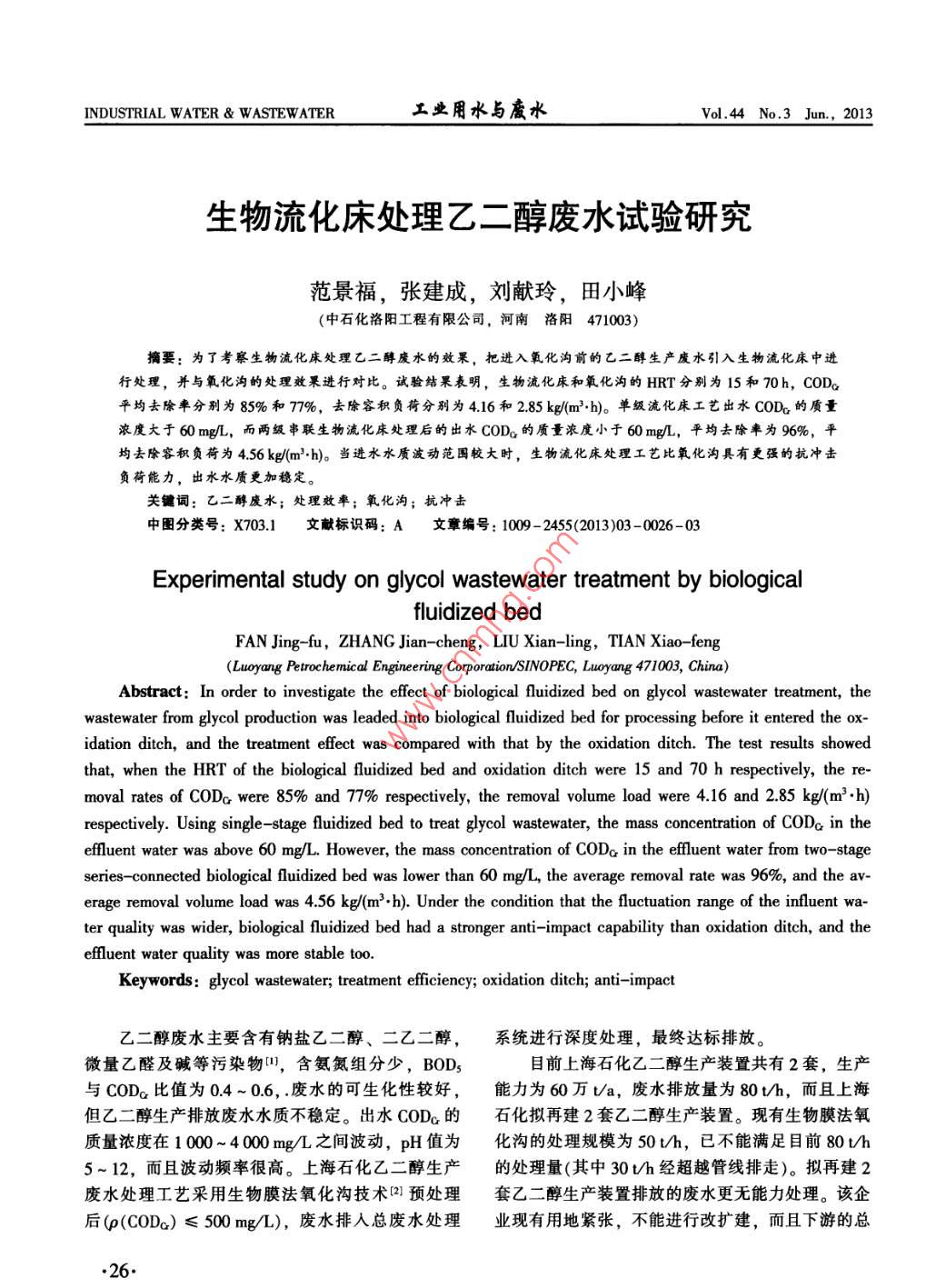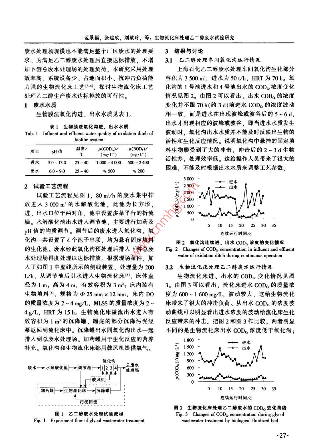 生物流化床處理乙二醇廢水試驗研究