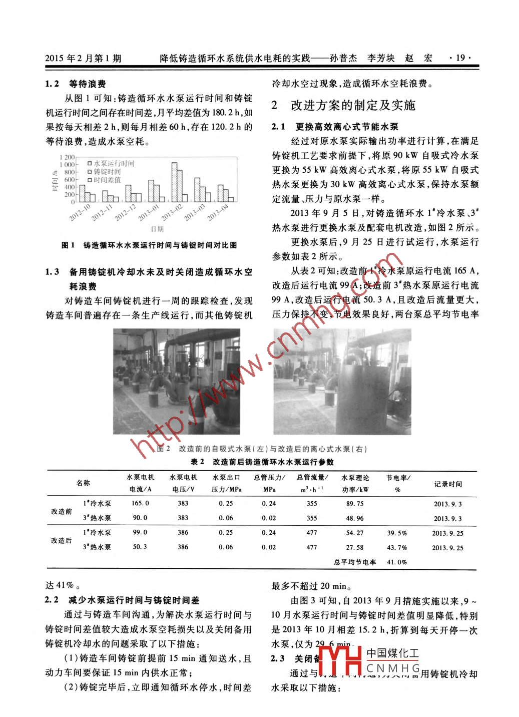 有色冶金節(jié)能口工藝節(jié)能降低鑄造循環(huán)水系統(tǒng)供水電耗的實(shí)踐孫普杰李芳?jí)K趙宏(山西華圣鋁業(yè)有限公司,山西永濟(jì)044500)[摘要]介紹了鑄造循環(huán)水噸鋁供水電耗存在的問題,通過采取-系列措施如關(guān)閉鑄錠機(jī)冷卻水減少水泵運(yùn)行時(shí)間與鑄錠時(shí)間差更換高效離心式節(jié)能水泵等,將鑄造循環(huán)水噸鋁供水電耗由20 kW .h/1~Al降至10 kW .h/-A]以下,取得了良好的經(jīng)濟(jì)效益。.[關(guān)鍵詞]循環(huán)水; 供水電耗;節(jié)能降耗[中圖分類號(hào)] TF821[文獻(xiàn)標(biāo)志碼] B[文章編號(hào)] 1008 - 5122(2015)01 -0018 -03Practices on Reducing Power Consumption of Water Supplyin Casting Recycle Water SystemSUN Pu_-jie, LI Fang-kuai , ZHAO HongAbstract: This paper introduces the problems existed in power consumption of water supply per ton alu-minum in casting recycle water system. Through adopting a series of measures such as closing cooling wa-ter of standby ingot casting machine , reducing the time difference between water pumps running and cast-ing, and replacing more efcient centrifugal energy- saving pump, the power consumption water supplyper ton aluminum is reduced from 20 kW.h/t-Al to lower 10 kW.h/t-Al, and good economic benefits wasachieved.Key words: recycle water; power consumption of water supply; energy-saving and cost-reducing某公司電解廠動(dòng)力車間的鑄造循環(huán)水系統(tǒng)負(fù)責(zé)成本,增加抵抗風(fēng)險(xiǎn)能力,通過采取相應(yīng)措施實(shí)現(xiàn)噸對(duì)鑄造車間的鑄錠機(jī)進(jìn)行冷卻。該系統(tǒng)由3臺(tái)90鋁供水電耗10 kW.h/t-Al的目標(biāo)。kW冷水泵、3臺(tái)55kW熱水泵、3臺(tái)冷卻水量400t1噸 鋁供水電耗存在的問題的冷卻塔構(gòu)成;水泵運(yùn)行方式為兩用一備。2012年1月~2013年3月,該車間的平均鑄造1.1水泵效率低循環(huán)水噸鋁供水電耗為20 kW.h/1-Al,遠(yuǎn)高于同行隨機(jī)抽取了1*冷水泵、3"熱水泵運(yùn)行參數(shù),利用業(yè)的8~ 12 kW.h/t-Al.面對(duì)當(dāng)前鋁價(jià)低迷,電價(jià)上水泵效率計(jì)算公式進(jìn)行統(tǒng)計(jì)分析,如表1。漲,虧損嚴(yán)重的局面,公司提出盡一切可能降低生產(chǎn)表1鑄造循環(huán)水水泵效率名稱水泵電機(jī)水泵電機(jī)水泵電機(jī) 水泵出口 總管壓力/ 總管流量/水泵理論水泵實(shí)際輸出水泵運(yùn)行時(shí)間電流/A電壓/V功率因數(shù)壓力/MPa MPam'.h-'總電耗/kW 總電耗/kW效率/%1*冷水泵1653830. 820. 250.2435589.7524. 6527. 52013-05 - 103'熱水泵90.820. 100.0348.969.8620.12013 -05 -10注:水泵理論總電耗P, =1.732 U.1.0p;水泵實(shí)際輸出總電耗P, =水泵供水流量x水泵出口壓力+3.6從表1可知:鑄造循環(huán)水水泵效率較低,1*冷水[收稿日期] 2014-09-10泵效率為2中國(guó)煤化工0.1% ,兩泵平[作者簡(jiǎn)介]孫普杰(1973-)男,山西永濟(jì)人,大專,工均效率為21MH_CNM H G水泵效率都在程師,主要從事電氣自動(dòng)化控制及設(shè)備管理工作。60%以上。.2015年2月第1期降低鑄造循環(huán)水系統(tǒng)供水電耗的實(shí)踐孫普杰李芳?jí)K趙宏●19.1.2 等待浪費(fèi)冷卻水空過現(xiàn)象,造成循環(huán)水空耗浪費(fèi)。從圖1可知:鑄造循環(huán)水水泵運(yùn)行時(shí)間和鑄錠2改進(jìn)方案的制定及實(shí)施機(jī)運(yùn)行時(shí)間之間存在時(shí)間差,月平均差值為180.2h,如果按每天相差2h,則每月相差60h,存在120.2h的2.1更換高效離心式 節(jié)能水泵等待浪費(fèi),造成水泵空耗。經(jīng)過對(duì)原水泵實(shí)際輸出功率進(jìn)行計(jì)算,在滿足! 200鑄錠機(jī)工藝要求前提下,將原90kW自吸式冷水泵.000-口 水泵運(yùn)行時(shí)間E 800- 口鑄錠時(shí)間更換為55 kW高效離心式水泵,將原55 kW自吸式600-_ 口時(shí)間差值E 400-1熱水泵更換為30kW高效離心式水泵,保持水泵額200h.0b,.0.h定流量、壓力與原水泵一樣。2013年9月5日,對(duì)鑄造循環(huán)水1*冷水泵、3"日期熱水泵進(jìn)行更換水泵及配套電機(jī)改造,如圖2所示。圖1鑄造循環(huán)水水泵運(yùn)行時(shí)間與鑄錠時(shí)間對(duì)比圖更換水泵后,9月25日進(jìn)行試運(yùn)行,水泵運(yùn)行參數(shù)如表2所示。1.3備用鑄錠機(jī)冷卻水未及時(shí)關(guān)閉造成循環(huán)水空從表2可知:改造前1'冷水泵原運(yùn)行電流165 A,耗浪費(fèi)改造后運(yùn)行電流99 A;改造前3'熱水泵原運(yùn)行電流對(duì)鑄造車間鑄錠機(jī)進(jìn)行- -周的跟蹤檢查,發(fā)現(xiàn)99 A,改造后運(yùn)行電流50.3 A,且改造后流量更大,鑄造車間普遍存在--條生產(chǎn)線運(yùn)行,而其他鑄錠機(jī).壓力保持不變,節(jié)電效果良好,兩臺(tái)泵總平均節(jié)電率心圖2改造前的自吸式水泵( 左)與改造后的離心式水泵(右)表2改造前后鑄 造循環(huán)水水泵運(yùn)行參數(shù)水泵電機(jī).水泵電機(jī)水泵出口.總管壓力/總管流量/ 水泵理論節(jié)電率/名稱記錄時(shí)間電流/A電壓/V壓力/MPa .m'.h-'功率/kW1*冷水泵165. 0830.250.243589.752013. 9.3改造前3"熱水泵90.00. 0648. 961"冷水泵99.0860. 244754. 2739. 5% .2013. 9.253°熱水泵50.30. 0247727. 5843. 7%總平均節(jié)電率41. 0%達(dá)41%。最多不超過20 min。2.2減少水泵 運(yùn)行時(shí)間與鑄錠時(shí)間差由圖3可知,自2013年9月措施實(shí)施以來,9~通過與鑄造車間溝通,為解決水泵運(yùn)行時(shí)間與10月水泵運(yùn)行時(shí)間與鑄錠時(shí)間差值明顯降低,特別鑄錠時(shí)間差值
