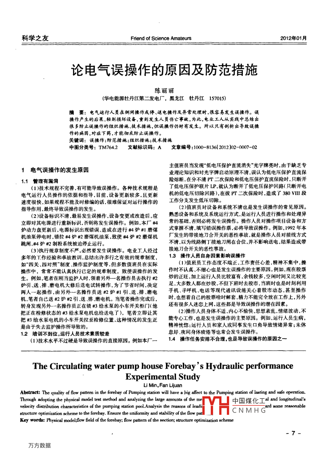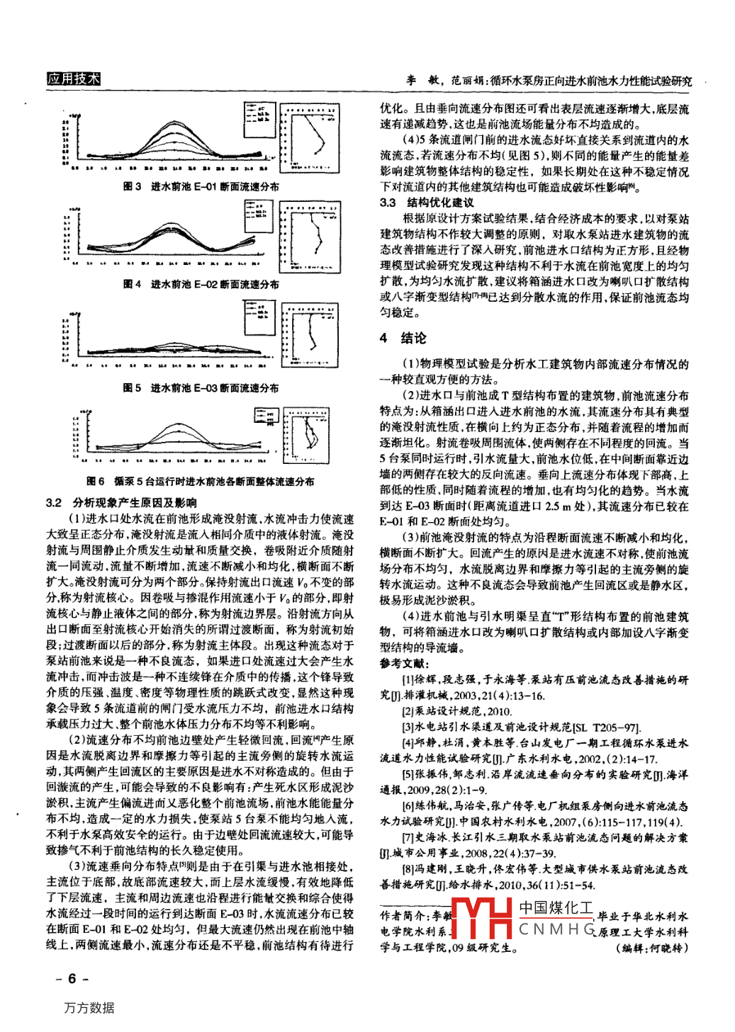 科學之友Friend of Science Amateurs2012年01月循環(huán)水泵房正向進水前池水力性能試驗研究李敏,范麗娟(太原理工大學水利科學與工程學院,山西太原030024)摘要:泵站前池內(nèi)的流態(tài)優(yōu)劣,對泵站的持久安全運行有極大的影響。經(jīng)采用物理模型試驗的方法,通過分析大量的實測資料,得出前池流場橫向、縱向的流速分布特點,分析現(xiàn)象產(chǎn)生因素,提出合理的前池結(jié)構(gòu)優(yōu)化方案,以保證其間水流流態(tài)的均勾性和穩(wěn)定性。關鍵詞:物理模型;前池流場;斷面流態(tài);結(jié)構(gòu)優(yōu)化中圖分類號: TV131.61文獻標識碼: A文章編號: 100-8136( 2012 )02- 005-030本項試驗綜合國內(nèi)外文獻",主要考慮以下相似條件:1引言重力相似(F,數(shù)相似)火力發(fā)電中,循環(huán)水泵房進水前池的水力性能是否穩(wěn)定對(,)=+√F)=1循環(huán)水泵的安全和高效運行都至關重要,對循環(huán)水泵房的土建合理投資也有指導作制。泵站設計規(guī)范規(guī)定.泵站前池布置應其流量和流速比尺分別為:滿足水流順暢流速均勻、池內(nèi)不得產(chǎn)生渦流的要求。如果進水流速比尺:V=L, =3.162前池的形狀.尺寸設計不合理。容易在池內(nèi)形成不良流場。前池是流量比尺:Q=L," =316.2泵站的進水建筑物D,將引水管道中的來水均勻地分配給各流道;當水輪機引用流最迅速改變時.前池的容積叮起一-定的調(diào)節(jié)阻力相似:n=L," =1.46作用.因此,引水管道與泵房進水前池的銜接.應盡量保證泵房2.2測點布置進水前池有良好的流態(tài),保證水流能均勻平穩(wěn)地進入吸水室,避為了便于分析水流特性,在進水前池內(nèi)設有3個測速斷面,免回流和渦流的產(chǎn)生。本文研究將通過物理模型對循環(huán)水泵房每個斷面設5條垂線。每條測速垂線都從底部0.2 m起測,間距1m進水前池進行系統(tǒng)的水力特性試驗研究,并結(jié)合試驗數(shù)據(jù)分析布置測點(見圖1和圖2)。水面流場形態(tài):采用直接觀察和拍照其水力性能.優(yōu)化原設計方案,提出合理的改進措施.保證循環(huán)的方法。水泵的安全運行。本文按力相似準則設計正態(tài)物理模型,針對T.程布置的特點,即進水前池與引水明渠呈直"T"形布置,研究該結(jié)構(gòu)下前池流場及流速分布情況。試驗設計了循環(huán)水泵全部開啟的情況,通過對水流流態(tài)、典型斷面流速分布、水位的觀測.分析了各斷面橫向縱向水流的分布特點,同時研究其產(chǎn)生機理及影響。圈1流速測點垂向分布圍2流速測點橫向分布2研究方法2.3 試驗器材(1 )流速:采用南京水利水電科學研究院研制的OA型旋漿2.1 物理模型設計式光纖流速傳感器、接專用采集系統(tǒng)測量。本試驗基F某實際工程設計模型,根據(jù)研究目的和要求,試(2)前池水位:使用水尺進行測量。驗對前池流場進行了主要探測.進水前池結(jié)構(gòu):長(沿水流方向)x(3 )表面流態(tài)觀察:采用示蹤觀察,并拍照記錄,同時結(jié)合其寬=30.0mx 26.8 m。自流引水管:采用鋼筋混凝土箱涵.單根截他觀測結(jié)果- -同分析。面凈空尺寸bxh=3.5 mx 3.5 m,設計流速為2.23 m/s,進水前池2.4 試驗組次與引水明渠呈直"T"形布置。按照試驗要求選取了一-種典型的情況進行試驗數(shù)據(jù)的采集,為保證模型試驗的精度.試驗采用正態(tài)模型,模型全部采用根據(jù)循泵臺數(shù)及特點將試驗單泵流量控制為5.87 m/s,此時前池優(yōu)質(zhì)有機玻璃加T:制作,一般有機玻璃板的糙率在0.007-0.000水深控制為60 cm左右,循泵5臺全部開啟。之間,模型用優(yōu)質(zhì)有機玻璃制作能滿足糙率相似要求.從而滿足3數(shù)據(jù)分析阻力相似。幾何比尺L.=10.模型試驗占地面積約為32 mx8 m。根據(jù)模型試驗相似原理,要保證不同尺度(λL≠1 )的兩個流3.1前池流速分布體運動的完全相似幾乎是不可能的,通常是根據(jù)原型流體運動進水前池各測速斷面位置和編號見圖1和圖2。本試驗采用的特性,確定出主要影響的作用力.選擇合適的相似準則進行模南京水利水電中國煤化工式光纖流速傳感器、擬。-般情況下,泵房進水流道水工模型試驗是在幾何相似的前接專用采集系TH測得大量數(shù)據(jù),并對提下,依據(jù)F,相似準則設計和運行模型.有條件地放松對雷諾數(shù)數(shù)據(jù)進行了處理CNMH: G5臺水泵運行時,各相似條件的要求。斷面水流橫向流速分布和垂向流速分布情況。- 5-應用技術(shù)李敏, 范麗娟:循環(huán)水泵房正向進水前池水力性能試驗研究優(yōu)化。且由垂向流速分布圖還可看出表層流速逐漸增大,底層流速有遞減趨勢.這也是前池流場能量分布不均造成的。(4)5條流道閘門前的進水流態(tài)好壞直接關系到流道內(nèi)的水流流態(tài),若流速分布不均(見圖5),則不同的能最產(chǎn)生的能量差影響建筑物整體結(jié)構(gòu)的穩(wěn)定性,如果長期處在這種不穩(wěn)定情況圖3進水前池 E -01斷面流速分布下對流道內(nèi)的其他建筑結(jié)構(gòu)也可能造成破壞性影響。3.3結(jié)構(gòu)優(yōu)化建議根據(jù)原設計方案試驗結(jié)果.結(jié)合經(jīng)濟成本的要求,以對泵站建筑物結(jié)構(gòu)不作較大調(diào)整的原則,對取水泵站進水建筑物的流IL態(tài)改善措施進行了深入研究,前池進水口結(jié)構(gòu)為正方形,且經(jīng)物理模型試驗研究發(fā)現(xiàn)這種結(jié)構(gòu)不