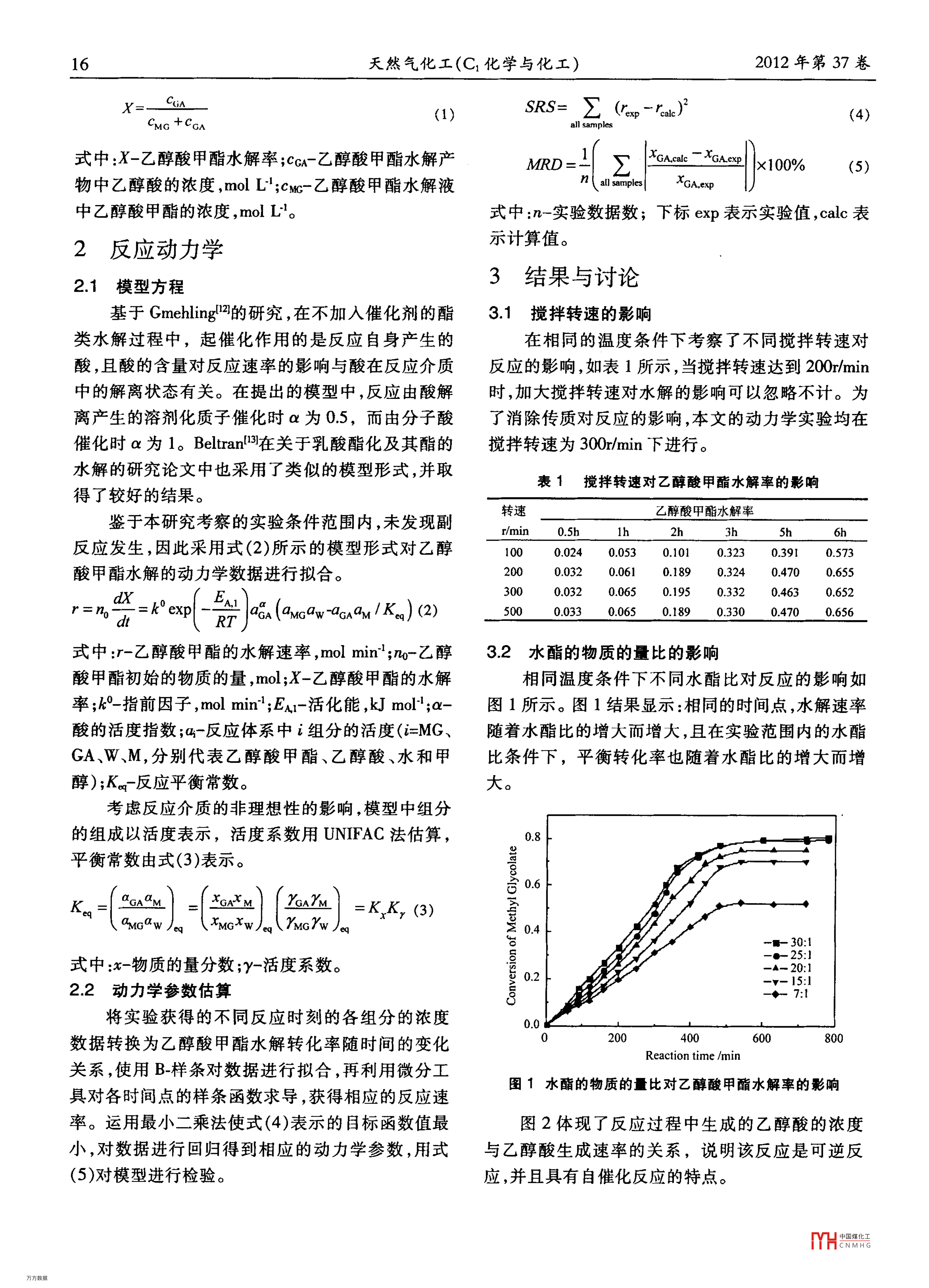 第4期黃光曉等:乙醇酸甲酯水解制備乙醇酸的反應(yīng)動力學(xué)15乙醇酸甲酯水解制備乙醇酸的反應(yīng)動力學(xué)黃光曉,徐艷,李振花,王汝賢,馬新賓(天津大學(xué)化工學(xué)院綠色合成與轉(zhuǎn)化教育部重點實驗室,天津300072)摘要:在無外加催化劑的條件下對乙醇酸甲酯水解制備乙醇酸的反應(yīng)動力學(xué)進行了研究,分別考察了攪拌轉(zhuǎn)速、初始水酯的物質(zhì)的量比和溫度對反應(yīng)速率的影響基于均相模型,通過實驗數(shù)據(jù)的回歸得到了指前因子與活化能。研究發(fā)現(xiàn)用活度代替物質(zhì)的量分數(shù)進行反應(yīng)動力學(xué)擬合效果更好,其中各組分的活度系數(shù)用 UNIFAC法估算通過范特雀夫方程估算得到該反應(yīng)的標準反應(yīng)焓約為1612kJ/mol關(guān)鍵詞:乙醇酸甲酯;水解;乙醇酸;反應(yīng)動力學(xué);自催化中圖分類號:TQ0132;TQ22541文獻標識碼:A文章編號:1001-9219(2012)041504乙醇酸(GA)又稱羥基乙酸,是一種重要的有機原料合成乙二醇過程中的重要副產(chǎn)品。隨著乙二合成中間體和精細化學(xué)品,主要用于皮革、清洗劑醇的合成技術(shù)工業(yè)化進程的不斷推進,水解原料問和化妝品等行業(yè)近年來,尤其是隨著生物醫(yī)學(xué)材題勢將會得到很好解決。料和可降解聚合材料聚乙醇酸(PCA)和聚乳酸-乙鑒于自催化工藝的優(yōu)勢,本文對無外加催化劑醇酸 PLA-PGA的應(yīng)用不斷擴大,對高純度的聚合條件下的乙醇酸甲酯水解的工藝參數(shù)進行了考察,單體乙醇酸的需求量的增長已成必然。并在消除了傳質(zhì)阻力影響的前提下,進行了動力學(xué)目前,國內(nèi)外采用的乙醇酸的生產(chǎn)方法主要實驗測定和動力學(xué)參數(shù)估算。旨在為后續(xù)乙醇酸甲有:氯乙酸水解法、羥基乙腈的酸催化水解法和甲酯水解過程模擬提供數(shù)據(jù)支持。醛羰基化法。氯乙酸水解法和羥基乙腈水解法產(chǎn)品收率高,但原料的毒性腐蝕性以及由此而引發(fā)的1實驗部分環(huán)境問題值得重視;甲醛羰基化法雖然原料成本1.1實驗原料與儀器低,但操作壓力高,產(chǎn)物分離精制復(fù)雜,且催化劑難乙醇酸甲酯,分析純,≥99%;甲醇,分析純,≥以回收利用。一直以來,人們都在積極致力于工99%;乙醇酸分析純,≥99%;去離子水。超級恒溫藝條件的改進如微生物催化合成法阿,日的在于能水浴,上海實驗儀器廠;數(shù)顯無極恒速攪拌器河南夠獲得反應(yīng)條件溫和、環(huán)境友好的合成乙醇酸的綠予華儀器廠;高效液相色譜儀,美國 agilent1100色工藝路線。型。通過酯類化合物的水解制備高純度酸這一工1.2實驗方法藝路線已得到很多研究者認同,他們運用先酯化再實驗在帶有攪拌器、溫度計和冷凝器的250ml水解的工藝過程成功實現(xiàn)了難度較大的酸的純化的四口燒瓶中進行,反應(yīng)溫度控制精度為±0.5K。實因此,以乙醇酸甲酯(MG)為原料水解制備乙醇酸的驗時,先將準確計量的乙醇酸甲酯加入反應(yīng)器預(yù)方法十分值得關(guān)注。事實上,受到乙醇酸甲酯生產(chǎn)熱,開啟攪拌器并將轉(zhuǎn)速調(diào)至指定轉(zhuǎn)速,當(dāng)達到指規(guī)模的限制,原料來源自然也就成為了抑制該水解定溫度時,再將準確計量并已預(yù)熱到指定溫度的去工藝技術(shù)發(fā)展的瓶頸,迄今為止,尚未見乙醇酸甲離子水迅速加入到燒瓶,開始記錄反應(yīng)時間。反應(yīng)酯水解制備乙醇酸的研究文獻報道。乙醇酸甲酯除過程中定時取樣分析??梢圆捎矛F(xiàn)有生產(chǎn)方法生產(chǎn)外網(wǎng),也是以合成氣為13分析方法采用 Agilent110型高效液相色譜儀進行液相收稿日期:2012-0222;作者簡介:黃光曉(1987-),女,碩士研組成分析,流動相為乙腈和水的混合,紫外(UV)檢究生。電郵 vivi@1630m;*聯(lián)系人:徐艷副教授,電話測器,柱溫為25℃,采用面積歸一法對各組分進行02227890041,電郎xuyan040506@tju.edu.cn定量分析。乙醇酸甲酯水解率按式(1)計算廠方16天然氣化工(C1化學(xué)與化工)2012年第37卷Srs=(4)all samples式中:X-乙醇酸甲酯水解率;ccA-乙醇酸甲酯水解產(chǎn)MRD=∑GA.cal- XGAexp×100%(5)物中乙醇酸的濃度,molL;cw-乙醇酸甲酯水解液n( all samples中乙醇酸甲酯的濃度,molL式中:n-實驗數(shù)據(jù)數(shù);下標exP表示實驗值,cal表2反應(yīng)動力學(xué)示計算值。2.1模型方程3結(jié)果與討論基于 gmehling2的研究,在不加入催化劑的酯31攪拌轉(zhuǎn)速的影響類水解過程中,起催化作用的是反應(yīng)自身產(chǎn)生的在相同的溫度條件下考察了不同攪拌轉(zhuǎn)速對酸,且酸的含量對反應(yīng)速率的影響與酸在反應(yīng)介質(zhì)反應(yīng)的影響,如表1所示,當(dāng)攪拌轉(zhuǎn)速達到200m/min中的解離狀態(tài)有關(guān)。在提出的模型中,反應(yīng)由酸解時,加大攪拌轉(zhuǎn)速對水解的影響可以忽略不計。為離產(chǎn)生的溶劑化質(zhì)子催化時a為0.5,而由分子酸了消除傳質(zhì)對反應(yīng)的影響,本文的動力學(xué)實驗均在催化時α為1。 Beltran1在關(guān)于乳酸酯化及其酯的攪拌轉(zhuǎn)速為300rmin下進行。水解的研究論文中也采用了類似的模型形式,并取表1攪拌轉(zhuǎn)速對乙醇酸甲醋水解率的影響得了較好的結(jié)果。轉(zhuǎn)速乙醇酸甲酯水解率鑒于本研究考察的實驗條件范圍內(nèi),未發(fā)現(xiàn)副r/min0.5h2h反應(yīng)發(fā)生,因此采用式(2)所示的