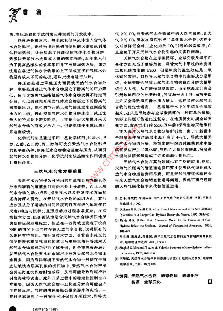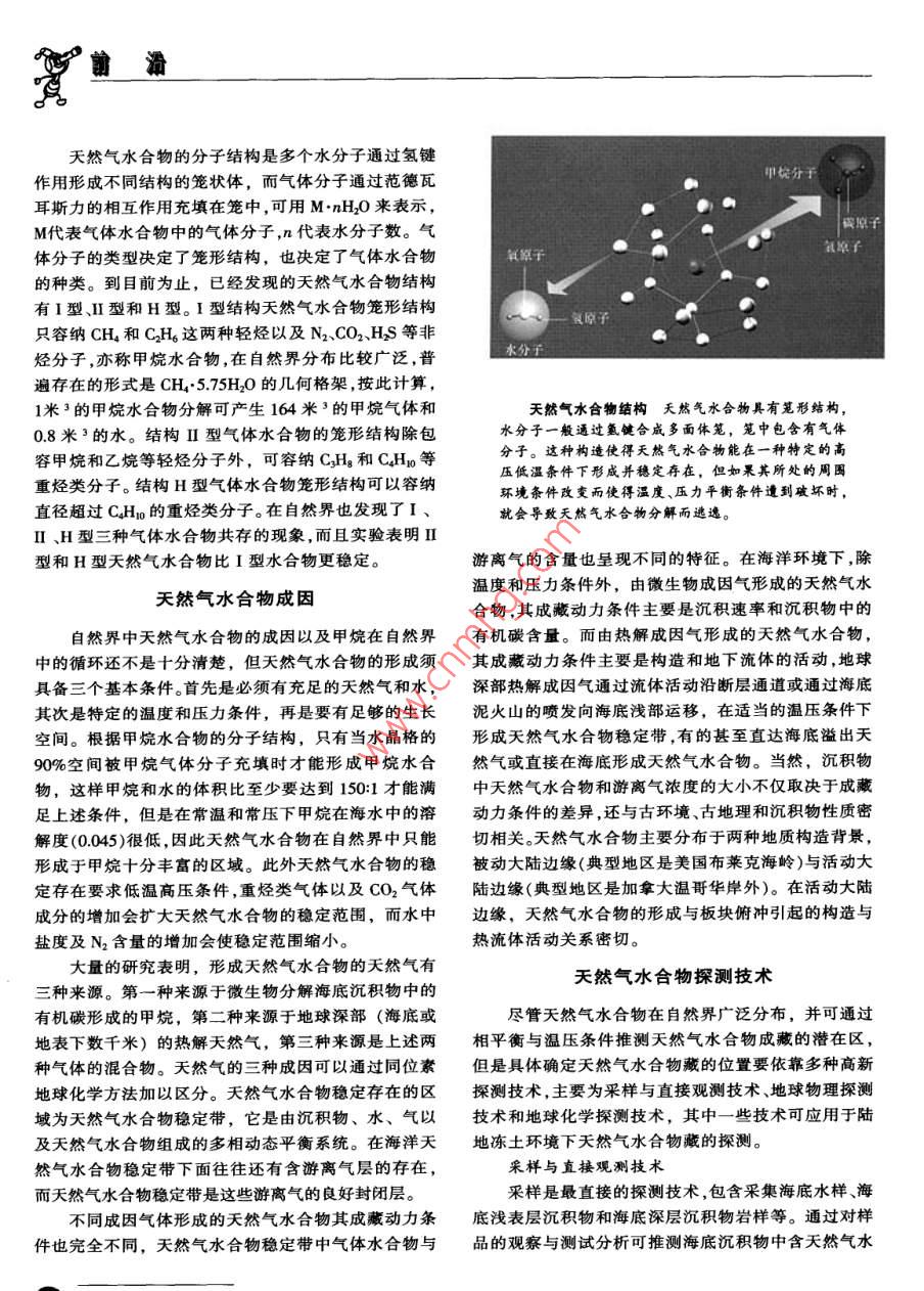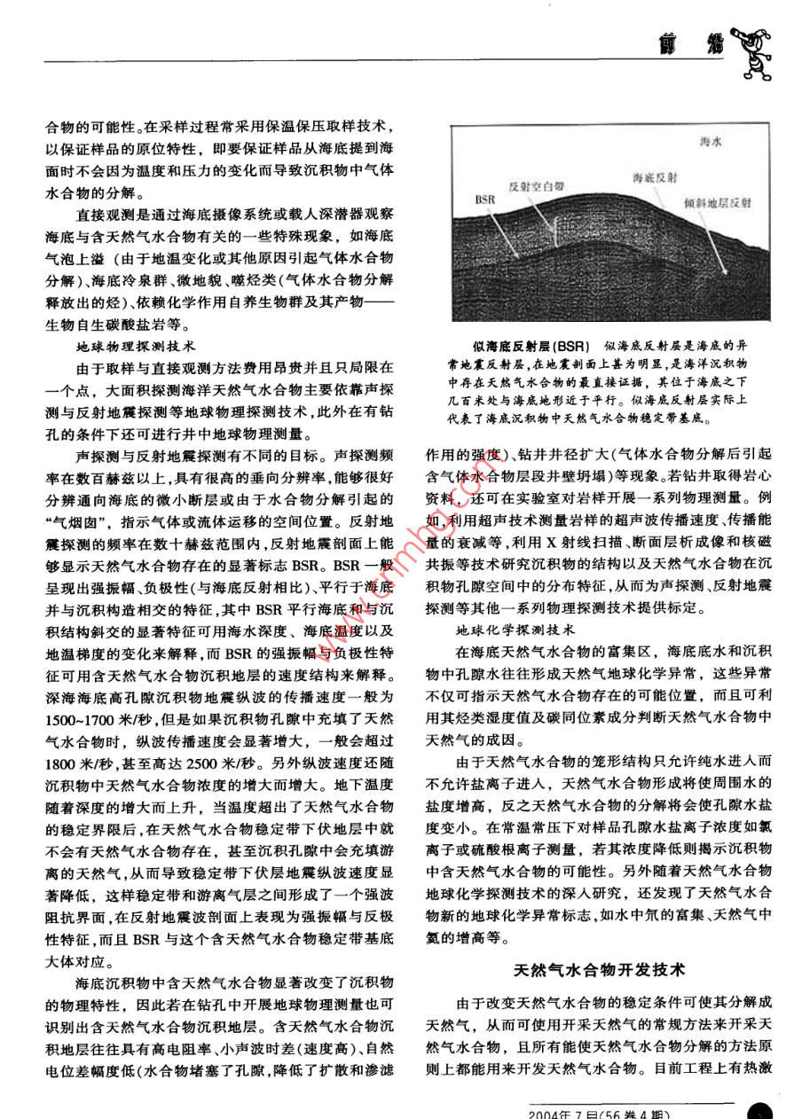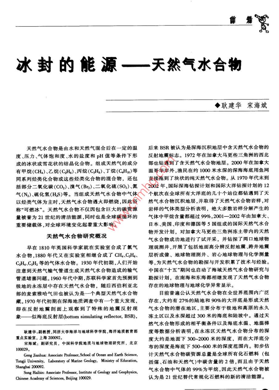 冰封的能源—天然氣水合物◆耿建華宋海斌天然氣水合物是由水和天然氣混合后在一定的溫后來BSR被認(rèn)為是深海沉積地層中含天然氣水合物的度、壓力、氣體飽和度、水的鹽度和pH值等條件下形反射地震標(biāo)志。1972年在加拿大馬更些三角洲的西北成的冰狀或雪花狀的結(jié)晶化合物。組成天然氣的成分部也鉆遇到了含天然氣水合物地層。2000年在加拿大有甲烷(CH4)、乙烷(C2H)、丙烷(C3H)、丁烷(CH)等溫哥華岸外,漁民在約1000米水深的深海海底用魚網(wǎng)同系列烴類化合物或這些烴類化合物的混合物,還包直接拖到了塊狀的純天然氣水合物。從1970年代末到括部分二氧化碳(CO2)溴氣(Br2)、二氧化硫(SO2)、氮2002年,國(guó)際深海鉆探計(jì)劃和國(guó)際大洋鉆探計(jì)劃的12氣(N2)硫化氫(HS等。當(dāng)組成天然氣水合物中氣體個(gè)航次在全球所有大洋底的幾十個(gè)站位都鉆遇到了天以烴類氣體為主時(shí),天然氣水合物遇火即燃燒因此俗然氣水合物沉積地層,并取得了天然氣水合物巖樣,為稱“可燃冰”。天然氣水合物不僅因包含巨大的碳資源巖樣的氣體類型分析表明,絕大多數(shù)巖樣分解產(chǎn)生的量被譽(yù)為21世紀(jì)的清潔能源,同時(shí)也是全球碳循環(huán)的氣體中甲烷含量都超過99%2001-2002年由加拿大、重要儲(chǔ)載體,對(duì)全球環(huán)境變化起著重大影響。日本、美國(guó)、印度和德國(guó)等5國(guó)組成的國(guó)際天然氣水合天然氣水合物研究概況物開發(fā)計(jì)劃,對(duì)加拿大馬更些三角洲凍土帶內(nèi)的天然氣水合物成功地進(jìn)行了試開采,并鉆探了兩口地球物早在1810年英國(guó)科學(xué)家就在實(shí)驗(yàn)室合成了氯氣理觀測(cè)井,開展了包括地面高分辨反射地震、跨井地震水合物,1880年代又在實(shí)驗(yàn)室相繼合成了CHCH6、層析成像、地球物理測(cè)井、巖心地球物理與化學(xué)測(cè)量C2H4、C2H2等的氣體水合物。1930年代初期,人們開始等,為天然氣水合物的勘探與開發(fā)積累了技術(shù)與經(jīng)驗(yàn)。注意到天然氣輸氣管道生成天然氣水合物造成的輸氣中國(guó)在“十五”期間也啟動(dòng)了海域天然氣水合物研究與管道堵塞問題。1960年代中期,蘇聯(lián)科學(xué)家首先預(yù)測(cè)到勘探計(jì)劃,在南海和東海都相繼發(fā)現(xiàn)了天然氣水合物極地的永凍層中存在天然氣水合物,隨后西伯利亞北存在的地球物理與地球化學(xué)異常顯示。部的麥索雅哈氣田也被認(rèn)為是一個(gè)典型天然氣水合物目前普遍公認(rèn)天然氣水合物在全世界范圍內(nèi)廣泛藏。1970年代初期在深海地質(zhì)調(diào)查中有一個(gè)重大發(fā)現(xiàn),存在大約有27%的陸地和90%的大洋底是形成天然即在反射地震剖面上觀察到了特殊的地震反射現(xiàn)氣水合物的潛在地區(qū),主要分布于極地和高原的永久象—似海底反射層 ottom simulating reflector,BSR,凍土區(qū)以及水深超過300米的海底和陸坡中。通過天然氣水合物形成的相平衡條件以及海底水溫、地溫梯耿建華:副教授,同濟(jì)大學(xué)海洋與地球科學(xué)學(xué)院海洋地質(zhì)教育部度等數(shù)據(jù)分析表明,在永凍區(qū)天然氣水合物分布的深重點(diǎn)實(shí)驗(yàn)室,上海20002度大約是地面下300-200米的深度,而在大洋底分宋海斌:副研究員,中國(guó)科學(xué)院地質(zhì)與地球物理研究所,北京布的深度是海底下500-600米的深度范圍內(nèi)。初步估Geng Jianhu: Associate Professor,, School of Ocean and Earth Science,,計(jì)天然氣水合物碳資源總量是全球所有化石燃料(包Tongji Universit, aboratory of Marine Geology, Ministry of Education,括煤、石油和天然氣)中碳含量的2倍,而且由于天然Song Haibin: Associate Professor, Institute of Geology and Geophysics,氣水合物中氣體的99%為甲烷因此天然氣水合物被Shanghai 200092Chinese Academy of Sciences, Beijing 100029認(rèn)為是21世紀(jì)替代常規(guī)化石燃料的新的清潔能源。天然氣水合物的分子結(jié)構(gòu)是多個(gè)水分子通過氫鍵作用形成不同結(jié)構(gòu)的籠狀體,而氣體分子通過范德瓦甲烷分子耳斯力的相互作用充填在籠中,可用MnH2O來表示M代表氣體水合物中的氣體分子,n代表水分子數(shù)。氣體分子的類型決定了籠形結(jié)構(gòu),也決定了氣體水合物氧原子氧原子的種類。到目前為止,已經(jīng)發(fā)現(xiàn)的天然氣水合物結(jié)構(gòu)有1型、Ⅱ型和H型。I型結(jié)構(gòu)天然氣水合物籠形結(jié)構(gòu)氧原子只容納CH4和C2H這兩種輕烴以及N2、CO2HS等非烴分子,亦稱甲烷水合物,在自然界分布比較廣泛,普遍存在的形式是CH4575HO的幾何格架,按此計(jì)算1米3的甲烷水合物分解可產(chǎn)生164米3的甲烷氣體和天然氣水合物結(jié)構(gòu)天然氣水合物具有籠形結(jié)構(gòu)0.8米3的水。結(jié)構(gòu)Ⅱ型氣體水合物的籠形結(jié)構(gòu)除包水分子一般通過氫鍵合成多面體籠,籠中包含有氣體容甲烷和乙烷等輕烴分子外,可容納CH3和CH等分子。這種構(gòu)造使得天然氣水合物能在一種特定的高壓低溫條件下形威并穗定存在,但如果其所處的周圍重?zé)N類分子。結(jié)構(gòu)H型氣體水合物籠形結(jié)構(gòu)可以容納環(huán)境條件改變而使得溫度、壓力平街條件遭到破壞時(shí)直徑超過CH10的重?zé)N類分子。在自然界也發(fā)現(xiàn)了I就會(huì)導(dǎo)致天然氣