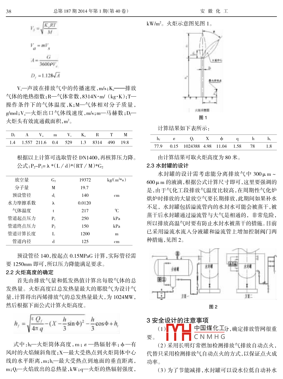 第40卷,第1期徽化2014年2月ANHU CHEMICAL INDUSTRYFeb.2014甲醇項(xiàng)目火炬系統(tǒng)的安全設(shè)計(jì)潘麗華(東華工程科技股份有限公司,安徽合肥230024)摘要:介紹了火炬的功能和類型,描述了甲醇項(xiàng)目火炬的設(shè)計(jì)過程和選型計(jì)算,強(qiáng)調(diào)了安全設(shè)計(jì)及必須考慮的安全因素關(guān)鍵詞:火炬系統(tǒng);安全設(shè)計(jì);安全因素doi:10.3969/jiss.1008-553X2014.01.011中圖分類號(hào):TQ0862文獻(xiàn)標(biāo)識(shí)碼:B文章編號(hào):1008-553X(2014)01-0037-0火炬系統(tǒng)是用來處理工廠或裝置在開停車、事故、氣通常采用擴(kuò)徑式。擴(kuò)徑起兩個(gè)作用,首先,邊界氣速降正常生產(chǎn)時(shí)排放的無法收集和再加工的可燃?xì)怏w、有毒低容易點(diǎn)火;然后,邊界氣返回滯留時(shí)燃燒放熱維持火氣體的特殊燃燒設(shè)施。它可將易燃、有毒、腐蝕性氣體通炬氣繼續(xù)燃燒。過燃燒變成無害的二氧化碳、水或毒性較小的其他物2放空系統(tǒng)的安全設(shè)計(jì)質(zhì),是保證安全生產(chǎn)、減少環(huán)境污染的一項(xiàng)重要措施,也2.1火炬管網(wǎng)的設(shè)計(jì)是化工廠的最后一道安全屏障?;鹁嫦到y(tǒng)本身如果設(shè)計(jì)以60萬噸/年煤制甲醇項(xiàng)目為例,綜合各工段排不當(dāng)會(huì)造成設(shè)備損壞,甚至存在人員傷亡等更大的安全放氣參數(shù),根據(jù)不互相反應(yīng),排放壓力差別不大,熱值大隱患,所以火炬系統(tǒng)的安全設(shè)計(jì)非常必要,應(yīng)當(dāng)受到重小等因素確定設(shè)三個(gè)排放管網(wǎng),各排放氣參數(shù)如表1視。本人結(jié)合項(xiàng)目設(shè)計(jì),特別是低熱值氣體的火炬系統(tǒng)表1排放氣參數(shù)設(shè)計(jì),提出一些安全措施以供借鑒。溫度壓力低熱值分子量1火炬系統(tǒng)概述成分(Nm/h)(℃)(MPaG)(KJ/m)(g/mol根據(jù)支撐結(jié)構(gòu)火炬可分為高架火炬和地面火炬,其6610702170.15375519.80.88中高架火炬因技術(shù)成熟,造價(jià)低,施工維修方便等特點(diǎn)丙烯428971000.185968742般為首選方案。高架火炬又根據(jù)火炬筒體的支撐形式分為拉線式、自制撐式和塔架式。其中塔架式因結(jié)構(gòu)穩(wěn)干燥酸3036250.11068041091.87性氣定,占地面積小而被廣泛應(yīng)用火炬系統(tǒng)包括排放管網(wǎng)、火炬設(shè)備、塔架、點(diǎn)火和控三個(gè)排放管網(wǎng)分別為:氣化工段氣化爐排放氣為主制系統(tǒng)。根據(jù)工藝流程,排放氣由排放管網(wǎng)進(jìn)入火炬界的火炬總管,冰機(jī)工段和低溫甲醇洗工段排放的丙烯氣區(qū)后依次進(jìn)入分液罐、水封罐、火炬筒體、分子封、火炬管道和低溫甲醇洗工段排放的不含水酸性氣管道。因?yàn)轭^等火炬設(shè)備。自動(dòng)點(diǎn)火和控制系統(tǒng)為火炬系統(tǒng)安全燃丙烯火炬氣的熱值太高,火焰會(huì)在火炬頭處或內(nèi)部悶燒提供保障燒,最終把火炬頭燒壞,因而不宜與熱值低的大排量氣分液罐和水封罐能分離300~600μm以上的液滴,體共用火炬頭,所以設(shè)單獨(dú)排放管網(wǎng)。酸性氣中含高濃以防止大量液滴被氣體夾帶到火炬頭后,燃燒不充分產(chǎn)度HS因?yàn)椴缓?所以選擇碳鋼管道即可;如果排入生火雨。為了防止回火爆炸,水封罐和分子封一般采用火炬總管,因?yàn)槠渌鼩怏w可能含水,HS酸性氣遇到水迷宮式結(jié)構(gòu)。則會(huì)有腐蝕性。為了避免選擇昂貴的管道材料,所以干火炬筒體連接分子封和立式水封罐,讓火炬氣通燥酸性氣設(shè)單獨(dú)排放管網(wǎng)。過,同時(shí)起支撐作用。根據(jù)規(guī)范要求,火炬筒體的直徑排放筜網(wǎng)確守坦坦放氣量和選擇合適的馬不能小于排放管的直徑,一般取跟排放管直徑一致。赫數(shù)來中國煤化本壓力降,觀察起點(diǎn)排火炬頭將排放的有害氣體燃燒成無害或危害程度放壓力CNMHG火炬總管為例,計(jì)算過較低的氣體,是火炬裝置的主要設(shè)備,型式很多。低熱值程如下收稿日期:2013-09-13作者簡介:潘麗華(1978-),女,工程師,畢業(yè)于鄭州大學(xué),從事化工產(chǎn)品儲(chǔ)運(yùn)設(shè)計(jì)工作,0551-63697286,13505699500,panlihua@Dchinaece.com總第187期2014年第1期(第40卷安徽化工=,EkW/m2。火炬示意圖見圖1。M=3600pD,=1.128AV.聲波在排放氣中的傳播速度,m/s;K——一排放氣體的絕熱指數(shù);R一氣體常數(shù),8314N·m/(kg·K);T操作條件下的氣體溫度,K;M一氣體相對(duì)分子質(zhì)量,g/mol;V一火炬出口氣體線速度,ms;m-馬赫數(shù);D火矩示火炬頭有效流通截面積,m2。計(jì)算結(jié)果如下表所KRQr x ph1,41.557211.6045291.3831449019.87790.15102438849811.041.58781.8根據(jù)以上計(jì)算可選取管徑DN1400,再核算壓力降由計(jì)算結(jié)果可取火炬高度為80米公式:P2-P1=A*(L/d)*(RT/M)*23水封罐的設(shè)計(jì)水封罐的設(shè)計(jì)需考慮能分離排放氣中300μm~放空量kg/(m*s)600μm的液滴,根據(jù)公式計(jì)算尺寸即可,這里要強(qiáng)調(diào)的分子量是,由于氣化工段排放氣溫度比較高,在周期性氣化爐預(yù)設(shè)管徑烘爐時(shí)排放的大量放空氣要長期排放,此期間如果補(bǔ)水水力摩擦系數(shù)0.0120不足,水封罐包括溢流管內(nèi)的水封水可能會(huì)被蒸干,被氣體溫度217管道起點(diǎn)壓力蒸干后水封罐通過溢流管與大氣是相通的,非常危險(xiǎn),管道終點(diǎn)壓力PPLkPa所以排放高溫氣時(shí)要
