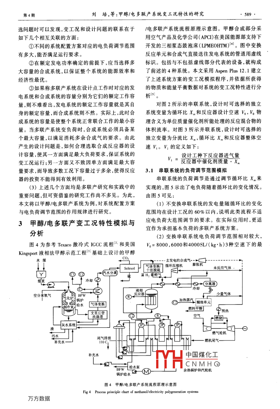 第26卷第4期動(dòng)力工程Vol, 26 No 406年8月Journal of Power Engineering文章編號(hào):10006761(2006)04-587-0甲醇/電多聯(lián)產(chǎn)系統(tǒng)變工況特性的研究劉培,高健,李政(清華大學(xué)熱能工程系,北京100084)摘要:利用 Aspen Plus仿真工具和甲醇/電多聯(lián)產(chǎn)系統(tǒng)的變工況數(shù)學(xué)模型,對(duì)串聯(lián)或并聯(lián)、以及有否變換單元的4種多聯(lián)產(chǎn)系統(tǒng)配置方案進(jìn)行了模擬計(jì)算,詳細(xì)比較了它們的電負(fù)荷調(diào)節(jié)范圍。分析結(jié)果表明:4種系統(tǒng)調(diào)節(jié)能力由強(qiáng)到弱依次為:變換并聯(lián)系統(tǒng)、變換串聯(lián)系統(tǒng)、不變換并聯(lián)系統(tǒng)和不變換串聯(lián)系統(tǒng)。相關(guān)分析方法和結(jié)論為多聯(lián)產(chǎn)系統(tǒng)設(shè)計(jì)提供了參考。圖7參5關(guān)鍵詞:能源工程;多聯(lián)產(chǎn);變工況;負(fù)荷調(diào)節(jié)中圖分類號(hào):TK01,TQ21文獻(xiàn)標(biāo)識(shí)碼:APerformance Alteration of Methanol/ Electricity PolygenerationSystems for Various modes of OperationLIU Pei, GA0 Jian, LI ZhengDepartment of Thermal Engineering, Tsinghua University, Beijing 100084, China)Abstract: Making use of Aspan Plus simulation tools and a mathematical model for operation mode changes of methanolelectricity polygeneration systems, simulation calculation of four different variants of system configurations, includingseries and parallel connections, as well as changes of elements have been calculated and their electric output variationcapabilities compared in detail. The sequence of the four configuration variants in terms of diminishing order of regulationcapability are in succession: the parallel connection variant with shift reactor, the series connection variant with shiftreactor,the parallel connection variant without shift reactor, and the series connection variant without shift reactor. Figsand refs 5Keywords: cenergy engineering polygeneration; off design operation; output regulation1研究目的優(yōu)越的環(huán)保性能,以聯(lián)產(chǎn)運(yùn)輸采用液體燃料以緩解石油安全需要,及未來(lái)可采取較方便和以較小的成在新世紀(jì),我國(guó)能源面臨著資源短缺,液體燃料本減排溫室氣體等特性,成為我國(guó)煤炭現(xiàn)代化利用嚴(yán)重依賴進(jìn)口,環(huán)境污染加劇,溫室氣體排放量大而的重要途徑之且增長(zhǎng)迅速,農(nóng)村和小城鎮(zhèn)需要方便和潔凈能源等多聯(lián)產(chǎn)系統(tǒng)的概念實(shí)質(zhì)上是要把化工過(guò)程和發(fā)諸多挑戰(zhàn)。煤炭作為我國(guó)主要使用的一次能源,急電過(guò)程有機(jī)地耦合在一起,力爭(zhēng)實(shí)現(xiàn)能量利用、經(jīng)濟(jì)需在利用形式上和利用過(guò)程方面加以創(chuàng)新,以應(yīng)對(duì)性和環(huán)保性能的最優(yōu)化。盡管由于多聯(lián)產(chǎn)涉及到的這些挑戰(zhàn)。以煤氣化為核心的多聯(lián)產(chǎn)系統(tǒng)由于具備主V凵中國(guó)煤化工成(如甲醇)和燃輪CNMHG此具有相當(dāng)?shù)目尚惺崭迦掌?2005-1205性,但是要把其發(fā)展為一個(gè)完整的經(jīng)濟(jì)上具有競(jìng)爭(zhēng)基金項(xiàng)目:國(guó)家自然科學(xué)基金重大研究計(jì)劃項(xiàng)目(90210032)及國(guó)家重點(diǎn)基礎(chǔ)研究發(fā)展計(jì)劃項(xiàng)目(2005cB221207)資助。力的實(shí)用技術(shù),依然存在較大的挑戰(zhàn)。這個(gè)挑戰(zhàn)除作者簡(jiǎn)介:劉培(90),男,碩士生,主要從事多聯(lián)產(chǎn)系統(tǒng)研了體現(xiàn)在已有成熟技術(shù)為適應(yīng)多聯(lián)產(chǎn)系統(tǒng)的特殊需方方數(shù)據(jù)要尚需改變和改進(jìn)外,更重要的則體現(xiàn)在系統(tǒng)集成動(dòng)力第26卷層次上,即:如何設(shè)計(jì)系統(tǒng)結(jié)構(gòu),功能和參數(shù),使其不環(huán)回路。定義X。為循環(huán)比,其物理意義為循環(huán)回反僅具有較高的設(shè)計(jì)效率,而且滿足各種變工況運(yùn)行應(yīng)器入口的合成尾氣與反應(yīng)器入口新鮮氣的比值。和操作要求(可操作性)以及在此條件下的可靠性、系統(tǒng)運(yùn)行的一個(gè)特例是合成尾氣完全不循環(huán)、而是可用性和可維護(hù)性要求,使得系統(tǒng)在整個(gè)生命周期全部送往發(fā)電系統(tǒng),本文稱其為合成氣“一次通過(guò)”具備最大的經(jīng)濟(jì)性。為此,本文將多聯(lián)產(chǎn)系統(tǒng)層次方式,此時(shí)Xn=0研究的內(nèi)涵歸納為:在滿足可操作性以及可靠性、可圖2和圖3中用虛線標(biāo)出了變換單元,表示這用性和可維護(hù)性等技術(shù)要求條件下,實(shí)現(xiàn)能源、環(huán)境是一個(gè)可選單元,通過(guò)選擇確定是否設(shè)置合成氣變和生態(tài)以及經(jīng)濟(jì)性的多目標(biāo)最優(yōu)化問(wèn)題(圖1)。換系統(tǒng)。本文研究的系統(tǒng)方案可分為:不變換串聯(lián)操作性可靠性系統(tǒng),變換串聯(lián)系統(tǒng),不變換并聯(lián)系統(tǒng)和變換并聯(lián)系滿足產(chǎn)品生產(chǎn)可用性同可維護(hù)性滿足多目標(biāo)要統(tǒng),分別以方案1-4標(biāo)識(shí)要求的多聯(lián)產(chǎn)的優(yōu)化設(shè)計(jì)方案系統(tǒng)初步設(shè)計(jì)煤氣化系統(tǒng)的集成度一般定義為燃?xì)廨啓C(jī)壓氣方案能經(jīng)環(huán)其他技術(shù)約源|濟(jì)境機(jī)提供的空氣量占空分系統(tǒng)總進(jìn)氣量的比例。由于集成度不是本文討論的