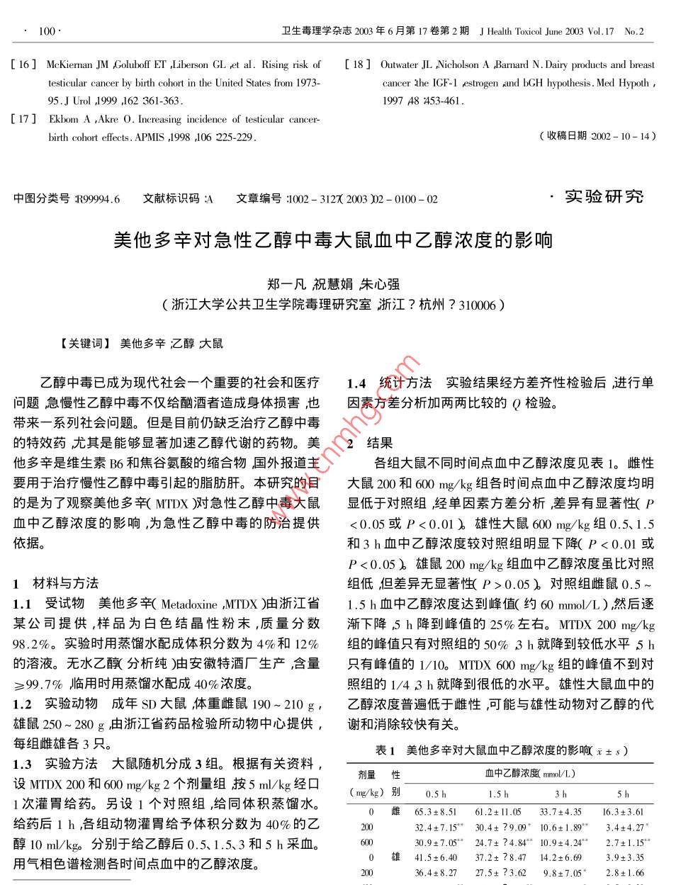 美他多辛對(duì)急性乙醇中毒大鼠血中乙醇濃度的影響