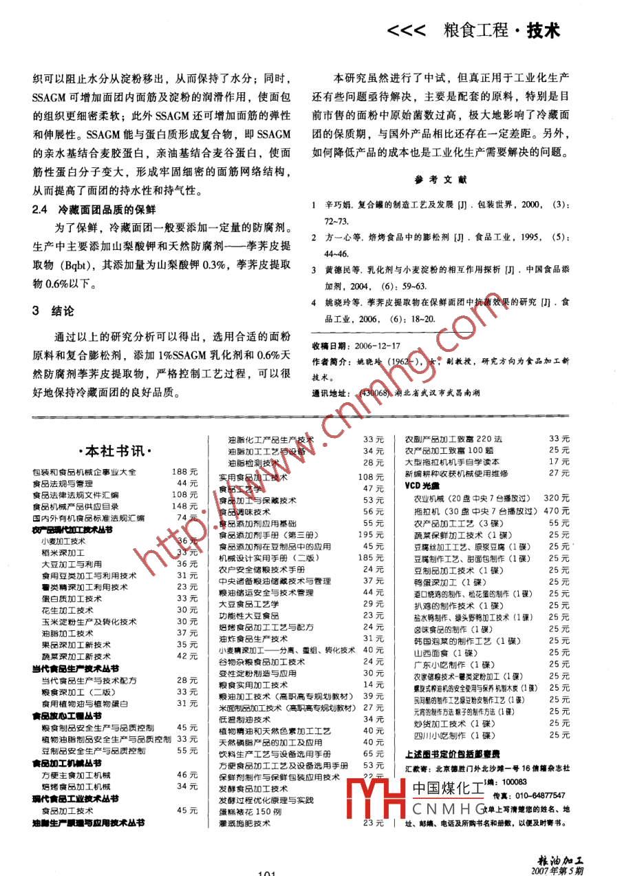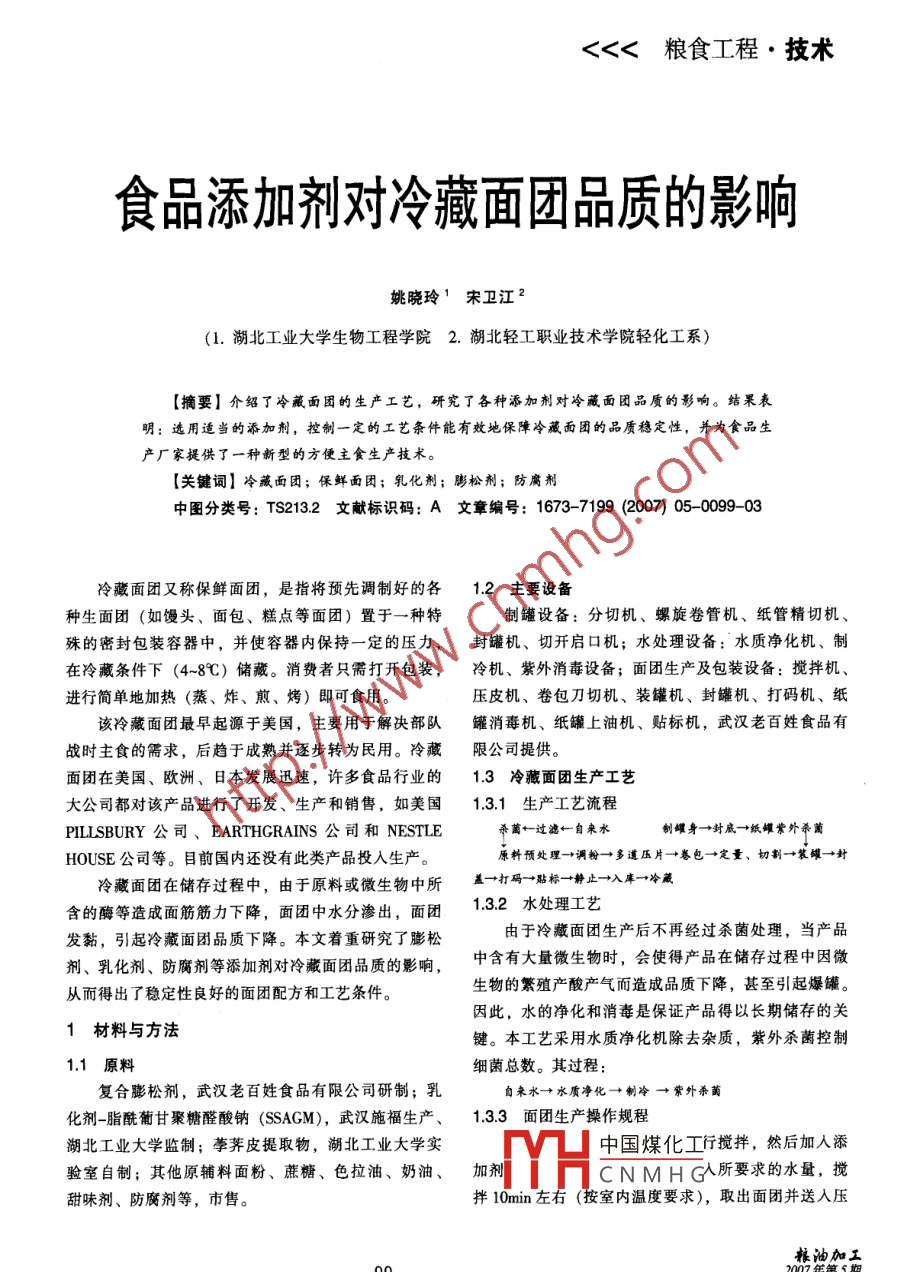 <<<糧食工程 ●技術食品添加劑對冷藏面團品質(zhì)的影響姚曉玲1宋衛(wèi)江2(1.湖北工業(yè)大學生物工程學院2. 湖北輕工職業(yè)技術學院輕化工系)[摘要]介紹了冷藏面團的生產(chǎn)工藝,研究了各種添加劑對冷藏面團品質(zhì)的影響。結(jié)果表明:選用適當?shù)奶砑觿?,控制一定的工藝條件能有效地保障冷藏面團的品質(zhì)穩(wěn)定性,并為食品生產(chǎn)廠家提供了一種新型的方便主食生產(chǎn)技術。[關鍵詞]冷藏面團;保鮮面團;乳化劑;膨松劑;防腐劑.中圖分類號: TS213.2文獻標識碼: A文章編號: 1673-7199 (2007) 05-0099-03冷藏面團又稱保鮮面團,是指將預先調(diào)制好的各1.2主要設備種生面團(如饅頭、面包、糕點等面團)置于一種特制罐設備:分切機、螺旋卷管機、紙管精切機、殊的密封包裝容器中,并使容器內(nèi)保持一定的壓力,封罐機、切開啟口機;水處理設備:水質(zhì)凈化機、制在冷藏條件下(4~8C) 儲藏。消費者只需打開包裝,冷機、紫外消毒設備;面團生產(chǎn)及包裝設備:攪拌機、進行簡單地加熱(蒸、炸、煎、烤)即可食用。壓皮機、卷包刀切機、裝罐機、封瓘機、打碼機、紙該冷藏面團最早起源于美國,主要用于解決部隊罐消毒機、紙罐上油機、貼標機,武漢老百姓食品有戰(zhàn)時主食的需求,后趨于成熟并逐步轉(zhuǎn)為民用。冷藏.限公司提供。面團在美國、歐洲、日本發(fā)展迅速,許多食品行業(yè)的1.3 冷藏面團生產(chǎn)工藝大公司都對該產(chǎn)品進行了開發(fā)、生產(chǎn)和銷售,如美國1.3.1生產(chǎn)工藝流程PILLSBURY公司、EARTHGRAINS 公司和NESTLE殺蘺←過濾←自來水制罐身-→封底- +紙罐紫外殺菌HOUSE公司等。目前國內(nèi)還沒有此類產(chǎn)品投入生產(chǎn)。原料預處理→調(diào)粉-→多道壓月- +卷包→定量、切割→裝罐→封冷藏面團在儲存過程中,由于原料或微生物中所蓋→打碼→貼標-→靜止→入庫→冷藏含的酶等造成面筋筋力下降,面團中水分滲出,面團1.3.2水處理工藝發(fā)黏,引起冷藏面團品質(zhì)下降。本文著重研究了膨松由于冷藏面團生產(chǎn)后不再經(jīng)過殺菌處理,當產(chǎn)品劑、乳化劑、防腐劑等添加劑對冷藏面團品質(zhì)的影響,中含有大量微生物時,會使得產(chǎn)品在儲存過程中因微從而得出了穩(wěn)定性良好的面團配方和工藝條件。生物的繁殖產(chǎn)酸產(chǎn)氣而造成品質(zhì)下降,甚至引起爆罐。因此,水的凈化和消毒是保證產(chǎn)品得以長期儲存的關1材料與方 法鍵。本工藝采用水質(zhì)凈化機除去雜質(zhì),紫外殺菌控制1.1 原料細菌總數(shù)。其過程:復合膨松劑,武漢老百姓食品有限公司研制;乳自未水+水質(zhì)凈化-→制冷→常外殺菌化劑-脂酰葡甘聚糖醛酸鈉(SSAGM),武漢施福生產(chǎn)、1.3.3 面團生產(chǎn)操作規(guī)程湖北工業(yè)大學監(jiān)制;荸薺皮提取物,湖北工業(yè)大學實中國煤化工行攪拌,然后加人添驗室自制;其他原輔料面粉、蔗糖、色拉油、奶油、加劑YHCNMH G人所要求的水量,攪甜味劑、防腐劑等,市售。拌10min左右(按室內(nèi)溫度要求),取出面團并送人壓糧油加工92007年第5期技術●糧食工程>>>皮機。將面團經(jīng)過三道輥壓,最后形成8mm厚的面的關鍵因素。片。2.2 膨松劑與冷藏面團品質(zhì)的關系將面片通過卷包機卷成圓簡狀,注意圓簡內(nèi)不得冷藏面團所用的膨松劑由生物膨松劑和化學膨松有空心,以免影響成品的定量。再按質(zhì)量要求調(diào)節(jié)好劑組成。生物膨松劑采用活性干酵母,化學膨松劑由分切機的分切速度,分切面團后,迅速把面團裝人罐小蘇打和酸性膨松劑組成??梢酝ㄟ^選擇酸性膨松劑中,并使罐底部裝實,不得有空間,然后靜止-段時的種類和控制用量調(diào)節(jié)面團的產(chǎn)氣速度。一般冷藏面間。靜止的目的是讓罐內(nèi)的面團中的化學膨松劑發(fā)生團常用反應速度較慢的酸性膨松劑,如MCP、SAS、反應,產(chǎn)生一定的CO2氣體,面團充滿容器并形成一SALP、PGDL、GDP等,其種類選擇和用量應根據(jù)面團定的內(nèi)壓,可防止微生物的生長和繁殖。一般控制溫的性質(zhì)和保質(zhì)期決定。常用的酸性膨松劑見表1。度為25C左右,靜止時間由添加的膨松劑種類決定。2.3SSAGM對冷藏面團品質(zhì)的影響1.3.4包裝容器生產(chǎn)方法為了提高冷藏面團的持水性和持氣性,一般應在本產(chǎn)品采用的包裝容器為螺旋式復合罐。螺旋式.表1食品加工中 常用的酸性膨松劑復合罐的特點是開啟方便,并能承受一定的壓力,特化學名稱化學分子式學名或縮寫中和值別適用于冷藏面團使用。-水磷酸- -鈣CaHl (PO4) :H20MCP. H2030無水磷酸一鈣CaHl (PO) :MCP83①螺旋式復合罐的結(jié)構(gòu)和材料二水磷酸-鈣CaHL (PO2 x:2H20DCP螺旋式復合罐由罐身和上下罐蓋三部分組成。罐酸式焦磷酸鈉Na:HP:Oz72身由螺旋式錯位復合的密封層、加強層和表層構(gòu)成。碗酸鋁納NasSO, Ar (so) ,SAS00密封層由薄膜層(薄膜層采用聚丙烯或聚乙烯等材料,磷酸鋁鈉水化物Na2HyAl, (PO) +4H0SALP在密封層的結(jié)合部,有自內(nèi)向外的卷邊,依靠熱溶使無水磷酸鋁鈉NaHuAl, (PO2) :10其結(jié)合成為一個密封的簡體)、阻隔層和外結(jié)合層復合酒石酸氫鉀KHCO。酒石50葡糖酸-δ-內(nèi)釀CHnOoGDP55而成;加強層由多種牛皮紙復合而成,置于密封層和表層之間;表層置于包裝容器的外層,在表層上設置面團中加入