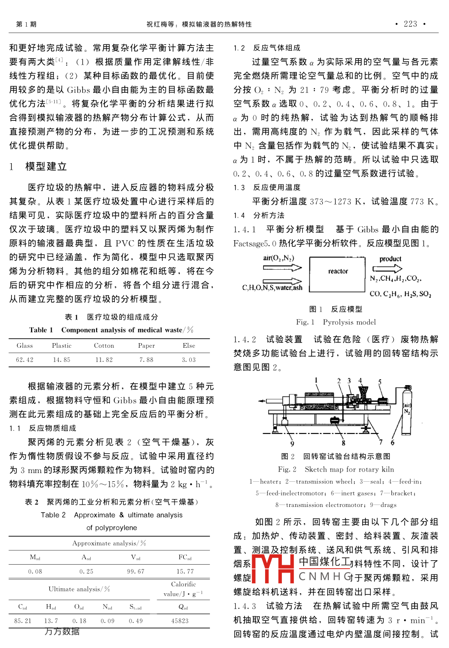 第58卷第1期學(xué)報Vol 58 No. 12007年1月Journal of Chemical Industry and Engineering ( Chinalary 2007研究論文模擬輸液器的熱解特性祝紅梅,嚴建華,沈逍江,蔣旭光,岑可法(能源潔凈利用國家重點實驗室(浙江大學(xué)),浙江杭州310027)摘要:建立非化學(xué)計量平衡模型,根據(jù) Gibbs最小自由能原理對醫(yī)療垃圾中的典型組分輸液器進行平衡分析,根據(jù)分析結(jié)果擬合出產(chǎn)物分布的計算公式。通過危險廢物熱解焚燒多功能試驗臺進行試驗,試驗結(jié)果驗證了計算公式的可靠性,從而通過公式可直接預(yù)測醫(yī)療垃圾中典型組分輸液器熱解后的各產(chǎn)物百分含量關(guān)鍵詞:醫(yī)療垃圾;輸液器;熱解; Gibbs自由能;平衡分析中圖分類號:X705文獻標識碼:A文章編號:0438-1157(2007)01-0222-05Pyrolysis properties of simulated transfusion tubeZHU Hongmei, YAN Jianhua, SHEN Xiaojiang, JIANG Xuguang, CEN KefaState Key laboratory of Clean Energy Utilization (Zhejiang University), Hangzhou 310027, Zhejiang, China)Abstract: A non-stoichiometic equilibrium model based on the Gibbs free energy minimization approach wasdeveloped to analyze the pysolysis of typical medical waste-transfusion tube. The equations of pyrolysisproducts distribution were established on the basis of equilibrium analysis. Also the reliability of theseequations was verified by experimenting on the hazardous waste rotary kiln. These equations could be usedto predict distribution of pysolysis products directlKey words: medical waste; transfusion tube; pyrolysis; Gibbs free energy; equilibrium analysis熱解是在無氧或缺氧條件下,高溫加熱有機引言物,使有機物分子鏈斷裂進行熱分解,分解成裂解醫(yī)療垃圾含有大量的病毒、病菌及化學(xué)藥劑,氣與裂解焦的過程。裂解氣是由一氧化碳、二氧化是對環(huán)境危害極大的危險廢物。組成的多變又對醫(yī)碳、甲烷、氫氣、有機酸、焦油和水蒸氣等組成的療垃圾的處理裝置有很大的影響。目前已有多種技混合氣體,裂解焦則以碳為主。按熱解的溫度不術(shù)可用于醫(yī)療垃圾的處置,如清洗消毒、高溫消同,分為高溫?zé)峤?>1273K)、中溫?zé)峤舛?、填埋和焚燒等υ。由于焚燒能夠做到廢棄物的(873~973K)和低溫?zé)峤?<873K)。其中加熱減量化、穩(wěn)定化、無害化,在所有可行的醫(yī)療垃圾方式又可分為直接加熱和間接加熱。在對醫(yī)療垃處理中,該法已被證明是破壞傳染性和有毒性物圾進行熱解焚燒的處理過程中,由于組分復(fù)雜,以質(zhì)、減少體積和重量的有效方法之一。各國也在不及不允許將醫(yī)療垃圾的包裝袋打開,因此獲得醫(yī)療斷地完善醫(yī)療垃圾焚燒技術(shù),為減少焚燒中產(chǎn)生酸垃圾的比例數(shù)據(jù)是困難旳.直接進行熱解試驗很難性氣體等污染物,目前更多的是采用熱解焚燒對產(chǎn)物的組分和分布有良好的把握,因此在試驗前方法21。對熱中國煤化工分析,可以指導(dǎo)設(shè)計CNMHG005-12-21收到初稿,2006-06-12收到修改稿聯(lián)系人:蔣旭光。第一作者:祝紅梅(1982—),女,博士研jiangxg(a cmee. zju. edu.cn基金項目:國家自然科學(xué)基金項目(50276055)Foundation item: supported by the National Natural ScienceFoundation of China(50276055)第1期祝紅梅等:模擬輸液器的熱解特性223·和更好地完成試驗。常用復(fù)雜化學(xué)平衡計算方法主1.2反應(yīng)氣體組成要有兩大類:(1)根據(jù)質(zhì)量作用定律解線性/非過量空氣系數(shù)a為實際采用的空氣量與各元素線性方程組;(2)某種目標函數(shù)的最優(yōu)化。目前使完全燃燒所需理論空氣量總和的比例??諝庵械某捎幂^多的是以 Gibbs最小自由能為主的目標函數(shù)最分按O2:N2為21:79考慮。平衡分析時的過量優(yōu)化方法。將復(fù)雜化學(xué)平衡的分析結(jié)果進行擬空氣系數(shù)α選取0、0.2、0.4、0.6、。由于合得到模擬輸液器旳熱解產(chǎn)物分布計算公式,從而α為θ時的純熱解,試驗為達到熱解氣的順暢排直接預(yù)測產(chǎn)物的分布,為進一步的工況預(yù)測和系統(tǒng)出,需用高純度的N2作為載氣,因此采樣的氣體優(yōu)化提供幫助中N2含量包括作為載氣的N2,使試驗結(jié)果不真實1模型建立α為1時,不屬于熱解的范疇。所以試驗中只選取0.2、0.4、0.6、0.8的過量空氣系數(shù)進行試驗醫(yī)療垃圾的熱解中,進入反應(yīng)器的物料成分極1.3反應(yīng)使用溫度其復(fù)雜。從表1某醫(yī)療垃圾處置中心進行采樣后的平衡分析溫度373~1273K,試驗溫度773K結(jié)果可見,實際醫(yī)療垃圾中的塑料所占的百分含量1.4分析方法僅次于玻璃。醫(yī)療垃圾中的塑料又以聚丙烯為制作1.4.1平衡分析模型基于 Gibbs最小自由能的原料旳輸液器最典型,且PVC的性質(zhì)在生活垃圾 Factsage5.熱化學(xué)平衡分析軟件。反應(yīng)模型見圖1。的研究中已經(jīng)涵蓋,作為簡化,模型中只選取聚丙烯為分析物料。其他的組分如棉花和紙等,將在今eactor后的研究中作相應(yīng)的分析,將各個組分進行混合,N, CH4, H, CO2.C, H, O, N,S, wa從而建立完整的醫(yī)療垃圾的分析模型CO, C2H6,H]s,sO2圖1反應(yīng)模型1醫(yī)療垃圾的組成成分Fig 1 Pyrolysis modelTable I Component analysis of medical waste/%2試驗裝置試驗在危險(醫(yī)療)廢物熱解Paper焚燒多功能試驗臺上進行,試驗用的回轉(zhuǎn)窯結(jié)構(gòu)示62,4214.8511,82意圖見圖2。根據(jù)輸液器的元素分析,在模型中建立5種元素組成,根據(jù)物料守恒和 Gibbs最小自由能原