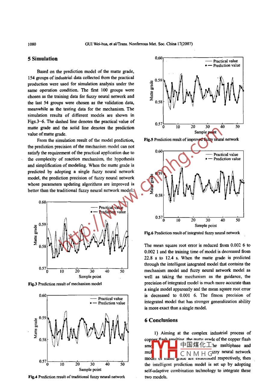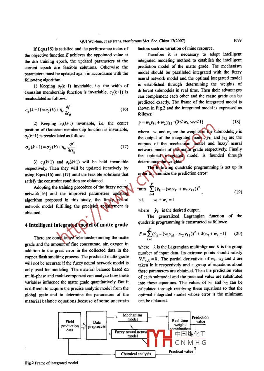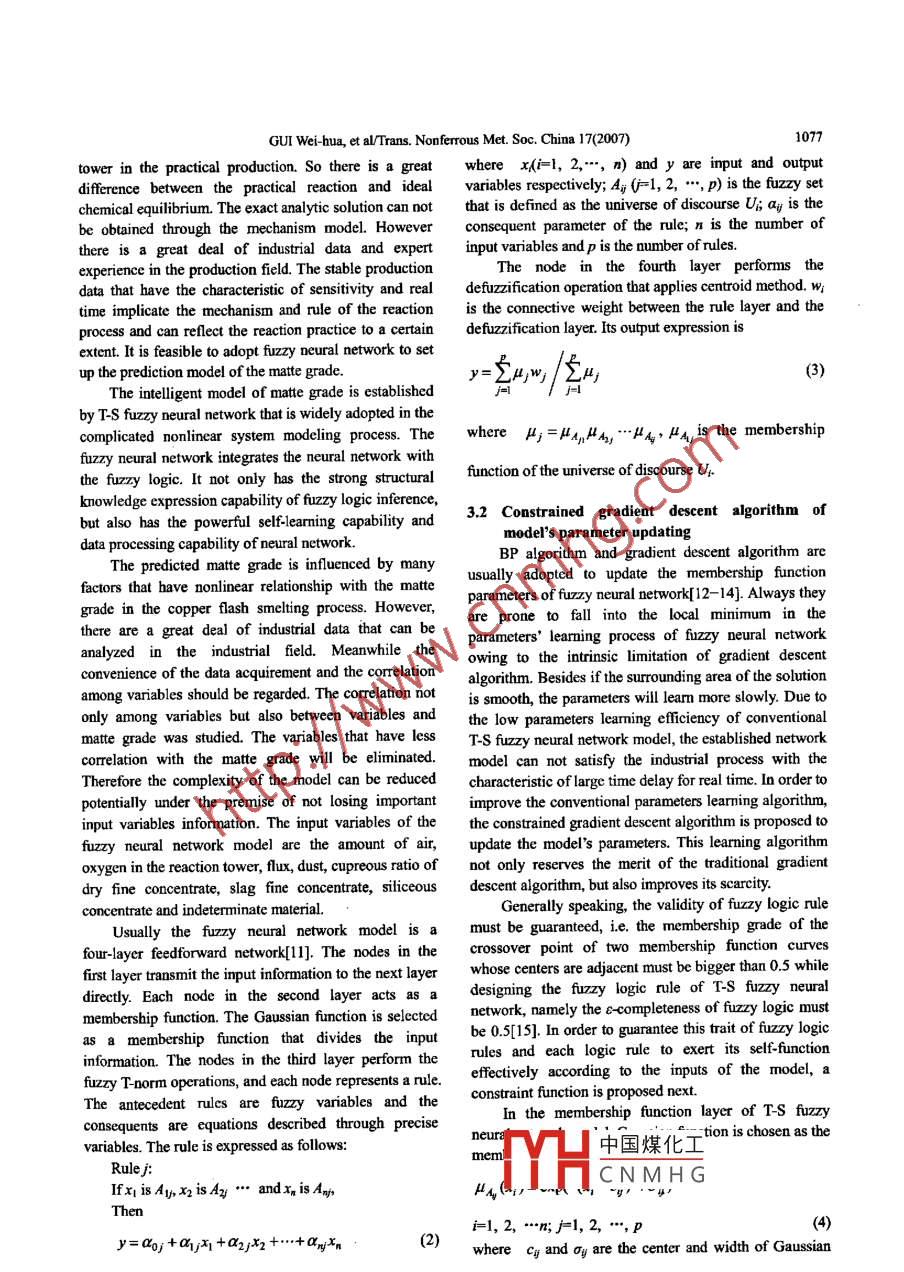Available online at www.sciencedirect.comTransactions of●cIENCE@oineor.Nonferrous M etals罵RSociety of ChinaScienceTrans. Noferrous Met. Soc. China 17(2007) 1075-1081Presswww.c5u.du.cn/yxb/Intelligent prediction model of matte grade in copper flash smelting processGUI Wei-hua(桂衛(wèi)華), WANG Ling-yum(王凌云動), YANG Chun-bua(陽春華),XIE Yong-fang(謝永芳), PENG Xiao-bo(彭曉波)School of Information Science and Engineering, Cenral South University, Changsha 410083, ChinaReceived 26 December 2006; accepted 28 June 2007Abstract: Due to the importance of detecting the matte grade in the copper flash smelting proces the mcchanism model wasestablished according to the multiphase and multi-component mathematic model. Meanwhile this procedure was a complicatedproduen process with caracteristis of large tine delay, Doninarity and so on. A fuzy neural network model was set up througha great deal of production data. Besides a novel constrained gradientdescent: algorithm used to update the parameters was putforward to irnprove the parameters learning eficiency. Ultimately the self-adaptive combination technology was adopted toparaleled integrate two models in order to obtain the prediction model of the matte grade. Indutial data validation shows that theitelligently integrated model is more precise than a single model. It can not only predict the matte grade exactly but also provideoptinal control of the copper flash snelting process with potent guidance.Key words: copper flash smeling process; matte grade; multi phase and multi-gradient descent algoritinHowever, the matte grade is detected later more than 1 h1 Introductionwhen the copper flash smelting process is finished, so itcan not supervise the production manipulation in time.The copper flash smeling process is one of theConsequently it is very signifcant to predict the mattecomplicated pyomeallurgical processes. A lot of fruitfulgrade online for stabilizing the copper fash smeltingresearches have been done for the online mechanismproduction and improving the product quality. WAN etmodel of the copper flash smelting process. Not only theal[5] established the model of the flash smeling fumnacematte grade and distribution of acessory element can bebased on the neural network and adopted it to predict thepredicted[1], but also the online control is realized fortechnological index and yield. WAN et a[6] also set upthe industry{2-3]. But this model is established on thethe dynamic quality model of the nickel flash smeltingrigorous theory of malallurgical physical chemistry. Itprocess by adopting Takagi-Sugeno fuzzy model. Also itsthe practical production there are lots of uncertain factorsstructure and parameter identification were discussed.such as many variations of mineral resources and greatBut these two approaches are not guided according to thefluctuation of the industrial status, so the practicalmechanism of reaction process then the predictedproduction process deviates from the applicabletechnological index will be not precise.condition of the mechanism model. This model can notThe idea of itelligent integrated modeling is uniquesatisfy the requirement of industrial productionwhen it is adopted to deal with the information ofcompletely.complex process that is characterized by intricate intemalFurthermore thnatte grade is one of themechanism such as nonlinearity, uncertainty and largecomprehensive indexes in tbe copper flash smeltingime dclay. Industrial data can be used for systemprocess when the amount of the treated material isideitification and neural network modeling. Theinvariable in the copper flash smelting furmace. Theexperience knowledge can also be taken as the basis ofstable matte grade is important to the smclting,expe中國煤化Ideling, In adtion,converting and the production of suifuric acid[4].the cndustrial process is1H.CNMHGs。yo、wioaFoundation item: Proijext(60634020) supported by the National Natural Science FounBasie Research and Devclopment Program of ChinaCorrespoadiag uthor: WANG Ling youn; Tel: +86-731-8830394; E-mail: susawlinghotrail.com1076GUI Wei-hua, et al/Trans. Nonferous Met. Soc. China 17(2007)the premise of the mechanism modeling. Therefore thesematte grade when tbe equilibrium model reaches balancediverse information provide convenience for thein the copper flash smelting process.integration of different modeling methods[7- 10].If the temperature, pressure and the amount ofIa this study the tmatte grade of the copper flashsubstance of each element are given in the sealed system,smelting process was predicted. Firstly the mechanismthe equilibrium state of this system will be determined.model based on multiphase and multi-component modelThe key point of equilibrium constant method is that allwas discussed; secondly a fuzzy neural network modelthe chemistry reaction reaches balance at the same timwas set up by production data and rules in order towhen the system reaches balance. The differentovercome the nonlinear dymamic characteristic in thecomponents in each phase are associated with a group ofprocess. Due to the low parameter learming efficiency, acomplex united equations through equilibrium constant.constrained gradient descent algorithm of the parameterThe amount of substance of each component in theleaming was proposed in the fuzzy neural network.equilibrium system can be obtained through solving theunited equations and this is the basic idea of equilibriumFinally the self-adaptive combination technology waadopted to paralleled integrate the two models in order toconstant method. There are Goto method, reaction coursemethod and so on according to the different concreteobtain the prediction model of the matte grade.disposing methods. All the equilibrium constant methods2 Mechanism of matte grade based onare developed based on Brinkley principle. The detailedintroduction of the general principle for equilibriummulti-phase and multi-component modelconstant method can be seen in Ref