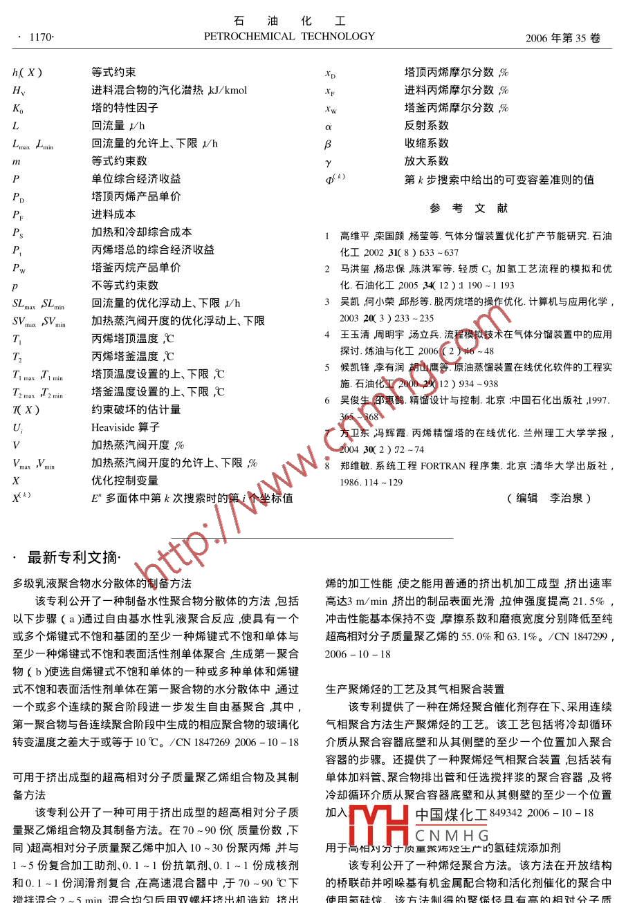 石油化工1166PETROCHEMICAL TECHNOLOGY2006年第35卷第12期工業(yè)技術(shù)丙烯塔在線優(yōu)化策略及應(yīng)用張惠良羅雄麟鱗張春良2尚德寬2陳志1.中國石油大敩北京)自動化研究所北京1022492.中國石油錦西石化分公司遼寧葫蘆島125001)[摘要]針對錦西石化分公司3ka氣體分餾裝置的丙烯塔建立了基于丙烯塔單位綜合經(jīng)濟收益最大化的在線優(yōu)化模型及與魯棒多變量控制器 RMPCT〕的接口。改進可變?nèi)莶罘ㄖ蟹糯笙禂?shù)與收縮系數(shù)的取法提高了尋優(yōu)速度,可滿足在線優(yōu)化對尋優(yōu)速度的要求。現(xiàn)場應(yīng)用的結(jié)果表明在線優(yōu)化的尋優(yōu)速度從8min次提高到2min/次以上丙烯塔操作平穩(wěn)塔頂丙烯的摩爾分數(shù)從99.9%降至∞9.6%~99.8%塔釜丙烷的摩爾分數(shù)從∞%~93%増至9.4%~99.6%。在線優(yōu)化提高了丙烯收率降低了能耗。[關(guān)鍵詞]在線優(yōu)化丙烯精餾塔河變?nèi)莶罘怏w分餾[文章編號]1000-81442006)2-1166-05[中圖分類號]TQ018[文獻標識碼]AOnline Optimization for Propylene Rectification TowerZhang Huiliang luo Xionglin' Zhang Chunliang shang Dekuan Chen Zhi(1. Research Institute of Automation niversity of Petroleum Beijing 102249 c hina2. Jinxi Petroleum and Chemicals Co. Petro China Company Limted Huludao Liaoning 125001 ChinaAbstract For optimizing operation of propylene rectification tower in a 300 kt/a liquefiedhydrocarbon separation installation software consisting of online process optimization model and itsinterface with advanced controller( RMPCt)was developed. The online optimization calculation isaccelerated by improving magnifying and contracting coefficients of flexible tolerance method. Theoptimization running time decreases from 8 to less than 2 minutes per time. By online optimizationoperation stability of propylene rectification tower is improved. Mole fraction of propylene in topproducts lowers only from 99. 9%to 99. 6%0-99 8% but mole fraction of propane in bottom productsrises from 90%-93% to 99. 4%0-99 6%. Yield of propylene increases and energy consumption ofpropylene rectification tower is reducedKeywords online optimization propylene rectification tower flexible tolerance method gasfractionation精餾是能耗最大的化工單元操作之一特別是控制公司都相繼推出了各自的在線優(yōu)化軟件而我在石油煉制和某些化工企業(yè)中精餾幾乎消耗了主國在該領(lǐng)域的研究和軟件開發(fā)與世界先進水平還存要的能量。實施過程優(yōu)化是當前提高生產(chǎn)效率、在很大的差距降低能耗最重要的手段之一。目前我國對裝置或單中國石油錦西石化分公司300kta氣體分餾裝元的操作優(yōu)化主要是利用流程模擬軟件( Aspen置為5塔結(jié)構(gòu)脫丙烷塔、脫乙烷塔、丙烯塔、輕CPlus和PROⅡ等)建立流程模型根據(jù)不同的工況塔和重C4塔)原料是脫硫后的液化烴、重油催化條件優(yōu)化操作方案21。為提高裝置的經(jīng)濟效益,裂代中國煤化工來的液化烴。丙烯塔在實際操作過程中要求隨產(chǎn)品價格、工況等變化在是氣CNMHG受原料來源及脫丙烷線做出調(diào)整。在線優(yōu)化技術(shù)能根據(jù)工況的變化在線塔與脫乙烷塔處理能力的影響丙烯塔進料量范圍調(diào)節(jié)生產(chǎn)過程的操作點使裝置達到優(yōu)化平穩(wěn)操作。[收稿日期]2006-07-12[修改稿日期]2006-08-18。應(yīng)用在線優(yōu)化技術(shù)可使煉油、化工企業(yè)的經(jīng)濟效益[作者簡介]張惠良1963-)男浙江省龍游市人博士后電話提高3%方搦國外一些著名的化工過程模擬或010-8973306電郵ahig.comn第12期張惠良等.丙烯塔在線優(yōu)化策略及應(yīng)用1167較寬(10.0~21.5t/h),進料組分的波動也較大為確保丙烯產(chǎn)品合格(聚合級的丙烯摩爾分數(shù)大于99.6%)往往以降低丙烯收率和增加能耗為代價。實際生產(chǎn)中產(chǎn)品丙烯的摩爾分數(shù)在99%以上丙式1)中右邊第一項為丙烯產(chǎn)品的單位經(jīng)濟收益烷的摩爾分數(shù)在90%~93%。針對丙烯塔的情況第二項為丙烯流失的經(jīng)濟損失第三項為能耗成本采用先進控制實施在線優(yōu)化在保證產(chǎn)品丙烯合格第四項為進料成本。的前提下降低丙烯純度的富裕量提高丙烯收率、由式1)可見對于給定的進料量和進料組分降低能耗從而達到更好的經(jīng)濟效益??蛇x用丙烯塔頂餾岀物中丙烯摩爾分數(shù)(xυ)和丙本工作結(jié)合丙烯塔優(yōu)化與先進控制系統(tǒng)的開發(fā)烯塔釜采出物中丙烯摩爾分數(shù)(xw)作為優(yōu)化控制設(shè)計建立了丙烯塔的優(yōu)化模型和優(yōu)化求解方法建變量。但在過程控制中A和xw由調(diào)節(jié)回流量立了優(yōu)化層與先進控制的連接方法L)和加熱蒸汽閥開度(V)進行控制,為了使優(yōu)化結(jié)果能通過魯棒多變量控制器( RMPCT)實施選取1優(yōu)化模型與約束條件L和ⅴ為丙烯塔優(yōu)化控制變量。1.1丙烯塔的流程丙烯塔的數(shù)茡模型由物料衡算方程、相平衡方程、丙烯塔的流程見圖1。丙烯塔由Ⅰ和Ⅱ兩部分歸一化方程和能量衡算方程(MESH方程組)組成。組成每部分的實際塔板數(shù)為10塊。來自脫乙烷這是基于理論板概念的平衡級模型緞假設(shè)離開任一級塔釜的液相物流進入丙烯塔I的第35塊塔板丙烯的兩相物流處于相平衡狀態(tài)。通過聯(lián)立求解MESH塔塔釜液相物流丙烷)經(jīng)冷卻器冷卻至40℃后采方程組得到各理論板的溫度、組成和流量分布。出丙烯塔塔頂氣相物流(丙烯)經(jīng)冷凝器