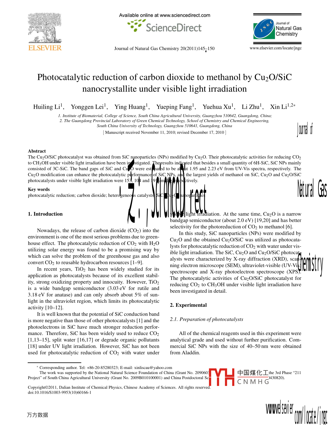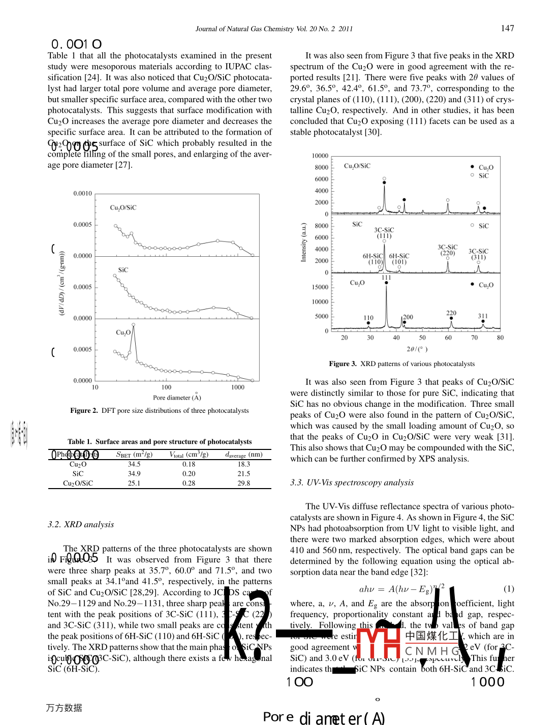 Available online at www.sciencedirect.com| Joumal ofScienceDirect7I Natural GasChemistryEL SEVIERJournal of Natural Gas Chemistry 20(201 1)145-150www.elsevier.com/locate/jngcPhotocatalytic reduction of carbon dioxide to methanol by Cu2O/SiCnanocrystallite under visible light irradiationHuiling Lil,Yonggen Leil,Ying Huang',Yueping Fang',YuehuaXu', Li Zhu',XinLil2*I. Institute of Biomaterial, College of Science, South China Agricutural University, Guangzhou 510642, Guangdong, China;2. The Guangdong Provincial Laboratory of Green Chemical Teclnology, School of Chemistry and Chemical Engineering,South China University of Technology, Guangzhou 51064 I, Guangdong, Chin[ Manuscript reeved November 11, 2010; revised December 17. 2010 ]JomdAbstractThe Cu2O/SiC photocatalyst was obtained from SiC nanoparticles (NPs) modified by Cu2O. Their photocatalytic activities for reducing CO2to CH3OH under visible light irradiation have been int stigated. Thepresults indicated that besides a small quantity of 6H-SiC, SiC NPs mainlyconsisted of 3C-SiC. The band gaps of SiC and Cu2O were estpnated to be alht 1.95 and 2.23 eV from UV-Vis spectra, respectively. TheCu2O modification can enhance the photocatalytic pl rformanceof SiC NPs, and the largest yields of methanol on SiC, Cu2O and Cu2O/SiCphotocatalysts under visible light iradiation were 153, 104 anddiationwere 152 10andlImtively.Key wordsphotocatalytic reduction; carbon dioxide; heterogeneo s catalysts1. IntroductionV| tbttlingnttaliation. At the same time, Cu2O is a nrrowbandgap semiconductor (about 2.0 eV) [19,20] and has betterNowadays, the release of carbon dioxide (CO2) into theselectivity for the photoreduction of CO2 to methanol [6].In this study, SiC nanoparticles (NPs) were modified byenvironment is one of the most serious problems due to green-Cu2O and the obtained Cu2O/SiC was utilized as photocathouse effect. The photocatalytic reduction of CO2 with H2Olysts for photocatalytic reduction of CO2 with water under vis-utilizing solar energy was found to be a promising way byible light iradiation. The SiC, Cu2O and Cu2O/SiC photocapwhich can solve the problem of the greenhouse gas and alsoalysts were characterized by X-ray diffraction (XRD), scaconvert CO2 to reusable hydrocarbon resources [1- -9].In recent years, TiO2 has been widely studied for itsning electron microscope (SEM), ultraviolet-visible (UV-Viapplication as photocatalysts because of its excellent stabil-spectroscope and X-ray photoelectron spectroscopeity, strong oxidizing property and innocuity. However, TiO2The photocatalytic activities of Cu2O/SiC photocatalyst foris a wide bandgap semiconductor (3.03eV for rutile andreducing CO2 to CH3OH under visible light irradiation have3.18eV for anatase) and can only absorb about 5% of sun-been investigated in detail.light in the ultraviolet region, which limits its photocatalytic2. Experimentalactivity [10-12].is more negative than those of other photocatalysts [1] and the2.1. Preparation of photocatalystsphotoelectrons in SiC have much stronger reduction perfor-mance. Therefore, SiC has been widely used to reduce CO2All of the chemical reagents used in this experiment were[1,13-15], split water [16,17] or degrade organic pollutantsanalytical grade and used without further purification. Com-. [18] under UV light irradiation. However, SiC has not beenmercial SiC NPs with the size of 40- -50 nm were obtainedused for photocatalytic reduction of CO2 with water underfrom Aladdin.* Corresponding author. Tel: +86-20-85280323; E-mail: xinliscau @ yahoo.comThe work was supported by the National Natural Science Foundation of China (Grant No. 209060中國煤化工the 3rd Phase“211.Poject" of South China Agricultural University (Grant No. 2009B010100001) and China Postdoctoral ScYHCNMHG430820).CopyrightO201 1, Dalian Institute of Chemical P, Chinese Academy of Sciences.All rights reserved.doi: 10.1016/S 10039953( 10)60166-1146Huiling Li et al./ Jourmal of Natural Gas Chemistry Vol. 20 No.220110The synthesis of Cu2O was performed according to themethod reported by Wang et al. [21]. In a typical prepara-continuously bubbled through the above solution in the reac-gn process, CuSO4.5H2O (3.3 g) was dissolved in 400 mLtor during the whole iradiation. The radiation time was5h. Adeionized water, and 20 mL NaOH aqueous solution (1.5 M)needle-type probe was inserted into the solution in the reactorwas added under vigorous stirring. After stirring for 15 min,to withdraw a small amount of liquid sampleat 1 h, 2h, 2.5h,1.5 mL N2H4:H2O aqueous solution (13.7 M) was added3h, 3.5h, 4h, 4.5 h and 5 h, respectively. The concentration6opwise into the blue Cu(OH)2 colloidal solution with con-of methanol in the samples was analyzed using a GC9560 gasstant stiring. After the blue precipitates were completely re-chromatograph equipped with a flame ionization detector andduced by N2H4H2O, they turned into red. Then the red pre-a stainless steel packed column (Porapak-Q, 2 mmx3 m).cipitates were filtered, washed with distilled water for severalAnes, and finally dried in a vacum oven at 60 °C for 3 h. .3. Results and discussionThe preparation of Cu2O/SiC photocatalysts was similarto that of Cu2O. SiC NPs (3 g) and CuSO4.5H2O (0.52g)3.1. Surface area and pore structure analyseswere dispersed in 400 mL deionized water, then precipitated好20 mL 1.5 M NaOH solution and reduced by N2H4:H2O.I he nitrqgen. adsorption-desorption isotherms of threeThe obtained samples世tehin vduoven afor3h.8-m. m06儆的妒弋卞卻一0^下嬸=to the Bet lclasAfilcation |24]. VAnd each Isothelm'showedisohern saccordingCharacterizationa distinct hysteresis loop, which is associated with the capil-lary condensation taking place in mesopores, indicating thatThe specific surface area, pore volume, and average poreall photocatalysts are mesoporous [25,26]. .Gameter of the photocatalysts were measured by nitrogen ad-sorption at the liquid nitrogen temperature of 77 K with thehelp of an ASAP 2010 volumet
