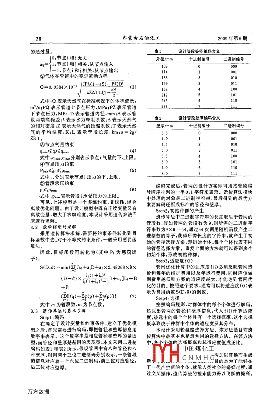2009年第6期內(nèi)蒙古石油化工天然氣集輸管網(wǎng)優(yōu)化設(shè)計(jì)方法研究李征(遼河油田公司特種油開發(fā)公司,遼寧盤錦124000摘要:氣田地面梟輸管網(wǎng)工程是氣田地面工程的主體工程,也是一個(gè)投資巨大、內(nèi)容復(fù)雜的親統(tǒng)。氣田地面集輪菅網(wǎng)的優(yōu)化,即明確氣井與集氣站的最佳歸屬關(guān)來、最優(yōu)網(wǎng)絡(luò)布局以及最優(yōu)營徑組合。在調(diào)研國內(nèi)外大量文獻(xiàn)的基礎(chǔ)上,根據(jù)管道經(jīng)濟(jì)性和結(jié)構(gòu)可靠性原則,建立集輸管網(wǎng)優(yōu)化數(shù)學(xué)模型,采用分級(jí)優(yōu)化的方法及遺傳算法,對(duì)梟輸管網(wǎng)優(yōu)化數(shù)學(xué)模型進(jìn)行求解,最終解決氣田地面集輸管網(wǎng)無統(tǒng)的整體優(yōu)化問題關(guān)鍵詞:集輸管網(wǎng);優(yōu)化設(shè)計(jì);遺傳算法;程序1天然氣集輸管網(wǎng)優(yōu)化模型的建立一個(gè)節(jié)點(diǎn)。當(dāng)所有站點(diǎn)都包括在內(nèi)時(shí),程序便結(jié)束運(yùn)目前國內(nèi)廣泛采用的是多級(jí)集輸流程,所采用行,否則繼續(xù)循環(huán)的集輸系統(tǒng)管網(wǎng)主要有放射狀(或稱星形)樹枝狀3參數(shù)的優(yōu)化—最優(yōu)管徑組合的確定和環(huán)狀,以及這三種方式的組合形式??紤]到實(shí)際使當(dāng)初始最優(yōu)網(wǎng)絡(luò)布局確定之后,就需要確定使用的情況和研充方便,本設(shè)計(jì)研究的氣田集輸管網(wǎng)管網(wǎng)投資和操作維護(hù)費(fèi)用最小的最優(yōu)管徑組合,即是一種星形管網(wǎng)與枝狀管網(wǎng)相結(jié)合的形式,即各氣管網(wǎng)的參數(shù)優(yōu)化設(shè)計(jì)。本設(shè)計(jì)針對(duì)輸氣管網(wǎng)結(jié)構(gòu)參井與所屬集氣站以星形連接,集氣站之間以集氣干數(shù)設(shè)計(jì)問題提出了優(yōu)化設(shè)計(jì)模型,并討論了含連續(xù)線連接,集氣干線將各集氣站與集氣總站呈枝狀連變量和離散變量優(yōu)化設(shè)計(jì)的求解方法。接起來3.1數(shù)學(xué)模型2數(shù)學(xué)模型的求解3.1.1目標(biāo)函數(shù)集輸管網(wǎng)的最優(yōu)布局是在集氣站的優(yōu)化站位確采用管網(wǎng)系統(tǒng)建設(shè)時(shí)的一次性投資和在使用年定以后,對(duì)各個(gè)集氣站與總站的連接方式進(jìn)行優(yōu)化限內(nèi)所支付的總經(jīng)營費(fèi)用之和為目標(biāo)。其中一次性研究在暫不考慮某些因素影響的條件下,要使得整投資包括管網(wǎng)建設(shè)費(fèi)用(這里不包括壓縮機(jī)建設(shè)的個(gè)網(wǎng)絡(luò)鋪設(shè)的可行管線總長為最短對(duì)于這類問題,相關(guān)費(fèi)用),同時(shí)考慮投資的時(shí)間性,引入“折算費(fèi)可采用圖論的方法進(jìn)行系統(tǒng)分析和確定)。用”的概念,因此,目標(biāo)函數(shù)可表示為本設(shè)計(jì)采用 Prime算法23確定集輸管網(wǎng)最優(yōu)s(D,8)=2(a+a1D+aG)L1+(1+i0)y-1(1) Prime算法如下L(1)假設(shè)網(wǎng)絡(luò)圖的固定節(jié)點(diǎn)為:A={A1,A2,A3式中:S表示輸氣管網(wǎng)的年折合費(fèi)用,萬元/aAn},再假定兩集合B1和B2,則 Prime算法的具體步a表示管道勘察、設(shè)計(jì)投資費(fèi)用等,萬元/km;a1表驟如下:示管道施工投資系數(shù),與防腐絕緣層、挖溝回填等有Stepl:B1+{A1}B2+{A2,A3,…Aa}。關(guān),萬元/(mm·km);a2表示購買及運(yùn)輸管道投step2:在B1中的諸節(jié)點(diǎn)與B2中的諸節(jié)點(diǎn)有邊系數(shù),萬元/t;D表示管道外徑,mmG表示單位管相連的所有邊中,找出最短距離的邊。假設(shè)B1中A1道長度的重量,它與管道管徑D、壁厚等有關(guān),t/與B2中A兩點(diǎn)連線最短,則連接A1與A1作為解的kmL表示管道長度,km;y表示管道使用年限,an部分枝,并且:B1+B1U{A}B2B2-{A表示管道數(shù);io表示內(nèi)部收益率,一般為0.12~0.Step3:若B2是空集,結(jié)束搜索,否則,回到15a-;co表示單位管長管道的年經(jīng)營費(fèi)用系數(shù)元/km·a)。(2) Prime算法的程序設(shè)計(jì)說明:3.12約束條件確定集輸管網(wǎng)最優(yōu)布局與最小生成樹問題相①節(jié)點(diǎn)流量平衡方程似,只要給出集氣站的位置,算出集氣站之間的距離,就可以求出最小生成樹,從而也就確定了最小布∑aQ+q=0局。各個(gè)集氣站之間的距離用數(shù)組來表示,采用三個(gè)式中,,=12,…表示節(jié)點(diǎn)編號(hào);N表示節(jié)點(diǎn)指針來分別記錄距離值、最小生成樹的本節(jié)點(diǎn)和下總數(shù)中國煤化工節(jié)點(diǎn)之間元件CNMHG收稿日期:2009-01-10作者簡介:李征(1982一),助理工租師,大學(xué)學(xué)士1200年畢業(yè)于西南石油大學(xué)并獲學(xué)士學(xué)位,主要從事油氣田地面建設(shè)管星工作20內(nèi)蒙古石油化工2009年第6期的通過量設(shè)計(jì)管段管徑編碼含義f0,節(jié)點(diǎn)i和j無關(guān)外徑/m十進(jìn)制編號(hào)二進(jìn)制編號(hào)a;=11,節(jié)點(diǎn)i和相關(guān),從節(jié)點(diǎn)輸入1,節(jié)點(diǎn)i和j相關(guān),從節(jié)點(diǎn)輸出②氣體在管道中的穩(wěn)定流動(dòng)方程13320】0Q=0.038×10P-s)=D√△TL1-2式中:Q表示天然氣在標(biāo)準(zhǔn)狀況下的體積流量,245m3/s;PQ表示管道上節(jié)點(diǎn)壓力,MPa;PZ表示管道下節(jié)點(diǎn)壓力,MPa;D表示管道內(nèi)徑,mm;S表示管段兩端高程差;λ表示水力摩阻系數(shù);△表示天然氣設(shè)計(jì)管段壁厚