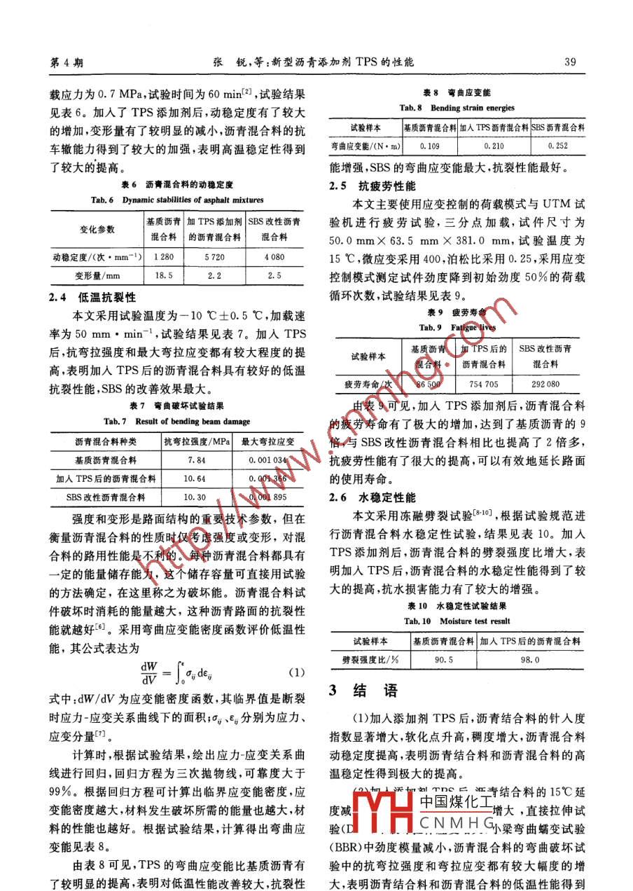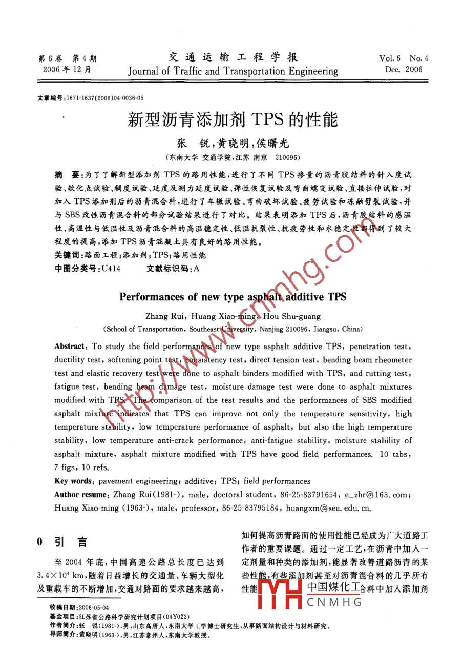 第6卷第4期交通運輸工程學報Vol.6 No. 42006年12月Journal of Traffic and Transportation EngineeringDec. 2006文章編號:1671-1637(2006)04-0036-05新型瀝青添加劑TPS的性能張銳,黃曉明,侯曙光(東南大學交通學院,江蘇南京210096)摘要:為了了解新型添加劑TPS的路用性能,進行了不同TPS摻量的瀝青膠結(jié)料的針入度試驗、軟化點試驗、稠度試驗延度及測力延度試驗、彈性恢復(fù)試驗及彎曲蠕變試驗、直接拉伸試驗,對加入TPS添加劑后的瀝青混合料,進行了車轍試驗、彎曲破壞試驗、疲勞試驗和凍融劈裂試驗,并與SBS改性瀝青混合料的部分試驗結(jié)果進行了對比。結(jié)果表明添加TPS后,瀝青膠結(jié)料的感溫性、高溫性與低溫性及瀝青混合料的高溫穩(wěn)定性、低溫抗裂性、抗疲勞性和水穩(wěn)定性都得到了較大程度的提高,添加TPS瀝青混凝土具有良好的路用性能。關(guān)鍵詞:路面工程;添加劑;TPS;路用性能中圖分類號:U414文獻標識碼:APerformances of new type asphalt additive TPSZhang Rui, Huang Xiao ming, Hou Shu-guang(School of Transportation, Southeast University, Nanjing 210096, Jiangsu, China)Abstract: To study the field performances of new type asphalt additive TPS, penetration test,ductility test, softening point test, consistency test, direct tension test, bending beam rheometertest and elastic recovery test were done to asphalt binders modified with TPS, and rutting test,fatigue test, bending beam damage test, moisture damage test were done to asphalt mixturesmodified with TPS. The comparison of the test results and the performances of SBS modifiedasphalt mixture indicates that TPS can improve not only the temperature sensitivity, hightemperature stability, low temperature performance of asphalt, but also the high temperaturestability, low temperature anti-crack performance, anti-fatigue stability, moisture stability ofasphalt mixture, asphalt mixture modified with TPS have good field performances. 10 tabs,7 figs, 10 refs.Key words: pavement engineering; additive; TPS; field performancesAuthor resume: Zhang Rui(1981-), male, doctoral student, 86-25-83791654, e_ .zhr@ 163. com;Huang Xiao ming (1963-), male, professor, 86-25-83795184, huangxm@ seu. edu. cn.如何提高瀝青路面的使用性能已經(jīng)成為廣大道路工0引言作者的重要課題。通過-定工藝,在瀝青中加人一至2004年底,中國高速公路總長度已達到定劑量和種類的添加劑,能顯著改善道路瀝青的某3.4X10* km,隨著日益增長的交通量、車輛大型化些性能,有些添加劑甚至對瀝青混合料的幾乎所有及重載車的不斷增加,交通對路面的要求越來越高,性能中國煤化工合料中加入添加劑收稿8期:2006-05-04^TYHCNMHG基金項目:江蘇省公路科學研究計劃項目(04Y022)作者簡介:張銳(1981-),男 ,山東高唐人,東南大學工學博士研究生,從事路面結(jié)構(gòu)設(shè)計與材料研究。導(dǎo)師簡介:黃曉明(1963-),男,江蘇常州人,東南大學教授。第4期張銳,等:新型 瀝青添加劑TPS的性能對提高瀝青路面的使用性能,延長路面的使用壽命,表1軟化點具有十分重要的意義。TPS (全稱TAFPACK-Su-Tab. 1 Softening pointsper)是一種專為排水性瀝青路面而生產(chǎn)的瀝青改摻量/% 1512 9_63良添加劑,以熱塑性橡膠為主要成分,再配以粘結(jié)性軟化點/心>80.0>80.0 78.950.849.0 48.4樹脂和增塑劑等其他成分,用機械攪拌混合方式能人TPS添加劑后軟化點也得到了提高,并隨著改性使普通瀝青改良成為排水性瀝青路面用的高粘度粘劑摻量的增加而升高,摻量較高時軟化點大于結(jié)劑。本文主要通過瀝青膠結(jié)料性能試驗和瀝青混80.0C,說明改性后瀝青具有良好的高溫性能。合料性能試驗對TPS路用性能進行研究。1.3 15與5 C延度及測力延度延度及測力延度[3]試驗結(jié)果見圖2、3。對于1加入TPS的瀝青膠結(jié)料性能15C延度,摻入TPS后,延度隨著摻量的增加而減本次試驗所采用的瀝青為70#基質(zhì)瀝青。TPS小,但是在拉伸過程中可以明顯感覺到拉力變大;對采用的拌和方法為手動攪拌,先少量加入瀝青,比所于5C延度,延度增加比較明顯,測力延度試驗中所定量的改性劑量稍多- .點,加熱攪拌,直到完全熔測定的功也隨著摻量的增加而增加;低溫延度與低化,然后再繼續(xù)添加少量瀝青,繼續(xù)攪拌,這樣逐漸溫開裂性能關(guān)系密切,不僅延度增大,而且拉力變邊攪拌邊把所定量的瀝青加完??紤]到TPS拌和大,抵抗低溫開裂的能力得到增強。過程較長,改性瀝青制作過程中基質(zhì)瀝青會有一定程度的老化,因此,為了避免這種影響,按改性瀝青E 100的制作工藝將基質(zhì)瀝青采用相同的方法、相同的時間進行模擬加工,并與改性瀝青進行對比。本文選03691215定5個摻量:3%.6%、9%、12%及15%與基質(zhì)瀝青TPS摻量/%TPS摻量%(以0表示)進行對比試驗。圖2延度變化圖3測定功變化.1.1針入度指標Fig.2 Change of ducility Fig.3 Change of test energy根據(jù)《公路瀝青路面施工技術(shù)規(guī)范》(JTGF40-1.4彈性恢復(fù)性能2004)的規(guī)定,選用5個適宜的溫度(本研究中采用彈性恢復(fù)試驗結(jié)果見表2。加入TPS后,彈性15、20、25、30.35 C)測定針人度指數(shù),并且要求相恢復(fù)性能有了很大提高,當摻量達到一定程度后,彈關(guān)系數(shù)不低于0. 991。根據(jù)文獻[2],針人度及針性恢復(fù)都能達到100% ,表明加入TPS后瀝青膠結(jié)人度指數(shù)的試驗結(jié)果見圖1。料具有良好的自愈性,抗變形能力得到提高。表2彈性恢復(fù)性能Tab.2 Elastic recovery performance0.5摻量/% .112B 40F彈性恢復(fù)能力/% 10010