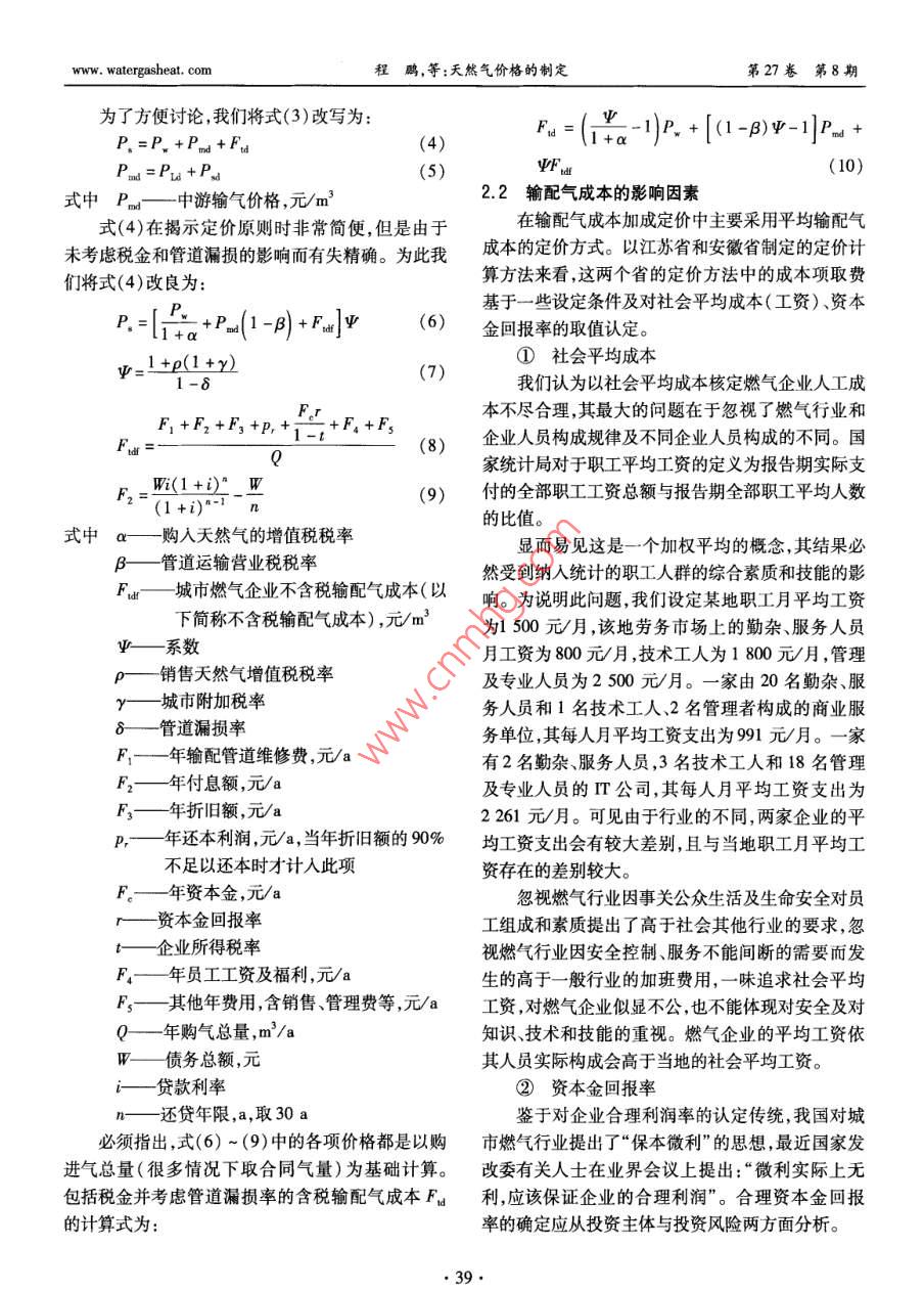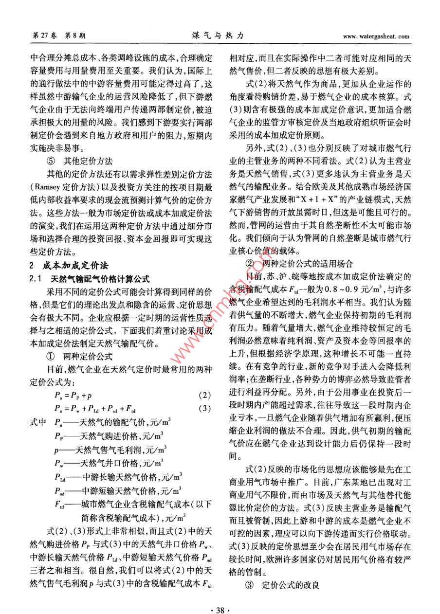第27卷笫8期煤氣與熱力Vol 27 No 82007年8月GAs heat天然氣價(jià)格的制定程鵬,郭艷麗(港華投資有限公司,廣東深圳518008)摘要:介紹了通常采用的天然氣定價(jià)方法,根據(jù)我國(guó)的實(shí)際情況探討了成本加成定價(jià)方法的運(yùn)用。探討了基于成本加成定價(jià)公式的兩種表述方法適用的場(chǎng)合,分析了輸配氣成本的影響因素。提出了基于行為的成本會(huì)計(jì)與容量占用相結(jié)合的改進(jìn)的細(xì)分市場(chǎng)的天然氣定價(jià)方法,給出了天然氣價(jià)格聯(lián)動(dòng)的一般公式。關(guān)鍵詞:天然氣;定價(jià);成本加成;細(xì)分市場(chǎng);聯(lián)動(dòng)機(jī)制中圖分類號(hào):TU996文獻(xiàn)標(biāo)識(shí)碼:A文章編號(hào):1000-416(2007)08-0036-06Determination of Natural Gas PriceCHENG Peng, GUO Yan-liGanghua Gas Investment Limited, Shenzhen 518008, China)Abstract: Some commonly used methods for pricing natural gas are introduced, and the applica-tion of the cost-plus pricing system is discussed according to the Chinese practical situation. The occa-sions applicable for two expressions based on the cost-plus pricing formula are also discussed, and thefactors influencing the cost of gas transmission and distribution are analyzed. a segmented market pricingnatural gas method modified by combining the activity-based cost accounting with system capacity alloca-tion is put forward, and the general formula for natural gas cost pass-through mechanism is providedKey words: natural gas; pricing; cost-plus segmented market; pass-through mechanism國(guó)際上對(duì)城市天然氣等公用事業(yè)行業(yè)的放寬和在成本的弱增性以及應(yīng)規(guī)模經(jīng)濟(jì)的要求,無(wú)法或不取消管制雖始于近20年,但這一趨勢(shì)已經(jīng)對(duì)天然氣適宜引入競(jìng)爭(zhēng)而使自然壟斷不可避免,因此天然氣行業(yè)的市場(chǎng)化和競(jìng)爭(zhēng)產(chǎn)生了深遠(yuǎn)影響。我國(guó)在公用產(chǎn)業(yè)鏈的完全市場(chǎng)化不易實(shí)現(xiàn)。目前,較市場(chǎng)化的事業(yè)行業(yè)也放寬了準(zhǔn)人條件和投資限制,并通過(guò)引做法為“X+1+X”模型,即將天然氣作為商品,使上入多種投資主體和資金來(lái)源取得了城市燃?xì)庑袠I(yè)的游天然氣生產(chǎn)和下游的銷售完全市場(chǎng)化,而中游的巨大發(fā)展,但各地城市燃?xì)庑袠I(yè)的定價(jià)和價(jià)格管理輸氣和下游的配氣由于自然壟斷仍然受政府的管水平仍有待提高。定價(jià)是消費(fèi)者、企業(yè)和政府關(guān)注制。西方經(jīng)濟(jì)學(xué)認(rèn)為,對(duì)存在自然壟斷的市場(chǎng)失靈的重要問(wèn)題,而且必然與目前的行業(yè)政策和企業(yè)發(fā)的領(lǐng)域,實(shí)行價(jià)格管制是合理的。英國(guó)為了保證天展水平相關(guān)聯(lián)。研究定價(jià)理論和方法可為定價(jià)實(shí)踐然氣產(chǎn)業(yè)鏈上的最大市場(chǎng)化,在1995年將原高度提供指導(dǎo)思路及操作方法,另外了解并借鑒世界上體化的英國(guó)天然氣公司拆分成兩家,一家主要負(fù)責(zé)其他國(guó)家的做法也有利于我們做好天然氣的定價(jià)工國(guó)際勘探開發(fā)以及輸配和儲(chǔ)存,另一家主營(yíng)零售、服作。本文對(duì)天然氣價(jià)格制定的方法進(jìn)行探討。務(wù)及天然氣貿(mào)易。目前,英國(guó)已經(jīng)沒(méi)有燃?xì)馍唐泛?天然氣定價(jià)方法輸配費(fèi)用捆綁在一起的價(jià)格①市場(chǎng)定價(jià)法②替代能源定價(jià)法由于天然氣中游管道輸送和下游的城市輸配存由于相對(duì)其他可替代能源,天然氣的大規(guī)模應(yīng)watergasheat. com程鵬,等:天然氣價(jià)格的制定第27卷第8期用較晩,市場(chǎng)開拓從置換其他能源市場(chǎng)開始,因此天貼、平均成本定價(jià)、兩部制定價(jià)等方法??紤]在國(guó)際然氣作為商品根據(jù)替代能源定價(jià)就不足為奇了。歐上燃?xì)庑袠I(yè)的使用普遍程度,這里主要討論平均成洲國(guó)家的政府在管制天然氣配氣價(jià)格時(shí)也一定程度本定價(jià)和兩部制定價(jià)兩種方法。上考慮加入配氣價(jià)格后天然氣總價(jià)格與可替代能源目前,我國(guó)城市燃?xì)庑袠I(yè)采用最多的是平均成的市場(chǎng)價(jià)格相當(dāng)。其實(shí),國(guó)家發(fā)改委也在力推這一本定價(jià)方法。在定價(jià)時(shí)將企業(yè)供氣服務(wù)作為整體考思想,在2005年底對(duì)天然氣出廠價(jià)調(diào)整時(shí)指出:我慮,得到對(duì)所有用戶服務(wù)的加權(quán)平均成本。由企業(yè)國(guó)天然氣價(jià)過(guò)低,為原油的30%左右;成熟的市場(chǎng)和政府在保持平均成本不變的前提下,確定各細(xì)分經(jīng)濟(jì)國(guó)家天然氣與原油比價(jià)通常為0.84~1.21。市場(chǎng)的價(jià)格。必須指出的是如何確定各成本組成項(xiàng)由于整個(gè)天然氣產(chǎn)業(yè)鏈并非由同一級(jí)政府管制,這目的費(fèi)率,尤其是各類資金的回報(bào)率與利率,這對(duì)合思想并未被各地定價(jià)部門領(lǐng)會(huì)。理定價(jià)十分必要。認(rèn)識(shí)到自然壟斷行業(yè)企業(yè)所在經(jīng)③最高限價(jià)法營(yíng)地域的運(yùn)作情況缺乏可比性,而一個(gè)企業(yè)自身的認(rèn)識(shí)到自然壟斷的存在并考慮到對(duì)公眾利益的歷史數(shù)據(jù)對(duì)未來(lái)最有預(yù)示性,美國(guó)聯(lián)邦能源監(jiā
