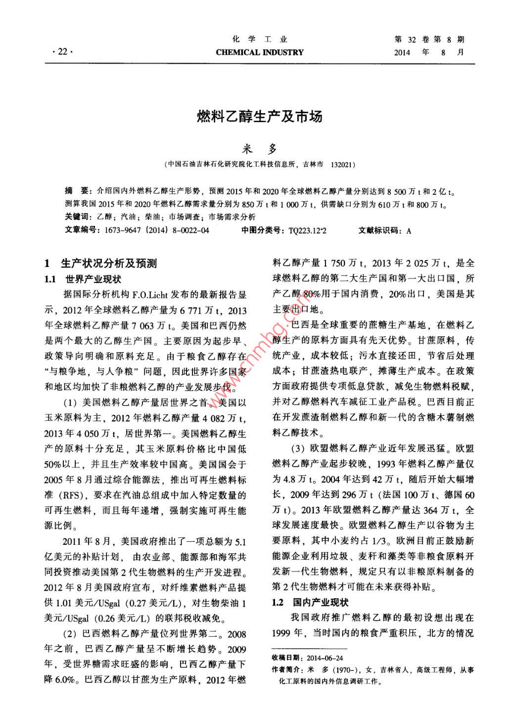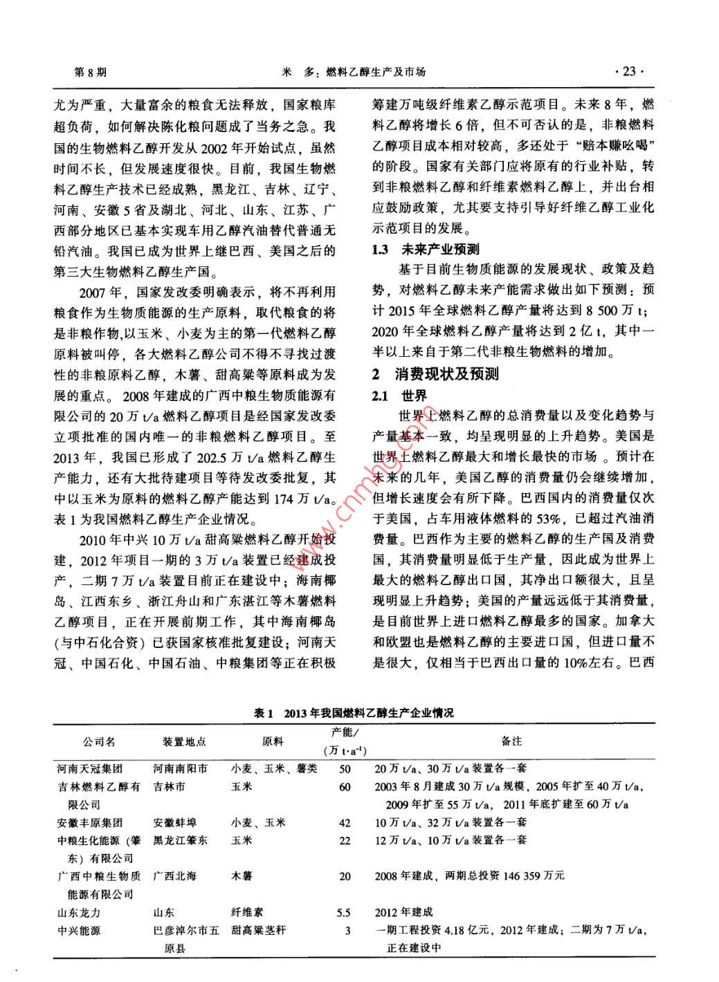 化學(xué)工業(yè)第32卷第8期22 CHEMICAL INDUSTRY2014年8月燃料乙醇生產(chǎn)及市場米多(中國石油吉林石化研究院化工科技信息所,吉林市132021)摘要:介紹國內(nèi)外燃料乙醇生產(chǎn)形勢,預(yù)測2015年和2020年全球燃料乙醇產(chǎn)量分別達到8500萬t和2億t測算我國2015年和2020年燃料乙醇需求量分別為50萬t和1000萬t,供需缺口分別為610萬t和800萬t關(guān)鍵詞:乙醇;汽油;柴油;市場調(diào)查;市場需求分析文章編號:1673-9647(2014)8-0022-04中圖分類號:TQ223.12文獻標識碼:A1生產(chǎn)狀況分析及預(yù)測料乙醇產(chǎn)量1750萬t,2013年2025萬t,是全11世界產(chǎn)業(yè)現(xiàn)狀球燃料乙醇的第二大生產(chǎn)國和第一大出口國,所據(jù)國際分析機構(gòu)F.O.Licht發(fā)布的最新報告顯產(chǎn)乙醇80%用于國內(nèi)消費,20%出口,美國是其示,2012年全球燃料乙醇產(chǎn)量為6771萬t,2013主要出口地。年全球燃料乙醇產(chǎn)量7063萬t。美國和巴西仍然巴西是全球重要的蔗糖生產(chǎn)基地,在燃料乙是兩個最大的乙醇生產(chǎn)國。主要原因為起步早醇生產(chǎn)的原料方面具有先天優(yōu)勢。甘蔗原料,傳政策導(dǎo)向明確和原料充足。由于糧食乙醇存在統(tǒng)產(chǎn)業(yè),成本較低;污水直接還田,節(jié)省后處理“與糧爭地,與人爭糧”問題,因此世界許多國家成本;甘蔗渣熱電聯(lián)產(chǎn),攤薄生產(chǎn)成本。在政策和地區(qū)均加快了非糧燃料乙醇的產(chǎn)業(yè)發(fā)展步伐。方面政府提供專項低息貸款,減免生物燃料稅賦,(1)美國燃料乙醇產(chǎn)量居世界之首。美國以并對乙醇燃料汽車減征工業(yè)產(chǎn)品稅。巴西目前正玉米原料為主,2012年燃料乙醇產(chǎn)量4082萬t,在開發(fā)蔗渣制燃料乙醇和新一代的含糖木薯制燃2013年4050萬t,居世界第一。美國燃料乙醇生料乙醇技術(shù)。產(chǎn)的原料十分充足,其玉米原料價格比中國低(3)歐盟燃料乙醇產(chǎn)業(yè)近年發(fā)展迅猛。歐盟50%以上,并且生產(chǎn)效率較中國高美國國會于燃料乙醇產(chǎn)業(yè)起步較晚,1993年燃料乙醇產(chǎn)量僅2005年8月通過綜合能源法,推出可再生燃料標為4.8萬t。2004年達到42萬t,隨后開始大幅增準(RFS),要求在汽油總組成中加入特定數(shù)量的長,2009年達到296萬t(法國100萬t、德國60可再生燃料,而且每年遞增,強制實施可再生能萬t)。2013年歐盟燃料乙醇產(chǎn)量達364萬t,全源比例。球發(fā)展速度最快。歐盟燃料乙醇生產(chǎn)以谷物為主2011年8月,美國政府推出了一項總額為5.1要原料,其中小麥約占1/3。歐洲目前正鼓勵新億美元的補貼計劃,由農(nóng)業(yè)部、能源部和海軍共能源企業(yè)利用垃圾、麥稈和藻類等非糧食原料開同投資推動美國第2代生物燃料的生產(chǎn)開發(fā)進程。發(fā)新一代生物燃料,規(guī)定只有以非糧原料制備的2012年8月美國政府宣布,對纖維素燃料產(chǎn)品提第2代生物燃料才可能在未來獲得補貼。供1.01美元/USgal(0.27美元/L),對生物柴油11.2國內(nèi)產(chǎn)業(yè)現(xiàn)狀美元/USgal(0.26美元/L)的聯(lián)邦稅收減免。我國政府推廣燃料乙醇的最初設(shè)想出現(xiàn)在(2)巴西燃料乙醇產(chǎn)量位列世界第二。20081999年,當時國內(nèi)的糧食嚴重積壓,北方的情況年之前,巴西乙醇產(chǎn)量呈不斷增長趨勢。2009收稿日期:2014-06-2年,受世界糖需求旺盛的影響,巴西乙醇產(chǎn)量下降6.0%。巴西乙醇以甘蔗為生產(chǎn)原料,2012年燃作者簡:米多(190)女林省人,高級工程師,從事料的國內(nèi)外信息調(diào)研工作。第8期米多:燃料乙醇生產(chǎn)及市場23尤為嚴重,大量富余的糧食無法釋放,國家糧庫籌建萬噸級纖維素乙醇示范項目未來8年,燃超負荷,如何解決陳化糧問題成了當務(wù)之急。我料乙醇將增長6倍,但不可否認的是,非糧燃料國的生物燃料乙醇開發(fā)從2002年開始試點,雖然乙醇項目成本相對較高,多還處于“賠本賺吆喝”時間不長,但發(fā)展速度很快。目前,我國生物燃的階段國家有關(guān)部門應(yīng)將原有的行業(yè)補貼,轉(zhuǎn)料乙醇生產(chǎn)技術(shù)已經(jīng)成熟,黑龍江、吉林、遼寧、到非糧燃料乙醇和纖維素燃料乙醇上,并出臺相河南、安徽5省及湖北、河北、山東、江蘇、廣應(yīng)鼓勵政策,尤其要支持引導(dǎo)好纖維乙醇工業(yè)化西部分地區(qū)已基本實現(xiàn)車用乙醇汽油替代普通無示范項目的發(fā)展。鉛汽油。我國已成為世界上繼巴西、美國之后的13未來產(chǎn)業(yè)預(yù)測第三大生物燃料乙醇生產(chǎn)國?;谀壳吧镔|(zhì)能源的發(fā)展現(xiàn)狀、政策及趨2007年,國家發(fā)改委明確表示,將不再利用勢,對燃料乙醇未來產(chǎn)能需求做出如下預(yù)測:預(yù)糧食作為生物質(zhì)能源的生產(chǎn)原料,取代糧食的將計2015年全球燃料乙醇產(chǎn)量將達到8500萬t;是非糧作物,以玉米、小麥為主的第一代燃料乙醇2020年全球燃料乙醇產(chǎn)量將達到2億t,其中一原料被叫停,各大燃料乙醇公司不得不尋找過渡半以上來自于第二代非糧生物燃料的增加性的非糧原料乙醇,木薯、甜高粱等原料成為發(fā)2消費現(xiàn)狀及預(yù)測展的重點。2008年建成的廣西中糧生物質(zhì)能源有2.1世界限公司的20萬a燃料乙醇項目是經(jīng)國家發(fā)改委世界上燃料乙醇的總消費量以及變化趨勢與立項批準的國內(nèi)唯一的非糧燃料乙醇項目。至產(chǎn)量基本