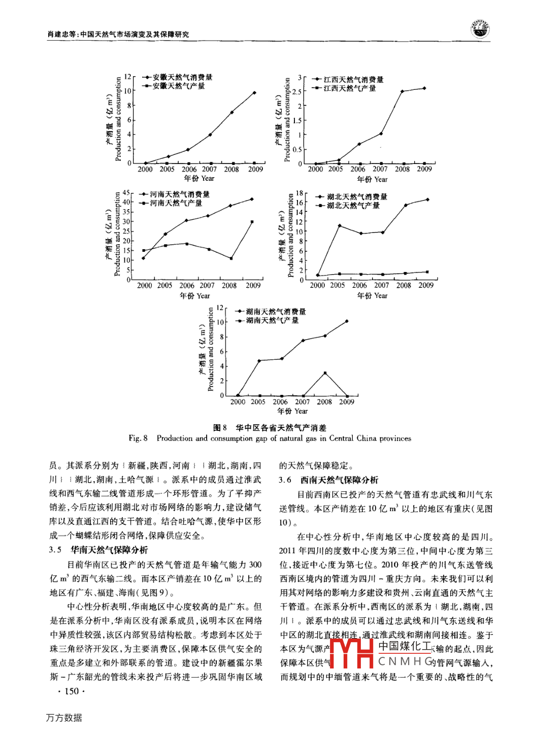 中國人口·資源與環(huán)境2012年第22卷第12期 CHINA POPULATION, RESOURCES AND ENVIRONMENT Vol22No.122012中國天然氣市場演變及其保障研究肖建忠胡超王小林成金華(中國地質(zhì)大學(xué)經(jīng)濟(jì)管理學(xué)院,湖北武漢430074)摘要隨著我國天然氣市場快速發(fā)展,覆蓋全國的天然氣管網(wǎng)初具雛形。針對天然氣供需缺口問題,文章利用社會(huì)網(wǎng)絡(luò)分析方法SNA)分析我國天然氣市場貿(mào)易關(guān)系的經(jīng)驗(yàn)特征和演變規(guī)律。分析結(jié)果表明:管網(wǎng)的建設(shè)推動(dòng)了天然氣市場網(wǎng)絡(luò)的聚集,市場呈現(xiàn)出中西部資源產(chǎn)地和東部消費(fèi)地的中心性特征。我國天然氣市場經(jīng)歷了零散市場向區(qū)域市場乃至全國性大市場的演變,市場關(guān)聯(lián)度從2000年的0.0127上升至2011年的0.1072。我國應(yīng)著手建設(shè)以下管道,使管網(wǎng)布局更趨合理:華北區(qū)的山東建設(shè)和北京、山西內(nèi)蒙直通的管道,修建以山東為終點(diǎn)的大型管線輔之以儲(chǔ)氣庫建設(shè);東北區(qū)的遼寧建設(shè)和黑龍江直通的管道;華東區(qū)建設(shè)新疆-浙江管道;華中區(qū)的湖北建設(shè)儲(chǔ)氣庫和直通江西的管道;華南區(qū)的建設(shè)新疆-廣東管道;西南區(qū)建設(shè)中緬管道;西北區(qū)建設(shè)聯(lián)絡(luò)線完善管道互通關(guān)鍵詞天然氣管道;市場演變;市場保障;社會(huì)網(wǎng)絡(luò)分析中圖分類號(hào)TF8文獻(xiàn)標(biāo)識(shí)碼A文章編號(hào)1002-2104(2012)12-0143-1ldoi:10.3969/ J. issn..1002-2104.2012.12.023管網(wǎng)設(shè)施是市場快速發(fā)展的基礎(chǔ)。近年來我國天然楊建紅劉小麗”等梳理了整個(gè)天然氣行業(yè)現(xiàn)狀和發(fā)展氣管網(wǎng)發(fā)展迅速,已經(jīng)初步形成以西氣東輸一線、西氣東趨勢;張耀光等研究了我國LNG產(chǎn)業(yè)的發(fā)展;蒲明”等輸二線、川氣東送和陜京線系統(tǒng)等管道為骨干,以蘭銀線、介紹了一些我國天然氣管道上取得的進(jìn)展。所有這些表淮武線、冀寧線為聯(lián)絡(luò)線的國家級(jí)天然氣骨干管網(wǎng)。明,綜合考察管網(wǎng)、資源和市場的研究還稍顯薄弱。天然氣商品不同于一般商品,它具有管網(wǎng)依賴性。管本文以2000年以來我國天然氣管網(wǎng)建設(shè)為基礎(chǔ),以網(wǎng)是連接資源與市場的物理紐帶,在一定程度上,天然氣管網(wǎng)輸氣數(shù)據(jù)為對象,采用社會(huì)網(wǎng)絡(luò)分析(SNA)方法研究公司管網(wǎng)觸及之處就是市場開拓之時(shí)。因此,管網(wǎng)系統(tǒng)是我國天然氣市場的演變過程和供應(yīng)保障,并提出管網(wǎng)鋪設(shè)天然氣從源輸送到用戶的最有效方法,對天然氣市場的研的具體方向。究必須結(jié)合管網(wǎng),綜合分析資源供給、市場消費(fèi)與管道建設(shè)的特征。2000年之前,天然氣市場的研究大都是在做1社會(huì)網(wǎng)絡(luò)分析模型資源評(píng)價(jià)時(shí)輔以提及,例如戴金星。2001年湯亞利2社會(huì)網(wǎng)絡(luò)分析(SNA)被廣泛地應(yīng)用于社會(huì)經(jīng)濟(jì)系統(tǒng),從管道的角度開始研究天然氣市場。2002年西氣東輸項(xiàng)諸如市場、產(chǎn)業(yè)、貿(mào)易關(guān)系等都可以視為一種網(wǎng)絡(luò)。網(wǎng)絡(luò)目開工后,國內(nèi)對天然氣市場的研究開始升溫。如徐永分析能夠從整體上把握市場格局與貿(mào)易關(guān)系的演化,目前昌3對西氣東輸項(xiàng)目的天然氣供應(yīng)保障的研究。2004年已發(fā)展出專門的概念體系和測算工具。社會(huì)網(wǎng)絡(luò)分析方隨著西氣東輸項(xiàng)目的投產(chǎn),一批學(xué)者開始從市場供求角度法被證明是一種有效的分析貿(mào)易關(guān)系的工具,例如K分析天然氣市場。張淑英等研究了我國天然氣的消費(fèi) Bhattacharya0和 Fagiolo-2對國際貿(mào)易領(lǐng)域的社會(huì)網(wǎng)市場;李華啟5等研究了中西部地區(qū)天然氣的利用問題;絡(luò)研究。社會(huì)網(wǎng)絡(luò)分析不需要設(shè)定變量獨(dú)立性假設(shè)。這收稿日期::2012-08-15作者簡介:肖建忠,教授,主要研究方向?yàn)閼?yīng)用經(jīng)濟(jì)學(xué)、能源經(jīng)濟(jì)學(xué)。通訊作者:胡超,研究生,主要研究方向?yàn)槔碚摻?jīng)濟(jì)學(xué)、能源經(jīng)濟(jì)學(xué)?;痦?xiàng)目:博士后基金“天然氣產(chǎn)運(yùn)銷調(diào)峰策略優(yōu)化研究”(編號(hào):201M501262);教育中國煤化工調(diào)峰信號(hào)提取及策略優(yōu)化研究”(編號(hào):l1YJC630211);中央高?;稹疤烊粴猱a(chǎn)銷運(yùn)行優(yōu)化調(diào)度理論與方一高?;稹盎诩?lì)相容—CAS的天然氣企業(yè)上下游利益協(xié)調(diào)機(jī)制研究”(編號(hào):CUGW090202);中央高校CNMHG容的天然氣產(chǎn)業(yè)鏈產(chǎn)運(yùn)銷利益協(xié)調(diào)機(jī)制研究”(編號(hào):CUG110415);開放基金“天然氣產(chǎn)運(yùn)銷調(diào)峰策略優(yōu)化研究”(編號(hào):2011B∞14)。143肖建忠等:中國天然氣市場演變及其保障研究在處理關(guān)系數(shù)據(jù)時(shí)擁有了比其他統(tǒng)計(jì)方法極大的優(yōu)勢。黃海這三大海上天然氣富集區(qū)、進(jìn)口LNG以及西氣東輸SNA方法中釆用較為普遍的指標(biāo)是中心性、派系以及關(guān)聯(lián)二線境外段的土庫曼斯坦一哈薩克斯坦管道以供給氣源度