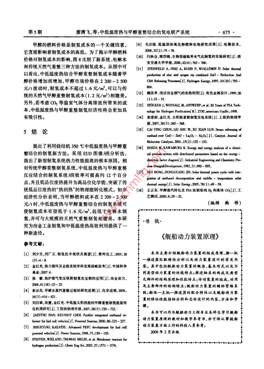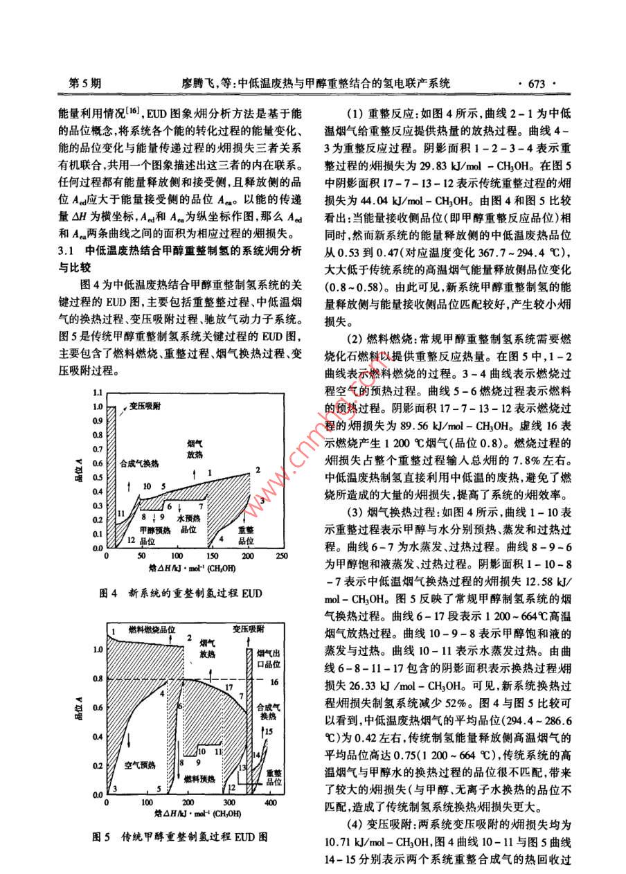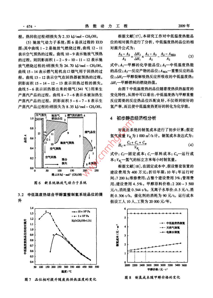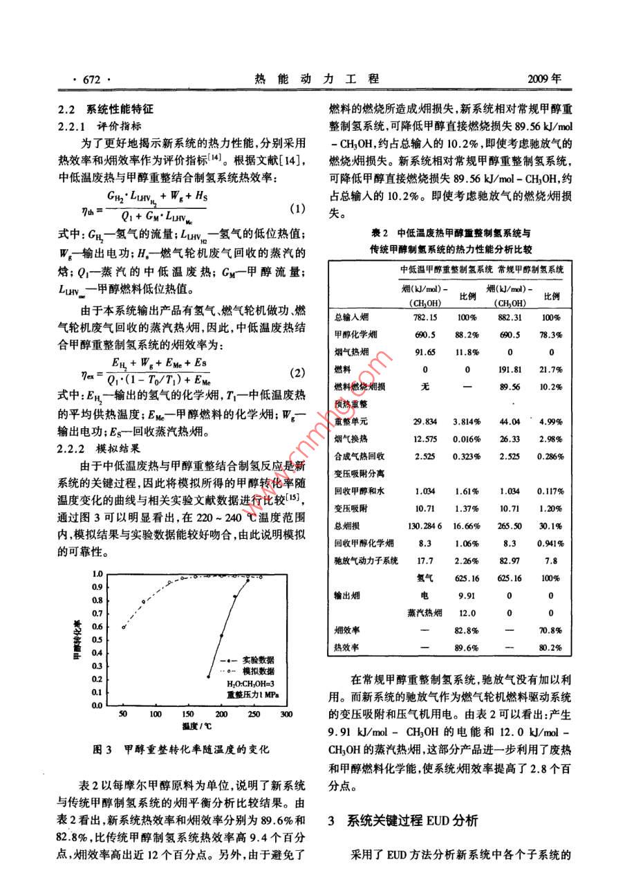 第24卷第5期熱能動力Vol 24. No 52009年9月JOURNAL OF ENGINEERING FOR THERMAL ENERGY AND POWEReD.,2009文章編號:l001-200(200)05中低溫廢熱與甲醇重整結(jié)合的氫電聯(lián)產(chǎn)系統(tǒng)廖騰飛,洪慧2,劉柏謙1(1.北京科技大學機械工程學院,北京10003:;2.中國科學院工程熱物理研究所,北京100190)摘要:提出了燒結(jié)機煙氣中低溫廢熱與甲醇蒸汽重整制魚焓值約占總廢熱焓值的1/3,有巨大的利用潛力。整合的新方法,模擬建立了中低溫廢熱結(jié)合甲醇重整制氫的針對傳統(tǒng)制氫能耗大和冶金工業(yè)200~500℃系統(tǒng)。差于能的品位概念,采用ELD圖像煙分析方法揭示中低溫廢熱利用難的問題,本研究提出燒結(jié)機煙氣低品位的中低溫廢熱特化為高品位化學能的能置轉(zhuǎn)特性:中低溫廢熱和甲醇蒸汽重整反應整合的新型制氫系規(guī)律。研究結(jié)果明:新型制氨系統(tǒng)的畑效率有望達到統(tǒng)。利用EUD圖像分析法,闡明新系統(tǒng)相對傳82.8%,比傳統(tǒng)甲醇制氬系統(tǒng)約高12個百分點,甲醇燃料節(jié)統(tǒng)甲醇制氫系統(tǒng)效率高的特性,揭示中低溫廢熱能率237%。另外,初步靜態(tài)經(jīng)濟性分析表明:新系統(tǒng)可使提升到高品位化學能的能量轉(zhuǎn)化特征,分析中低溫氬氣生產(chǎn)成本約為1.5元/m,遠低于電解水制氮成本(5.5廢熱品位提升的變化規(guī)律初步評價新系統(tǒng)靜態(tài)制元/m3)。當甲醇原料成本價格保持在一定的價格范圍內(nèi),其氫成本。制氫成本可以與傳統(tǒng)天然氣制氫成本1.2元/m3相竟爭。本研究為冶金工業(yè)同時解決中低溫廢熱利用和制氬能耗高1中低溫廢熱結(jié)合甲醇汽重整制氫系統(tǒng)的難題提供了一個新途徑。1.1新系統(tǒng)的流程概述關(guān)鍵詞:中低溫廢熱;甲醇蒸汽重整制氫;EUD圖像畑中低溫廢熱結(jié)合甲醇制氫新型系統(tǒng)流程主要由分析預熱重整過程變壓吸附分離過程和馳放氣動力子圖分類號:TK91文獻標識碼:A系統(tǒng)構(gòu)成,如圖1所示。引言1.1.1預熱重整以寶鋼燒結(jié)廠一號燒結(jié)機為例,以367.7℃燒目前傳統(tǒng)制氫方法主要是電解水制氫和礦物結(jié)機尾部煙氣為熱源首先給重整反應器提供需要燃料制氫1,電解水制氫不僅能耗大,而且成本高,的反應熱,然后出口煙氣給水蒸氣過熱器、蒸發(fā)器中標況下每立方米氫氣的能耗高達55kWh電能制供熱,最后煙氣給甲醇蒸汽過熱器甲醇蒸汽發(fā)生器氫成本高達55元。由于礦物燃料制氫需要消耗石供熱,出口煙氣進入煙道。油、天然氣和煤等化石燃料燃燒為制氫反應提供需甲醇、無離子水(甲醇水摩爾比1:1.5)經(jīng)過預要的反應熱因此化石燃料的直接燃燒不可避免地熱蒸發(fā)過熱后進入重整器,反應生成合成氣合成造成巨大化學能損失同時又帶來大量的CO2等溫氣余熱回收后進入變壓吸附器。室氣體排放,產(chǎn)生嚴重環(huán)境污染(2。對于目前傳統(tǒng)1.1.2變壓吸附過程制氫存在的能耗和環(huán)境的問題,國內(nèi)外都提出了很合成氣先通過冷卻分離出未反應的甲醇、無離多新型的制氫方法3-l。子水,然后在40℃,2MPa的條件下進入變壓吸附目前冶金行業(yè)廢熱豐富然而500℃以上的高器,分離出氫氣。溫廢氣余熱的熱利用效率較高,而400~500℃中低1.1.3馳放氣動力子系統(tǒng)溫廢氣余熱的回收利用率較低2)。對于300℃以變壓吸附分離出的馳放氣作為氣體燃料燃氣輪下的低溫煙氣余熱更是作為廢氣廢熱被浪費。以燒機燃料如圖1所示馳放氣經(jīng)過壓縮機壓縮后,與結(jié)工序為例燒結(jié)工序中的余熱大約有50%熱量以回熱空氣混合進入燃燒室燃燒進入透平做功出口廢熱形式被排入大氣。在冶金工業(yè)中像這樣200煙氣余熱生產(chǎn)蒸汽產(chǎn)品回收40℃的中低溫廢熱占總余熱的2/3以上,其熱收稿日期:2008-01-28;修訂日期:2008-12-07基金項目:國家自然科學基金委員會青年基金資助項目(5006004作者簡介廖脾飛(1985-),男湖北荊門人,北京科技大學碩土研究生第5期廖騰飛,等:中低溫廢熱與甲醇重整結(jié)合的氫電聯(lián)產(chǎn)系統(tǒng)671134℃鴝和水燕氣飽和甲醇蒸汽燒結(jié)機尾部煙氣21722138℃1741℃著人過熱水蒸氣飽和180℃::34℃水844℃合成氣178.2℃回收甲醇541kmo25℃離子水離氫氣1187kmol/h馳放氣,11x10Pa疲人汽鍋夢產(chǎn)生汽入口溫度1130℃煙氣出口溫度174.1℃水、蒸汽蒸汽產(chǎn)一→中低溫煙氣其它圖1中低溫廢熱的甲醇重整制氬流程無離子水儲罐變壓吸附劑高純氫根據(jù)吸附壓力與馳放氣壓力的關(guān)系3,設定氫氣的回收率為90%。燃氣輪機選取ABB公司生產(chǎn)的型甲號為 Tempest機型燃氣輪機采用回熱循環(huán)。燃燒空氣衰1中低溫廢熱結(jié)合甲醇重整制氫主要單元模擬參數(shù)與結(jié)果變壓吸附主要流程項目數(shù)據(jù)高速燃燒器預熱重整過程尾氣緩沖罐甲醇重整吸熱重整溫度/℃屘氣重整壓力/Pa甲醇轉(zhuǎn)化率953%圖2傳統(tǒng)甲醇制氫流程飽和水蒸發(fā)溫度/℃、壓力/Pa1803x105飽和甲醉液蒸發(fā)溫度/℃、壓力/Pa134.9、10x103常規(guī)甲醇制氫流程如圖2所示:燃燒甲醇燃料合成氣熱回收回收溫度/℃產(chǎn)生高溫煙氣來預熱甲醇、水,并給甲醇重整反應器2/%,H/%提供熱量。重整產(chǎn)物合成氣經(jīng)過熱回收,冷卻,經(jīng)變燒結(jié)煙氣參數(shù)溫度/℃流量/m3h1367.72679564壓吸附分離來制得純氫。成分:O2(20.8%)、CO(