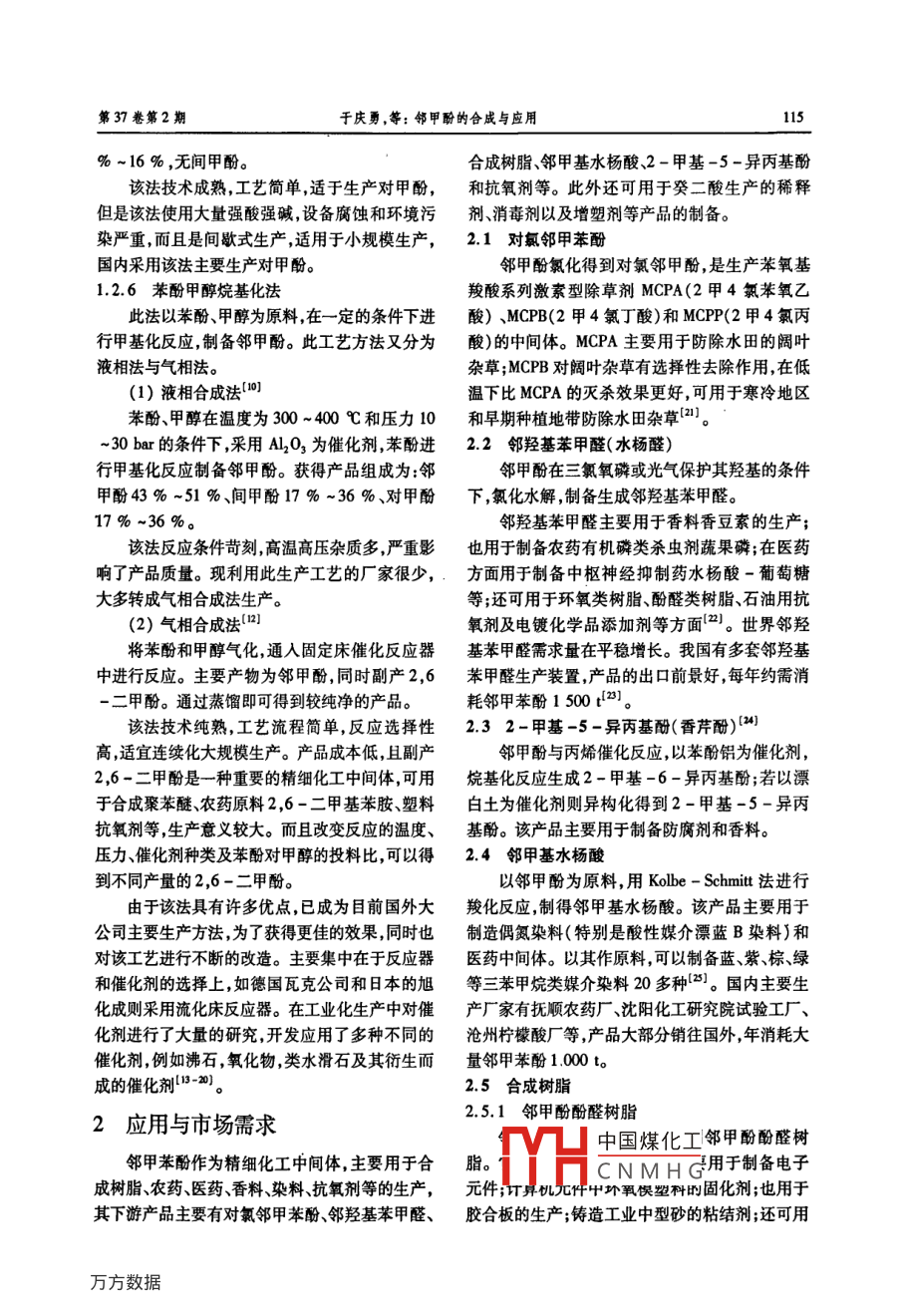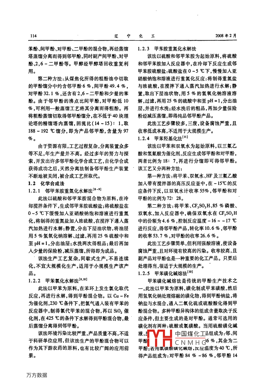 第37卷第2期.遼,寧化.工_VolL.37 ,No.2.2008年2月Liaoning Chemical IndustryFebruary ,2008鄰甲酚的合成與應用于慶勇,丑曉玉,徐春輝,呂超(吉林師范大學化學學院,吉林四平134000)摘要:從工業(yè)角度入手,闡述了鄰甲酚的主要合成方法,給出反應的實驗條件以及操作步驟,并對各種方法的優(yōu)點及局限之處進行了評述。綜述了鄰甲酚在合成樹脂、農(nóng)藥、醫(yī)藥、香料、染料、抗氧劑等產(chǎn)品的生產(chǎn)中的應用。并指出了鄰甲酚當今的研究熱點及今后的發(fā)展方向。關鍵詞:鄰甲酚;中間體;合成;合成樹脂;醫(yī)藥中圖分類號: TQ 031.2文獻標識碼: A文章編號: 1004 -0935(2008 )02 -0113 -05世界鄰甲酚生產(chǎn)主要集中在工業(yè)發(fā)達國家,t;1999年4 340 t;2000年5 230以;2001年3 134采用天然分離法的公司有:美國Merichem 公司、t;2002 年5 057 {[2] ;2004年5 184 {'] ;2005年5PMC公司、Stimson Lumber公司,法國的Huiles532 t;2007 年8月末6821 [4。公司,德國Ruetgerswerke公司,英國Coalite Fuels1合成方法and Chemicals 公司等。世界總生產(chǎn)能力約為40~45kt/a。采用苯酚烷基化法生產(chǎn)的有;美國通鄰甲酚有毒,主要作用于中樞神經(jīng)系統(tǒng),嚴重用電氣公司,德國的巴斯夫公司、URBK公司,荷時可導致死亡,并且還對水生生物有毒。鄰甲酚蘭的通用電氣公司,英國合成化學公司,日本的三蒸汽或者煙霧可燒傷皮膚,吸人時,能引起慢性腎菱石化、旭化成和三井東壓公司等。氣相催化合炎和神經(jīng)障礙。工作場所空氣中最高允許的濃度成法主要生產(chǎn)公司有美國Koppers,美國通用電氣為5 x10- ,大鼠經(jīng)口LD3 1 350 mg/kg。公司,英國沃塞林公司,日本住ABC友化學、旭化1.1 天然分離法成公司等。無論是天然法或化學合成法,由于鄰天然分離法是傳統(tǒng)的鄰甲酚制備方法,即從甲酚生產(chǎn)工藝均聯(lián)產(chǎn)其它產(chǎn)品,因此全球鄰甲酚煤焦油中分餾出鄰甲酚。在煤煉焦和城市煤氣生的生產(chǎn)能力難以做準確的統(tǒng)計,據(jù)估計現(xiàn)在年生產(chǎn)的副產(chǎn)煤焦油酚中約含有苯酚30 % ,鄰甲酚產(chǎn)能力約為4-4.5萬to我國只有少數(shù)廠家采用10 %~13 %,間甲酚14 % ~18 %,對甲1酚9天然分離法和鄰甲苯胺重氮化水解法小規(guī)模生%~12%,二甲酚13 % ~15 % ,可以采用分離方產(chǎn),如上海焦化廠,首鋼焦化廠;馬鋼焦化廠,南京法回收鄰甲酚。梅山煉鋼焦化廠,重慶有機化工廠等。由于規(guī)模該工藝又分為兩種方法5-):較小,工藝落后,產(chǎn)品質(zhì)量差,無論是質(zhì)量和數(shù)量第一種方法:煤焦油酚首先在酸化塔中脫去根本不能滿足國內(nèi)的需求。近年來,我國-一些企易揮發(fā)的烴類物質(zhì),然后用石腦油和甲醇的混合業(yè)如宜興市和橋宏達化工廠,南京大唐化工有限液在甲醇萃取塔中進行萃取并吹入二氧化碳。該責任公司,天津市冠業(yè)化工有限公司,中化物產(chǎn)股法按原料又可分為粗甲醇類和粗甲烷類。從粗甲份有限公司上海分公司,南京東方明珠化工上海醇類中可回收硫酚和硫甲酚等廢物流,而粗甲烷分公司開始生產(chǎn)鄰甲酚,尤其以成立于2006年4類,則經(jīng)甲醇塔除去水分,并分餾為鄰甲酚、天然月的藍星化工新材料股份有限公司為最。中國煤化工近幾年鄰甲酚的進口量如下:1998年5670TYHCNMHG碩士。114遼寧化2008年2月苯酚間甲酚、對甲酚、二甲酚的混合物,再經(jīng)蒸餾1.2.3甲苯胺重氮化水解法塔蒸餾分離而得到鄰甲酚,同時副產(chǎn)間甲酚、對甲該法以硫酸和鄰甲苯胺為起始原料,將硫酸酚、2,6-二甲酚等。甲醇經(jīng)甲醇塔回收重復利和鄰甲苯胺加入反應器中,在冷卻下反應生成鄰用。甲苯胺硫酸鹽:硫酸鹽在0~5 C下,慢慢加入亞第二種方法;從煤焦化所得的粗酚油中切取硝酸鈉飽和溶液進行重氮化反應:將制得重氮鹽的甲酚餾分中約含鄰甲酚6 % ,間甲酚49.4 %,與濃硫酸, 在攪拌下通入蒸汽加熱進行水解;靜對甲酚32.1 % ,還含有2,6-二甲酚和少量的苯置 ,取出下層油狀物,用5 %的氫氧化鈉溶液溶酚。由于鄰甲酚的沸點比間甲酚,對甲酚低10解,過濾,再用25 %的硫酸中和至pH =1 ,分出油% ,可利用一般蒸餾工藝將其分離而得粗酚。再層,并進行水洗;經(jīng)水洗后的粗品,再加少量保險將粗酚蒸餾切取得鄰甲酚餾分,在不低于40塊理粉經(jīng)減壓蒸餾,即得純品鄰甲酚產(chǎn)品。論塔的精餾塔內(nèi)蒸餾,回流比(14~15): 1,取此法工藝步驟較多,三廢,設備腐蝕嚴重,且188~192 C餾分,即為產(chǎn)品鄰甲酚,含量為97收率低成本高,不適用于大規(guī)模生產(chǎn)。%。1.2.4甲苯羥基化法"由于資源有限,工藝過程復雜,分離裝置眾多該法以甲苯和雙氧水為起始原料,以三氟乙等不足,年生產(chǎn)量并不高。經(jīng)過多年的努力與探酸和氫氟酸為催化劑,反應生成鄰甲酚和對甲酚,索,開發(fā)出許多鄰甲酚化學合成工藝,自化學合成兩者比例為18:7,再進行分餾即可得鄰甲酚。獲得成功之后,天然分離法制備鄰甲酚生產(chǎn)裝置,該工藝又分兩種方法:不斷地被關閉,被合成工藝所取代。第一種方法:將甲苯、雙氧水、HF及三氟乙酸1.2化學合 成法加入帶有攪拌器的高壓反應釜中,在-15C的反1.2.1鄰甲苯胺重氨化水解法[8-9]應條件下反,以雙氧水計收率55% ,鄰甲酚和對此法以硫酸和鄰甲苯胺混合物為原料,在冷甲酚的比例為72: 28。卻攪拌條件下,生成鄰甲苯胺硫酸鹽;將硫酸鹽在第二種方法:將甲苯、CF,SO,H、85 %磷