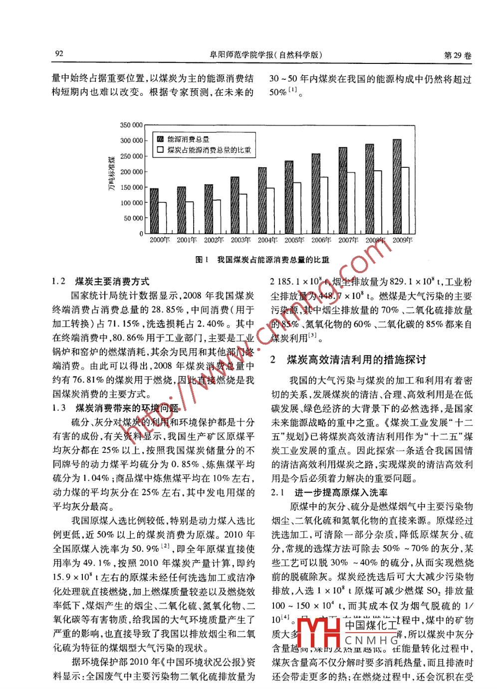 第29卷第2期阜陽(yáng)師范學(xué)院學(xué)報(bào)(自然科學(xué)版)Vol. 29 ,No.22012年6月Joumal of Fuyang Teachers College ( Natural Science)Jun.2012煤炭的清潔高效利用初探樊亞明(華北電力大學(xué)能源動(dòng)力與機(jī)械工程學(xué)院,河北保定071003)摘要:煤炭的大量使用帶來 了環(huán)境污染、資源枯竭等問題,因此煤炭資源的清潔高效利用,將成為我國(guó)能源技術(shù)創(chuàng)新和能源結(jié)構(gòu)調(diào)整的戰(zhàn)略性選擇。從煤炭消費(fèi)帶來的環(huán)境問題入手,通過綜合分析的方法,從提高原煤入洗率、煤炭高效潔凈燃燒技術(shù)、燃煤煙氣凈化、改變煤炭利用方式、加大煤炭提質(zhì)和分質(zhì)利用等方面,對(duì)煤炭高效清潔利用的措施進(jìn)行探討,旨在最大限度地控制燃煤煙氣主要污染物的排放,達(dá)到促進(jìn)煤炭清潔高效利用的目的。關(guān)鍵詞:煤炭;環(huán)境保護(hù);清潔高效利用中圖分類號(hào): TK01 +8文獻(xiàn)標(biāo)識(shí)碼: A文章編號(hào): 1004 4329(2012)01-091-04Preliminary discussion about clean and efficient utilization of coalFAN Ya-ming( School of Energy and Power Engineering , Norh China Electric Power University, Baoding Hebei 071003, China)Abstract: The extensive use of coal brought environmental pollution, resource depletion and other issues, so the clean andefficient utilization of coal resources will become our strategic choice about the innovation of energy technology and the adjustrment ofenergy structure. From the perspeetive about environmental problens caused by coal consumption, through the comprehensive analy-sis method, from the aspect of improving the washing rate of raw coal , high eficiency and clean combustion technology of coal , fluegas purification , change of coal utilization , increasing coal quality and dual using etc, the measures about efficient and clean use ofcoal is discussed, in order to maximize control of coal-fired flue gas emissions of major pollutants to achieve the goal of prormotingclean and elicient utilization of coal.Key words : coal; environmental protection; clean and eficient utilization化石能源的儲(chǔ)藏特點(diǎn)決定了我國(guó)是世界上少1煤炭消 費(fèi)帶來的環(huán)境問題數(shù)以煤炭為主要--次能源的國(guó)家,而且在相當(dāng)時(shí)期內(nèi)這種能源結(jié)構(gòu)不會(huì)發(fā)生大的變化。大規(guī)模的煤1.1 我國(guó)煤炭生產(chǎn) 與消費(fèi)現(xiàn)狀炭消費(fèi)支撐著我國(guó)經(jīng)濟(jì)的快速發(fā)展,同時(shí)又直接導(dǎo)隨著國(guó)民經(jīng)濟(jì)的快速發(fā)展和基礎(chǔ)設(shè)施建設(shè)步致了我國(guó)典型的煤煙型大氣污染的現(xiàn)狀。煤炭資伐的不斷加快,我國(guó)能源的供給與需求迅速增長(zhǎng),源的非再生屬性,也決定了我國(guó)面臨著有限資源和其中尤以煤炭的供給與需求量增長(zhǎng)最為顯著。國(guó)更高環(huán)境保護(hù)要求的嚴(yán)峻挑戰(zhàn)。因此在大力推進(jìn)家統(tǒng)計(jì)局統(tǒng)計(jì)數(shù)據(jù)表明:2000年到2009年,煤炭在優(yōu)化能源消費(fèi)結(jié)構(gòu)的前提下,當(dāng)前加快推進(jìn)煤炭清能源生產(chǎn)總量的比重從73. 2%.上升到77.3%,在潔高效利用,具有重要的現(xiàn)實(shí)意義。本文是從環(huán)境能源消費(fèi)總量的比重從69.2%上升70.4% ( 2000保護(hù)的角度,應(yīng)用綜合分析的方法.對(duì)煤炭清潔高年至2009年煤巖在我國(guó)能源消費(fèi)總量中的比重見效的利用問題進(jìn)行探討。圖1)。由中國(guó)煤化工產(chǎn)和消費(fèi)總YHCNMHG收稿8期:2012-04-12作者簡(jiǎn)介:樊亞明(1992 -),男。研究方向:能源動(dòng)力。9阜陽(yáng)師范學(xué)院學(xué)報(bào)(自然科學(xué)版)第29卷量中始終占據(jù)重要位置,以煤炭為主的能源消費(fèi)結(jié)30~50年內(nèi)煤炭在我國(guó)的能源構(gòu)成中仍然將超過構(gòu)短期內(nèi)也難以改變。根據(jù)專家預(yù)測(cè),在未來的50%川。350 000300 000四能源消費(fèi)總量250 000口煤炭占能源消費(fèi)總量的比重醫(yī).200000150 000100 00050 0002000年2001年 2002年 2003年 2004年 2005年 2006年 2007年 2008年 2009年圖1我國(guó)煤炭占能源消費(fèi)總量的比重1.2 煤炭主要消費(fèi)方式2 185.1 x 10* 1,煙塵排放量為829.1 x10*t,工業(yè)粉國(guó)家統(tǒng)計(jì)局統(tǒng)計(jì)數(shù)據(jù)顯示,2008年我國(guó)煤炭塵排放量為448.7x108 t。燃煤是大氣污染的主要終端消費(fèi)占消費(fèi)總量的28. 85%,中間消費(fèi)(用于污染源,其中煙塵排放量的70%.二氧化硫排放量加工轉(zhuǎn)換)占71. 15% ,洗選損耗占2.40%。其中的85%、氮氧化物的60%、二氧化碳的85%都來自在終端消費(fèi)中,80. 86%用于工業(yè)部門,主要是工業(yè)煤炭利用3)。鍋爐和窯爐的燃煤消耗,其余為民用和其他部門終2煤炭高效清潔利用的措施探討端消費(fèi)。由此可以得出,2008年煤炭消費(fèi)總量中約有76. 81%的煤炭用于燃燒,因此直接燃燒是我我國(guó)的大氣污染與煤炭的加工和利用有著密國(guó)煤炭消費(fèi)的主要方式。切的關(guān)系,發(fā)展煤炭的清潔、合理、高效利用是在低1.3煤炭消 費(fèi)帶來的環(huán)境問題碳發(fā)展、綠色經(jīng)濟(jì)的大背景下的必然選擇,是國(guó)家硫分、灰分對(duì)煤炭的利用和環(huán)境保護(hù)都是十分未來能源戰(zhàn)略的重中之重?!睹禾抗I(yè)發(fā)展“十二有害的成份,有關(guān)資料顯示,我國(guó)生產(chǎn)礦區(qū)原煤平五”規(gu