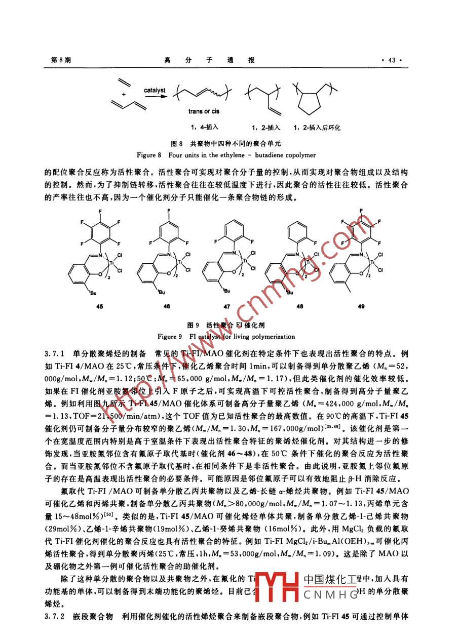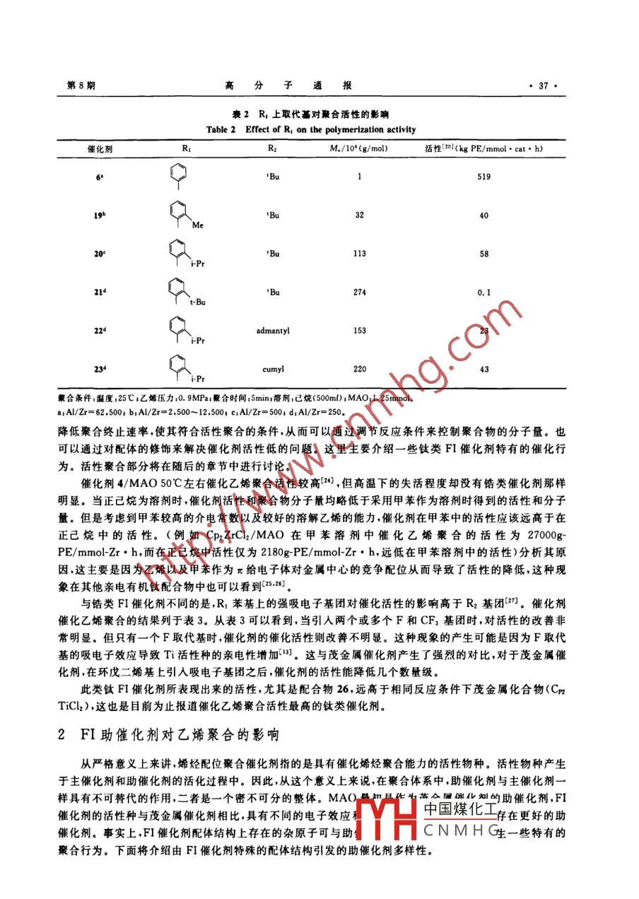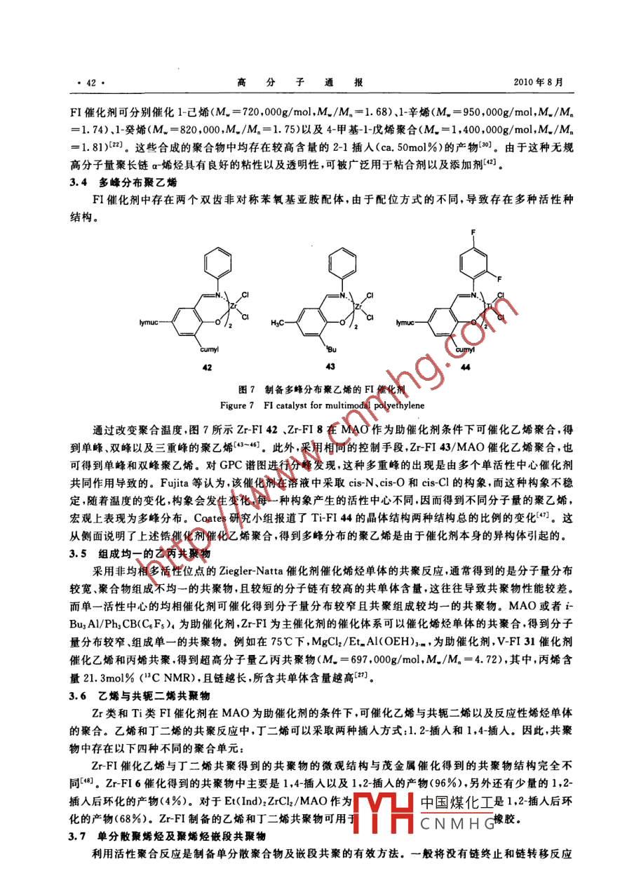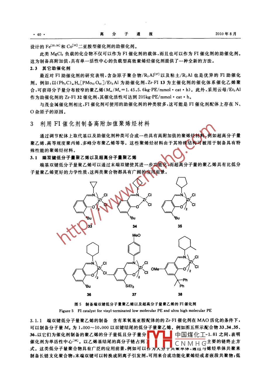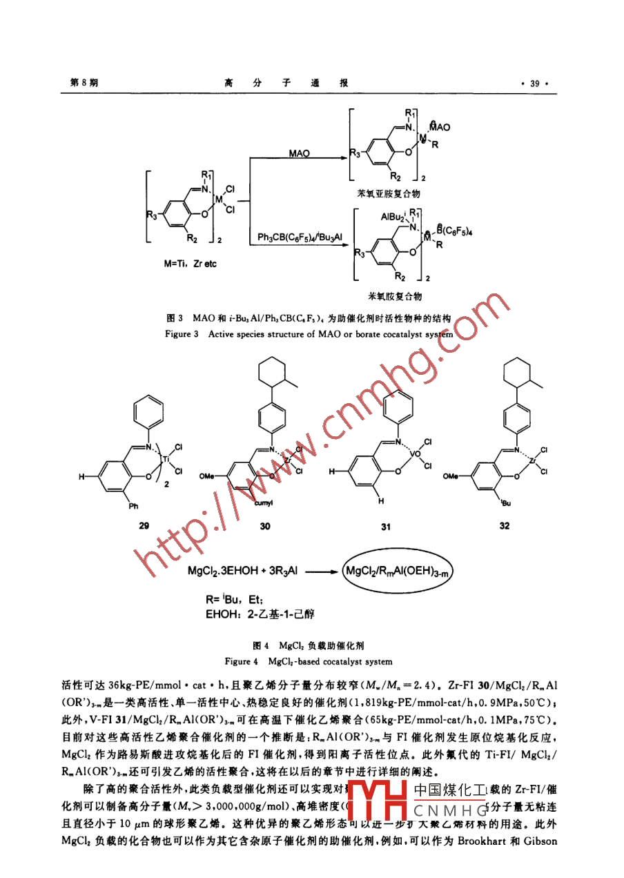 34高分子通報(bào)2010年8月用苯氧基亞胺型ⅣB族催化劑制備高附加值聚烯烴材料曾婉,李化毅2,李金閣2,張遼云1*,胡友良2(1.中國科學(xué)院研究生院,北京10049;2,中國科學(xué)院化學(xué)研究所,北京分子科學(xué)國家實(shí)驗(yàn)室,高分子科學(xué)與材料聯(lián)合實(shí)驗(yàn)室,工程塑料重點(diǎn)實(shí)驗(yàn)宣,北京100190)摘要:苯氧某亞胺型前過渡金屬烯烴聚合催化劑是近年來發(fā)展起來的一種非茂前過渡金屬烯烴聚合催化劑。該類催化劑由于具有催化烯烴合活性高、結(jié)構(gòu)可調(diào)性強(qiáng)、制備的聚合物可控性好等特點(diǎn)受到了廣泛的關(guān)注。本文綜述了此類催化劑的設(shè)計(jì)合成,介紹了FI主催化劑上不同取代基對(duì)催化劑活性、分子量的影響以及采用不同助催化劑條件時(shí)催化劑表現(xiàn)出來的特殊性能,重點(diǎn)介紹通過調(diào)節(jié)配體上取代基助催化劑以制備不同種類的高附加值聚烯烴材料。關(guān)鍵詞:前過渡金屬催化劑;苯氧基亞胺配體;烯烴聚合;高附加值聚烯烴材料引言聚烯烴材料由于具有性價(jià)比高、力學(xué)性能好、熱性能穩(wěn)定、加工性能優(yōu)異以及可循環(huán)利用等特點(diǎn)被廣泛應(yīng)用于工業(yè)、農(nóng)業(yè)建筑醫(yī)療衛(wèi)生、軍事科技以及日常生活等多個(gè)領(lǐng)域口,據(jù)統(tǒng)計(jì),2003年全世界聚烯烴年產(chǎn)量已超過一億噸,估計(jì)到2012年全球聚烯烴產(chǎn)量將達(dá)到1.7億噸口聚烯烴工業(yè)持續(xù)發(fā)展的一個(gè)關(guān)鍵因素在于聚烯烴催化劑的不斷革新。每一類新型催化劑的出現(xiàn)都會(huì)帶來新聚合工藝的變革以及聚烯烴新材料的發(fā)展。20世紀(jì)50年代初, Ziegler和 Natta5先后采用TC4-AEt催化劑體系合成了高密度聚乙烯以及利用 TiCl,-AlEt2Cl催化劑體系合成了全同立構(gòu)聚丙烯,開辟了聚烯烴工業(yè)的新紀(jì)元。20世紀(jì)80年代初 Kaminsky和Sinn(發(fā)現(xiàn)了甲基鋁氧烷,以其為助催化劑,大大推動(dòng)了茂金屬催化劑的發(fā)展。茂金屬催化劑不僅能制備高密度聚乙烯、線型低密度聚乙烯、全同立構(gòu)聚丙烯,而且能合成傳統(tǒng)催化劑難以合成的間同立構(gòu)聚丙烯、間同立構(gòu)聚苯乙烯等多種新型結(jié)構(gòu)的聚烯烴。在茂金屬催化劑發(fā)展的基礎(chǔ)上,人們又合成出了非茂過渡金屬催化劑用于烯烴聚合。1991年,Dow化學(xué)公司和 Exxon公司研制開發(fā)了新型單茂金屬的限定幾何構(gòu)型催化劑—CGC催化劑( Constrained Geometry Catalyst),配體含有一個(gè)環(huán)戊二烯和一個(gè)N雜原子。此后發(fā)展了不含環(huán)戊二烯配體的非茂過渡金屬催化劑,如1995年 Brookhart和 Gibson10分別報(bào)道了鐵、鉆為中心金屬的多亞胺類化合物,在甲基鋁氧烷(MAO)存在下具有催化烯烴聚合和齊聚的能力。1999年,日本三井化學(xué)公司 Fujita領(lǐng)導(dǎo)的研究小組報(bào)道了苯氧基亞胺型ⅣB前過渡金屬烯烴聚合催化劑山:,其通式如圖1。該類催化劑具有多種特殊的性能引起了人們廣泛的關(guān)注。該類催化劑也稱為F催化劑。國內(nèi)關(guān)于F1催化劑的綜述還較少中國科學(xué)院化學(xué)研究所的李化毅等研究了F催化劑的中心金屬電荷對(duì)催化劑活性的影響,金鷹泰等山重點(diǎn)總結(jié)催化劑的主要特征和催化機(jī)理。本文介紹了不同取代基對(duì)催化劑活性、分子量等的影響以及不同助催化劑的作用,重點(diǎn)介紹通過調(diào)節(jié)配體上取代基以及助催化劑種類制備具有高附加值的聚烯烴材料。1FI主催化劑配體取代基對(duì)催化性能的影響催化劑體系分為四個(gè)部分:過渡金屬配體、增長(zhǎng)鏈以及單體配位位點(diǎn)。與傳統(tǒng)的以過渡金屬為催化基金項(xiàng)目:國家自然科學(xué)基金資助項(xiàng)目(No.20334030,No.5040302中國煤化工新基金研究項(xiàng)目(No.2008D5006-0501)和中國科學(xué)院研究生院院長(zhǎng)基金A資助項(xiàng)CNMHG作者簡(jiǎn)介:曾婉(1985-),女,中國科學(xué)院研究生院碩土研究生,主要從事烯烴催化劑合成的研究;通訊聯(lián)系人: E-mail: huylgiccasi zhangye第8期高分子通報(bào)劑設(shè)計(jì)中心觀念不同的是, Fujita等將注意力集中R于配體結(jié)構(gòu)設(shè)計(jì)上,認(rèn)為在催化過程中,配體以種更主動(dòng)的方式與金屬一起作用61,他們?cè)O(shè)計(jì)了以下幾種配合物(見圖2),發(fā)現(xiàn)配合物1無法合成,RM=TiZr Hf.V在MAO作用下,配合物2和3催化乙烯聚合活性RR3=烷基,芳香團(tuán)較低(見表1),含有苯氧亞胺配體的第IVB族過渡R2」2磯烷基,含雜原了基團(tuán)金屬配合物在催化乙烯聚合時(shí),卻表現(xiàn)了很高的催化活性,例如配合物4和5的催化活性也分別達(dá)到圖1FI催化劑通式了3.3kg/mmol·Zr·h和6.5kg/mmol·Zr;h,Figure 1 The general formula of the FI catalyst而配合物6的活性竟達(dá)到了519kg/mmol·zr·h,比相同反應(yīng)條件下Cp2ZrCl2/MAO(27kg/mmol·Zrh)的活性高近20多倍), Fujita等把這種苯氧基亞胺型前過渡金屬化合物命名為F催化劑。圖2設(shè)計(jì)的配合物結(jié)構(gòu)Figure 2 Structure of the complex designed by FujitaFI催化劑配體一般通過水楊醛與伯胺之間的席夫堿縮合反應(yīng)生成。在苯氧基亞胺的結(jié)構(gòu)中,主要存在三個(gè)可調(diào)節(jié)的取代基R1、R2和R3(如圖1所示)這三個(gè)