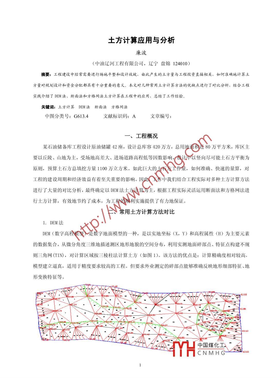 土方計算應(yīng)用與分析廉波(中油遼河工程有限公司,遼寧盤錦124010)商要: 工程建設(shè)中經(jīng)常需要進(jìn)行場地平整和設(shè)計放坡,由此產(chǎn)生的土方量與工程投資直接相關(guān),如何準(zhǔn)確地計算土方量對規(guī)劃設(shè)計和資金分配都具有十分重要的意義。本文對幾種常用土方計算方法的優(yōu)缺點進(jìn)行了對比分析,結(jié)合工程實踐介紹了DEM法、斷面法和方格網(wǎng)法土方計算在工程中的應(yīng)用,總結(jié)了工作經(jīng)驗。關(guān)鍵詞:土方計算DEM法 斷面法方格網(wǎng)法中圖分類號: G613.4文獻(xiàn)標(biāo)識碼: A文章編號:一、工程概況某石油儲備庫工程設(shè)計原油儲罐42座,設(shè)計總庫容420萬方,總用地面積近80萬平方米,庫區(qū)主.要以丘陵、山地為主,受場地高差大、進(jìn)場道路高程低等因數(shù)影響,設(shè)計中以豎向盡可能土石方平衡為原則,預(yù)算土石方總填挖方量1100萬立方米。如此巨大的土石方工作量,如何準(zhǔn)確、快速的量算,對工程的建設(shè)周期和經(jīng)濟(jì)效益有著至關(guān)重要的影響。因此,工作中我們結(jié)合工程實際對多種土方計算方法進(jìn)行了大量的對比分析,最終確定以DEM法土方計算為主,根據(jù)工程實際靈活運用斷面法和方格網(wǎng)法進(jìn)行土方計算,有效地節(jié)約了成本,為工程的順利實施提供了有力地保證。二、常用土方計算方法對比1. DEM法DEM (數(shù)字高程模型)是數(shù)字地面模型的一種,是以實地坐標(biāo)(X, Y) 和高程屬性(H)為主要元素的數(shù)據(jù)集合,從微分角度三維地描述測區(qū)地形地貌的空間分布,利用實測地面碎部點、特征點構(gòu)建不規(guī)則三角網(wǎng)(TIN),對計算區(qū)域按三棱柱法計算土方(如圖1)。該方法的優(yōu)點是:計算精確度相對較高,模型建立逼真,適用于精度要求較高的工程。但要求外業(yè)測定的碎部點能夠準(zhǔn)確反映地形細(xì)部特征、地形變換特征等。4611- ,2+中國煤化工。MHCNMHGY2a22圖1 DEM法土方計算模型2.斷面法斷面法是根據(jù)土方計算范圍將場地劃分為若干平行的橫截面,由兩斷面的平均截面積和斷面間距計算斷面間土方量,各斷面間土方量之和為總土方量(如圖2)。該方法主要應(yīng)用于道路、河流等狹長帶狀區(qū)域的方量計算,在大面積復(fù)雜區(qū)域和計算區(qū)域隨時變化的情況下,外業(yè)操作復(fù)雜,計算效率低,粗差較大。Sn+ ;v1v3|。 ..D1DDn圖2斷面法 土方計算模型3.方格網(wǎng)法方格網(wǎng)法是按照計算范圍將場地劃分為一定間距的方格,從地形圖或?qū)崪y得到每個方格角點的高程,對每個格網(wǎng)面按四角高程取平均值計算土方,各方格土方量之和為總土方量。該方法直觀、易懂、計算簡單,適用于大面積相對平緩的區(qū)域,但方格網(wǎng)四角高程多為內(nèi)插求得,計算中也未考慮地性線,所以在計算前必須手工加密高程點,對于復(fù)雜地形加密點工作量大、計算精度與格網(wǎng)間距有關(guān)。三、工程應(yīng)用該石油儲備庫工程涉及土石方工程量巨大,場區(qū)內(nèi)地形復(fù)雜,地貌相對破碎,要求土方量算工作準(zhǔn)確快速,并且給出簡單、直觀容易判讀的土石方開挖前后場地高程數(shù)據(jù),以便準(zhǔn)確的按照設(shè)計要求施工.經(jīng)過現(xiàn)場對比分析我們發(fā)現(xiàn),場區(qū)內(nèi)土石方工作區(qū)域按地形變化特點可大致分為三個類型,工作中結(jié)合不同的地形特點采用合適的量算方法,節(jié)省了大量的人力物力,也為工程建設(shè)贏得了寶貴的時間。(1)北側(cè)邊坡爆破區(qū)、罐區(qū)山體表層植被土清理區(qū)、儲罐基礎(chǔ)巖石爆破區(qū)以及場區(qū)內(nèi)土石方二次倒運土方集中了整個工程的大部分土石方量,這些區(qū)域共同表現(xiàn)為地形復(fù)雜、高程變化大,填挖方范圍不規(guī)則且涉及土石方量大,計算精度要求較高,比較符合DEM法的計算特點,因此我們對這部分土石方采用了DEM法進(jìn)行計算,為了直觀起見我們配以方格網(wǎng)數(shù)據(jù)作為爆破和開挖的參考依據(jù)。(2)網(wǎng)箱基礎(chǔ)碾壓區(qū)、儲罐環(huán)梁開挖爆破、進(jìn)場道路以及排洪渠開挖部分均呈規(guī)則的條帶狀分布,采用斷面法土方計算更為方便快捷,為了使計算土方量準(zhǔn)確可靠,我們對部分土方以斷面法和DEM法分別進(jìn)行了量算對比,結(jié)果顯示兩種方法計算結(jié)果誤差率均小于3%,符合土方計算相關(guān)要求。(3)罐組區(qū)域場地平整、消防水池開挖都是在平緩區(qū)域進(jìn)行中國煤化工現(xiàn)場數(shù)據(jù)以便指導(dǎo)現(xiàn)場施工,對此我們采用方格網(wǎng)法進(jìn)了土方計算,計算精度MYHCNMH G四、結(jié)論(1) DEM法土石方計算中每-一個現(xiàn)場測量點都直接參與了計算,土石方測量精度與外業(yè)采集點的密度和準(zhǔn)確性密切相關(guān)。(2) 內(nèi)業(yè)計算前連接地性線,生成等高線,適當(dāng)加密地性線上高程點,能有效提高計算精度。(3) 斷面法土方計算在規(guī)則條帶狀場地中計算精度較高,且量算簡單、快捷。(4)方格網(wǎng)法土方計算精度隨著格網(wǎng)間距的減小顯著提高,但計算量也隨之增大;方格網(wǎng)法計算能提供簡單直觀的格網(wǎng)數(shù)據(jù),施工應(yīng)用非常方便。參考文獻(xiàn)1. CASS8. 0軟件操