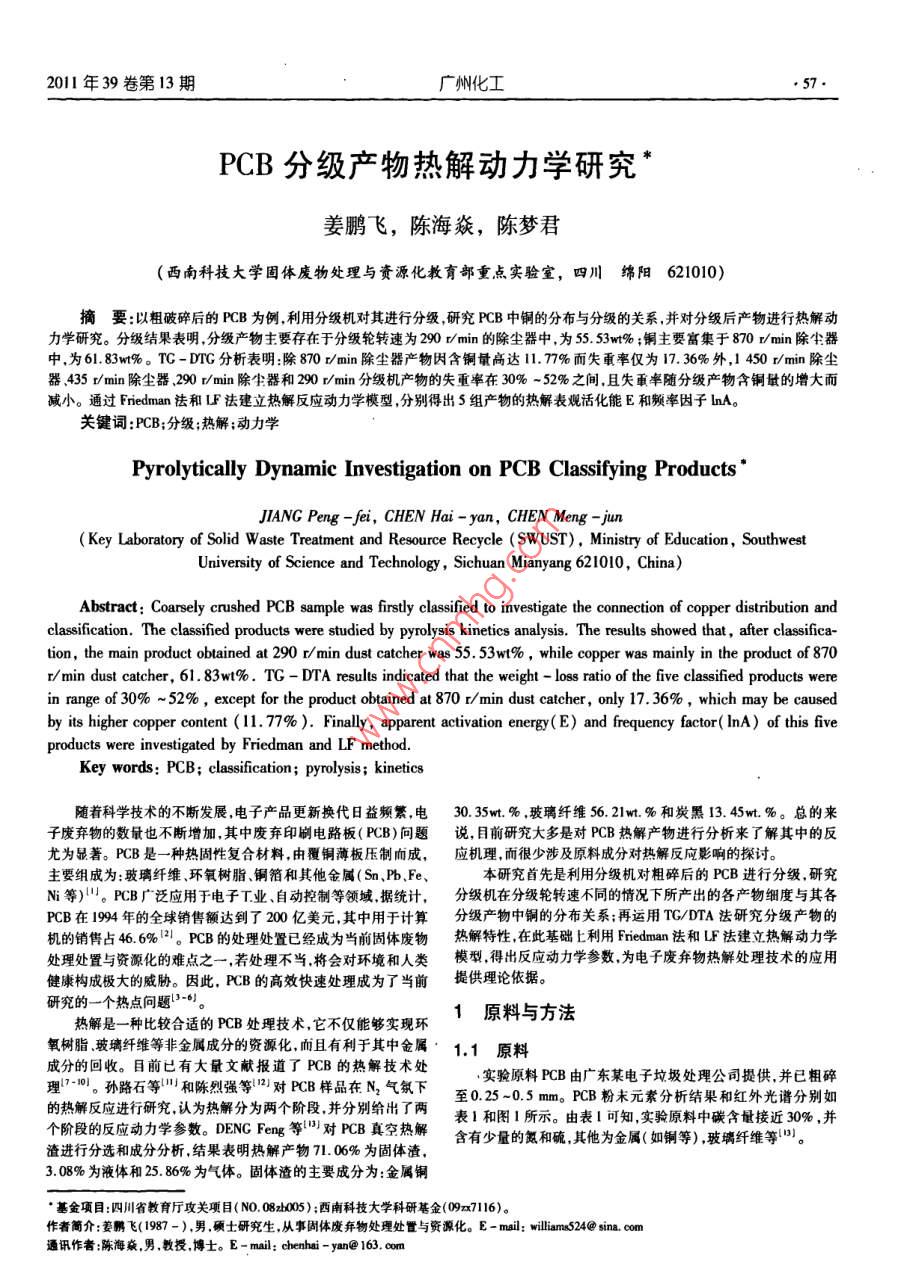 2011年39卷第13期廣州化工5PCB分級產(chǎn)物熱解動力學(xué)研究姜鵬飛,陳海焱,陳夢君(西南科技大學(xué)固體廢物處理與賚源化教育部重點(diǎn)實(shí)驗(yàn)室,四川綿陽621010)摘要以粗破碎后的PCB為例利用分級機(jī)對其進(jìn)行分級研究PCB中銅的分布與分級的關(guān)系,并對分級后產(chǎn)物進(jìn)行熱解動力學(xué)研究。分級結(jié)果表明,分級產(chǎn)物主要存在于分級輪轉(zhuǎn)速為290r/min的除塵器中,為553w%;銅主要富集于80r/mn除塵器中,為61.83w%。TG-DTG分析表明:除870r/min除塵器產(chǎn)物因含銅量高達(dá)1.77%而失重率僅為17.36%外,1450r/min除塵器435r/min除塵器、290r/min除塵器和290r/min分級機(jī)產(chǎn)物的失重率在30%-52%之間,且失重率隨分級產(chǎn)物含銅量的增大而減小。通過 Friedman法和UF法建立熱解反應(yīng)動力學(xué)模型,分別得出5組產(chǎn)物的熱解表觀活化能E和頻率因子lnA關(guān)鍵詞:PCB;分級;熱解;動力學(xué)Pyrolytically Dynamic Investigation on PCB Classifying ProductsJIANG Peng-fei, CHEN Hai-yan, CHEN Meng-jun( Key Laboratory of Solid Waste Treatment and Resource Recycle(SWUST), Ministry of Education, SouthwestUniversity of Science and Technology, Sichuan Mianyang 621010, China)Abstract: Coarsely crushed PCB sample was firstly classified to investigate the connection of copper distribution andclassification. The classified products were studied by pyrolysis kinetics analysis. The results showed that, after classifica-tion, the main product obtained at 290 r/min dust catcher was 55. 53wt%, while copper was mainly in the product of 870r/min dust catcher, 61. 83wt%. TG-DTA results indicated that the weight-loss ratio of the five classified products werein range of 30%-52%, except for the product obtained at 870 r/min dust catcher, only 17. 36%, which may be causeby its higher copper content(11. 77%). Finally, apparent activation energy(E)and frequency factor( InA)of this fiveproducts were investigated by Friedman and LF methodKey words: PCB; classification; pyrolysis; kinetics隨著科學(xué)技術(shù)的不斷發(fā)展電子產(chǎn)品更新?lián)Q代日益頻繁,電30.35w.%,玻璃纖維56.21wt.%和炭黑13.45w.%??偟膩碜訌U棄物的數(shù)量也不斷增加,其中廢棄印刷電路板(PCB)問題說,目前研究大多是對PCB熱解產(chǎn)物進(jìn)行分析來了解其中的反尤為顯著。PCB是一種熱固性復(fù)合材料,由覆銅薄板壓制而成,應(yīng)機(jī)理,而很少涉及原料成分對熱解反應(yīng)影響的探討。主要組成為:玻璃纖維、環(huán)氧樹脂銅箔和其他金屬(Sn、Pb,Fe本研究首先是利用分級機(jī)對粗碎后的PCB進(jìn)行分級,研究N等)。PCB廣泛應(yīng)用于電子工業(yè)、自動控制等領(lǐng)域據(jù)統(tǒng)計,分級機(jī)在分級輪轉(zhuǎn)速不同的情況下所產(chǎn)出的各產(chǎn)物細(xì)度與其各PCB在1994年的全球銷售額達(dá)到了200億美元,其中用于計算分級產(chǎn)物中銅的分布關(guān)系;再運(yùn)用TC/DTA法研究分級產(chǎn)物的機(jī)的銷售占46.6%2l。PCB的處理處置已經(jīng)成為當(dāng)前固體廢物熱解特性在此基礎(chǔ)上利用 Friedman法和LF法建立熱解動力學(xué)處理處置與資源化的難點(diǎn)之一,若處理不當(dāng)將會對環(huán)境和人類模型得出反應(yīng)動力學(xué)參數(shù)為電子廢棄物熱解處理技術(shù)的應(yīng)用健康構(gòu)成極大的威脅。因此,PB的高效快速處理成為了當(dāng)前提供理論依據(jù)。研究的一個熱點(diǎn)問題°熱解是一種比較合適的PCB處理技術(shù),它不僅能夠?qū)崿F(xiàn)環(huán)1原料與方法氧樹脂玻璃纖維等非金屬成分的資源化而且有利于其中金屬1.1原料成分的回收。目前已有大量文獻(xiàn)報道了PCB的熱解技術(shù)處實(shí)驗(yàn)原料PCB由廣東某電子垃圾處理公司提供,并已粗碎理10。孫路石等和陳烈強(qiáng)等對PCB樣品在N2氣氛下至0.25-0.5mm。PCB粉末元素分析結(jié)果和紅外光譜分別如的熱解反應(yīng)進(jìn)行研究,認(rèn)為熱解分為兩個階段并分別給出了兩表1和圖1所示。由表1可知實(shí)驗(yàn)原料中碳含量接近30%,并個階段的反應(yīng)動力學(xué)參數(shù)。 DENG Feng等對PB真空熱解含有少量的氮和硫其他為金屬(如銅等),玻璃纖維等。渣進(jìn)行分選和成分分析,結(jié)果表明熱解產(chǎn)物71.06%為固體渣308%為液體和25.86%為氣體。固體渣的主要成分為:金屬銅基金項(xiàng)目:四川省教育廳攻關(guān)項(xiàng)目(NO.08005);西南科技大學(xué)科研基金(09x7116)。作者簡介:姜鵬飛(1987-),男碩士研究生,從事固體廢棄物處理處置與資源化。E-msl: williams524@sina,com通訊作者陳海森男,教授博士。E-mal:chenhai-yan@163.com廣州化工2011年39卷第13期表1實(shí)驗(yàn)原料元素分析統(tǒng)進(jìn)行分級實(shí)驗(yàn),該系統(tǒng)主要由分級機(jī)(傳動機(jī)電機(jī)Y00L2-Table 1 Ultimate analysis of feedstock4,3kW)、除塵器及高壓引風(fēng)機(jī)(Y60MI-2,11kW)等組成。元素 Element C啟動設(shè)備,待運(yùn)行穩(wěn)定后,從進(jìn)料口加入粗碎后的PCB樣品,設(shè)含量/wt%29.432.140.950.3267l6定分級機(jī)的分級輪轉(zhuǎn)速為1450v/min,收集除塵器產(chǎn)物;并將分級機(jī)產(chǎn)物重新加入進(jìn)料口,設(shè)定分級輪轉(zhuǎn)速為870r/min,收集除塵器產(chǎn)物;設(shè)定分級輪轉(zhuǎn)速為435v/min和290v/min重復(fù)上述實(shí)驗(yàn)得到435r/min、290r/min除塵器及290r/min分級機(jī)產(chǎn)1.2.2消解實(shí)驗(yàn)采用HQO4-HNO-HF法分析原料及分級實(shí)驗(