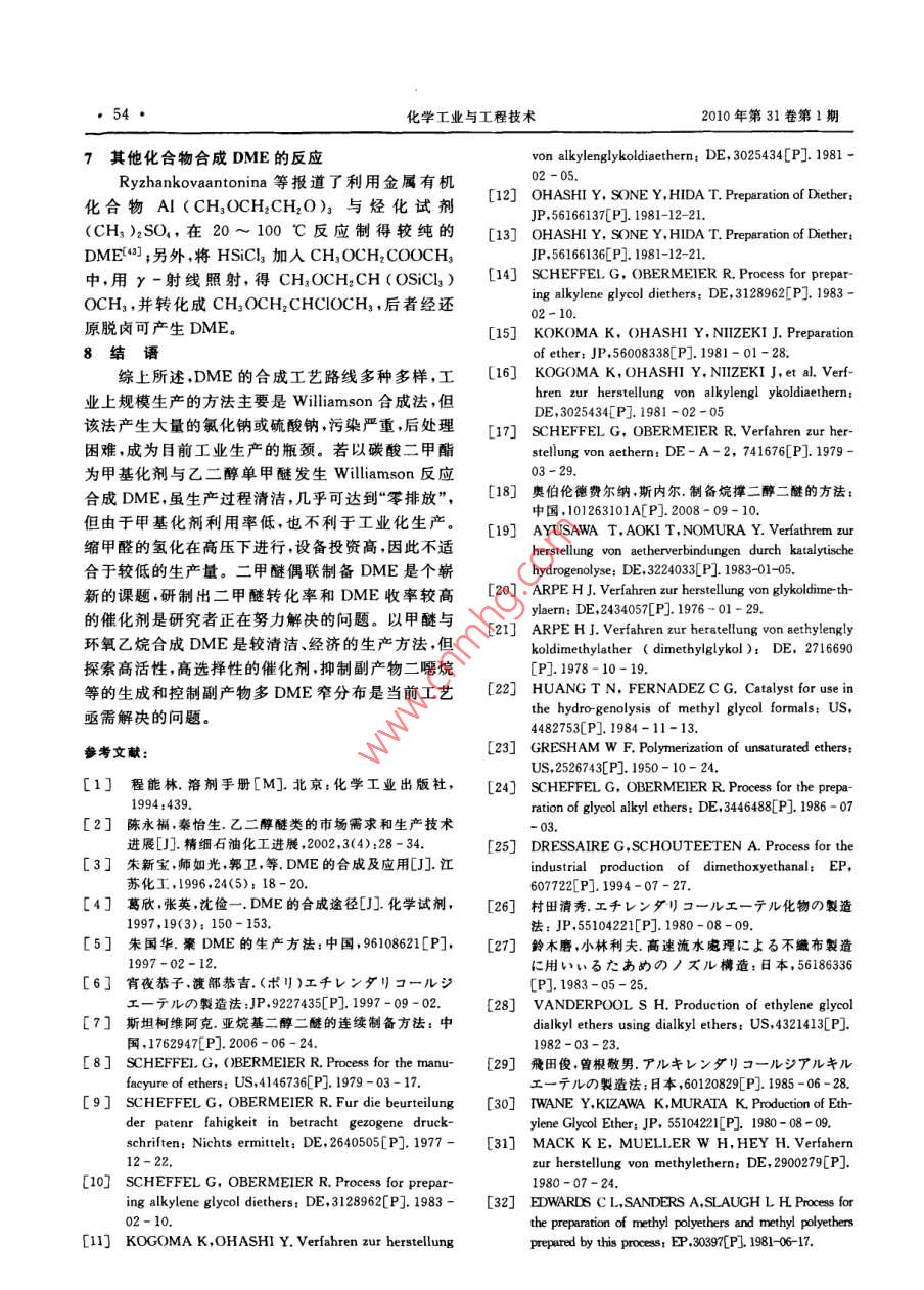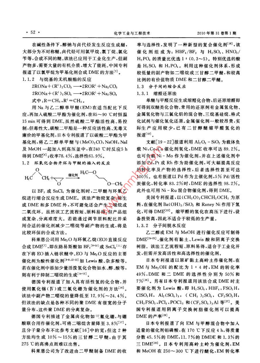第31卷第1期化學(xué)工業(yè)與工程技術(shù)Vol. 31 No. 12010年2月Journal of Chemical Industry &engineeringFeb.2010乙二醇二甲醚的合成研究進(jìn)展徐文娟,何學(xué)峰2,朱新寶12(1.南京林業(yè)大學(xué)化工學(xué)院江蘇南京210037;2.連云港致遠(yuǎn)化工有限公司,江蘇連云港222228摘要:介紹了氧烴化、乙烯加成氫解氯化物分子間的消除、甲醚的偶聯(lián)等反應(yīng),綜述了生產(chǎn)與合成醇二甲醚的方法包括其工藝流程催化劑和反應(yīng)條件,并重點(diǎn)介紹了 williamson合成法以及由環(huán)氧化合物開環(huán)與二甲醚的插入反應(yīng)合成乙二醇二甲醚的合成工藝路線的研究進(jìn)展,認(rèn)為由碳酸二甲酯與乙二醇單甲醚以及甲醚與環(huán)氧乙烷制備乙二醇二甲醚具有重大應(yīng)用前景。關(guān)鍵詞:乙二醇二甲醚;催化劑;反應(yīng);合成中圖分類號(hào):TQ317文獻(xiàn)標(biāo)識(shí)碼:A文章編號(hào):1006-7906(2010)01-0051-05Research progress of synthesis of 1, 2-dimethoxyethanXU Wenjuan', HE Xuefeng, ZHU Xinbao.(1. Department oftry,Nanjing Forestry University, N2. Lianyungang Zhiyuan Chemical Industry Co, Ltd, Lianyuangang 222228, ChinaAbstract: The production and synthesis of 1, 2-dimethoxyethane are reviewed from several methods such as O-alkylationaddition of ethylene, hydrogenolysis, elimination between chlorides, Cadiot-Chodkiewicz of dimethyl ether, etc. The discus-sions are also made on processes, catalysts and reaction conditions. The methods of Williamson synthesis method and the ringopening of ethylene oxide and insertion of dimethyl ether are also reviewed. The development status of preparing 1,2-dime-thoxyethane from methoxyethane and dimethyl carbonate or dimethyl ether and epoxyethane is presented.Key words: 1, 2-Dimethoxyethane: Catalyst: Reaction: Synthesis乙二醇二甲醚(簡稱DME)具有穩(wěn)定的化學(xué)性更經(jīng)濟(jì)可行的實(shí)驗(yàn)方案,本文將對各種合成路線作質(zhì)和溶解性能,是工業(yè)上和實(shí)驗(yàn)室廣泛使用的溶劑,進(jìn)一步闡述同時(shí)也可用于醫(yī)藥抽提劑和有機(jī)中間體山。此外,1O-烴化反應(yīng)它是良好的表面涂料溶劑和軍用噴氣式飛機(jī)燃料抗1.1 williamson合成法凍添加劑;也可作金屬和玻璃的清洗劑;還可用于化DME長期以來被作為極性情性溶劑。wil-妝品工業(yè)、香料工業(yè)、醫(yī)藥工業(yè)、油田工業(yè)等多領(lǐng) lamson法合成DME已在工業(yè)上應(yīng)用,該法由于消域(,應(yīng)用非常廣泛耗氯和堿,以及反應(yīng)后氯化鈉的分離而具有低經(jīng)濟(jì)目前國外乙二醇二甲醚的使用越來越廣泛,在日性。原料堿為Na與NaOH等。利用金屬鈉時(shí)操作本高品質(zhì)的乙二醇二甲醚應(yīng)用于電池電子原件等供簡單,產(chǎn)品易得,但工藝要求高,且金屬鈉昂貴,使成不應(yīng)求常需進(jìn)口來滿足需求;美國科萊恩有限公司本升高。利用NaOH時(shí),副產(chǎn)物較多,分離較復(fù)雜,也大量生產(chǎn)乙二醇二甲醚銷往世界各地;印度對乙二因此,工業(yè)上一般使用片堿氫氧化鈉為原料。日前醇二甲醚的需求也是與日俱增。而我國對乙二醇二甲 williamson合成法是工業(yè)生產(chǎn)DME的主要方法。醚的開發(fā)利用還需要進(jìn)一步的探索研究。近年來,乙1.1.1與鹵代烷反應(yīng)二醇二甲醚市場需求量正在不斷的增大,且應(yīng)用不斷拓寬,除用作氣體吸收劑、萃取劑和脫漆劑外,還用于RX+Rl-ONa R-R R!+NaX(R-CH, R-CH,電化學(xué)、高分子材料的聚合材料、有機(jī)化合物醫(yī)藥中間體的合成、工業(yè)品添加劑清洗劑復(fù)配物粘接劑復(fù)收稿日期:2009-07-28配物、制備硼化物和有機(jī)金屬等領(lǐng)域作者簡介:徐文娟(1985-),女,山東菏澤人,碩士,研究方向精細(xì)有機(jī)合成乙二醇二甲醚的合成路線很多,朱新寶等與Ermail:hiwenjuan@126.com葛欣“報(bào)道了DME的多種合成路線。為了篩選出通訊聯(lián)系人:朱新寶化學(xué)T業(yè)與工程技術(shù)2010年第31卷第1期在堿性條件下,醇鈉與鹵代烴發(fā)生反應(yīng)生成醚,率與選擇性,發(fā)明了一種新型的復(fù)合催化劑1,該大部分為不對稱醚。鹵代烴可用氯甲烷、氯丁烷、氯化催化劑組成為:HBF4/BF3與H2SO4、HNO3芐等合成不同的醚該法已應(yīng)用于工業(yè)化生產(chǎn),但副H2PO4的質(zhì)量比優(yōu)選1:(0.3~5)。特別優(yōu)選的酸產(chǎn)物多需要大量的有機(jī)介質(zhì),增大了能耗。中國專利是H2SO4和H3PO4。利用這種催化劑體系,形成報(bào)道了以氯甲烷為甲基化劑合成DME的方法。較低量的副產(chǎn)物如二噶烷或三甘醇二甲醚,和較高1.1.2與烷基的無機(jī)酸酯的反應(yīng)比例的有價(jià)值物質(zhì)DME和二甘醇二甲醚2RONa+(R')2 CO3-2ROR+Na, cO1.3分子間的縮合反應(yīng)2RONa+(R),SO -2ROR+Na, SO.1.3.1縮醛還原法式中:R=CH3,R=CH3單醚與甲醛反應(yīng)生成縮醛化合物,后還原縮醛即用Na與乙二醇單甲醚(EM)在適當(dāng)配比下反可得到雙醚類化合物。常用的還原劑有金屬氫化物應(yīng),再加入硫酸二甲酯為催化劑,在85~90℃時(shí)恒溫金屬氫化物與三氯化鋁的混合物、三烷基硅烷、格式15min可得到DME雖然硫酸二甲酯活性高、易控化試劑與催化氫化還原。金屬催化劑一般較昂貴,實(shí)制但毒性大。碳酸二甲酯是一種反應(yīng)活性高無毒又際生產(chǎn)應(yīng)用較少,已有二甘醇醚縮甲醛氫化的廉價(jià)的甲基化劑,日本專利報(bào)道了以碳酸二甲酯為甲報(bào)道)基化劑,將乙