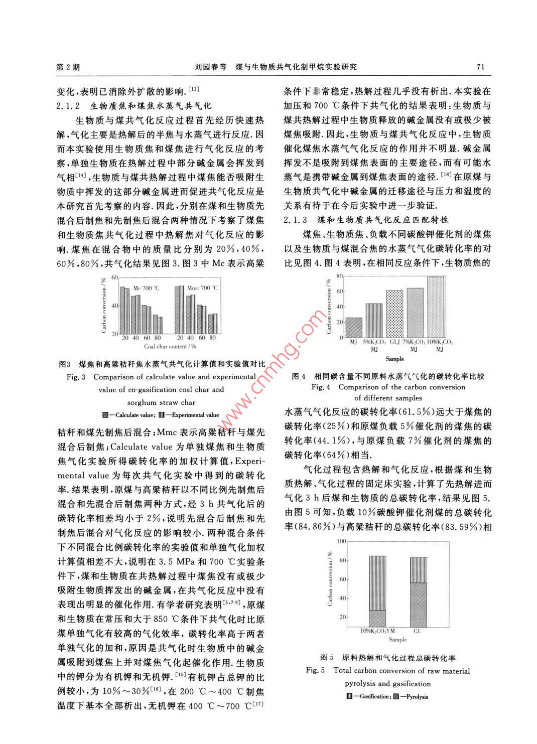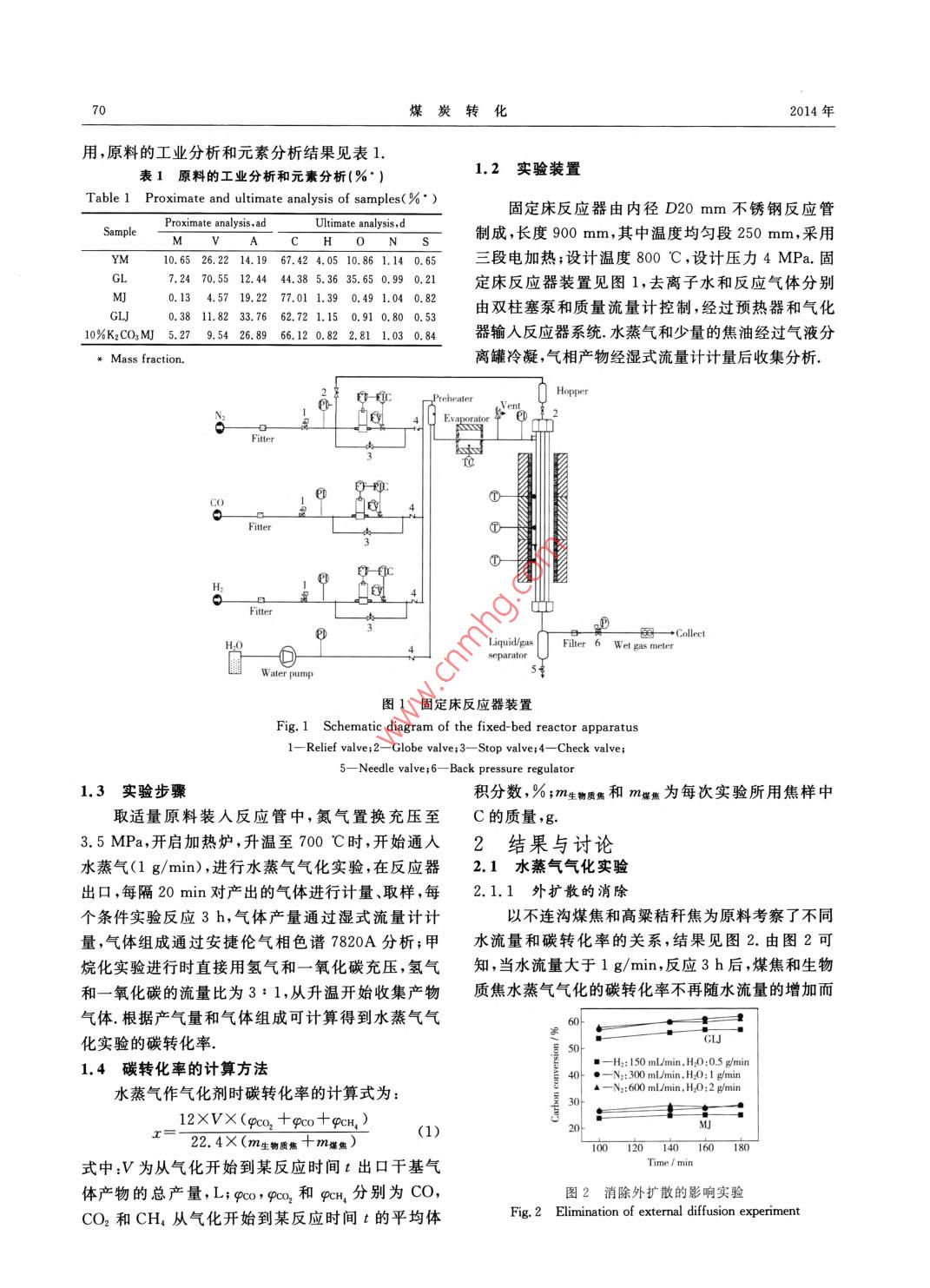 第37卷第2期煤炭轉(zhuǎn)化 Vol.37 No.22014年4月 COAL CONVERSION Apr. 201煤與生物質(zhì)共氣化制甲烷實驗研究劉園春1)李克忠2)熊志建3張榮3畢繼誠甘中學(xué)5摘要以煙煤和高粱秸稈為研究對象,在小型加壓固定床反應(yīng)器上考察了壓力3.5Ma及溫度700℃條件下制焦方式、煤/生物質(zhì)混合比和氣固接觸時間對煤與生物質(zhì)共氣化制取富甲烷氣體過程中水蒸氣氣化反應(yīng)和甲烷化反應(yīng)的影響結(jié)果表明,對于水蒸氣氣化反應(yīng),煤焦和生物質(zhì)焦共氣化時不能觀察到明顯的協(xié)同作用;對于甲烷化反應(yīng),高粱秸稈焦的甲烷化反應(yīng)活性高于煤焦的甲烷化反應(yīng)活性,當(dāng)對高粱秸稈水洗后,高粱秸稈焦的甲烷化反應(yīng)活性降低至與煤焦的甲烷化反應(yīng)活性相當(dāng),分析表明,水洗后高粱秸稈焦堿金屬鉀的含量顯著降低,說明高粱秸稈焦中堿金屬鉀的存在是高粱秸稈焦甲烷化反應(yīng)活性較高的主要原因增加氣固接觸時間,有利于提高甲烷產(chǎn)率關(guān)鍵詞生物質(zhì),共氣化,甲烷化,堿金屬中圖分類號TQ546.2能耗,若利用堿金屬含量相對較高的生物質(zhì)與煤進0引言行共氣化,不僅可避免催化劑回收或降低催化劑回我國是一個富煤、貧油、少氣的國家,在一次能收成本,而且可為生物質(zhì)規(guī)模高效利用提供一條有源結(jié)構(gòu)中,煤炭約占70%,石油約占23%,而天然氣效途徑,具有較好的經(jīng)濟效益和環(huán)境效益國內(nèi)外學(xué)僅占2%近年來,我國天然氣消費量以近1%的速者對煤和生物質(zhì)共氣化進行了較多的研究,重點是度增長,預(yù)計2020年缺口將達到2000億m3,對外從煤和生物質(zhì)混合顆粒的流化特性3、反應(yīng)過程依存度也將達到50%,嚴重影響了我國的能源安的協(xié)同效應(yīng)5和共氣化的工藝條件優(yōu)化[012等方全,并將制約我國經(jīng)濟和社會的發(fā)展.同時,我國煤面進行較為系統(tǒng)的研究,主要是以合成氣為目標(biāo)產(chǎn)炭傳統(tǒng)利用模式以燃燒利用為主,存在能量利用率物,研究的溫度范圍在800℃~1000℃,壓力一般低和污染重等諸多問題.利用我國豐富的煤炭資源,小于0.6MPa,而以甲烷為目標(biāo)產(chǎn)物時,要求反應(yīng)在將煤轉(zhuǎn)化為天然氣,不僅可以填補傳統(tǒng)天然氣市場低溫(小于800℃)、高壓(大于3.0Mpa)及催化劑的供求缺口,更好地滿足城鎮(zhèn)化擴大的需求,而且可存在下進行,以甲烷為目標(biāo)產(chǎn)物的煤和生物質(zhì)共氣以較好地改善我國能源消費結(jié)構(gòu).煤制合成天然氣化研究未見文獻報道.本研究使用固定床反應(yīng)器,考過程主要有煤經(jīng)“氣化后再催化合成”的兩步法和煤察了在低溫高壓及不同操作條件下,生物質(zhì)中堿金“原位直接轉(zhuǎn)化”的一步法.兩步法的主要特點是先屬對水蒸氣氣化反應(yīng)和甲烷化反應(yīng)活性的影響,為流在高溫氣化爐中氣化得到H2和CO,然后在甲烷化化床共氣化反應(yīng)器的設(shè)計和操作提供理論依據(jù).反應(yīng)器中把H2和CO合成為甲烷,過程的計算熱1實驗部分效率約60%;煤催化氣化屬于“原位直接轉(zhuǎn)化”的一步法,主要特點是煤在較低溫度(650℃~750℃)和1.1原料較高壓力(3.0MPa~4.0MPa)下,通過催化劑的選用內(nèi)蒙古不連溝煙煤(YM)和山西太原郊區(qū)催化作用,將煤在氣化爐內(nèi)直接轉(zhuǎn)化為富含CH4的的高粱秸稈(GL)為原料,將煤和生物質(zhì)在壓力合成氣,此過程的計算熱效率比兩步法的計算熱效3.5MPa,溫度700℃的氮氣氣氛固定床內(nèi)熱解率約高10%.2煤催化氣化產(chǎn)業(yè)化的難點之一是催60min后得到不連溝煤焦(MJ)和高粱秸稈焦化劑的回收獲取較高的催化劑回收率需要較高的(GLJ),粉碎至60目~80目(180m~250m)備國際科技合作計劃資助項目(2011DFA60610)和煤轉(zhuǎn)化國家重點實驗室自主研究課題(2011BWZ002)1)碩生中國科學(xué)院山西煤炭化學(xué)研究所煤轉(zhuǎn)化國家重點實驗0301太原中國科學(xué)院大100049北京2助理研究員3)副研究員;4)研究員,中國科學(xué)院山西煤炭化學(xué)研究所煤轉(zhuǎn)化國家重點實驗室,030001太原;5)博士、教授新奧科技發(fā)展有限公司煤基低碳能源國家重點實驗室,65001河北廊坊收稿日期:2013-04-04;修回日期:2013-05-0670煤炭轉(zhuǎn)化2014年用,原料的工業(yè)分析和元素分析結(jié)果見表1表1原料的工業(yè)分析和元素分析(%1.2實驗裝置 Table Proximate and ultimate analysis of samples(%)P固定床反應(yīng)器由內(nèi)徑D20mm不銹鋼反應(yīng)管 Proximate analysis,ad Ultimate analysis,d Sample M V A CH NS制成,長度900mm,其中溫度均勻段250mm,采用y10.6526.2214.1967.424.0510.861.140.65三段電加熱;設(shè)計溫度800℃,設(shè)計壓力4MPa.固G7.2470.5512.44.85.3635.650.990.21定床反應(yīng)器裝置見圖1,去離子水和反應(yīng)氣體分別mj0.13.57.227.01.390.491.040.82glJ0.3811.8233.7662.721.150.910.800.53由雙柱塞泵和質(zhì)量流量計控制,經(jīng)過預(yù)熱器和氣化10%K2CO3MJ5.279.5426.8966.120.822.811.030.84器輸入反應(yīng)器系統(tǒng)水蒸氣和少量的焦油經(jīng)過氣液分 Mass fraction.離罐冷凝,氣相產(chǎn)物經(jīng)濕式流量計計量后收集分析. Hopper Fitter4① Fitter3①H Fitter Collect H. Liquid/gas Filter Wet gas meter separator Water pump5圖1固定床反應(yīng)器裝置 Fig. Schematic diagram of the fixed-bed reactor apparatus 1-Relief valve; 2-Globe valve; 3-Stop valve: 4-Check v