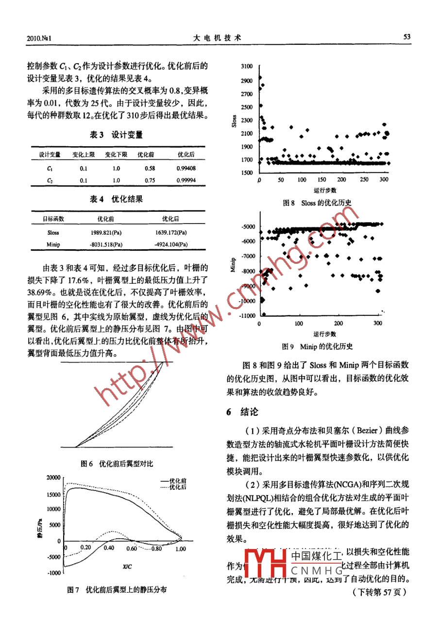 5基于組合優(yōu)化方法的平面葉柵優(yōu)化設(shè)計(jì)2010.N21朱國(guó)俊,羅興銪,郭鹛程,戴辰辰(西安理工大學(xué)水利水電學(xué)院,西安710048)[摘要] 采用奇點(diǎn)分布法與貝塞爾(Bezier)曲線參數(shù)化方法相結(jié)合 的平面葉柵設(shè)計(jì)方法進(jìn)行葉柵的初步設(shè)計(jì)與參數(shù)化表達(dá)。該方法在完成設(shè)計(jì)的同時(shí)為基于現(xiàn)代優(yōu)化算法的葉柵粘性流動(dòng)最優(yōu)化設(shè)計(jì)提供設(shè)計(jì)變量,以實(shí)現(xiàn)葉柵翼型的變形控制。然后結(jié)合N-S方程流場(chǎng)數(shù)值模擬,采用多目標(biāo)遺傳算法(NCGA)和序列二次規(guī)劃法(NLPQL)組合的優(yōu)化算法,通過(guò)調(diào)節(jié)葉柵翼型的形狀控制參數(shù)對(duì)葉柵的總壓損失和空化性能進(jìn)行了優(yōu)化。結(jié)果表明,優(yōu)化效果良好。[關(guān)鍵詞]貝塞爾曲線; 平面葉柵;優(yōu)化設(shè)計(jì);多目標(biāo)遺傳算法;序列二次規(guī)劃法[中圖分類號(hào)]TK730.2[文獻(xiàn)標(biāo)識(shí)碼] A{|文章編號(hào)] 100-3983 (2010) 01-0050-042D Cascade Optimization Design Based on Parametric Bezier CurveZHU Guo jun, LUO Xing-qi, GUO Peng cheng, DAI Chen-chen(Faculty of Water Resources and Hydraulic Power, Xi' an University of Technology, Xi an 710048, China)Abstract: Use the method which combined singularities method with parametric method of Beziercurve to design and represent initial 2D cascade. This method provides 2D cascade optimizationdesigns based on modern optimization tools with design variables at the time which design wascompleted, so it could achieve the deformation of airfoil. Use the Navie-Stokes equation to carryout the numerical simulation of viscous flow in cascade. The optimization algorithm whichcombined Multi-objective Genetic Algorithm(NCGA) with NLPQL algorithm was used forexploration . By modifying the shape parameters of cascade profile, the total pressure loss andsuction performance were optimized. The results show that the method have good performance onoptimization.Key words: bezier curve; 2D cascade; optimization design; MOGA; NLPQL法的設(shè)計(jì)周期變長(zhǎng)。1引言近年來(lái)國(guó)內(nèi)外流行的優(yōu)化設(shè)計(jì)方法提供了新的葉水輪機(jī)的性能在很大程度上決定了整個(gè)電站的經(jīng)片設(shè)計(jì)思路,即先通過(guò)初始設(shè)計(jì)方法設(shè)計(jì)出葉片的幾濟(jì)效益,而轉(zhuǎn)輪作為整個(gè)水輪機(jī)的核心部件,其工作何形狀,然后將其表達(dá)成設(shè)計(jì)參數(shù),而性能則表達(dá)成性能又影響著整個(gè)水輪機(jī)組的優(yōu)劣,因此,轉(zhuǎn)輪的設(shè)隨設(shè)計(jì)參數(shù)變化的目標(biāo)函數(shù)。所以優(yōu)化設(shè)計(jì)過(guò)程就是計(jì)及其優(yōu)化在水輪機(jī)改進(jìn)和提高的過(guò)程中具有不可替根據(jù)目標(biāo)函數(shù),選擇設(shè)計(jì)參數(shù)使得性能最佳。該過(guò)程代的重要地位。是一個(gè)自動(dòng)化的過(guò)程,無(wú)需人工干預(yù),因此,大大縮長(zhǎng)期以來(lái),人們力圖通過(guò)理論計(jì)算設(shè)計(jì)出優(yōu)良的短了設(shè)計(jì)周期。轉(zhuǎn)輪,但轉(zhuǎn)輪內(nèi)部的流動(dòng)規(guī)律極為復(fù)雜,其流動(dòng)參數(shù)本文根據(jù)上述新的葉片優(yōu)化設(shè)計(jì)思路,開發(fā)了基和幾何參數(shù)之間的關(guān)系也難以確定,所以試驗(yàn)技術(shù)和于奇點(diǎn)分布法和貝塞爾( Bezier )曲線參數(shù)造型方法CFD數(shù)值模擬技術(shù)在轉(zhuǎn)輪性能的改善過(guò)程中處于絕的軸流式水輪機(jī)平面葉柵設(shè)計(jì)方法,并通過(guò)多目標(biāo)遺對(duì)地位。而由于試驗(yàn)需要耗費(fèi)大量的資金和時(shí)間,因傳算法(NCGA )和序列二次規(guī)劃法(NLPQL)相結(jié)此,“初始設(shè)計(jì)-→FD數(shù)值模擬- +改設(shè)計(jì)”的方法更被合的組合優(yōu)化方法對(duì)生成的平面葉柵翼型進(jìn)行了優(yōu)國(guó)內(nèi)各大廠家所青睞。但是在“修改設(shè)計(jì)”這-步多化。中國(guó)煤化工靠人工經(jīng)驗(yàn),缺乏計(jì)算機(jī)輔助優(yōu)化,這也導(dǎo)致了該方MHCNMHG葉柵的設(shè)計(jì)方法是先采用奇點(diǎn)分布法設(shè)計(jì)出翼型基金項(xiàng)目:國(guó)家自然科學(xué)基金重點(diǎn)項(xiàng)目(90410019)2010.N1大電機(jī)技術(shù)51骨線并將骨線用Bezier曲線參數(shù)化,這樣可以通過(guò)控算網(wǎng)格采用六面體的結(jié)構(gòu)化網(wǎng)格,單周期通道網(wǎng)格拓制參數(shù)的變化來(lái)變化骨線形狀。然后把優(yōu)秀翼型的厚撲結(jié)構(gòu)如圖3,計(jì)算網(wǎng)格如圖4,網(wǎng)格數(shù)為80 x 40。度疊加到骨線上,這樣就形成了通過(guò)控制參數(shù)的變化在優(yōu)化的過(guò)程中,葉柵翼型是在不斷變化的,所來(lái)變化葉柵翼型。以,計(jì)算網(wǎng)格也需要隨若翼型的變化而不斷調(diào)整,為奇點(diǎn)分布法是在假定來(lái)流為無(wú)旋有勢(shì)流動(dòng)、葉片此,采用程序?qū)⑾嗤木W(wǎng)格拓?fù)浣Y(jié)構(gòu)應(yīng)用到不同的翼無(wú)限薄的前提下用一系列分布在翼型骨線上的奇點(diǎn)來(lái)型通道上,并讓其自動(dòng)映射,即可實(shí)現(xiàn)網(wǎng)格的調(diào)整。代替葉柵中的翼型對(duì)水流的作用,這些奇點(diǎn)是-系列的源、匯和旋渦,原來(lái)翼型圍成線的位置是流線。只要恰當(dāng)?shù)剡x擇奇點(