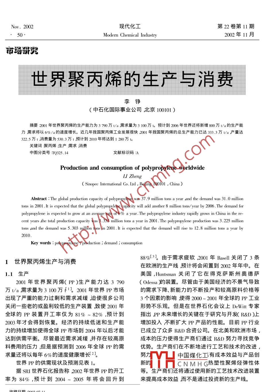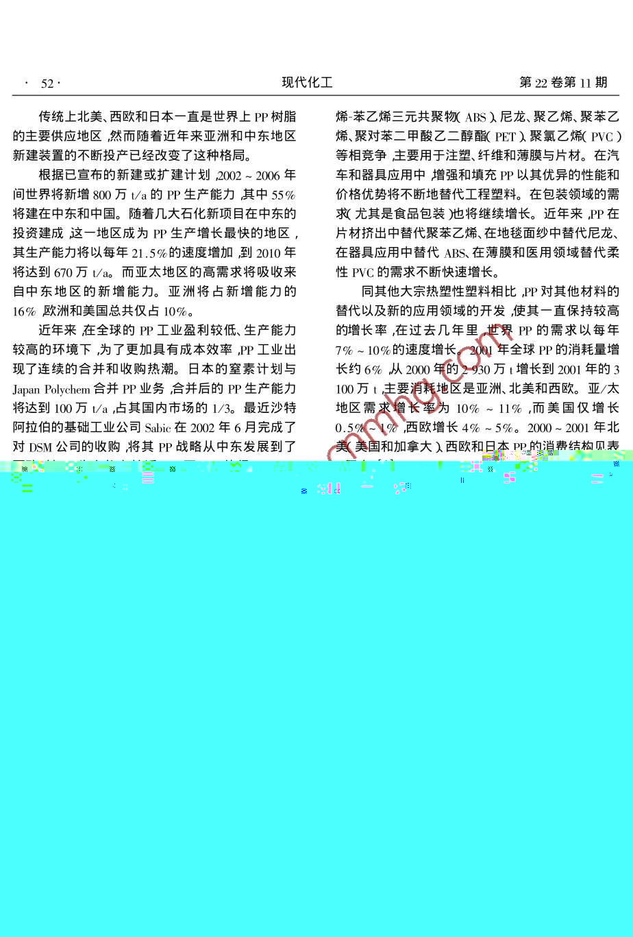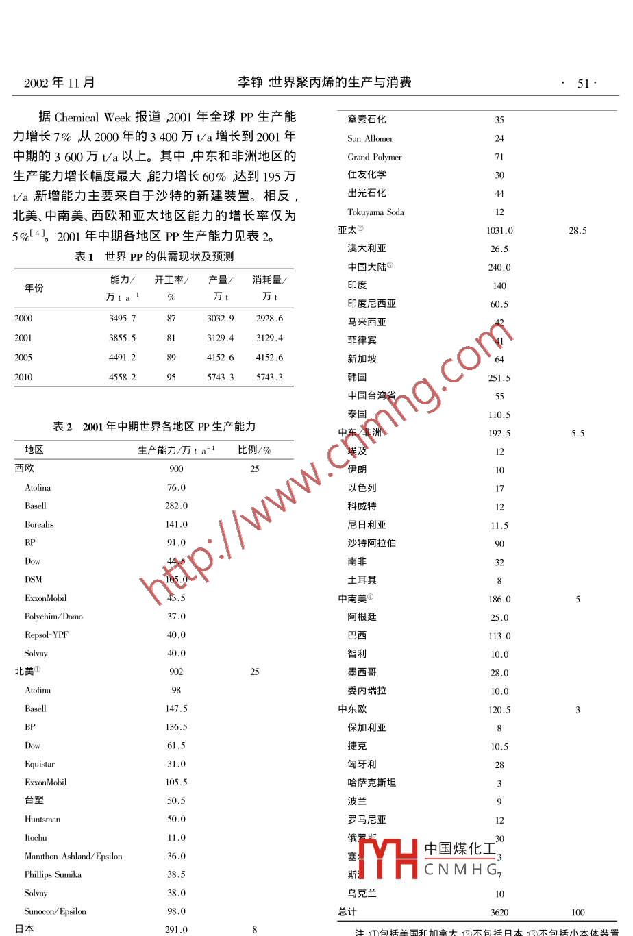 Nov.2002現(xiàn)代化工第22卷第11期50Modern chemical Industr2002年11月市場(chǎng)研究世界聚丙烯的生產(chǎn)與消費(fèi)李錚(中石化國(guó)際事業(yè)公司北京100101)摘要2001年世界聚丙烯的生產(chǎn)能力為3790萬(wàn)Ua需求量為3100萬(wàn)to預(yù)計(jì)到2006年世界還將新增800萬(wàn)t/a的生產(chǎn)能力需求將以6%/a的速度增長(zhǎng)。近幾年我國(guó)聚丙烯工業(yè)發(fā)展很快2001年我國(guó)聚丙烯的總生產(chǎn)能力已達(dá)333萬(wàn)ta產(chǎn)量達(dá)22.5萬(wàn)t消費(fèi)量為530.3萬(wàn)t預(yù)計(jì)到2010年將達(dá)到1280萬(wàn)t關(guān)鍵詞聚丙烯泩產(chǎn)需求消費(fèi)中圖分類(lèi)號(hào):Q925.14文獻(xiàn)標(biāo)識(shí)碼:AProduction and consumption of polypropylene worldwideL I ZhenSinopec International Co Ltd, Beijing 100101, ChinaAbstract: The global production capacity of polypropylene was 37.9 million tons a year and the demand was 31. 0 millionns in 2001. It is expected that the global polypropylene capacity will add another 8 million tons/year by 2006. The demand fopolypropylene is expected to grow at an average rate of 6% a year. The polypropylene industry rapidly grows in Chinacent years the total production capacity was 3. 333 million tons a year in 2001. The polypropylene production was 3. 225 milliontons and the demand was 5. 303 million tons in 2001. It is expected that the demand will rise to 12. 8 million tons a year by2010Key words polypropylene i production i demand i consumption1世界聚丙烯生產(chǎn)與消費(fèi)88%3由于需求疲軟,2001年 Basell關(guān)閉了3條在歐洲的生產(chǎn)線預(yù)計(jì)將會(huì)閑置到2002年年中。在1.1生產(chǎn)美國(guó), Huntsman關(guān)閉了它在得克薩斯州奧德薩2001年世界聚丙烯(P)生產(chǎn)能力達(dá)3790(0desa)的裝置。盡管由于美國(guó)經(jīng)濟(jì)的不景氣導(dǎo)致萬(wàn)ta需求量為3100萬(wàn)「'。200年世界P市場(chǎng)的需求下降、新能力的不斷投產(chǎn)和較高原料價(jià)格等出現(xiàn)了嚴(yán)重的能力過(guò)剩和需求減緩迫使很多公司3個(gè)因素的影響使得2000~2001年全球的PP工業(yè)關(guān)閉一些老的或盈利較低的生產(chǎn)裝置致使2001年形勢(shì)不樂(lè)觀。但是在世界石化會(huì)議上 De witt專(zhuān)家全球的P裝置開(kāi)工率僅為81%~82%,預(yù)計(jì)到指出PP未來(lái)增長(zhǎng)的關(guān)鍵在于研究與開(kāi)發(fā)(R&D)2003年才會(huì)得到恢復(fù)。經(jīng)濟(jì)的持續(xù)低迷和生產(chǎn)能增加投入不斷擴(kuò)大PP產(chǎn)品的性能。目前P行業(yè)力的持續(xù)增加使得全球P市場(chǎng)到2004年以后才能已成立了眾多R&D合資公司。在北美和歐洲市場(chǎng),達(dá)到供需平衡。盡管最近需求減緩并存在較高原成本的壓力使得生產(chǎn)商們通過(guò)R&D努力尋找競(jìng)爭(zhēng)料費(fèi)用的壓力,但是據(jù)預(yù)測(cè)到2006年全球PP的需優(yōu)勢(shì)。生產(chǎn)商們?cè)诓粩嗟剡M(jìn)行工藝和技術(shù)的改進(jìn),求量還將以每年6%的速度健康增長(zhǎng)2]。努力V山中國(guó)煤化工有成本效益與產(chǎn)品創(chuàng)世界PP的供需現(xiàn)狀及預(yù)測(cè)見(jiàn)表1。CNMHG熱塑性聚烯烴彈性體據(jù)SRI世界石化報(bào)告稱(chēng)200年世界PP的開(kāi)工等。生產(chǎn)商們還將通過(guò)使用新的工藝技術(shù)改進(jìn)裝置率為84%,預(yù)計(jì)到2004~2005年將會(huì)回升到來(lái)提高成本效益而不是通過(guò)投資新的生產(chǎn)線。收稿日期2002作者簡(jiǎn)介寫(xiě)每年生碩士工程師從事石化裝置的技術(shù)引進(jìn)工作。2002年11月李錚世界聚丙烯的生產(chǎn)與消費(fèi)51據(jù) Chemical Week報(bào)道200l年全球PP生產(chǎn)能窒素石化力增長(zhǎng)7%從2000年的3400萬(wàn)t/a增長(zhǎng)到2001年中期的3600萬(wàn)t/a以上。其中中東和非洲地區(qū)的Grand polymer生產(chǎn)能力增長(zhǎng)幅度最大能力增長(zhǎng)60%達(dá)到195萬(wàn)住友化學(xué)t/a新增能力主要來(lái)自于沙特的新建裝置。相反出光石化北美、中南美、西歐和亞太地區(qū)能力的增長(zhǎng)率僅為5%42001年中期各地區(qū)PP生產(chǎn)能力見(jiàn)表2。亞太1031.0澳大利亞表1世界PP的供需現(xiàn)狀及預(yù)測(cè)中國(guó)大陸能力/開(kāi)工率/產(chǎn)量/消耗量年份印度萬(wàn)印度尼西032.92928.6馬來(lái)西亞3855.53129.43129.4菲律賓4491.24152.64152.6新加坡4558.25743.35743.3韓國(guó)中國(guó)臺(tái)灣省110.5表22001年中期世界各地區(qū)PP生產(chǎn)能力中東/非洲生產(chǎn)能力萬(wàn)t比例埃及伊朗Atofina76.0以色列Basell282.0borealis141.0尼日利亞91.0沙特阿拉伯南非土耳其Exxonmobil中南美①阿根廷Repsol-YPl13.040.0智利北美①墨西哥28,0Atofina委內(nèi)瑞拉147.5120.5利亞克31.0匈牙利ExxonMobil105.5哈薩克斯坦臺(tái)塑Huntsman羅馬尼亞Itochu11.0俄中國(guó)煤化工CNMHG38.0烏克蘭3620l00日本291.0注①包括美國(guó)和加拿大不包括日本不包括小本體裝置JmnP而布數(shù)據(jù)能力④包括墨西哥。52現(xiàn)代化工第22卷第11期傳統(tǒng)上北美、西歐和日本一直是世界上PP樹(shù)脂烯-苯乙烯三元共聚物ABS)尼龍、聚乙烯、聚苯乙的主要供應(yīng)地區(qū)然而隨著近年來(lái)亞洲和中東地區(qū)烯、聚對(duì)苯二甲酸乙二醇醒PEI聚氯乙烯(PVC)新建裝置的不斷投產(chǎn)已經(jīng)改變了這種格局等相競(jìng)爭(zhēng)主要用于注塑、纖維和薄膜與片材。在汽根據(jù)已宣布的新建或擴(kuò)建計(jì)劃2