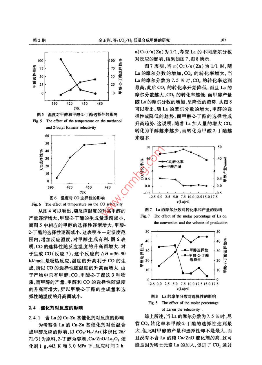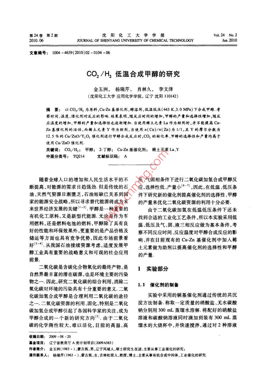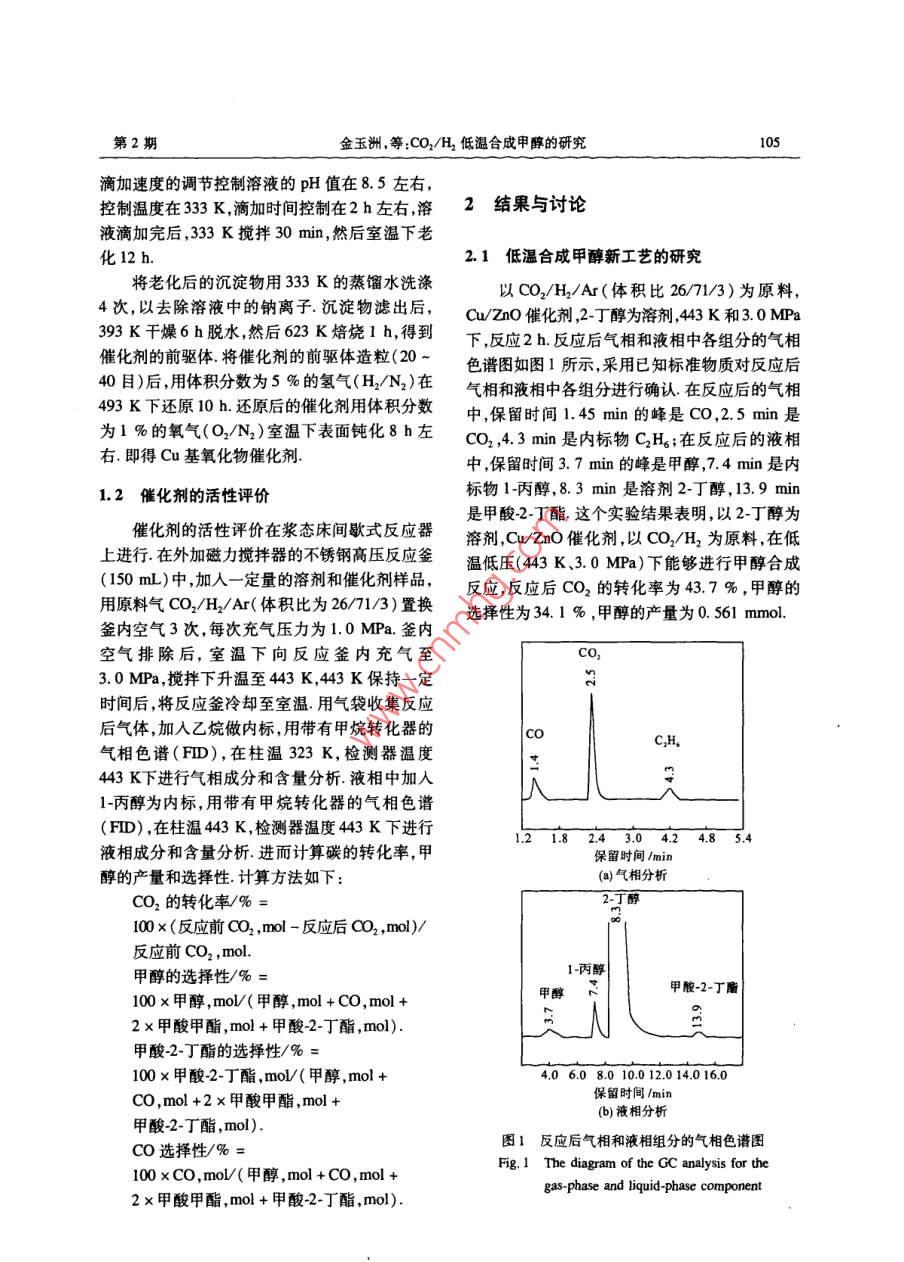 第24卷第2期沈陽化工大學(xué)學(xué)報VoL 24 No. 22010.06JOURNAL OF SHENYANG UNTVERSITY OF CHEMICAL TECHNOLOGYJun.2010文章編號:1004-4639(2010)02-0104-06cO2/H2低溫合成甲醇的研究金玉洲,楊瑞芹,肖林久,李文澤(沈陽化工大學(xué)應(yīng)用化學(xué)學(xué)院,遼寧沈陽110142)摘要:以CO2/H2為原料,Cuzn基催化劑,醇溶劑,低溫低壓(43K、3.0MPa)下合成甲醇.考察時間、溫度、催化劑對反應(yīng)的影響.結(jié)粟表明,隨反應(yīng)時間的增加,甲醇的產(chǎn)量和選擇性增加,隨反應(yīng)溫度的增加,甲醇的產(chǎn)量和選擇性也逐漸增加,當使用稀土元素La作為助劑時,并不能提高Cu-Zn基催化劑的活性,而稀土元素Y作為助劑,當使用n(Cu)/n(zn)為1/1,且Y的摩爾分數(shù)為12.5%的Cu/ZnOY2O3催化劑進行甲醇合成反應(yīng)時,CO2的轉(zhuǎn)化率、甲醇的選擇性和產(chǎn)量均高于使用 Cu/zno催化劑關(guān)鍵詞:CO2/Hl2;甲醇;2丁醇;Cuzn基催化劑;稀土元素La、Y中圖分類號:TQ214文獻標識碼:A隨著全球人口的增加和人民生活水平的不壓、氣固相條件下進行二氧化碳加氫合成甲醇反斷提高,對能源的需求日趨強勁但是傳統(tǒng)的石應(yīng),選擇性低、產(chǎn)量小6”,因此,在低溫、低壓條油、天然氣資源日漸匱乏,石油短缺已關(guān)系到國件下研究新的催化劑提高催化劑的選擇性、甲醇家的能源安全戰(zhàn)略所以尋求替代能源將成為未的產(chǎn)量來優(yōu)化二氧化碳資源的利用十分必要來世界經(jīng)濟發(fā)展的關(guān)鍵-2.甲醇是一種重要的由于二氧化碳加氫在低溫低壓條件下還未有機化工原料又是新型代能源無論是作為車找到合適的工業(yè)化工藝條件,所以本實驗采用低用燃料還是燃料電池的燃料甲醇除了具有良溫、低壓及氣、固、液三相反應(yīng)做為基本條件,考好的性能和環(huán)保效果外更重要的是產(chǎn)品價格及察不同反應(yīng)時間反應(yīng)溫度對甲醇合成反應(yīng)的影儲運等方面也具有競爭優(yōu)勢,因此市場前景看響并在目前現(xiàn)有的CuZn基催化劑中加入稀好3-,從我國石油接續(xù)資源考慮適度發(fā)展甲土元素做為助劑以提高催化劑的選擇性和甲醇醇工業(yè)具有重要的戰(zhàn)略意義和可觀的社會應(yīng)用的產(chǎn)量前景.二氧化碳是含碳化合物氧化的最終產(chǎn)物,是1實驗部分自然界最豐富的潛在碳源,也是環(huán)境主要的污染物之一因此研究二氧化碳的綜合利用消除二1.1催化劑的制備氧化碳對環(huán)境的污染具有十分重要的意義.二氧化碳加氫合成甲醇是合理利用二氧化碳的途徑實驗中采用的銅基催化劑通過傳統(tǒng)的共沉之一.二氧化碳資源的利用、固化,特別是二氧化淀方法制備稱取一定質(zhì)量的硝酸鹽無水碳酸碳加氫合成甲醇引起了各國科學(xué)家的關(guān)注,成為鈉分別用300mL蒸餾水溶解將配好的硝酸鹽甲醇合成的一個新的研究方向5.由于二氧化溶液和碳酸鈉溶液同時滴加到裝有300mL蒸碳的化學(xué)隋性較大,難以活化,目前的高溫、高餾水的大燒杯中,并快速攪拌,通過對2種溶液收稿日期:200908-2基金項目:遼寧省教育廳A類計劃項目(2009A583)作者簡介:金玉洲(1983-),蒙古族男,遼寧風(fēng)城人,碩士研究生在讀,主要從事工業(yè)催化的研究聯(lián)系人:楊瑞芹(1963-),蒙古族,女吉林松原人,教授博士,主要從事有機合成中間體,工業(yè)催化的研究第2期金玉洲等:CO2/H2低溫合成甲醇的研究105滴加速度的調(diào)節(jié)控制溶液的pH值在8.5左右,控制溫度在33K,滴加時間控制在2h左右,溶2結(jié)果與討論液滴加完后,333K攪拌30min,然后室溫下老化12h.21低溫合成甲醇新工藝的研究將老化后的沉淀物用333K的蒸餾水洗滌以CO2/H2/A(體積比26/71/3)為原料4次,以去除溶液中的鈉離子沉淀物濾出后u/ZnO催化劑,2-丁醇為溶劑,443K和3.0MPa393K干燥6h脫水然后623K焙燒1h,得到下,反應(yīng)2h反應(yīng)后氣相和液相中各組分的氣相催化劑的前驅(qū)體將催化劑的前驅(qū)體造粒(20-色譜圖如圖1所示采用已知標準物質(zhì)對反應(yīng)后40日)后,用體積分數(shù)為5%的氫氣(HN2)在氣相和液相中各組分進行確認在反應(yīng)后的氣相493K下還原10h還原后的催化劑用體積分數(shù)中保留時間1.45min的峰是Co,2.5mm是為1%的氧氣(O2/N2)室溫下表面鈍化8h左CO2,4.3min是內(nèi)標物C2H4;在反應(yīng)后的液相右.即得Cu基氧化物催化劑中,保留時間3.7min的峰是甲醇,7.4mn是內(nèi)1.2催化劑的活性評價標物1-丙醇,8.3min是溶劑2丁醇,13.9min是甲酸2丁酯這個實驗結(jié)果表明,以2-丁醇為催化劑的活性評價在漿態(tài)床間歇式反應(yīng)器溶劑czao催化劑,以cO/H2為原料在低上進行在外加磁力攪拌器的不銹鋼高壓反應(yīng)釜溫低壓(443K、30MPa)下能夠進行甲醇合成(150m)中,加人一定量的溶劑和催化劑樣品,反應(yīng),反應(yīng)后Co2的轉(zhuǎn)化率為437%,甲醇的用原料氣CO2/H2Ar(體積比為26/71/3)置換選擇性為341%,甲醇的產(chǎn)量為0.561mmol釜內(nèi)空氣3次,每次充氣壓力為10MPa.釜內(nèi)空氣排除后,室溫下向反應(yīng)釜內(nèi)充氣至3.0MPa,攪拌下升溫至443K,443K保持一定時間后,將反應(yīng)釜冷卻至室溫用氣袋收集反應(yīng)后氣體,加人乙烷做內(nèi)標,用帶有甲烷轉(zhuǎn)化器的氣相色譜(FID),在柱溫323K,檢測器溫度443K下進行氣相成分和含量分析.液相中加人1-丙醇為內(nèi)標,用帶有甲烷轉(zhuǎn)化器的氣相色譜(FID),在柱溫443K,檢測器溫度443K下進行液相成分