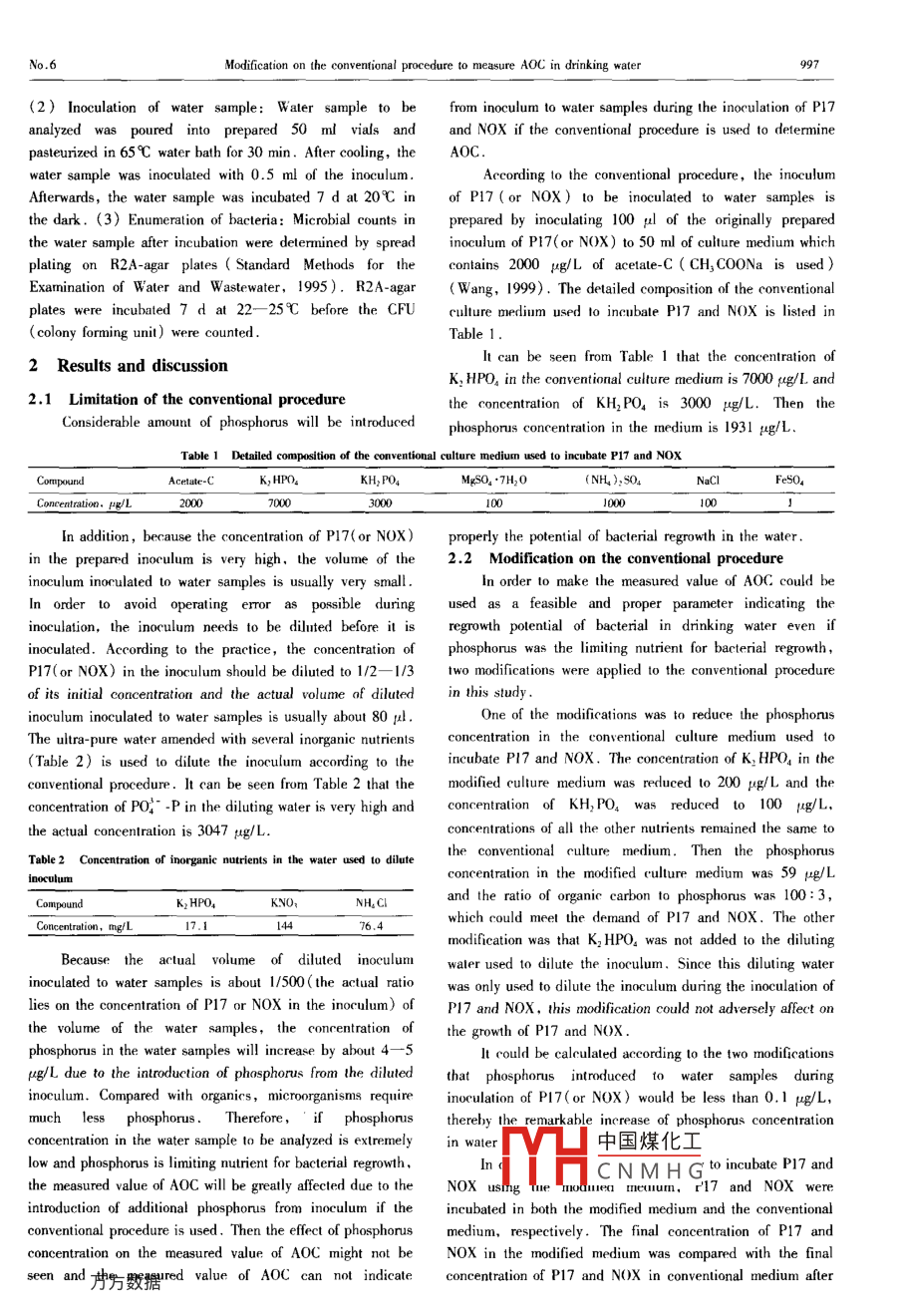 Journal of EnvirorunentalVal. 16, No.6,pp.996- 0002004CNI1-2629/17Article ID: 10-074206-09969050CLC number: X830.2; R123.6Documnent code: AModification on the conventional procedure to measure AOC in drinking waterL Fu-zhi' ,SANG Jun-qiang'" , ZHANG Xi-hui' ,W ANG Zhan-sheng'(1. Research Center for Enviroonmental Engineering & Management ,Shenzhen Graduate School ,Tsinghua University, Shenzhen 518055. China. E-mail: sangjunqiang @ tsinghua . edu. en; 2. Department of Environmental Science and Engineering, Tsinghua University . Beijing 100084. China)Abstract: Additional phosphorus will be introduced to water sample if the conventional procedure is used to measure assimilable organiccarbon(AOC) in drinking water. It has been shown that there are the cases that phosphorus is the limiting nutrient for microbial growth indninking water. The measured value of AOC would not be able to indicate appropriately the regrowth potential of bactria in this case. Theconventional procedure used to measure AOC was modified to avoid the introduction of additional phosphorus to water sample in thisstudy. It was shown that it was feasible to measure AOC in water using the modified procedure. Furthermore, the measured value of AOCdetermined by the moditied procedure could indicate appropriately the regrowth potential of bacteria in drinking water despite either organicsor phosphorus was the limiting nutrient for bacterial regrowth.Keywords: drinking water; assimilable organic carbon; bacterial regrowth; phosphorus: organicsAOC can indicate appropriately the regrowth potential ofIntroductionheteotrophic bacteria in drinking water when either organicsA0C( assimilable organic carbon) has been used as oneor phosphorus is the limiting nutrient for bacterial regrowth.of the main parameter to indicate the regrowth potential ofMaterials and methodsheterotrophic bacteria in drinking water for a long time. Themeasurement of AOC is based on the conventional hypothesis1.1 Water samplesthat biodegradable organic carbon is the only limiting nutrientThree different water samples were prepared by addingfor the regrowth of heterotrophic bacteria in drinking watersome nutrients to deionized water. The concentration ofdistribution systems ( Bruce,1984; Peter. 1990; Mark ,organic carbon added to all the waler samples was 200 μg/L1996; Liu, 2000; Van. 1982). The prineiple to determine( CH, COONa, measured as acetate-C) . The concentration ofAOC is thal the reproduction of Pseudomonads FluorescentPO: -P( NaH2 PO, ) appended to the three water samples wasstrain P17 and Spillum strain NOX is in direct proporion to0, 1 and 20 μg/L, respectively.the concentration of assimilable organic carbon in drinkingIn order to meet the demand of microbes for otherwater( Van, 1982; Miettinen, 1996). At present, thenutrients,a mixture of inorganic nutrienls includingprocedure advanced by Dr. Liu is widely used in China 10NH, NOg. MgSO, ●7H2O, CaCl, ●2H20, KCl and NaCl wasmeasure A0C in drinking waler( Liu, 2000).added to all the water samples. The concentration of eachRecently,the cases that phosphorus is the limitinginorganic nutient added to the water samples were 250 pg/Lnutrient for bacterial regrowth in drinking water have beenof N( including NH' -N and NO; -N),10 ug/L of Mg’”, 27found( Miettinen. 1996; 1997a; Sathasivan. 1999; Minnaμg/L of Ca, 53 ug/L of K' and 40 ug/L of Na"2002; Sang,2003). This changes the conventional thinkingrespectively .that biologically available organie carbon is the sole limiting1.2 Analysisnutrient for bacterial regrowth. It has been shown that whenAOC of all water samples was determined using both thephosphorus is the limiting nutrient for bacterial regrowth, theconventional andmodified procedure. BRP ( Bacterialreproduction of P17 will be depressed and in direct proportionRegrowth Potential) of the two water samples with 1 ug/L and1o the concentration of phosphorus rather than the20 μg/L P0:5 -P was measured according to a methodconcentration of biological available organic carbon inmodified based on the method proposed by Sathasivandrinking water( Markku, 1999). Then the feasibility 1to use( Sathasivan, 1999) .the measured value of AOC deternined by the conventionalThree basic steps were followed when BRP waprocedure advanced by Liu to indicate the regrowth potentialdetermined: (1)_ Preparation of inoculum: Raw water wasof heteotrophic bacteria in drinking water should betreate中國煤化工process fllwed bychallenged if phosphorus is the limiting nutrient for bacterialcoagu: fltration. About 200 mlregrowth .of the cahucu mas ULIOICU, luuwdtedYHCNM H Gled tn Iie dankd a 200The purpose of this study is to modify the conventionalfor 5 d then fitered with a 2 μm polycarbonate membraneprocedure advanced by Liu so that the measured value offilter. The filtrate was used as inoculum for BRP analysis.No.6Modification on the conventional procedure to measure AOC in drinking water(2) lnoculation of water sample: Water sample to befrom inoculum to water samples during the inoculation of P17analyzed was poured into prepared 50 ml vials andand NOX if the conventional procedure is used to determinepasteurized in 65C water bath for 30 min. After cooling, theAOC.water sample was inoculated with 0.5 ml of the inoculum.According to the conventional procedure, the inoculumAferwards, the water sample was incubated 7 d at 20C inof P17(or NOX) to be inoculated to water samples isthe dark. (3) Enumeration of bacteria: Microbial counts inprepared by inoculating 100 μl of the originally preparedthe waler sample after incubation were determined by spreadinoculum of PI7(or N0X) to 50 ml of culture medium whichplaling on R2A-agar plates ( Standard Methods for thecontains 2000 μg/L of acetale-C ( CH, COONa is used )Examination of Water and W astewater,1995). R2A-agar( Wang, 1999). The detailed cormposition of the conventionalplates were incubated 7 d at 22- 25C before the CFUculture medium used to inecubate P17 and NOX is li