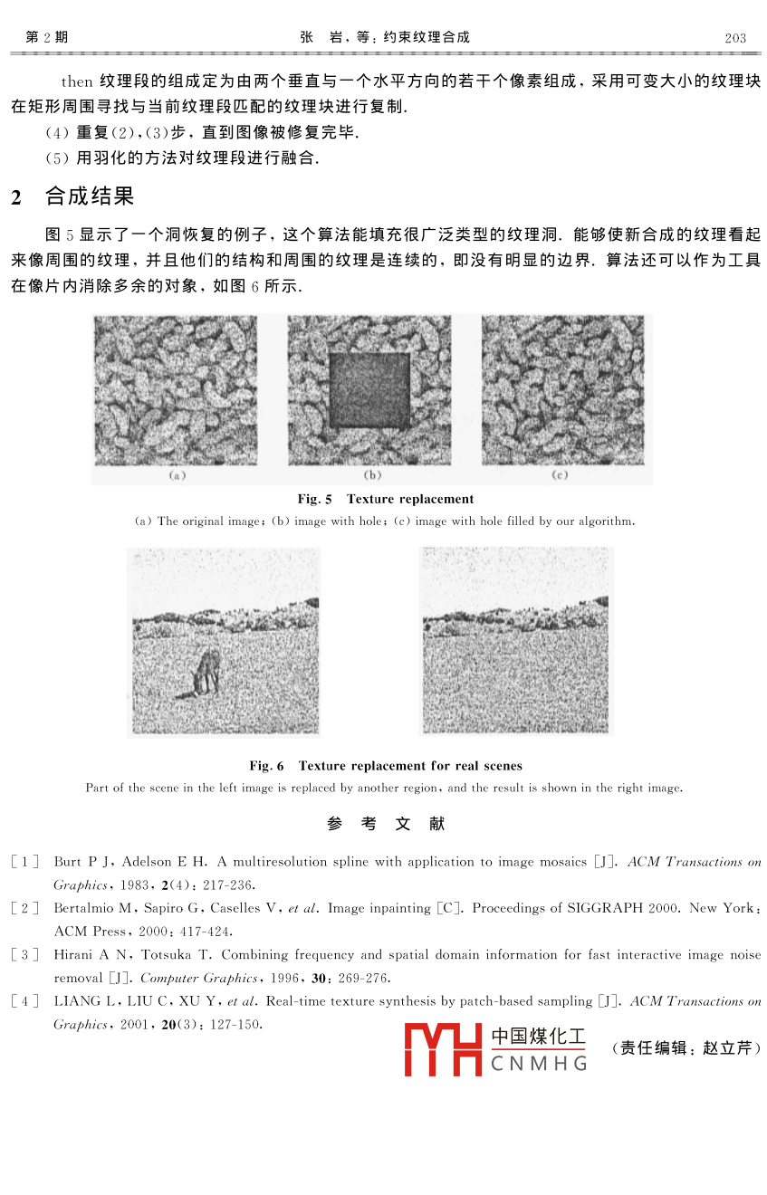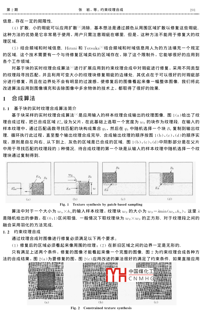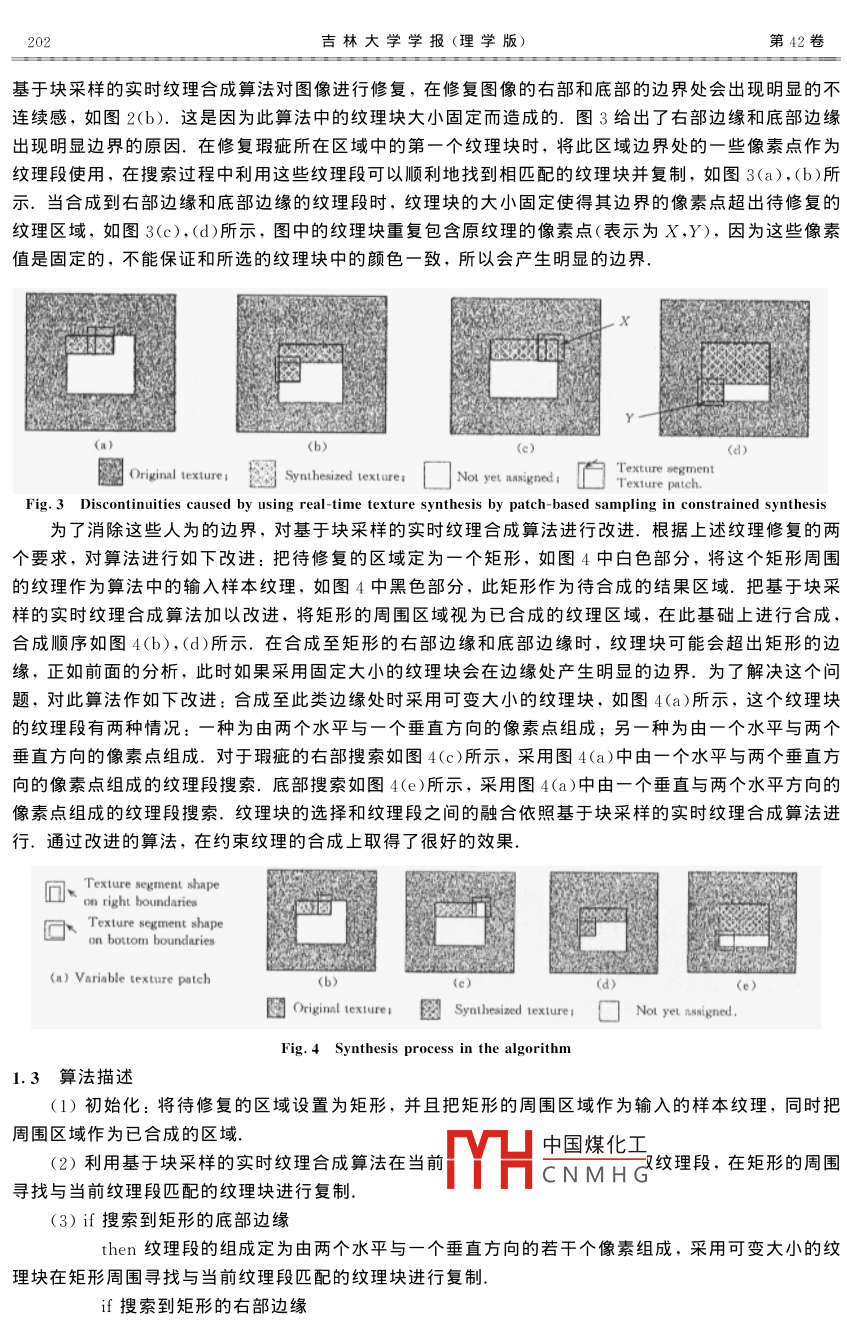 第42卷第2期吉林大學(xué)學(xué)報(bào)(理學(xué)版)Vol. 42 No. 22 004年4月JOURNAL OF JILIN UNIVERSITY (SCIENCE EDITION)Apr 2004約束紋理合成張巖,孟宇,李文輝,龐云階(吉林大學(xué)計(jì)算機(jī)科學(xué)與技術(shù)學(xué)院,長春130012)摘要:對基于塊的實(shí)時紋理合成算法進(jìn)行擴(kuò)展并應(yīng)用到約束紋理合成中,對瑕疵進(jìn)行修復(fù),在紋理合成的過程中采用不同類型的紋理段尋找匹配,并且利用可變大小的紋理塊修復(fù)瑕疵的邊緣處,使修復(fù)后的圖像在原來瑕疵的邊界處沒有明顯邊界感.關(guān)鍵詞:基于塊的采樣;紋理合成;約束紋理合成中圖分類號: TP391. 41文獻(xiàn)標(biāo)識碼: A文章編號: 1671-5489( 2004 )02-0200-04Constrained texture synthesisZHANG Yan, MENG Yu, LI Wen-hui, PANG Yun jie(College of Computer Science and Technology, Jilin University, Changchun 130012, China)Abstract: Extending the real time texture synthesis by patch-based sampling and applying it toconstrained texture synthesis, we repaired the blemish. By means of different types of texturesegment to find matching and the texture patch which can change in size, we repaired the boundary ofthe blemish, making no obvious sense of fringe in the boundary of the repaired picture.Keywords : patch-based sampling; texture synthesis; constrained texture synthesis在照片和電影底片上通常有一-些區(qū)域,看上去感覺有瑕疵,這些瑕疵可能是在-張掃描的圖片上缺少一個區(qū)域,也可能是電影底片中存在多余的道具,還可能是一個圖片上存在不該有的物體.因?yàn)橐疬@些瑕疵的過程通常是不可逆的,所以能夠修復(fù)這些瑕疵的算法有很大用處.通常這些瑕疵部分的位置處在一些紋理區(qū)域中,從而可以應(yīng)用紋理合成的方法進(jìn)行修復(fù).因?yàn)橐迯?fù)的區(qū)域必須包括在紋理區(qū)域中,所以把這種擴(kuò)展的紋理合成算法稱為約束紋理合成.目前對于圖像修復(fù)的方法有很多種,歸納起來,大致可以分為如下幾類:(1)頻域技術(shù).圖像信息大部分都集中在幅度譜的低頻和中頻段,而在較高的頻段,感興趣的信息常被噪聲淹沒.因此,一個能降低高頻成分幅度的濾波器就能減弱噪聲看得見的影響.但是頻域技術(shù)不能很好的適合去除人造的空間局部區(qū)域.(2)幀間技術(shù),可以依靠圖像的運(yùn)動順序,利用鄰近的幀間順序把損失的幀插入到應(yīng)有的位置,基本想法是從鄰近的幀中找到正確的像素點(diǎn)進(jìn)行修復(fù).但是這種技術(shù)不能應(yīng)用到靜止的圖像或跨越很多幀的電影底片上.(3)基于塊的技術(shù).修復(fù)圖像中的瑕疵最簡單的中國煤化工1的像素塊,在新塊與現(xiàn)存的圖像區(qū)域平滑可以采用多分辨率樣條凹實(shí)現(xiàn).但YHCNMHG會包括有用的控制結(jié)構(gòu)收稿日期: 203-09-22.作者簡介:張巖(1980~), 女,博士研究生,從事計(jì)算機(jī)圖形學(xué)和圖像處理的研究,E mail: zhangyanjlu@ yahoo. com. cn.聯(lián)系人:李文輝(1961~),男,教授,博士生導(dǎo)師,從事計(jì)算機(jī)圖形學(xué)、圖像處理和智能CAD的研究,E -mail: liwh@ public. cc. jl. cn.基金項(xiàng)目:國家自然科學(xué)基金(批準(zhǔn)號:69883004)和教育部博士點(diǎn)基金(批準(zhǔn)號:20010183041).第2期張巖, 等:約束紋理合成201信息,存在-定的局限性.(4)擴(kuò)散.小的瑕疵可以應(yīng)用擴(kuò)散[41消除.基本想法是通過顏色從周圍區(qū)域擴(kuò)散以修復(fù)這些瑕疵.這種方法的優(yōu)勢是它非常易于使用,用戶只需注意瑕疵在哪里.但是,這種方法不能用于修復(fù)大的紋理區(qū)域.(5)結(jié)合頻域和時域信息Hirani 和Totsuka[3結(jié)合頻域和時域信息用人為的方法填充一個規(guī)定的區(qū)域.這個技術(shù)需要有一個與待修復(fù)區(qū)域類似的區(qū)域存在,除了這個限制外,它能夠很好的應(yīng)用到各個工作領(lǐng)域.對基于塊的實(shí)時紋理合成算法[1進(jìn)行擴(kuò)展應(yīng)用到約束紋理合成中對瑕疵進(jìn)行修復(fù),采用不同類型的紋理段尋找匹配,并且利用可變大小的紋理塊修復(fù)瑕疵的邊緣處.其優(yōu)點(diǎn)在于可以很好的對瑕疵部分進(jìn)行修復(fù),而且在邊界處不會有明顯的過渡感,使修復(fù)后的圖像看起來像一幅整體圖像.我們將此改進(jìn)算法應(yīng)用到圖像填充和去除圖像中多余物體的技術(shù)上,都取得了很好的效果.1合成算法1.1 基于塊的實(shí)時紋理合成算法簡介基于塊采樣的實(shí)時紋理合成算法[4]是應(yīng)用輸入的樣本紋理合成輸出的紋理圖像.圖1(a)給出了紋.理合成過程,把已合成區(qū)域E設(shè)為父片,在此基礎(chǔ)上選取一個寬度為wE的塊作為紋理段.在輸入的樣本紋理中,通過匹配函數(shù)尋找匹配的塊構(gòu)成集合9u,然后在9%中隨機(jī)選擇-個塊B,復(fù)制到輸出紋理、循環(huán)執(zhí)行此過程,直至整個輸出紋理合成完畢.合成輸出紋理的順序按圖1(b),(c),(d)的順序?qū)崿F(xiàn),原則是自左向右、從下到上.灰色的區(qū)域是已合成的區(qū)域、圖1(b),(c),(d)中陰影部分是在父片中用于尋找匹配的紋理段的3種情況.待合成紋理的第一個塊是從輸入的樣本紋理中隨機(jī)選擇一個紋理塊通過復(fù)制得到.B3Est(a)(b)(d)Fig.1 Texture synthesis by patch- based sampling算法中對于一個大小為winXhim的輸入樣本紋理,紋理塊wB的大小為wB= Amin(wim,hin),這里λ是隨機(jī)給出的參數(shù),在(0,1)區(qū)間取值. -般情況下取紋理塊