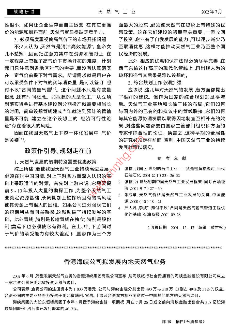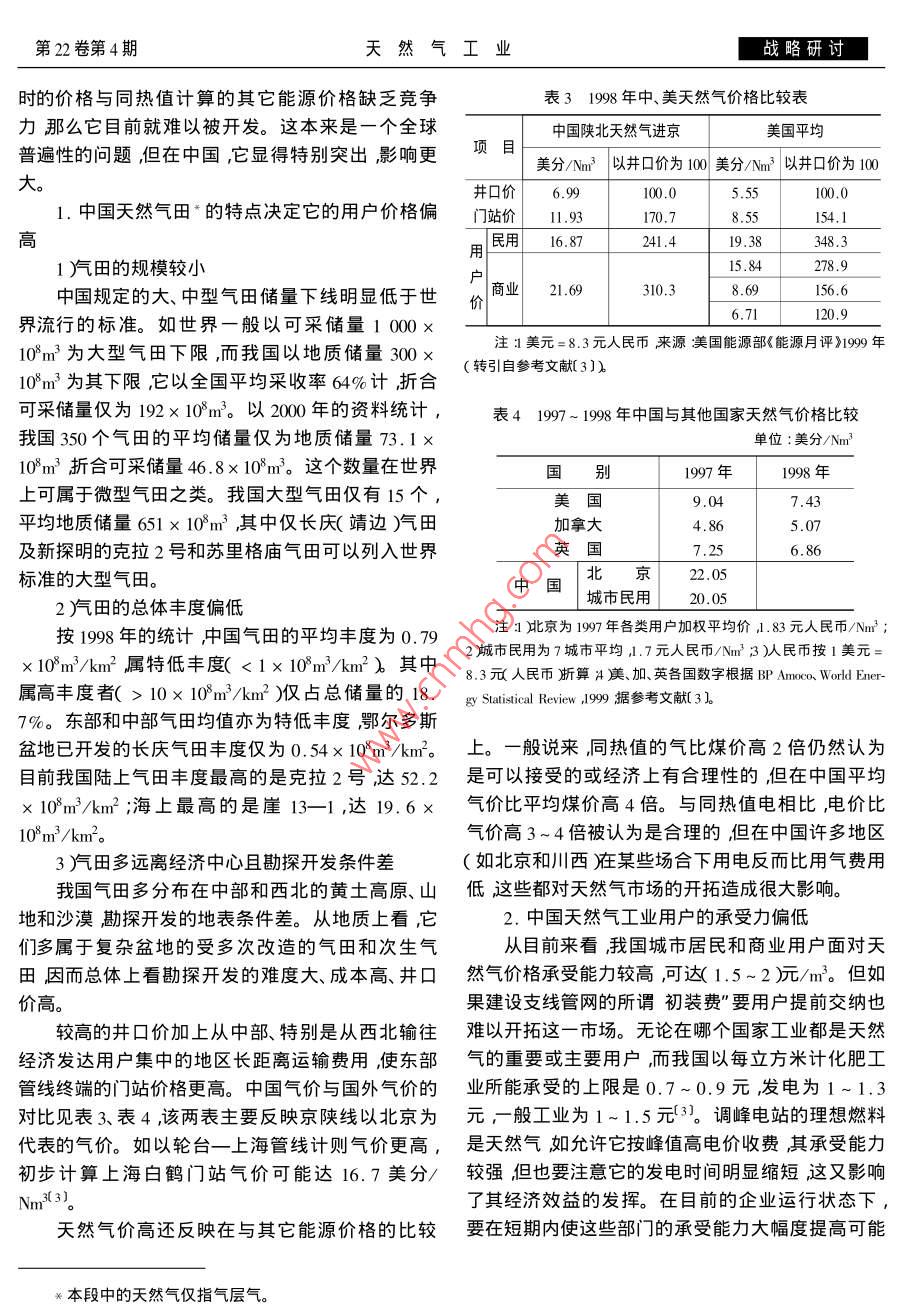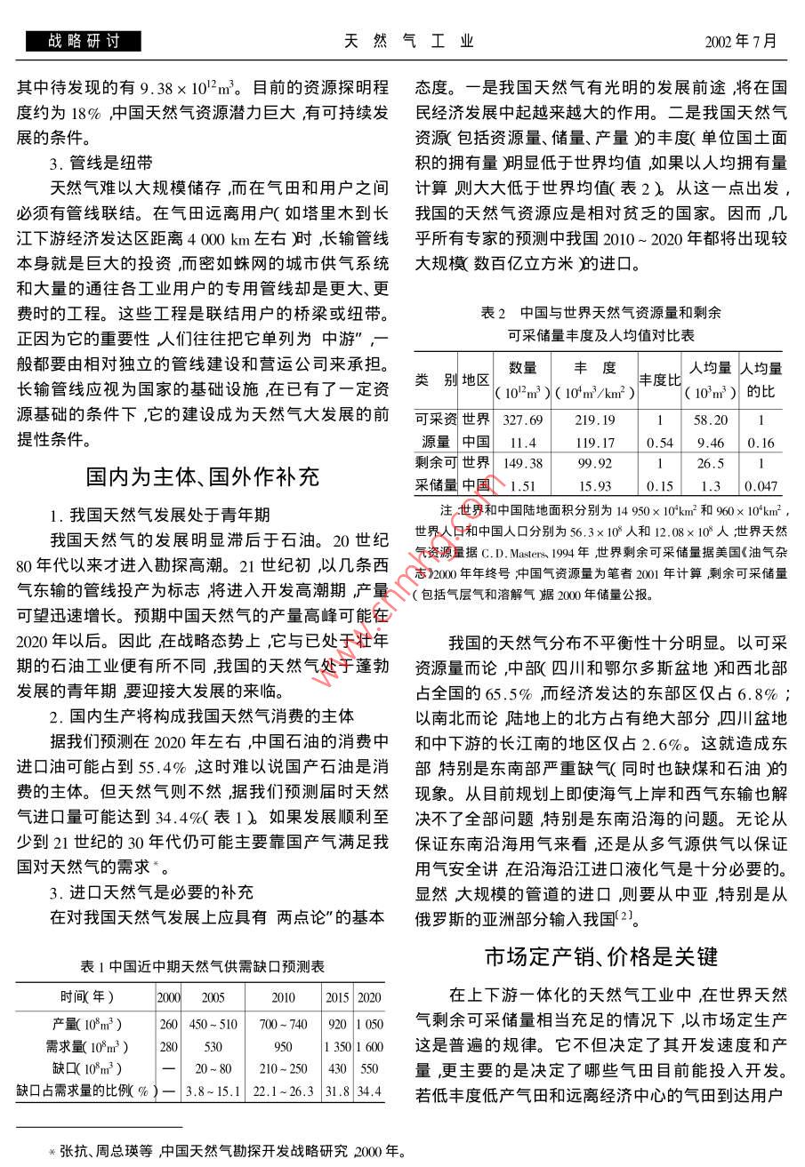 第22卷第4期天然氣工業(yè)戰(zhàn)略研討中國(guó)天然氣發(fā)展的戰(zhàn)略觀張抗(中國(guó)石化股份公司勘探開發(fā)研究院)張抗.中國(guó)天然氣發(fā)展的戰(zhàn)略觀.天然氣工業(yè)2002 22 4)1~4摘要截止2000年我國(guó)已累計(jì)探明天然氣(包括油田溶解氣和氣層氣)儲(chǔ)量3.62x 102m2其中剩余可采儲(chǔ)量1.51x 10-2m2全國(guó)氣層氣的儲(chǔ)產(chǎn)比達(dá)71.40據(jù)筆者2001年測(cè)算我國(guó)天然氣可采資源量約為11.44x102m3其中待發(fā)現(xiàn)的有9. 38 x 102m3 ,目前資源探明程度約為18% ,說明中國(guó)天然氣資源潛力巨大,有可持續(xù)發(fā)展的條件。在此前提下,長(zhǎng)輸管線作為國(guó)家的基礎(chǔ)設(shè)施要統(tǒng)-規(guī)劃,大力發(fā)展。筆者測(cè)算結(jié)果表明,如果發(fā)現(xiàn)順利至少到21世紀(jì)30年代仍可能主要靠國(guó)產(chǎn)氣滿足我國(guó)對(duì)天然氣的需求進(jìn)口天然氣是必要的補(bǔ)充。由于中國(guó)氣田規(guī)模普遍較小、豐度偏低、遠(yuǎn)離經(jīng)濟(jì)中心等特點(diǎn)決定了它的用戶價(jià)格偏高,因而必須高度重視偏高氣價(jià)下的市場(chǎng)開拓問題,相應(yīng)的優(yōu)惠和保護(hù)法規(guī)應(yīng)盡早完善國(guó)家的綜合規(guī)劃必須加強(qiáng),國(guó)家主管部門組織多方面專家對(duì)中國(guó)天然氣工業(yè)上、中、下游進(jìn)行全局性的綜合研究必須走在前面。這樣天然氣工業(yè)的持續(xù)發(fā)展就可以落實(shí)。主題詞天然氣工業(yè)發(fā)展戰(zhàn)略中國(guó)天然氣發(fā)展總體戰(zhàn)略其特點(diǎn)及上下游各環(huán)要使累計(jì)探明可采儲(chǔ)量達(dá)到管 線和用戶30年的需節(jié)間的關(guān)系可總結(jié)為四句話資源是基礎(chǔ)管線作紐求量有時(shí)要經(jīng)歷很長(zhǎng)時(shí)間(特別在氣田的規(guī)模較小帶國(guó)內(nèi)為主體國(guó)外作補(bǔ)充;市場(chǎng)定產(chǎn)銷,價(jià)格是關(guān)時(shí) )其間已投入的資金長(zhǎng)期被積壓,往往使勘探難鍵政策作引導(dǎo)規(guī)劃走在前。.以為繼,它希望能早日投產(chǎn),以籌集進(jìn)-步勘探的資資源是基礎(chǔ)、管線作紐帶金。對(duì)于下游來說,沒有足夠大的資源基礎(chǔ)根本談不到城市用氣管網(wǎng)、大型燃?xì)怆姀S和化工廠的規(guī)劃。1.天然氣工業(yè)的上下游一-體化實(shí)際情況是.上游有足夠多的氣時(shí),才能進(jìn)入管線和資源采掘部門作為系統(tǒng)工程的上游,它的發(fā)展用氣設(shè)施、工廠等的立項(xiàng)和建設(shè),而它們本身不但需與下游的煉制加工部門的關(guān)系一般都是很密切的,要大量的資 金而且也還要一段時(shí)間才能完成。兩者之間互相依存、互相制約。但這個(gè)問題對(duì)天然2.資源是基礎(chǔ)氣工業(yè)特別突出并形成其發(fā)展的難點(diǎn)。這是因?yàn)?要解開這個(gè)死結(jié)”,還得先從上游著手。發(fā)展①天然氣難以儲(chǔ)存,而且必須以管線或?qū)S玫囊夯袊?guó)的天然氣工業(yè)首 先要發(fā)現(xiàn)一批大中型氣田要系統(tǒng)運(yùn)輸,在這一點(diǎn)上與石油就有所不同。沒有管探明足夠的儲(chǔ)量。 對(duì)此,我國(guó)的天然氣勘探部門以線沒有下游用戶的啟動(dòng),天然氣生產(chǎn)便不能實(shí)現(xiàn),近20年時(shí)間的艱苦工作取得了巨大成績(jī)?!绷濉鄙踔岭y以進(jìn)行持續(xù)的天然氣勘探。②天然氣下游用以來每個(gè)五年計(jì)劃的新增探明儲(chǔ)量都以翻番的速度戶不論是城市居民和商業(yè)、還是大型電廠和化工增長(zhǎng)到2000年為止已累計(jì)探明天然氣(包括油田廠其用氣設(shè)施的基本建設(shè)費(fèi)用很大而一旦啟用又溶解氣和氣層氣)儲(chǔ)量3.62x 102m3其中剩余可采很難以其它燃(原)料所代替,因而要求上游的資源儲(chǔ)量1.51x 1042m。全國(guó)氣層氣的儲(chǔ)產(chǎn)比達(dá)71.40 .基礎(chǔ)提供保證。一般說,石油工業(yè)要求其上游滿足也就是說我們已具備雄厚的資源基礎(chǔ),目前開發(fā)明下游20年的需求。但一個(gè)新建的氣田一用戶系顯滯后。天然氣工業(yè)將可以有一個(gè)大的發(fā)展1。統(tǒng)的啟動(dòng)要求有滿足供應(yīng)30年的資源保證。這種從天然氣的資源蘊(yùn)藏上看據(jù)筆者2001 年的測(cè)兩難問題使上下游間產(chǎn)生某些矛盾。對(duì)上游來說,算 ,我國(guó)有天然氣可采資源量約為11.44x 102m3 ,*張抗,1940年生教授級(jí)高級(jí)工程師簡(jiǎn)介見本刊第19卷第3期。地址( 10083 )北京學(xué)院路31號(hào)石油研究院。電話:( 010 )82312963。戰(zhàn)略研討天然氣工業(yè)2002年7月其中待發(fā)現(xiàn)的有9. 38x 102m'。目前的資源探明程態(tài)度。一是我國(guó)天然氣有光明的發(fā)展前途將在國(guó)度約為18% ,中國(guó)天然氣資源潛力巨大,有可持續(xù)發(fā)民經(jīng)濟(jì)發(fā)展中起越來越大的作用。二是我國(guó)天然氣展的條件。資源(包括資源量、儲(chǔ)量、產(chǎn)量)的豐度(單位國(guó)土面3.管線是紐帶積的擁有量)明顯低于世界均值,如果以人均擁有量天然氣難以大規(guī)模儲(chǔ)存,而在氣田和用戶之間計(jì)算 則大大低于世界均值(表2)%從這一點(diǎn)出發(fā),必須有管線聯(lián)結(jié)。在氣田遠(yuǎn)離用戶(如塔里木到長(zhǎng)我國(guó)的天然氣資源應(yīng)是相對(duì)貧乏的國(