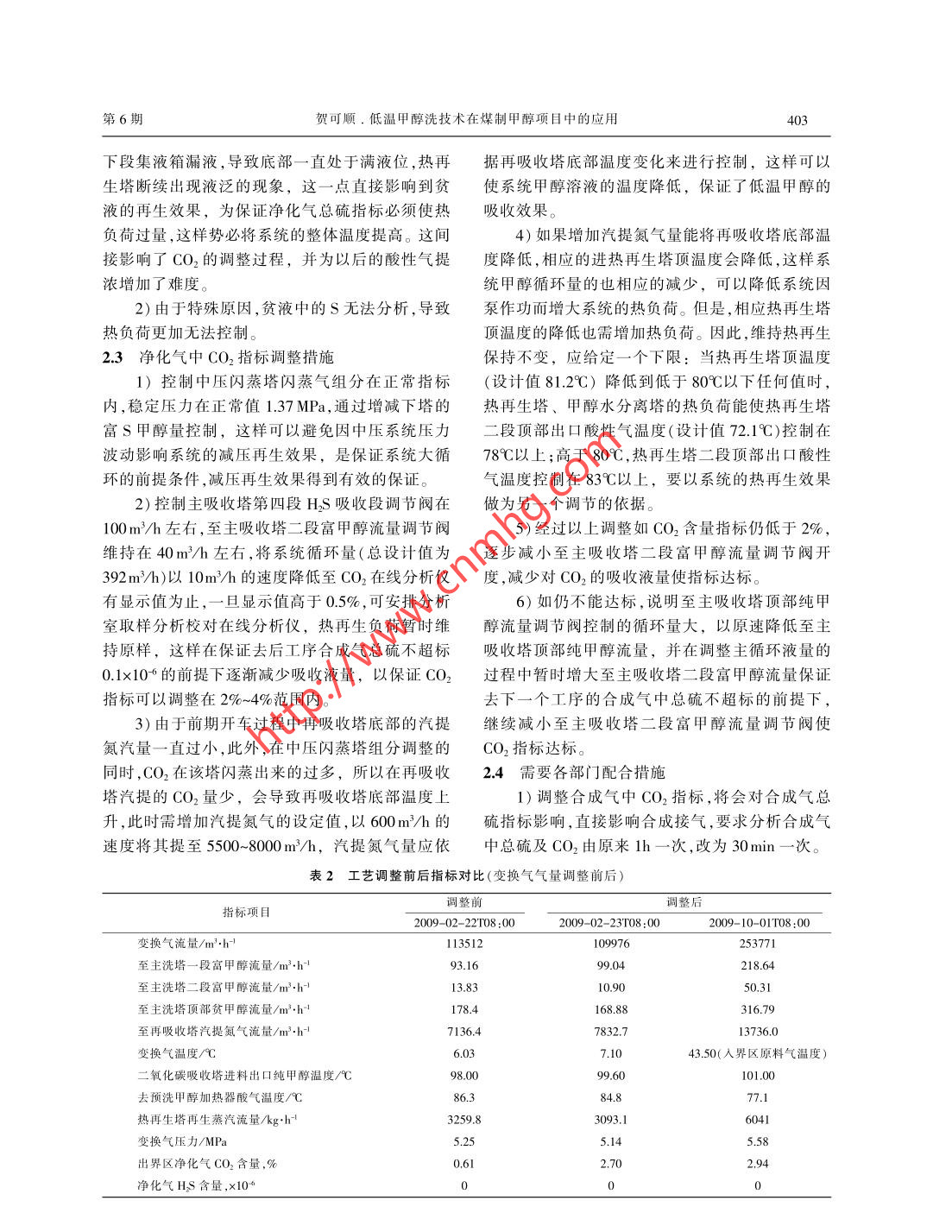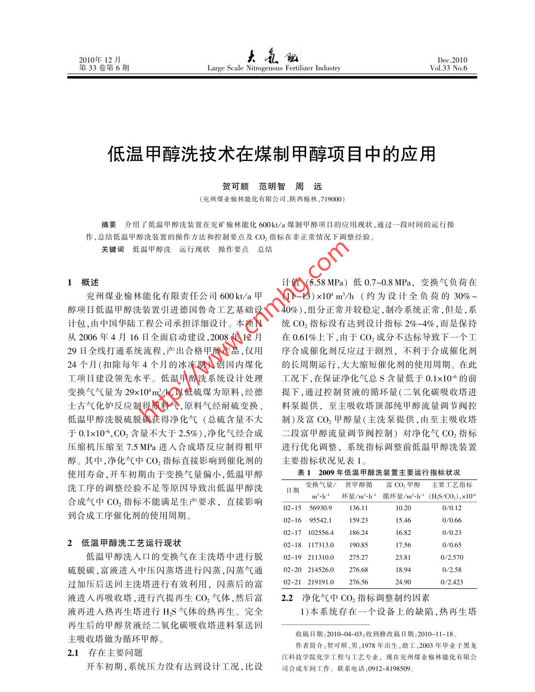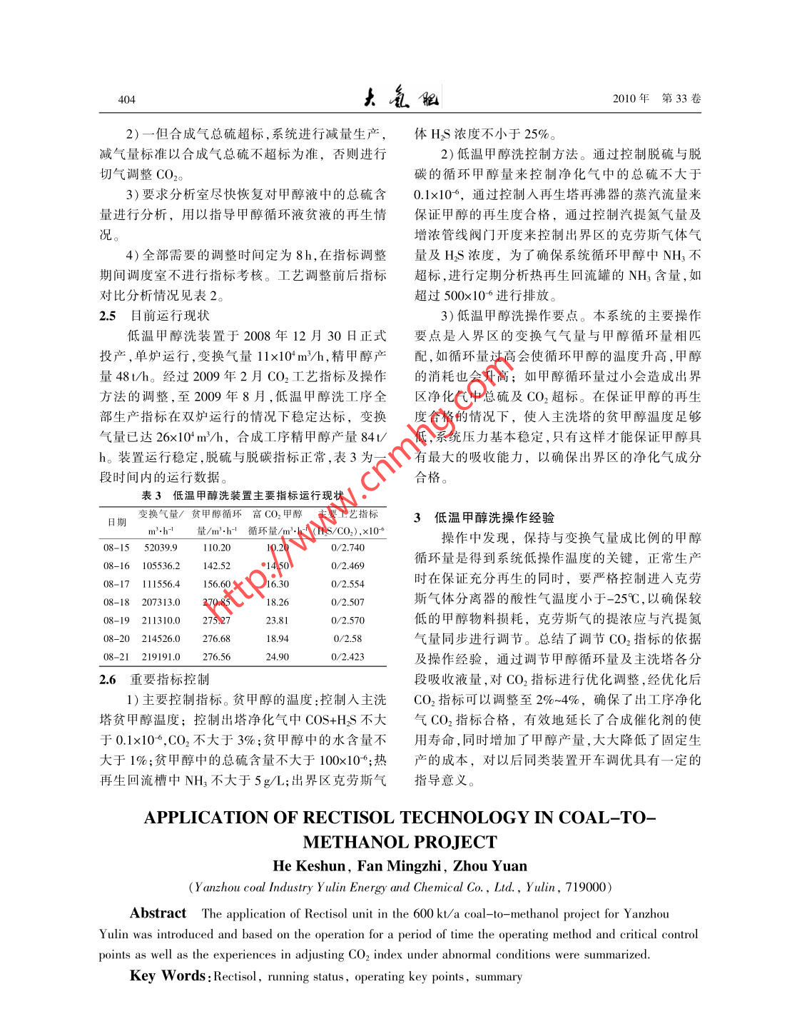 2010年12月大氛配Dec.2010第33卷第6期Large Scale NitrcNitrogenous Fertililizer Industryvol.33.No.6V oL.33 No.6_低溫甲醇洗技術(shù)在煤制甲醇項(xiàng)目中的應(yīng)用賀可順?lè)睹髦侵苓h(yuǎn)(兗州煤業(yè)榆林能化有限公司,陜西榆林,719000)摘要介紹了低溫甲醇洗裝置在兗礦榆林能化600kt/a煤制甲醇項(xiàng)目的應(yīng)用現(xiàn)狀,通過(guò)一段時(shí)間的運(yùn)行操作,總結(jié)低溫甲醇洗裝置的操作方法和控制要點(diǎn)及CO2指標(biāo)在非正常情況下調(diào)整經(jīng)驗(yàn)。關(guān)鍵詞低溫甲醇洗 運(yùn)行現(xiàn)狀 操作要點(diǎn)總結(jié)1概述計(jì)值(5.58 MPa)低0.7~0.8MPa,變換氣負(fù)荷在兗州煤業(yè)榆林能化有限責(zé)任公司600kt/a甲(11~13)x104 m2/h (約為設(shè)計(jì)全負(fù)荷的30%~醇項(xiàng)目低溫甲醇洗裝置引進(jìn)德國(guó)魯奇工藝基礎(chǔ)設(shè)40%) ,組分正常并較穩(wěn)定,制冷系統(tǒng)正常,但是,系計(jì)包,由中國(guó)華陸工程公司承擔(dān)詳細(xì)設(shè)計(jì)。本項(xiàng)目統(tǒng)CO2指標(biāo)沒(méi)有達(dá)到設(shè)計(jì)指標(biāo)2%~4%,而是保持從2006年4月16日全面啟動(dòng)建設(shè),2008年12月在0.61%上下,由于CO2成分不達(dá)標(biāo)導(dǎo)致下一個(gè)工29日全線打通系統(tǒng)流程,產(chǎn)出合格甲醇產(chǎn)品,僅用序 合成催化劑反應(yīng)過(guò)于劇烈,不利于合成催化劑24個(gè)月(扣除每年4個(gè)月的冰凍期),創(chuàng)國(guó)內(nèi)煤化的長(zhǎng)周期運(yùn)行,大大縮短催化劑的使用周期。在此工項(xiàng)目建設(shè)領(lǐng)先水平。低溫甲醇洗系統(tǒng)設(shè)計(jì)處理工況下,在保證凈化氣總S含量低于0.1x10*的前變換氣氣量為29x104 m2/h,以低硫煤為原料,經(jīng)德提下,通過(guò)控制貧液的循環(huán)量(二氧化碳吸收塔進(jìn)士古氣化爐反應(yīng)制得原料氣,原料氣經(jīng)耐硫變換、料泵提供,至主吸收塔頂部純甲醇流量調(diào)節(jié)閥控低溫甲醇洗脫硫脫碳獲得凈化氣(總硫含量不大.制)及富CO2甲醇量(主洗泵提供,由至主吸收塔于0.1x10- ,CO2含量不大于2.5%),凈化氣經(jīng)合成二段富甲醇流量調(diào)節(jié)閥控制)對(duì)凈化氣CO2指標(biāo)壓縮機(jī)壓縮至7.5MPa進(jìn)人合成塔反應(yīng)制得粗甲進(jìn)行優(yōu)化調(diào)整,系統(tǒng)指標(biāo)調(diào)整前低溫甲醇洗裝置醇。其中,凈化氣中CO2指標(biāo)直接影響到催化劑的主要指標(biāo)狀況見表1。使用壽命,開車初期由于變換氣量偏小,低溫甲醇表12009年低溫甲醇洗裝置主要運(yùn)行指標(biāo)狀況洗工序的調(diào)整經(jīng)驗(yàn)不足等原因?qū)е鲁龅蜏丶状枷慈掌谧儞Q氣量/貧甲醇循富CO2甲醇 主要 工藝指標(biāo)m'.h1環(huán)量/m2.hr 循環(huán) 量/m2.hr' (HS/CO2),x10*合成氣中CO2指標(biāo)不能滿足生產(chǎn)要求,直接影響02-15 56930.9136.1110.200/0.12到合成工序催化劑的使用周期。02-16 95542.1159.2315.460/0.6602-17 102556.4l 86.2416.820/0.232低溫甲醇洗工藝運(yùn)行現(xiàn)狀02-18 117313.0190.8517.560/0.65低溫甲醇洗人口的變換氣在主洗塔中進(jìn)行脫02-19 211310.0275.20/2.570硫脫碳,富液進(jìn)人中壓閃蒸塔進(jìn)行閃蒸,閃蒸氣通02-20 214526.0276.6818.940/2.58過(guò)加壓后送回主洗塔進(jìn)行有效利用,閃蒸后的富02-21 219191.0276.5624.900/2.423液進(jìn)人再吸收塔,進(jìn)行汽提再生CO2氣體,然后富2.2凈化氣中CO2指標(biāo)調(diào)整制約因素液再進(jìn)入熱再生塔進(jìn)行HS氣體的熱再生。完全1)本系統(tǒng)存在一個(gè)設(shè)備.上的缺陷,熱再生塔再生后的甲醇貧液經(jīng)二氧化碳吸收塔進(jìn)料泵送回收稿日期:2010-04 -03 ;收到修改稿日期:2010-11-18。主吸收塔做為循環(huán)甲醇。作者簡(jiǎn)介:賀可順,男,1978年出生,助工,2003年畢業(yè)于黑龍2.1 存在主要問(wèn)題江科技學(xué)院化學(xué)工程與工藝專業(yè),現(xiàn)在兗州煤業(yè)榆林能化有限公開車初期,系統(tǒng)壓力沒(méi)有達(dá)到設(shè)計(jì)工況,比設(shè)司合成車間工作。聯(lián)系電話:0912-8198509。第6期賀可順.低溫甲醇洗技術(shù)在煤制甲醇項(xiàng)目中的應(yīng)用403下段集液箱漏液,導(dǎo)致底部--直處于滿液位,熱再據(jù)再吸收塔底部溫度變化來(lái)進(jìn)行控制,這樣可以生塔斷續(xù)出現(xiàn)液泛的現(xiàn)象,這一點(diǎn)直接影響到貧使系統(tǒng)甲醇溶液的溫度降低,保證了低溫甲醇的液的再生效果,為保證凈化氣總硫指標(biāo)必須使熱吸收效果。負(fù)荷過(guò)量,這樣勢(shì)必將系統(tǒng)的整體溫度提高。這間4)如果增加汽提氮?dú)饬磕軐⒃傥账撞繙亟佑绊懥薈O2的調(diào)整過(guò)程,并為以后的酸性氣提度降低,相應(yīng)的進(jìn)熱再生塔頂溫度會(huì)降低,這樣系濃增加了難度。統(tǒng)甲醇循環(huán)量的也相應(yīng)的減少,可以降低系統(tǒng)因2)由于特殊原因,貧液中的S無(wú)法分析,導(dǎo)致泵作功而增大系統(tǒng)的熱負(fù)荷。但是,相應(yīng)熱再生塔熱負(fù)荷更加無(wú)法控制。頂溫度的降低也需增加熱負(fù)荷。因此,維持熱再生2.3凈化氣中CO2指標(biāo)調(diào)整措施保持不變,應(yīng)給定一個(gè)下限:當(dāng)熱再生塔頂溫度1)控制中壓閃蒸塔閃蒸氣組分在正常指標(biāo)(設(shè)計(jì)值81.29C)降低到低于809C以下任何值時(shí),內(nèi),穩(wěn)定壓力在正常值1.37MPa,通過(guò)增減下塔的熱再生塔、甲醇水分離塔的熱負(fù)荷能
