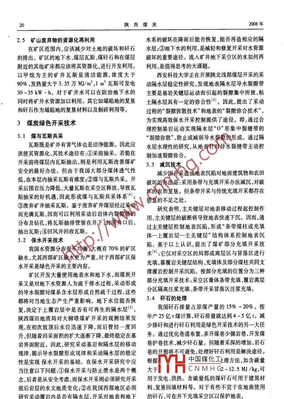 18黃慶享煤炭資源綠色開(kāi)采2008年煤炭資源綠色開(kāi)采黃慶享(西安科技大學(xué)能源學(xué)院,陜西西安710054)摘要;分析了煤炭的 重要地位及其開(kāi)采對(duì)環(huán)境的影響,闡述了礦業(yè)可持續(xù)發(fā)展和煤炭資源綠色開(kāi)采的提出,總結(jié)了煤炭資源綠色開(kāi)采的內(nèi)涵和當(dāng)前存在的可行技術(shù),明確了巖層控制作為綠色開(kāi)采技術(shù)的基本理論,探討了基于綠色開(kāi)采的煤炭經(jīng)濟(jì)技術(shù)管理方面存在的問(wèn)題,提出了西部以保水開(kāi)采研究為重點(diǎn)的結(jié)論。關(guān)鍵詞:煤炭;可持續(xù)發(fā)展;綠色開(kāi)采;保水開(kāi)采中圖分類號(hào):TD991文獻(xiàn)標(biāo)識(shí)碼:B文章編號(hào):1671 -749X(2008 )01 -0018 -04的快速發(fā)展。因此,煤炭行業(yè)面臨的緊要任務(wù)是0引言“形成煤炭開(kāi)發(fā)與環(huán)境協(xié)調(diào)發(fā)展"的綠色開(kāi)采技術(shù)。我國(guó)能源資源儲(chǔ)量中煤炭占92% ,石油占2.1煤炭綠色開(kāi)采的提 出9% ,天然氣占0.2% ,水電占4.7%。近期我國(guó)煤炭生產(chǎn)與消費(fèi)占整體能源的70% , 而油氣僅占1.1可持續(xù)發(fā)展 與綠色開(kāi)采20%。可再生能源,如太陽(yáng)能與風(fēng)能的能量高度分20世紀(jì)60年代以后,隨著社會(huì)經(jīng)濟(jì)、科學(xué)技術(shù)散,利用成本高,因此,煤炭在近幾十年仍然是我國(guó)的發(fā)展,人口的增長(zhǎng),人類與自然環(huán)境相互作用愈來(lái)的主體能源,煤炭工業(yè)的健康發(fā)展是我國(guó)經(jīng)濟(jì)可持愈強(qiáng)烈,森林的消失、河流的污染、土地的退化、大氣續(xù)發(fā)展的基礎(chǔ)。我國(guó)2006年生產(chǎn)煤炭23.5億t,規(guī)臭氧層的破壞、酸雨、全球的溫室效應(yīng)、經(jīng)濟(jì)無(wú)限增劃2010年為26億t,2020年為28億t。為此,在考長(zhǎng)所帶 來(lái)的相對(duì)資源枯竭等等,讓人類意識(shí)到環(huán)境慮發(fā)展可再生能源的同時(shí),應(yīng)該下大力氣解決煤炭與社 會(huì)經(jīng)濟(jì)協(xié)調(diào)發(fā)展的重要性。70年代的全球綠開(kāi)發(fā)與利用中出現(xiàn)的問(wèn)題。目前,盡管我國(guó)的煤炭色運(yùn)動(dòng),含有許多可持續(xù)發(fā)展的思想,促進(jìn)了可持續(xù)產(chǎn)量和消費(fèi)已占世界的1/3,但整個(gè)煤炭行業(yè)資源發(fā)展的形成與發(fā)展。1987 年由挪威前首相布倫特與環(huán)境協(xié)調(diào)開(kāi)采與世界發(fā)達(dá)國(guó)家還有很大的差距,蘭夫人領(lǐng)導(dǎo)的聯(lián)合國(guó)環(huán)境與發(fā)展委員會(huì)( WCED)發(fā)煤炭資源開(kāi)采與環(huán)境協(xié)調(diào)發(fā)展的技術(shù),即綠色開(kāi)采表了《我們共同的未來(lái)》,科學(xué)地論述了可持續(xù)發(fā)展技術(shù)尚處于起步階段,是亟待研究和發(fā)展的重大課的概念:“既滿足當(dāng)代人需求,又不損害后人滿足其題。我國(guó)西部煤炭?jī)?chǔ)量豐富,地表生態(tài)環(huán)境脆弱,煤需求能力的發(fā)展?!?992年在巴西里約熱內(nèi)盧舉行層埋藏較淺,開(kāi)采引起的環(huán)境問(wèn)題尤為突出,開(kāi)展綠了183個(gè)國(guó)家和70多個(gè)國(guó)際組織參加的聯(lián)合國(guó)環(huán)色開(kāi)采的研究,對(duì)于西部礦業(yè)經(jīng)濟(jì)和社會(huì)可持續(xù)發(fā)境與發(fā)展大會(huì),該大會(huì)上通過(guò)了《21世紀(jì)議程》,標(biāo)展具有特別重要的意義。,志著可持續(xù)發(fā)展思想被接受并從理論走向?qū)嵺`?;禾磕芊癯蔀橹黧w能源關(guān)鍵要解決煤炭開(kāi)發(fā)利于上述背景,礦業(yè)可持續(xù)發(fā)展被逐步重視,綠色開(kāi)采用對(duì)環(huán)境的影響,環(huán)境的承受能力和溫室氣體對(duì)氣正是在此背景下產(chǎn)生的。2003年中國(guó)工程院錢鳴候的影響將限制煤炭成為主體能源,也將影響經(jīng)濟(jì)高院中國(guó)煤化工采的概念和技術(shù)體系,陽(yáng)YHCNMHG環(huán)境協(xié)調(diào)發(fā)展的綠收稿日期:2007-08 -22色開(kāi)采研究目標(biāo),綠色開(kāi)采的研究指明了方向。.作者簡(jiǎn)介:黃慶享(1966-),男,新疆沙灣人.博士,現(xiàn)任西安科技大1.2 煤炭開(kāi)采與環(huán)境學(xué)能源學(xué)院副院長(zhǎng),教授,博士生導(dǎo)師,主要從事礦山巖層控制和采煤方法方面的教學(xué)與科研工作。礦區(qū)開(kāi)采對(duì)環(huán)境的破壞和污染表現(xiàn)為:①對(duì)土第1期黃慶享煤炭資源綠色開(kāi)采19地資源的破壞。地下開(kāi)采主要表現(xiàn)為地表塌陷和矸2煤炭綠色開(kāi)采石山的壓占;②對(duì)水資源的破壞和污染。表現(xiàn)為人為疏干排水和采動(dòng)形成的導(dǎo)水裂隙對(duì)煤系含水層的2.1煤炭綠色開(kāi)采的內(nèi)涵自然疏干。開(kāi)采形成的污水和廢棄物可能污染水資綠色開(kāi)采的內(nèi)涵主要表現(xiàn)在,改革開(kāi)采技術(shù)減源;③對(duì)大氣環(huán)境的污染。主要來(lái)自礦井排出的煤輕對(duì)地表的擾動(dòng)和水土的破壞,減少?gòu)U棄物排放;礦層瓦斯和煤礦矸石山的自燃所形成的廢氣。山廢棄物的資源化利用,實(shí)現(xiàn)循環(huán)經(jīng)濟(jì)。其中,改革以陜北為例,陜北侏羅紀(jì)煤田煤炭?jī)?chǔ)量大,煤質(zhì)開(kāi)采技術(shù)是根本,巖層控制理論是基礎(chǔ)。好,經(jīng)過(guò)近20年的建設(shè)